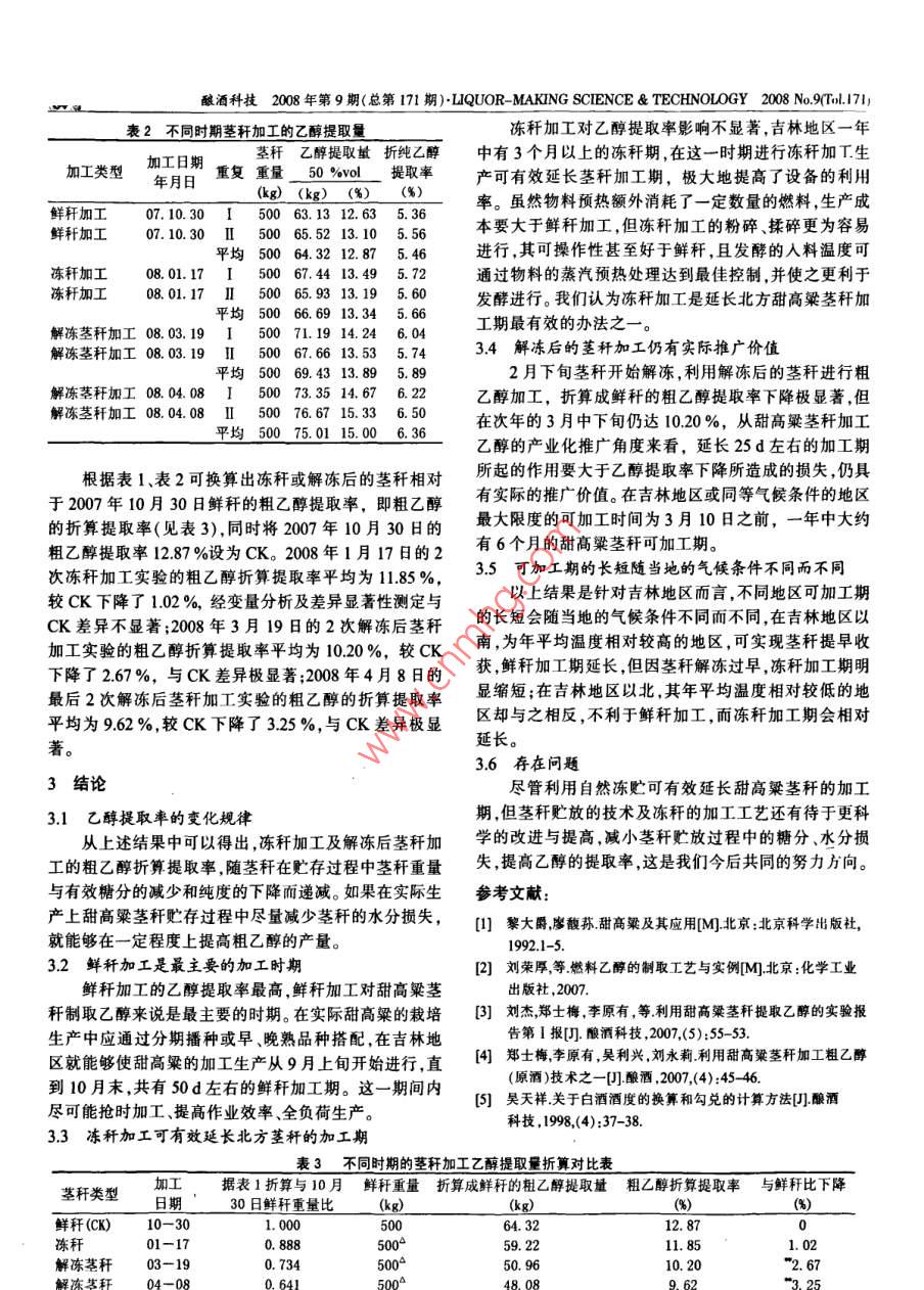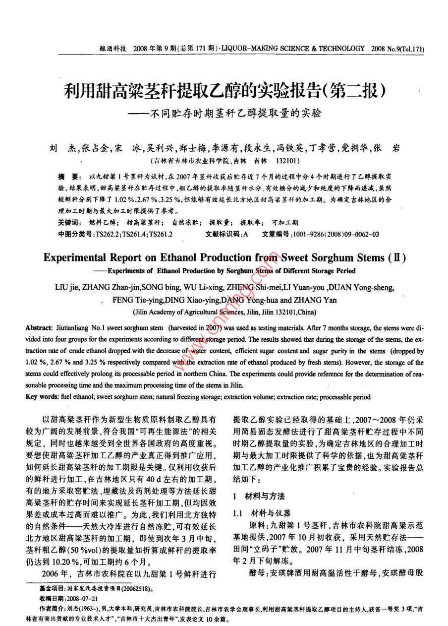 利用甜高粱莖稈提取乙醇的實(shí)驗(yàn)報(bào)告(第二報(bào))——不同貯存時(shí)期莖稈乙醇提取量的實(shí)驗(yàn)