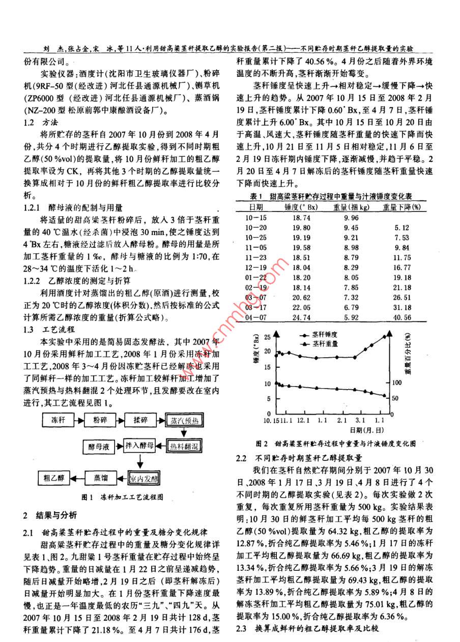 釀酒科技2008年第9期(總第171期) LIQUOR- MAKING SCIENCE& TECHNOLOGY2008N9Tl.171)利用甜高粱莖稈提取乙醇的實(shí)驗(yàn)報(bào)告(第二報(bào))不同貯存時(shí)期莖稈乙醇提取量的實(shí)驗(yàn)劉杰,張占金,宋冰,吳利興,鄭士梅,李源有,段永生,馮鐵英,丁孝營,黨擁華,張巖(吉林省吉林市農(nóng)業(yè)科學(xué)院,吉林吉林132101)摘要:以九甜粱I號(hào)莖稈為試材,在2007年莖稈收獲后貯存近7個(gè)月的過程中分4個(gè)時(shí)期進(jìn)行了乙醇提取實(shí)驗(yàn)。結(jié)果表明,甜高粱莖稈在貯存過程中,粗乙醇的提取率隨莖稈水分、有效糖分的減少和純度的下降而遞減,雖然較鮮稈分別下降了102%2.67%、325%,但能夠有效延長北方地區(qū)甜高梁莖稈的加工期。為確定吉林地區(qū)的合理加工時(shí)期與最大加工時(shí)限提供了參考。關(guān)健詞:燃料乙醇;甜高粱莖稈;自然凍貯;提取量;提取率;可加工期中圖分類號(hào):TS2622;Ts2614;TS2612文獻(xiàn)標(biāo)識(shí)碼:A文章編號(hào):1001-9286(2008)090062-03Experimental Report on Ethanol Production from Sweet Sorghum Stems (I)Experiments of Ethanol Production by Sorghum Stems of Different Storage PeriodLIU jie, ZHANG Zhan-jin, SONG bing, WU Li-xing, ZHENG Shi-mei, LI Yuan-you, DUAN Yong-sheng,FENG Tie-ying, DING Xiao-ying, DANG Yong-hua and ZHANG YanJilin Academy of Agricultural Sciences, Jilin, Jilin 132101, ChinAbstract: Jiutianliang No I sweet sorghum stem (harvested in 2007)was used as testing materials. after 7 months storage, the stems were di-vided into four groups for the experiments according to different storage period. The results showed that during the storage of the stems, the extraction rate of crude ethanol dropped with the decrease of water content, efficient sugar content and sugar purity in the stems (dropped by1.02%,2.67% and 3. 25 respectively compared with the extraction rate of ethanol produced by fresh stems). However, the storage of thestems could effectively prolong its processable period in northem China. The experiments could provide reference for the determination of reasonable processing time and the maximum processing time of the stems in JilinKey words: fuel ethanol; sweet sorghum stem; natural freezing storage; extraction volume; extraction rate; processable period以甜高粱莖稈作為新型生物質(zhì)原料制取乙醇具有提取乙醇實(shí)驗(yàn)已經(jīng)取得的基礎(chǔ)上,2007~2008年仍采較為廣闊的發(fā)展前景,符合我國“可再生能源法”的相關(guān)用簡易固態(tài)發(fā)酵法進(jìn)行了甜高粱莖稈貯存過程中不同規(guī)定,同時(shí)也越來越受到全世界各國政府的高度重視。時(shí)期乙醇提取量的實(shí)驗(yàn),為確定吉林地區(qū)的合理加工時(shí)要想使甜髙粱莖稈加工乙醇的產(chǎn)業(yè)真正得到推廣應(yīng)用,期與最大加工時(shí)限提供了科學(xué)的依據(jù),也為甜高粱莖稈如何延長甜高粱莖稈的加工期限是關(guān)鍵。僅利用收獲后加工乙醇的產(chǎn)業(yè)化推廣積累了寶貴的經(jīng)驗(yàn)。實(shí)驗(yàn)報(bào)告總的鮮稈進(jìn)行加工,在吉林地區(qū)只有40d左右的加工期。結(jié)如下:有的地方采取窯貯法、埋藏法及藥劑處理等方法延長甜高粱莖稈的貯存時(shí)間來實(shí)現(xiàn)延長莖稈加工期但均因效1材料與方法果差或成本過高而難以推廣。為此我們利用北方獨(dú)特11材料與儀器的自然條件—天然大冷庫進(jìn)行自然凍貯,可有效延長原料:九甜粱1號(hào)莖稈,吉林市農(nóng)科院甜高粱示范北方地區(qū)甜髙粱莖稈的加工期,即使到次年3月中旬,基地提供,2007年10月初收獲,采用天然貯存法莖稈粗乙醇(50%vo)的提取量如折算成鮮稈的提取率田間“立碼子”貯放。2007年11月中旬莖稈結(jié)凍,2008仍達(dá)到1020%可加工期約6個(gè)月年2月下旬解凍。2006年,吉林市農(nóng)科院在以九甜粱1號(hào)鮮稈進(jìn)行酵母:安琪牌酒用耐高溫活性干酵母,安琪酵母股基金項(xiàng)目:國家發(fā)改委投資項(xiàng)目(20062518)收稿日期:200807-21作者簡介:劉杰(963-),男大學(xué)本科研究員吉林市農(nóng)科院院長吉林市農(nóng)學(xué)會(huì)理事長,利用甜高梁莖稈提取乙醇項(xiàng)目的主持人獲省一等獎(jiǎng)3項(xiàng)“吉林省有突出貢獻(xiàn)的專業(yè)技術(shù)人才”“吉林市十大杰出青年”發(fā)表論文10余篇。劉杰張占金,宋冰,等11人·利用甜高粱莖稈提取乙醇的實(shí)驗(yàn)報(bào)告(第二報(bào))—一不冋貯存時(shí)期莖稈乙醇提取量的實(shí)驗(yàn)份有限公司。稈重量累計(jì)下降了4056%。4月份之后隨著外界環(huán)境實(shí)驗(yàn)儀器:酒度計(jì)(沈陽市衛(wèi)生玻璃儀器廠)、粉碎溫度的不斷升高,莖稈漸漸開始霉變。機(jī)(9RF-50型(經(jīng)改進(jìn))河北任縣通源機(jī)械廠)、鍘草機(jī)莖稈錘度呈快速上升→相對(duì)穩(wěn)定→緩慢下降→快(zP6000型(經(jīng)改進(jìn))河北任縣通源機(jī)械廠)、蒸酒鍋速上升的趨勢(shì)。從2007年10月15日至2008年2月(NZ-200型松原前郭中康釀酒設(shè)備廠)。19日,莖稈錘度累計(jì)下降060Bx,至4月7日,莖稈錘1.2方法度累計(jì)上升6.00°Bx。其中10月15日至10月20日由將所貯存的莖稈自2007年10月份到2008年4月于高溫、風(fēng)速大,莖稈錘度隨莖稈重量的快速下降而快份,共分4個(gè)時(shí)期進(jìn)行乙醇提取實(shí)驗(yàn),得到不同時(shí)期粗速上升,10月21日至11月5日相對(duì)穩(wěn)定,11月6日至乙醇(50%wol)的提取量,將10月份鮮稈加工的粗乙醇2月19日