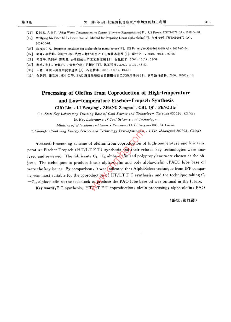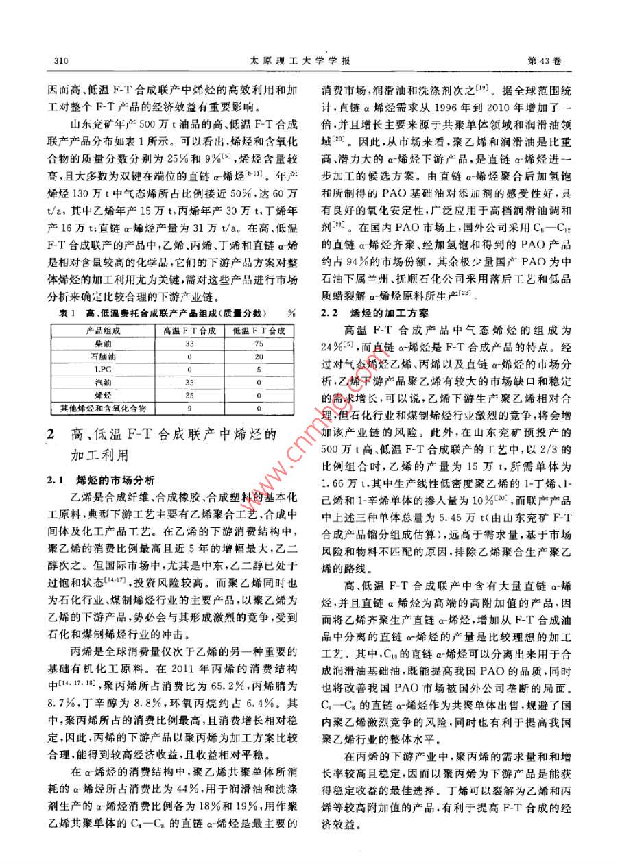 第43卷第3期太原理工大學(xué)學(xué)報(bào)Vol.43 No. 32012年5月JOURNAL OF TAIYUAN UNIVERSITY OF TECHNOLOGYMay 2012文章編號(hào):1007-9432<2012)03- 0309-05高、低溫費(fèi)托合成聯(lián)產(chǎn)中烯烴的加工利用琳'*,李文英10.1,張宗森”,褚綺",馮杰l*(1.太原理工大學(xué)a.煤科學(xué)與技術(shù)省部共建國(guó)家重點(diǎn)實(shí)驗(yàn)室培育基地,b.媒科學(xué)與技術(shù)教育部和山西省重點(diǎn)實(shí)驗(yàn)室,太原030024; 2.上海兗礦能源科技研發(fā)有限公司,上海201203)摘要:對(duì)高、低溫費(fèi)托合成聯(lián)產(chǎn)中烯烴的加工方案及關(guān)鍵工藝進(jìn)行了分析綜述。優(yōu)選了以潤(rùn)滑油、C一C。直鏈a-烯烴、聚丙烯為烯烴下游產(chǎn)品的方案。分析了烯烴及后續(xù)產(chǎn)品加工方案中的兩個(gè)關(guān)鍵技術(shù)工藝,即直鏈a烯烴和聚a-烯烴PAO( poly alpha olefin)潤(rùn)滑油基礎(chǔ)油的生產(chǎn)工藝;認(rèn)為IFP公司的Alphaselect工藝是與高、低溫費(fèi)托合成聯(lián)產(chǎn)匹配度最佳的己烯齊聚制直鏈a-烯烴工藝,以C,- Cz的直鏈a-烯烴為原料來(lái)生產(chǎn)PAO基礎(chǔ)油是必然趨勢(shì)。關(guān)鍵詞:費(fèi)托合成;聯(lián)產(chǎn);烯烴加工;a~烯烴;PAO中圖分類號(hào):O623.121文獻(xiàn)標(biāo)識(shí)碼:A我國(guó)液體燃料日趨短缺[12],據(jù)預(yù)測(cè),2016年我(HT/LT F-T)就是在這樣的背景下提出的。國(guó)汽油需求量將達(dá)到2.50X 10*桶/d,年增長(zhǎng)率將通過(guò)高、低溫F-T合成聯(lián)產(chǎn),可以充分利用相達(dá)到7%;2015年亞太地區(qū)柴油需求量將達(dá)到4.06同的公用輔助T程及產(chǎn)品精制設(shè)備,使設(shè)備品種和X10*桶/d,年增長(zhǎng)率達(dá)到3.5%。在此形勢(shì)下,中數(shù)量精減,實(shí)現(xiàn)高、低溫F-T合成聯(lián)產(chǎn)工藝流程高國(guó)煤化工產(chǎn)業(yè)中煤制替代燃料研究得到國(guó)家支持,度集成,降低固定投資,并以多種化學(xué)產(chǎn)品的收益來(lái)煤炭間接液化作為合成液體燃料的主要手段,以煤平衡油品的效益,規(guī)避油品市場(chǎng)受國(guó)際石油市場(chǎng)波氣化合成氣為原料的費(fèi)托(F-T)合成再次成為關(guān)注動(dòng)帶來(lái)的不確定性風(fēng)險(xiǎn)。因此,開發(fā)以油品、烯烴等的焦點(diǎn)田。F-T合成技術(shù)包括高溫F-T 合成和低化學(xué)品為目標(biāo)產(chǎn)品的高、低溫F-T合成聯(lián)產(chǎn)技術(shù),溫F-T合成兩種[+6,高溫F-T合成工藝的操作溫以化補(bǔ)油,增強(qiáng)F-T合成的油品在市場(chǎng)上與石化行度為310~350C ,操作壓力為2.5 MPa左右;低溫業(yè)油品的競(jìng)爭(zhēng)力,對(duì)于緩解我國(guó)的能源供應(yīng)緊張局F-T合成工藝的操作溫度為210~250C ,操作壓力面,促進(jìn)潔凈煤技術(shù)的發(fā)展都具有重要的學(xué)術(shù)價(jià)值為2.5 MPa左右。高溫FT合成的產(chǎn)品經(jīng)加工可和戰(zhàn)略意義。得到對(duì)環(huán)境友好的汽油、柴油、溶劑油、烯烴和含氧1高、低溫F-T合成聯(lián)產(chǎn)產(chǎn)品的特性化合物”5;低溫F-T合成的主產(chǎn)品石蠟可加工成特種蠟或經(jīng)加氫裂化/異構(gòu)化生產(chǎn)優(yōu)質(zhì)柴油、潤(rùn)滑油基直鏈a-烯烴是一種重要的有機(jī)原料和中間體,礎(chǔ)油,石腦油餾分還是理想的裂解原料"”。F-T合廣泛用于生產(chǎn)共聚單體、潤(rùn)滑油基礎(chǔ)油、表面活性成的油品有效補(bǔ)充S對(duì)石油產(chǎn)品的需求,但同時(shí)也劑、聚烯烴樹脂.增塑劑、染料、藥物制劑等。南非受到石化行業(yè)的沖擊;另外,F-T合成的油品原料清Sasol公司已建成一套從F-T合成產(chǎn)品(富含a~烯潔[:小0,產(chǎn)品無(wú)硫、無(wú)氮,無(wú)雜質(zhì),遠(yuǎn)遠(yuǎn)超前市場(chǎng)需烴)中分離1-戊烯、1-己烯的生產(chǎn)裝置并成功投產(chǎn),求,成本也相應(yīng)增加,顯然經(jīng)濟(jì)性方面不占優(yōu)勢(shì),單該工藝最大優(yōu)點(diǎn)是以煤為原料,把1-戊烯、1-己烯--生產(chǎn)油品的F-T合成工藝的商業(yè)化運(yùn)行困難重作為副產(chǎn)物回收,工業(yè)化生產(chǎn)成本低,獲得較高收重。F-T合成在生產(chǎn)油品的同時(shí)還會(huì)副產(chǎn)大量石腦益「12];IFP公司采用投資少、流程簡(jiǎn)單的Alphase-油、烯烴、含氧化合物甚至化肥等化學(xué)品,是F-T合lect乙烯齊聚工藝,生產(chǎn)附加值較高的直鏈a烯烴成工藝確保盈利的基礎(chǔ),高、低溫費(fèi)托合成聯(lián)產(chǎn)產(chǎn) 品,生產(chǎn)成本低,同樣獲得了較好的經(jīng)濟(jì)效益[3]。收稿日期:2012-03-10基金項(xiàng)目,國(guó)家高技術(shù)研究發(fā)展i計(jì)劃(863計(jì)劃)重大專項(xiàng)課題(2011AA05A204)作者簡(jiǎn)介:郵琳(1988-),女,山西運(yùn)城人,傅士生,主要從事潔凈煤轉(zhuǎn)化技術(shù)研究,(Te)18794130265通訊聯(lián)系人:李文英,博+.教授,博導(dǎo),主要從事煤化工領(lǐng)域的相關(guān)催化化學(xué)研究,(Tel)0351- 6018453310太原理工大學(xué)學(xué)報(bào)第43卷因而高、低溫F-T合成聯(lián)產(chǎn)中烯烴的高效利用和加消費(fèi)市場(chǎng),潤(rùn)滑油和洗滌劑次之([19]。據(jù)全球范圍統(tǒng)工對(duì)整個(gè)F-T產(chǎn)品的經(jīng)濟(jì)效益有重要影響。計(jì),直鏈a-烯烴需求從1996年到2010年增加了一山東兗礦年產(chǎn)500萬(wàn)t油品的高、低溫F-T合成倍,并且增長(zhǎng)主要來(lái)源