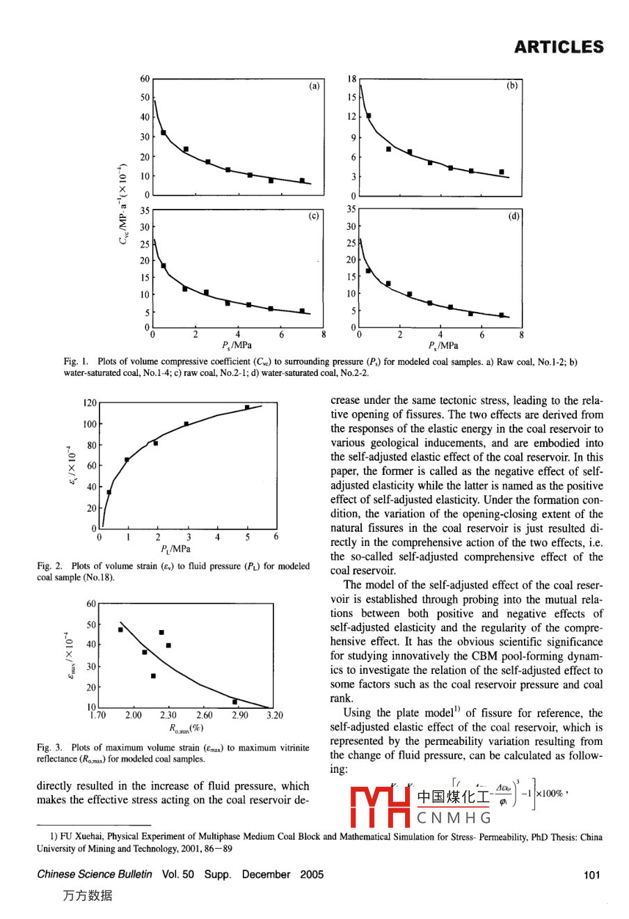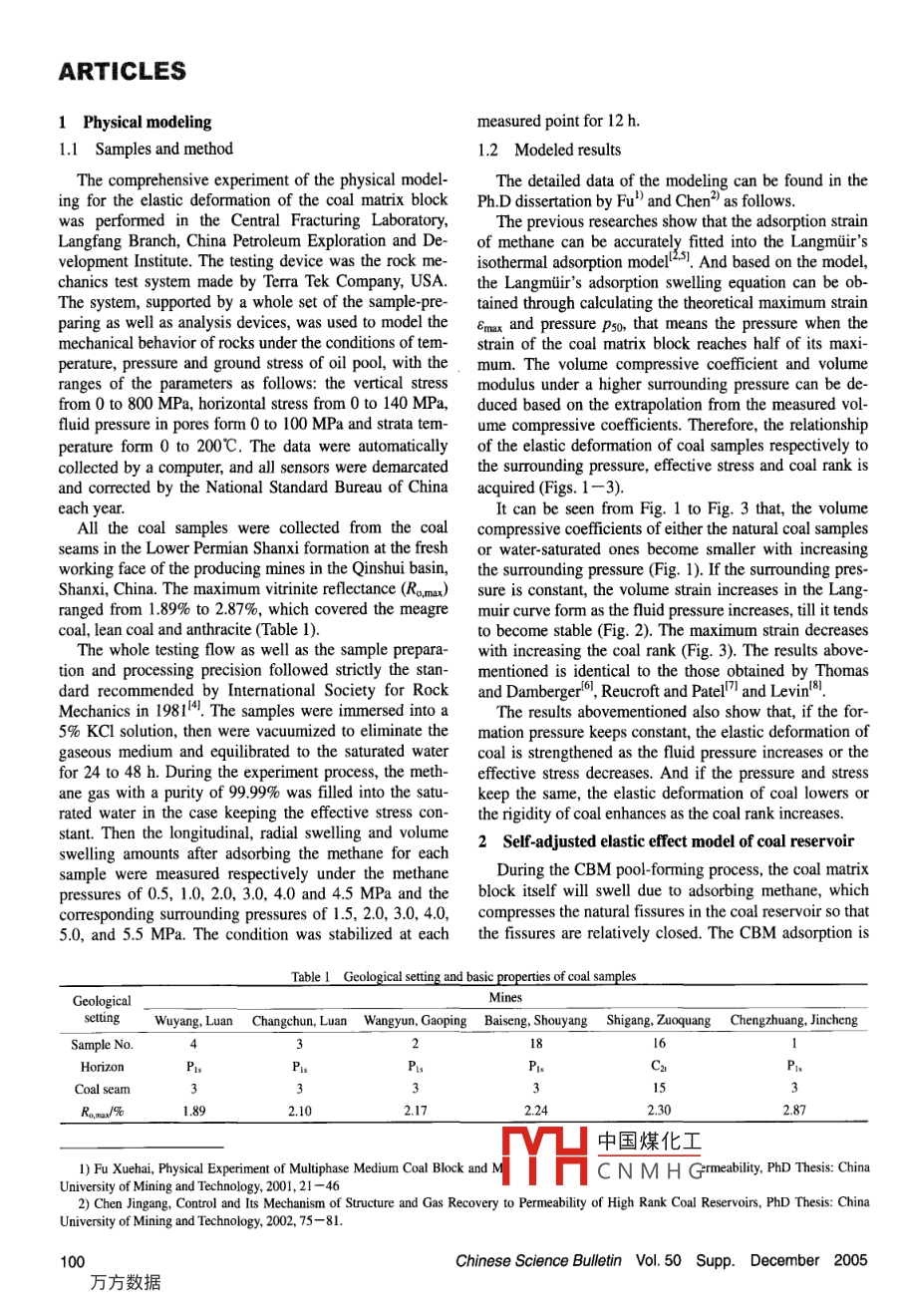 ARTICLESChinese Science Bulletin 2005 Vol 50 Supp 99-103Before being broken under stress, coal is a kind of elas-Self-adjusted elastic actiontic body with a rather compressible or swellable capacityTaking as a kind of the organic reservoir mainly composeand its CBM pool-formingof organic matters, the response of the coal reservoir tostress is more sensitive than some routine ones such aseffect of the high rank coalsandstone and carbonate rock reservoirs. So the directdynamic factors determining the opening or closing extentreservoirof the natural fissures in the coal reservoir include twoaspects. The first is the effective stress, which is expressedIN Yong FU Xuehai, WU Caifang FU Guoyouas the pressure difference of the overall stress, being perBU Yingyingpendicular to the fissure strike, to the fluid pressure inpores and fissures within the coal reservoir, and with inInstitute of Mineral Resources and Geoscience, China University ofcreasing the effective stress the fissures are compressedMining Technology, Xuzhou 221008, Chinaas to become narrow or even close. The second is theCorrespondence should be addressed to Qin Yong(email: yongqinumtedu.cnswelling-shrinking effect of the coal matrix blockrounded by natural fissures. The fissures becomes narrowAbstract The coal reservoir is a kind of geologic body due to the swelling effect derived from the absorbingwith considerable elasticity, and its response to stress is more while the desorption of gas makes the coal matrixsensitive than the routine ones. In the pool-forming process shrunk so that the fissures become wide. However, theof the coalbed methane, (CBM) the action of many externalgeodynamic factors in the coal reservoir is represented by the clanges of effective stress as well as the adsorp-ability of CBM's diffusion and migration in the coal reservoir. tion/desorption process are influenced by some dynamicTherefore the occurrence of the natural fissures in the ceconditions such as the geological structure, groundwaterreservoir becomes a key that determines whether the CBM and geothermal field. These conditions are put on the coalpool can be formed or not. Based on the principle, the au- reservoir itself, making the coal matrix block elasticallythors have designed a comprehensive method of physical deformedmodeling to study the elasticity of the coal matrix block withThe difference of the lithologic character and chemicaldifferent coal ranks in the light of the solid to fluid coupling, structure of coal leads to a variety of the swelling-shrink-have established the model of the volume deformation(self-adjusted elastic effect) of the coal reservoir under the condiing property under stress. Some previous authors studiedtion of the effective stress-adsorption/desorption, and have the relationship of the effective stress and the permeabilityobtained a correct understanding of the law of the elastic of the coal reservoir or the adsorbing-desorbing effect andthe strain of the coal matrix block. For example, Some-self-closing elastic effect for forming the CBM pool in the ton found that the permeability decreased with increashigh rank reservoir, is put forward, providing an initial point ing the effective stress in an exponential form, and Yee etand a scientifie basis for a further investigation into itsal(1993) once used a method similar to the Langmuir'snamic factors, possible mechanism and role in the CBM en- Equation to describe the adsorption strain of the coal ma-gy-balancing syKeywords: coalbed methane, reservoir, elasticity, self-adjusted action, sive action between the effective stress and adsorbingo-forming effect.desorbing effect and the elastic deformation of coal hasDOI:10.136098zk0017never been referred to up to now due to the testing difficulty. Obviously, the opening-closing extent of the fissuresAlthough the CBM pool-forming process is controlled in coal, which is controlled by the effective stress and ad-by many geodynamic factors, its key depends on the rela- sorption swelling, may be different even under the sametively closed geological environment derived from a fastratum condition. Only the comprehensive effect of bothvorable match among these factors, in which the tectonic the factors can just determine the relative opening orstress field, hydrodynamic field of groundwater, geother- closing characteristics of fissuremal field and strata contribute to the formation of such Aiming at the problems mentioned above, the authors,environment However. these factors first act on the coal in the light of the solid-fluid coupling, have designedreservoir itself, which is represented by the diffusing and comprehensive method of physical modeling to investi-migrating ability of CBM within the coal reservoir. Coal gate the elasticity of the high-rank coal matrix blocks soelf is quite unfavorable for CBM diffuestablish an elastic volume deformation model of themmm凵中國煤化工etesures during the geological history, becomes a key factor law ofCN Provides a foundationthat determines whether the CBm pool can be formed or for studying turther the etfect ot the elastic energy to thenotCBM pool-forming processChinese Science Bulletin Vol 50 Supp. December 2005ARTICLES1 Physical modelingmeasured point for 12 h1. 1 Samples and metho1.2 Modeled resultsThe comprehensive experiment of the physical modelThe detailed data of the modeling can be found in theing for the elastic deformation of the coal matrix block Ph D dissertation by Fu"and Chen"as followswas performed in the Central Fracturing Laboratory,The previous researches show that the adsorption strainLangfang Branch, China Petroleum Exploration and De- of methane can be accurately fitted into the Langmuir'svelopment Institute. The testing device was the rock me- isothermal adsorption model 4. And based on the model,chanics test system made by Terra Tek Company, USA. the Langmuir's adsorption swelling equation can be obThe system, supported by a whole set of the sample-pre- tained t