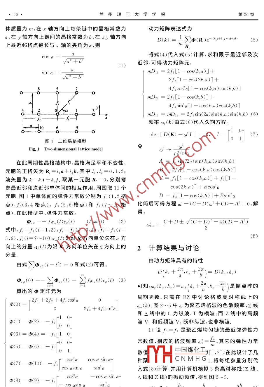 第30卷第3期蘭州理工大學(xué)學(xué)報(bào)Vol. 30 No. 32004年6月Journal of Lanzhou University of TechnologyJun.2004文章編號(hào): 1000-5889(2004 )03-0065-04聚乙烯振動(dòng)譜的研究楊建榮,毛杰鍵.(上饒師范學(xué)院物理系,江西上饒334001)摘要:將幾種不同密度的聚乙烯看成具有二維晶格結(jié)構(gòu),利用晶格動(dòng)力學(xué)的方法,考慮了鏈間耦合作用和鏈中單體間次近鄰的相互作用,計(jì)算了其色散關(guān)系,模擬了相應(yīng)的振動(dòng)譜.討論了隨著密度從高到低,鏈間距從小到大,鏈間耦合作用逐漸減弱所產(chǎn)生的新的物理效應(yīng).關(guān)鍵詞:聚乙烯;密度;二維晶格;動(dòng)力矩陣;振動(dòng)譜中圖分類號(hào): O631. 2文獻(xiàn)標(biāo)識(shí)碼: AStudy of vibrational spectra of polyethyleneYANG Jian- rong, MAO Jie-jian(Dept. of Physics, Shangrao Normal College, Shangrao 334001, China)Abstract: Using the method of lattice dynamics and considering interactions between lattice chains andmonomer's sub-nearest neighbors , the polyethylene with different densities are taken as being two- dimen-sional crystal structure, so that its dispersion relation is calculated and corresponding vibrational spectra isimitated. With the changing of density degressively and interchain distance progressively, the coupling in-teraction between chains decreases gradually, and new physical effect is brought at the same time.Key words: polyethylene; density; two-dimensional lattice; dynamical matrix; vibrational spectra聚乙烯(PE)是一個(gè)由多種工藝方法生產(chǎn)的具認(rèn)為其密度呈現(xiàn)隨支鏈含量增加而降低的趨勢(shì).不有多種結(jié)構(gòu)和特性的系列品種,各種PE的結(jié)構(gòu)通過有相同含量的不同類型支鏈的LLDPE的密度差式可表示成E CH2- CH2禾,n為聚合度.自70年別不明顯[7] ,Monrabal等人[8]用Crystaf方法直接代以來,工業(yè)界和科技界根據(jù)聚乙烯的密度為其分證明了這種密度的降低趨勢(shì).王一任等人[°用傅立類和命名,主要可分為高密度聚乙烯(HDPE)、中密葉變換紅外光譜研究了LDPE,HDPE和UHPE的度聚乙烯(MDPE)、線型低密度聚乙烯(LLDPE)、分子鏈構(gòu)象.本文考慮了這幾種密度的聚乙烯,由于低密度聚乙烯(LDPE)和極低密度聚乙烯(VLDPE)密度不同、鏈間距不同而使鏈間耦合作用不同,根據(jù)等.在分子結(jié)構(gòu)上,其主鏈?zhǔn)蔷哂?定量支鏈的線型鏈間耦合作用和鏈中原子次近鄰的相互作用,可以長(zhǎng)鏈分子,支鏈隨密度的降低而增多,而且是結(jié)晶性將其理想化為具有二維晶格結(jié)構(gòu).利用晶格動(dòng)力學(xué)聚合物,結(jié)晶度由85%降至65%,與密度成線性關(guān)的方法[10~12],計(jì)算和模擬在不同密度的晶格鏈耦合系,其性能與參量見文獻(xiàn)[1,2].最近郭靈虹等人[3]作用下的色散關(guān)系和相應(yīng)的格波色散曲線,由此可使用廣角X射線衍射儀研究了高密度聚乙烯在應(yīng)知,當(dāng)密度較高,鏈間距與晶格常數(shù)可比擬時(shí),應(yīng)該力作用下晶體結(jié)構(gòu)的變化.馮寧等人[4]用13C NMR .把高分子鏈看成具有二維結(jié)構(gòu)特性,如HDPE,技術(shù)研究了不同支化鏈的高密度聚乙烯的支化種類MDPE.LLDPE等.而當(dāng)密度較低,鏈間距遠(yuǎn)大于晶及支化濃度,考察了支化對(duì)其密度及結(jié)晶度的影響.陳彥等人[D]采用分子動(dòng)力學(xué)模擬方法研究了真空狀格常中國(guó)煤化工成具有一維結(jié)構(gòu),如LDP:MYHCNMHG映了維度效應(yīng)的結(jié)態(tài)下單鏈聚乙烯從伸直鏈開始的結(jié)晶過程.Burfield等人[°1通過DSC方法研究了一系列的LLDPE,1理論方法收稿日期: 2003-06-30作者簡(jiǎn)介:楊建榮(1966-),女,江西上饒人,講師.碩士.聚乙烯的二維晶格結(jié)構(gòu)如圖1所示.設(shè)每個(gè)單66●蘭州理工大學(xué)學(xué)報(bào)第30卷體質(zhì)量為m,在x軸方向上每條鏈中的晶格常數(shù)為動(dòng)力矩陣表達(dá)式為a,在y軸方向上鏈間的晶格常數(shù)為b,在xy軸方向D(k) =二> (R()-il.+.,1)(a+M)(5)上最近鄰格點(diǎn)鍵長(zhǎng)與x軸的夾角為a,則將式(4)代入式(5)計(jì)算,求和限于最近鄰及次cosa =a"+b(1)近鄰,可得動(dòng)力矩陣元:sina=√a2+b_GmD1 = 2f.[1 - cos(k,a)] +2f:[1 - cos(2k,a)]+8-04f.cos'a[1 - cos(k,a )cos(k,b)]mD22 = 2fs[1 - cos(k,b)]+f4f4 sin'a[1 - cos(k,a )cos(k,b)]420FaoLmD12 = mD2 = 2f4 sin(2a)sin(k,a)sin(k,b) (6)頻率w。(k)由式(6)代入久期方程:detl| D(K)-w2Ill =0,I=圖1二維晶格模型令Fig. 1 Two-dimensional lattice model(2/m)在此周期性晶格結(jié)構(gòu)中,晶格滿足平移不變性,A = fsin(2a)sin(k. ,a)sin(k,b)元胞的正格矢為R/=la+lzb,其中l(wèi),l2=0,1,2;B= 2f.[1 - cos(k,a )cos(k,b)]波矢量為k=k,i+kj.取某一元胞R,=0,分別考C= f,[1- cos(k,a)]+ f2[1-慮最近鄰和次近鄰單體間的相互作用,周圍取10個(gè)cos(2k,a)] + Bcos2 a .元胞.圖1中單體間的彈性力常數(shù)分別為f1(1,2格D = fs[1- cos(k,b)]+ Bsin'a點(diǎn)),f2(3,4格點(diǎn)),fs(5,6格點(diǎn))和f4(7~10格化簡(jiǎn)后可得方程w'-(C+ D)w*+CD-A°=0,解點(diǎn)),在此模型中,彈性力常數(shù):得:中。β =- fie。(l)ep(l)(l≠0)C+ D士V(C+ D)"- 4(CD- A)wi.2 =式中,fi=fi(l=1,2),fl= f2(l=3,4),fl=fs(l=(8)5,6),f;(l=7~10);e。(l)為沿R方向單位矢在a方向上的分量,ep(l)為沿R方向單位矢在β方向上的2計(jì)算結(jié)果與討論分量.由動(dòng)力矩陣具有的特性由式φ。p(l-l')= 0和式(2)可得:D(k.+m,k,+ )= D(k,k,)aφ。p(0) =- 2φp(l)= Zfie(l)ep(i) (3)可知:o(k.,k,)=w。(k.+π,k,+紅) 是倒點(diǎn)陣的算出的φ矩陣元為周期函數(shù),只