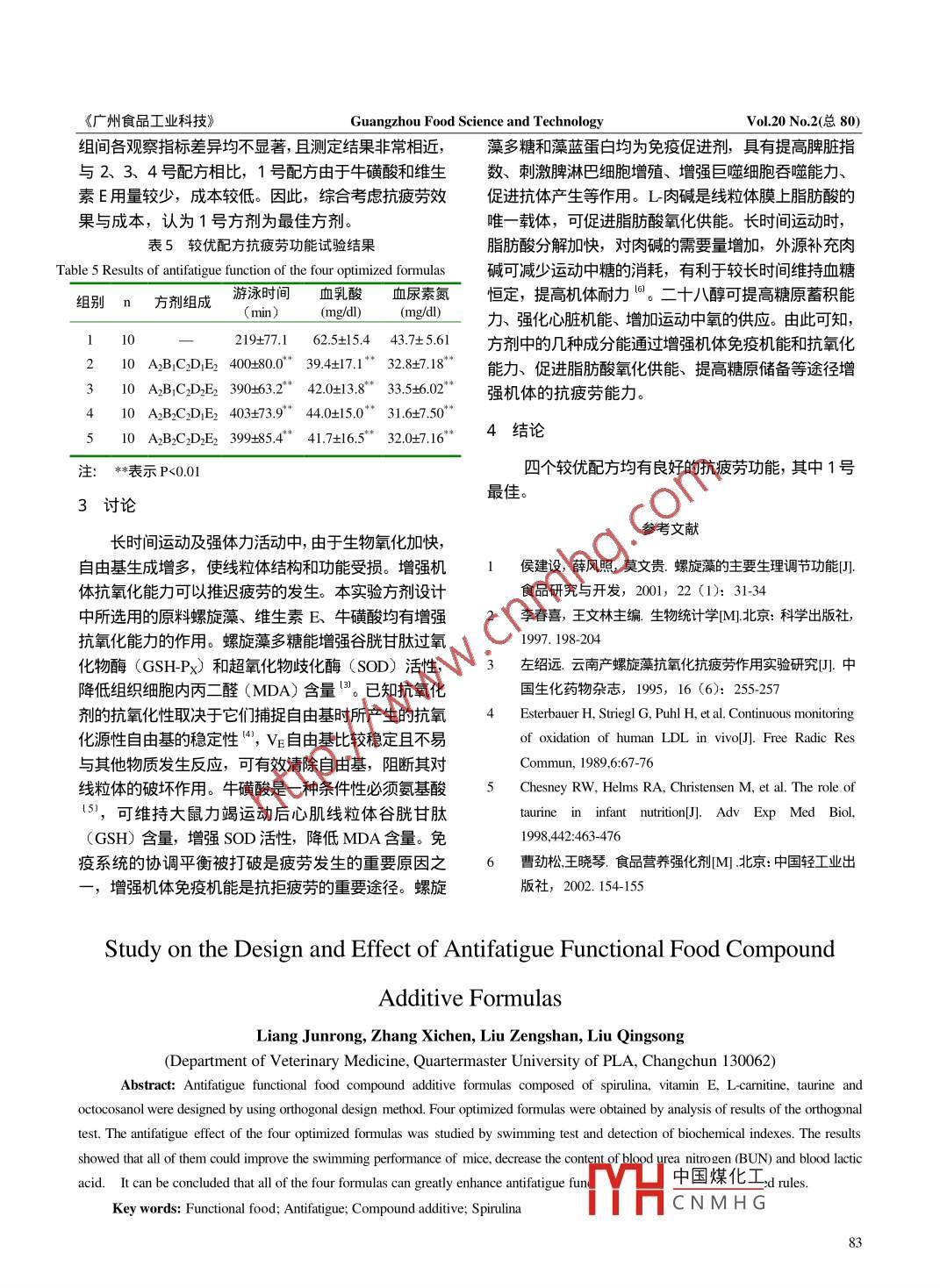 《廣州食品工業(yè)科技》Guangzhou Food Science and TechnologyVol.20 No.2(總80)中圖分類號: TS202.3; 文獻(xiàn)標(biāo)識碼: A;文章篇號: 1007- 2764( 2004) 02- 0081- 032抗疲勞復(fù)方添加劑方劑設(shè)計(jì)及其功效梁俊榮張西臣*柳增善劉慶雙(軍需大學(xué)軍事獸醫(yī)系,長春130062)摘要: 本實(shí)驗(yàn)以螺旋藻、維生素E、L- 肉堿、二十八醇、?;撬釣樵?,采用正交試驗(yàn)方法進(jìn)行了抗疲勞復(fù)方添加劑方劑設(shè)計(jì),得到四個(gè)較優(yōu)配方;通過游泳耐力和生化指標(biāo)的測定研究了四個(gè)較優(yōu)配方的抗疲勞效果。結(jié)果表明,四個(gè)較優(yōu)配方均能顯著延長小鼠游泳時(shí)間,降低血尿素氮和血乳酸含量,具有明顯的抗疲勞效果。關(guān)鍵詞:功能性食品;抗疲勞;添加劑;螺旋藻現(xiàn)代社會中疲勞人群的比例不斷擴(kuò)大,抗疲勞功能性食品添加劑的設(shè)計(jì)研究具有重要意義。螺旋藻被1.4 多因素正交試驗(yàn)12)世界糧農(nóng)組織譽(yù)為“超級營養(yǎng)食品”不僅富含多種維設(shè)定五個(gè)因素、兩個(gè)水平(見表1),按L16 (215)生素及微量元素,而且含有藻藍(lán)蛋白和螺旋藻多糖等正交表(見表2)進(jìn)行正交試驗(yàn),每- -處理組合做6活性成分,具有良好的抗疲勞功能"。本研究以螺旋個(gè)重復(fù)。以游泳耐力為觀察指標(biāo),確定螺旋藻、維生藻、L肉堿、二十八醇、?;撬?、維生素E為原料,素E、L-_肉堿、 ?;撬?、二十八醇五個(gè)因素的主效應(yīng)采用正交試驗(yàn)方法設(shè)計(jì)配方,并通過游泳耐力和生化及其交互作用。通過正交試驗(yàn)結(jié)果分析,設(shè)計(jì)抗疲勞指標(biāo)的測定對所設(shè)計(jì)的配方進(jìn)行抗疲勞效果研究,以復(fù)方添加劑配方。.期獲得較為理想的抗疲勞功能性食品添加劑方劑。各因素的劑量水平設(shè)計(jì)依據(jù)如下:我國GB2760-1996 (1997 增補(bǔ)品種)規(guī)定肉堿的成人推薦用量為1材料與方法300mg/天,維生素E為30mg/天,牛磺酸在食品中的1.1供試藥品強(qiáng)化量-般為0.2%-0.4%。成人體重以60kg計(jì),小鼠螺旋藻為江蘇賜百年?duì)I養(yǎng)食品有限公司生產(chǎn)的食食量以200g/kg 天計(jì),小鼠的兩個(gè)劑量分別設(shè)定為人用級鈍頂螺旋藻原粉,二十八醇(純度為90%和L-的5倍、10 倍,據(jù)此推算出1kg飼料中所需的添加劑肉堿(純度高于999購自北京恒天易德化工有限公量。司,維生素E (純度70%購自江蘇春之谷生物制品有螺旋藻的兩個(gè)劑量水平分別為0g/kg 飼料、限公司,牛磺酸(純度高于999購自湖北富馳化工25g/kg飼料,二十八醇的兩個(gè)劑量水平分別為8mg/kg醫(yī)藥股份有限公司。飼料、20mg/kg 飼料。正交試驗(yàn)設(shè)計(jì)的因素水平見1.2 實(shí)驗(yàn)動(dòng)物及給藥方式表118-22g昆明種雄性小白鼠,軍需大學(xué)實(shí)驗(yàn)動(dòng)物中1.5 配方的抗疲勞功能試驗(yàn)心提供。在22士1°C溫度下飼養(yǎng),自由采食飲水,每正交試驗(yàn)僅以游泳耐力為指標(biāo),只能對配方的天光照8h。小鼠適應(yīng)性飼養(yǎng)一周。將藥品混入飼料中,抗疲勞效果進(jìn)行初步觀察。故對所設(shè)計(jì)的配方通過游以飼喂法給藥兩周,測定各有關(guān)指標(biāo)。泳耐力、血乳酸、血尿素氮(BUN)的測定進(jìn)一步進(jìn)行1.3 游泳耐力的測定抗疲勞功能試驗(yàn)以精選配方,確定最優(yōu)配方。將小鼠放入25士1C的水中,水深為30cm水面試驗(yàn)設(shè)1個(gè)對照組和若干個(gè)試驗(yàn)組,每組30只面積為100cm*50cm以小鼠自游泳開始至沉入水底無小鼠。給藥兩周后,每組各取10只測游泳耐力;另取力上浮的時(shí)間作為游泳時(shí)間。游泳時(shí)的室溫控制在10只置于水溫30土1C水中游泳90nin,游泳后休息本課題為,總后軍需部資助項(xiàng)目60nin拔眼球采血,用二乙酰-肟法測BUN剩余的收稿日期: 2004 02- 2510只小鼠在尾根部負(fù)荷5%體重鉛皮,同樣條件下游泳作者簡介: 1964+, 女河北北方學(xué)院副教授,在讀碩土,主要從事動(dòng)物生10ni n,游泳后中國煤化工生物工程技術(shù)物化學(xué)及功能性食品研究。開發(fā)中心生產(chǎn)YHCNMHG1乳酸。8.《廣州食品工業(yè)科技》Guangzhou Food Science and TechnologyVol.20 No.2(總80)表1正交試驗(yàn)的因子 與水平結(jié)果可知,螺旋藻、二十八醇、L-肉堿是影響游泳耐力Table 1 Factors and levels of the orthogonal test的關(guān)鍵因素,且均以水平2為優(yōu);其它試驗(yàn)因子及各螺旋藻維生素E L_肉堿?;撬?二十八醇因子之間的交互作用對游泳耐力的影響均未達(dá)到顯著(A)(B)(C)D)(性水平,取水平1或水平2均可。因此水平選優(yōu)的結(jié)水平10825400果為: ABGDE2、 ABGDE2、 AB:CDE2 與ABGDE2o水平2508002(四個(gè)較優(yōu)配方中,ABGD.Ez (2號)和ABCDE2 (3注:螺旋藻為g/kg,其它為ng/kg號)分別是正交表中12號和15號處理組合,且其游泳時(shí)間在16 種處理組合中分居第一、第二位,配方2結(jié)果ABCDE、(1號)與ABGDEz (4號)在正交表中沒2. 1正交試驗(yàn)結(jié)果及分析有出現(xiàn)。見表2、表3、表4。從方差分析結(jié)果和直觀分析表2游泳耐力正交 試驗(yàn)結(jié)果Table 2 Results of the orthogonal test實(shí)驗(yàn)69+101112131415x號B AxBAxC BxC DxE)AxDBxDCxECxDBxEAxEE264302340300295285293523543424163240516371表3游泳耐力正交試驗(yàn)結(jié)果直觀分析表4游泳耐力正交試驗(yàn)結(jié)果方差分析Table 3 Direct analysis on result
