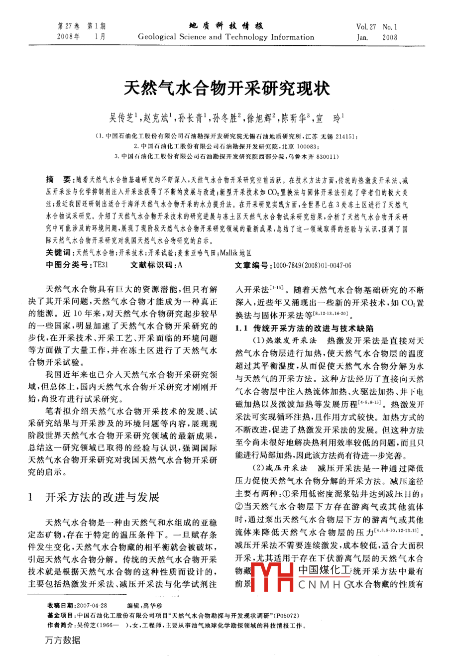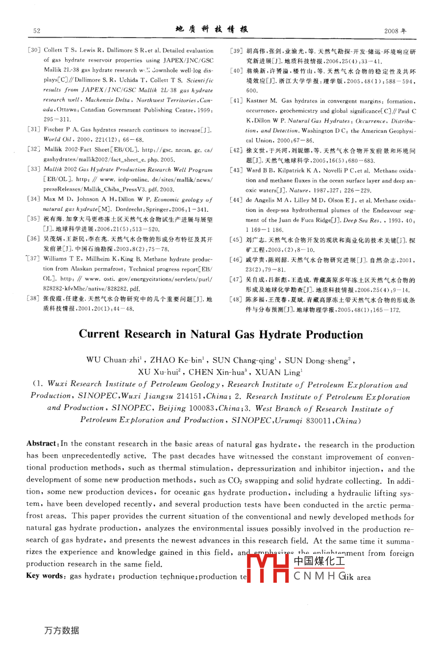 第27卷第1期地質(zhì)科枝情報Vol 27 No. 12008年1月Geological Science and Technology Information天然氣水合物開采研究現(xiàn)狀吳傳芝3,趙克斌,孫長青',孫冬勝2,徐旭輝2,陳昕華3,宣玲1(1.中國石油化工股份有限公司石油勘探開發(fā)研究院無錫石油地質(zhì)研究所,江蘇無錫214151;中國石油化工股份有限公司石油勘探開發(fā)研究院,北京1000833.中國石油化工股份有限公司石油勘探開發(fā)研究院西部分院,烏魯木齊830011)摘要:隨著天然氣水合物基礎(chǔ)研究約不斷深入,天然氣水合物開采研究空前活躍。在技術(shù)方法方面,傳統(tǒng)的熱激發(fā)開采法、減壓開采法與化學(xué)抑制劑注入開采法獲得了不斷的發(fā)晨與改進;新型開采技術(shù)如CO2置換法與固體開采法引起了學(xué)者們的極大關(guān)注;最近我國還研制出適合于海泮天然氣水合物開采的水力提升法。在開采研究實踐方面,全世界已在3處凍土區(qū)進行了天然氣水合物試采研究。介紹了天然氣水合物開采技術(shù)的研究進展與凍土區(qū)天然氣水合物試采研究結(jié)果,分析了天然氣水合物開采研」究中可能涉及的環(huán)境問題,展現(xiàn)了現(xiàn)階段天然氣水合物開釆研究領(lǐng)域的最新成果,總結(jié)了這一領(lǐng)域取得的經(jīng)驗與認識,強調(diào)了國際天然氣水合物開采研究對我國天然氣水合物研究的啟示關(guān)鍵詞:天然氣水合物;開采技術(shù);開采試驗;麥索亞哈氣田;Mlik地區(qū)中圖分類號:TE31文獻標(biāo)識碼:A文章編號:10007849(2008)01004706天然氣水合物具有巨大的資源潛能,但只有解開采法1。隨著天然氣水合物基礎(chǔ)研究的不斷決了其開采問題,天然氣水合物才能成為一種真正深入,近些年又涌現(xiàn)出一些新的開采技術(shù),如CO2置的能源。近10年來,對天然氣水合物研究起步較早換法與固體開采法等121621的一些國家,明顯加速了天然氣水合物開采研究的1.1傳統(tǒng)開采方法的改進與技術(shù)缺陷步伐,在開采技術(shù)、開采工藝、開采面臨的環(huán)境問題(1)熱激發(fā)開采法熱激發(fā)開采法是直接對天等方面做了大量工作,并在凍土區(qū)進行了天然氣水然氣水合物層進行加熱,使天然氣水合物層的溫度合物開采試驗超過其平衡溫度,從而促使天然氣水合物分解為水我國近年來也已介入天然氣水合物開采研究領(lǐng)與天然氣的開采方法。這種方法經(jīng)歷了直接向天然域但總體上,國內(nèi)天然氣水合物開采研究才剛剛開氣水合物層中注入熱流體加熱、火驅(qū)法加熱、井下電始,尚沒有進行試采研究。筆者擬介紹天然氣水合物開采技術(shù)的發(fā)展、試磁加熱以及微波加熱等發(fā)展歷程681。熱激發(fā)開采研究結(jié)果與開采涉及的環(huán)境問題等內(nèi)容,展現(xiàn)現(xiàn)采法可實現(xiàn)循環(huán)注熱,且作用方式較快。加熱方式的階段世界天然氣水合物開采研究領(lǐng)域的最新成果不斷改進促進了熱激發(fā)開采法的發(fā)展。但這種方法總結(jié)這一研究領(lǐng)城已取得的經(jīng)驗與認識,強調(diào)國際至今尚未很好地解決熱利用效率較低的間題,而且只天然氣水合物開采研究對我國天然氣水合物開采研能進行局部加熱因此該方法尚有待進一步完善。究的啟示。(2)減壓開采法減壓開采法是一種通過降低壓力促使天然氣水合物分解的開采方法。減壓途徑1開采方法的改進與發(fā)展主要有兩種:①采用低密度泥漿鉆井達到減壓目的;②當(dāng)天然氣水合物層下方存在游離氣或其他流體天然氣水合物是一種由天然氣和水組成的亞穩(wěn)時,通過泵出天然氣水合物層下方的游離氣或其他定態(tài)礦物存在于特定的溫壓條件下。一旦賦存條流體來降低天然氣水合物層的壓力1:121:1件發(fā)生變化,天然氣水合物藏的相平衡就會被破壞,減壓開采法不需要連續(xù)激發(fā),成本較低,適合大面積引起天然氣水合物分解。傳統(tǒng)的天然氣水合物開采開采,尤其適用于存在下伏游離氣層的天然氣水合技術(shù)就是根據(jù)天然氣水合物的這種性質(zhì)而設(shè)計的,物藏中國煤化工統(tǒng)開采方法中最有主要包括熱激發(fā)開采法、減壓開采法與化學(xué)試劑注前劌CNMH水合物藏的性質(zhì)有收稿日期:2007-0428編輯:禹華珍基金項目:中國石油化工股份有限公司項目“天然氣水合物勘探與開發(fā)現(xiàn)狀調(diào)研”(P05072)作者簡介:吳傳芝(1966—),女,工程師,主要從事油氣地球化學(xué)勘探領(lǐng)域的科技情報工作。地質(zhì)科技情報2008年特殊的要求,只有當(dāng)天然氣水合物藏位于溫壓平衡了海洋天然氣水合物開采的水力提升法2。水力邊界附近時,減壓開采法才具有經(jīng)濟可行性。提升法是利用海底集礦系統(tǒng)對天然氣水合物進行原(3)化學(xué)試劑注入開采法化學(xué)試劑注入開采地粉碎,采集含有固、液、氣三相的混合物質(zhì),由水力法通過向天然氣水合物層中注入某些化學(xué)試劑,如提升系統(tǒng)上傳到海面作業(yè)船上的天然氣水合物分解系鹽水、甲醇、乙醇、乙二醇、丙三醇等,破壞天然氣水統(tǒng),再導(dǎo)入海面高溫海水對天然氣水合物進行分解。合物藏的相平衡條件,促使天然氣水合物分在上述天然氣水合物開采方法中,熱激發(fā)開采解6…1,1211。這種方法雖然可降低初期能量輸法與減壓開采法投入的研究較多,也較為成熟