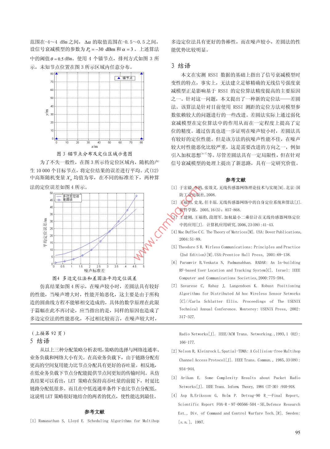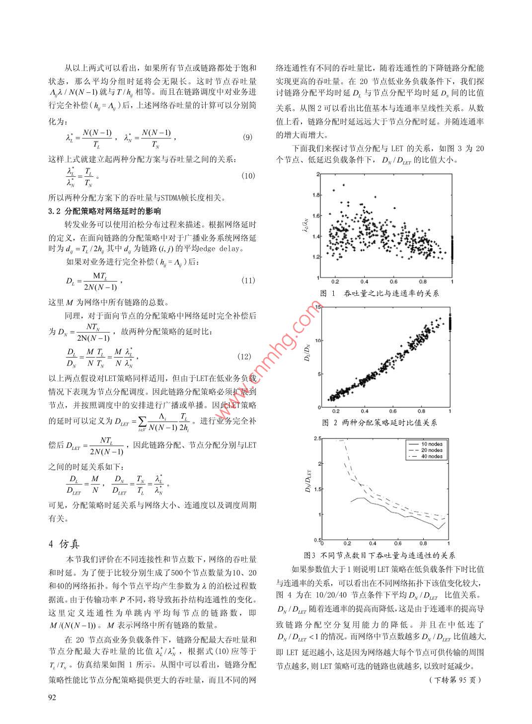 2010年第03期,第43卷通信技術(shù)Vol.43,No.03,2010總第219期Communicat ions TechnologyNo. 219, Totally多跳無線網(wǎng)中基于空分TDMA的時隙分配策略韓成,吳援明(電子科技大學光電信息學院,四川成都610054)【摘要】空分TDMA( STDMA)是基于TDMA的信道接入?yún)f(xié)議,該技術(shù)被應(yīng)用于實時性要求較高的多跳( multi-hop)無線網(wǎng)絡(luò)中,并可使多個在地理位置相互獨立的移動終端使用相同的時隙來増加網(wǎng)絡(luò)容量,不冋移動終端之間的教據(jù)傳輸通過對終端調(diào)度安排來實現(xiàn)。調(diào)度算法一般分為基于節(jié)點或基于鏈路的分配方式。對這兩種方式對比發(fā)現(xiàn),在一定條件下兩者都有不理想的特性。因此,結(jié)合兩種方式優(yōu)點提出了一種新穎的分配策略。仿真結(jié)果表眀:該分配策略在高業(yè)務(wù)負載情況下能滿足鏈路分配的高吞吐量,也能達到低業(yè)務(wù)負載下節(jié)點分配的低延遲【關(guān)鍵詞】 STDMA;多跳無線網(wǎng);媒體介入控制;調(diào)度【中圖分類號】TP393【文獻標識碼】A【文章編號】1002-0802(2010)03-0090-03Slot Assignment Strategies of Spatial Reuse TDMAin Multi-hop Wireless Networkshan Cheng, WU Yuan-ming(College of Optic-electronic Information, UESTC, Chengdu Sichuan 610054, China)(Abstract] In the multi-hop radio networks, spatial reuse TDMa is proposed as an access scheme. The ideais to increase capacity by letting several radio terminals use the same time slot when possible. A time slot couldbe shared when the radio units are geographically separated such that small interference is produced. In reusescheduling, there are several alternative assignment methods. Traditionally, transmission rights are given tenodes or to links. A comparison of these two approaches is given, and it shows that both have undesirable propertiesin certain cases, Furthermore, a novel assignment strategy is proposed, which integrates the advantages of bothmethods. Simulation results indicate that the proposed method could achieve the throughput of link assignmentfor high traffic loads as well as the lower delay characteristics of node assignment for low traffic loads.(Key words] Ad Hoc networks: smart antenna: STDMA: link scheduling引言兩種基本 STDMA調(diào)度策略之一是將傳輸權(quán)直接賦予節(jié)在多跳無線網(wǎng)中一個具有挑戰(zhàn)性的問題是如何保證延點。另一種將傳輸權(quán)賦予鏈路。節(jié)點分配算法和鏈路分配算遲。相關(guān)文獻研究表明使用CSMA的接入方式,在需提供具有法在文獻[2]中有過深入的探討。研究表明不論是節(jié)點分配延遲保證的應(yīng)用環(huán)境表現(xiàn)很差。解決這類問題可以引入時還是鏈路分配在尋找最小長度調(diào)度是都歸結(jié)為全NP問題分多址接入TDM。但在 Ad hoc網(wǎng)絡(luò)中鏈路相對較少時使用在本文中,我們提出了一個結(jié)合兩者優(yōu)點的分配策略。該策效率不高。一個對TDM機制的有效改進方法是空分TDM,它略基于鏈路調(diào)度,但是傳輸權(quán)被擴展。該方式提高了鏈路分將無線結(jié)點之間的物理距離考慮在內(nèi),規(guī)定互相不干擾的通訊鏈路可以在相同的時間片內(nèi)傳輸,從而減少了網(wǎng)絡(luò)所需時配的空間利用程度。為了對比該策略是否優(yōu)于單純的節(jié)點或間片的總量,從而提高了整個網(wǎng)絡(luò)的吞吐量。其容量的提高鏈路分配,我們使用在TDMA調(diào)度中經(jīng)常使用的網(wǎng)絡(luò)干擾模通過時隙的空間復用來實現(xiàn),而延遲保證有TDM來提供型。我們將分別采用分析法和仿真來估計該策略在不同網(wǎng)絡(luò)通性下的端到端時延和吞吐量收稿日期:2008-12-31作者簡介:韓成(1984-),男,碩士研究生,主要研究方向為無線移動網(wǎng)絡(luò)MAC技術(shù)、組網(wǎng)技術(shù):吳援明(1966-),男,教1網(wǎng)絡(luò)模型碩士生導師,主要研究方向為現(xiàn)代通信中的信號處理。假設(shè)使用全向天線并且所有節(jié)點具有相同的傳輸功率。對于任意兩個節(jié)點(,),其中v表示發(fā)送節(jié)點,ν表示接包的傳輸方向,除了分配的接收節(jié)點外,新的接收節(jié)點對于收節(jié)點,且v≠v,節(jié)點v和節(jié)點v之間的鏈路可以成功傳不等式(4)n(,0≥y,,V()∈L仍能得到滿足,這就意輸分組的條件是節(jié)點間的信噪比(SNR)超過一個門限,即味著對于其他接收節(jié)點的干擾級別并沒有改變。r=PG(,2基于上述理由改進的面向鏈路分配策略可以描述為,對于已分配時隙的鏈路,首先檢查該條鏈路上是否有分組需要其中,P表示發(fā)送節(jié)點v的傳輸功率。G(,)表示節(jié)點v2、傳輸,如果沒有便將該時隙分配給具有相同發(fā)送節(jié)點的其他,之間的鏈路增益。N表示在接收節(jié)點所有的噪聲功率。鏈路(該鏈路上存在數(shù)據(jù)包傳送)。當然為了避免不必要的分如果SNR不小于通信門限y’我們說一對節(jié)點C,v)形成組丟失,無沖突鏈路可以按照優(yōu)先級來選擇。我們定義該策條鏈路()。n表示網(wǎng)絡(luò)中形成的鏈路集合,定義為略為基于擴展傳輸權(quán)限的鏈路分配策略 LET (Linkn={(0:≥7}。任意的鏈路集合的子集L≤n,定義t with Extended Transmission Rights)發(fā)送節(jié)點(L)=:(,)∈L}。下面我們證明重新分配傳輸權(quán)的鏈路不會對本時隙中干擾包括背景噪聲和所有并發(fā)鏈路的同頻干擾。對于任其他鏈路引入附加的競爭。設(shè)按照公式(4)能同時傳輸?shù)逆溡怄溌?j)∈L,定義干擾