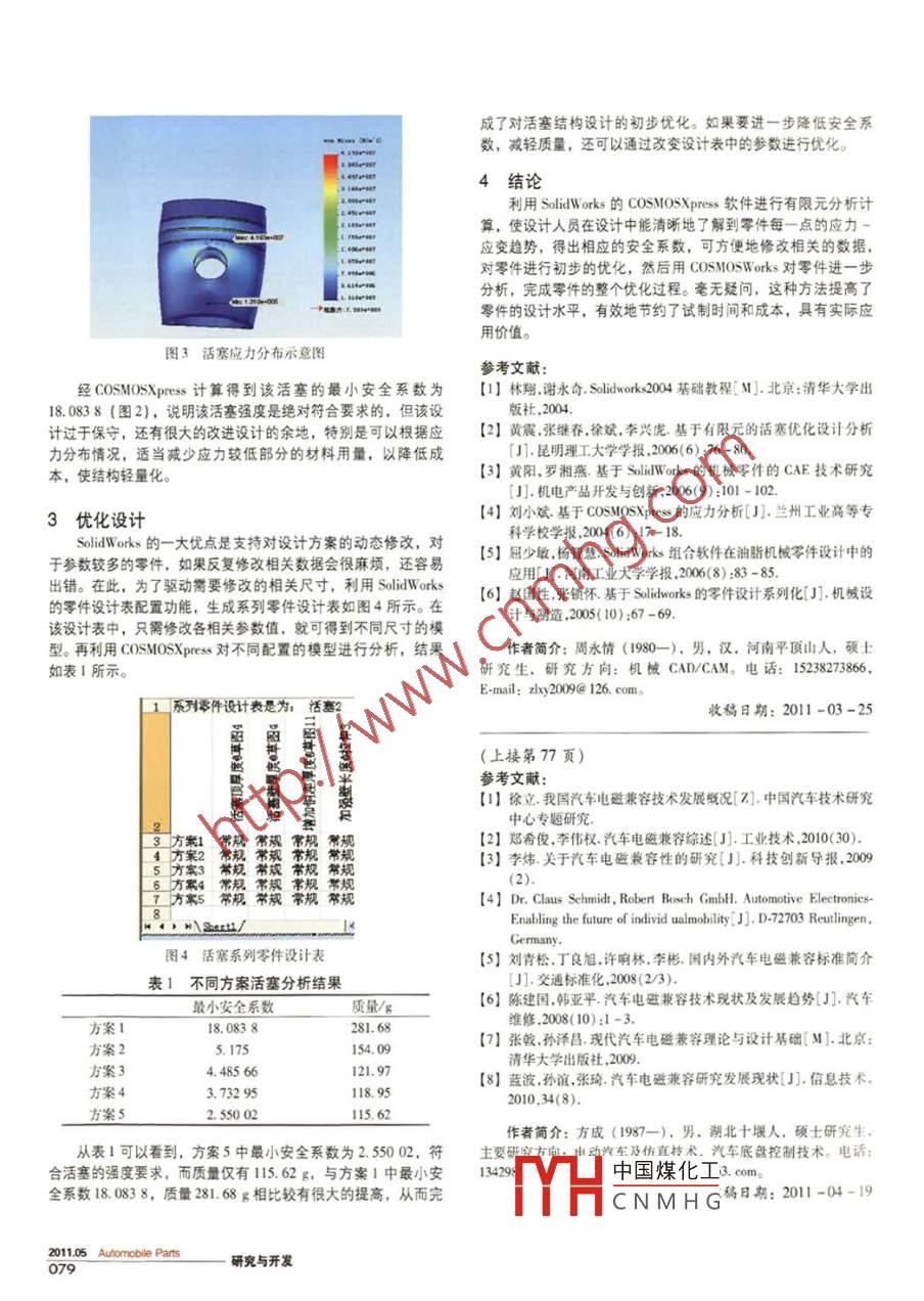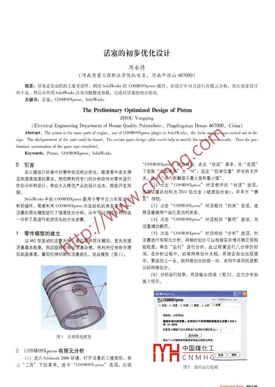 活塞的初步優(yōu)化設(shè)計周永情(河南質(zhì)量工程職業(yè)學(xué)院機(jī)電系,河南平頂山467000)摘要:活塞是發(fā)動機(jī)的主要零部件,利用SolidWorks的COSMOSXpress插件,在設(shè)計中對共進(jìn)行有限元分析.找出強(qiáng)度設(shè)計的不足。然后再利用SolidWorks自身功能修改參數(shù),完成對活塞的初步優(yōu)化。關(guān)鍵詞:活塞; COSMOSXpress; SolidWorksThe Preliminary Optimized Design of PistonZHOU Yongqing( Elctrical Engineering Department of Henan Quality Polytechnic, Pingdingshan Henan 467000, China)Abstract:; The piston is the main parts of engine, use of COSMOSXpress plugin in SolidW orks, the finite analysis was carried out in de-sign. The disigurement of the part could be found, The scriate parts design lable could help to modify the model conveniently. Then the pre-liminary optimization of the parts was completed.Keywords: Piston; COSMOSXpress; SolidWorks0引言“COSMOSXpress”對話框后,點擊“歡迎"菜單,在“選項"在三維設(shè)計環(huán)境中對零件完成初步優(yōu)化,能使零件首先滿下選取“單位體系"為"SI",選定“結(jié)果位置”所在的文件足剛度或強(qiáng)度的要求,然后再利用專門的分析軟件對零件進(jìn)行夾,選中“應(yīng)力圖解顯示最大值和最小值"。優(yōu)化分析和設(shè)計,將會大大降低產(chǎn)品的設(shè)計成本,縮短開發(fā)周(2)點擊“COSMOSXpes" 對話框中的“材質(zhì)”選項,期選擇活塞的材料為2024鋁合金(硬質(zhì)鋁合金),并單擊“"確SolidWorks 中的COSMOSXpress是用于零件應(yīng)力有限元分定”按鈕。析的插件,筆者利用COSM0SXpress對發(fā)動機(jī)的典型零件一(3)點擊“COSMOSXpress" 對話框的“約束"選項,活塞的簡化模型進(jìn)行了強(qiáng)度優(yōu)化分析,從中可以總結(jié)出利用這擇活塞銷兩個座孔面為約束面。-分 析工具進(jìn)行初步優(yōu)化的方法步驟。(4) 點擊“COSMOSXpres" 對話框的“載荷”選項,為活塞增加載荷。1零件 模型的建立(5)點擊“COSMOSXpress"對話框的“分析”選項,對以462型發(fā)動機(jī)活塞為例,建立零件簡化模型。首先創(chuàng)建活塞進(jìn)行有限元分析。網(wǎng)格的劃分可以根據(jù)實際情況確定其粗活塞基本輪廓,然后旋轉(zhuǎn)切除出活塞環(huán)槽,再利用拉伸命令增細(xì)程度;單擊“運行”進(jìn)行分析,此過程要進(jìn)行幾分鐘的時加銷座厚度,最后拉伸切除出活塞銷孔,完成模型(圖1)。間。在分析過程中,如果網(wǎng)格劃分太粗,系統(tǒng)會自動出現(xiàn)提示,要返回上一步,把網(wǎng)格劃分的細(xì)一些。本例中采用的是默認(rèn)的網(wǎng)格劃分。(6) 分析運行結(jié)束,自動輸出結(jié)果(圖2)。應(yīng)力分布如圖3所示。CoSOStprear口白區(qū)時COSMOSXpesCOMSTpresE 酒歡迎⑥樹質(zhì)@的柬e載裝|分析結(jié)果權(quán)您。分析克機(jī)。領(lǐng)粥所有定的步眼。在黨設(shè)計中所我到的量低安全系數(shù)(rS)約要量示盟中安全不熟低于此為的關(guān)德區(qū)準(zhǔn)心):圖1活塞簡化模型C顯示機(jī)例中國煤化工2 COSMOSXpress 有限元分析(1)進(jìn)入Solidwork 2006環(huán)境,打開活塞的三維圖形。單MHCNMH(擊“工具”下拉菜單,選中"COSMO5KXpress"選項。出現(xiàn)圖2最后運行結(jié)果Automobile Pat 2011.05研究與開發(fā).078成了對活塞結(jié)構(gòu)設(shè)計的初步優(yōu)化。如果要進(jìn)一步降低安全系一mDer數(shù),減輕質(zhì)量,還可以通過改變設(shè)計表中的參數(shù)進(jìn)行優(yōu)化。4結(jié)論利用SolidWorks的COSMOSXpress軟件進(jìn)行有限元分析計算,使設(shè)計人員在設(shè)計中能清晰地了解到零件每-點的應(yīng)力-應(yīng)變趨勢,得出相應(yīng)的安全系數(shù),可方便地修改相關(guān)的數(shù)據(jù),對零件進(jìn)行初步的優(yōu)化,然后用COSMOSWorks對零件進(jìn)-步分析,完成零件的整個優(yōu)化過程。毫無疑問,這種方法提高了零件的設(shè)計水平,有效地節(jié)約了試制時間和成本,具有實際應(yīng)用價值。圖3活塞應(yīng)力分布示意圖參考文獻(xiàn):經(jīng)COSMOSXpress計算得到該活塞的最小安全系數(shù)為[1]林翔,謝永奇。Solidwork2004基礎(chǔ)教程[ M].北京:清華大學(xué)出18.0838 (圖2),說明該活塞強(qiáng)度是絕對符合要求的,但該設(shè)版社,2004.計過于保守,還有很大的改進(jìn)設(shè)計的余地,特別是可以根據(jù)應(yīng)[2]黃震,張繼春,徐斌。李興虎基于有限元的活塞優(yōu)化設(shè)計分析力分布情況,適當(dāng)減少應(yīng)力較低部分的材料用量,以降低成[3] 黃陽,羅湘燕基于SolidWorks的機(jī)械零件的CAE技術(shù)研究[J].昆明理工大學(xué)學(xué)報2006(6):76 -80.本,使結(jié)構(gòu)輕量化。[].機(jī)電產(chǎn)品開發(fā)與創(chuàng)新2006(9):1)01 - 102.[4]劉小斌基于COSMOSXpress的應(yīng)力分析[]。蘭州工業(yè)高等專3優(yōu)化設(shè)計科學(xué)校學(xué)報2004(6):17 -18.SolidWorks 的一大優(yōu)點是支持對設(shè)計方案的動態(tài)修改,對[5]屈少敏,楊智慧SolidWorks組合軟件在油脂機(jī)械零件設(shè)計中的于參數(shù)較多的零件,如果反復(fù)修改相關(guān)數(shù)據(jù)會很麻煩,還容易應(yīng)用[J].河南工業(yè)大學(xué)學(xué)報,2006(8):83 -85.出錯。在此,為了驅(qū)動需要修改的相關(guān)尺寸,利用SolidWorks[6]趙國性,張鎖懷基于Slidworks的零件設(shè)計系列化[J].機(jī)械設(shè)的零件設(shè)計表配置功能,生成系列零件設(shè)計表如圖4