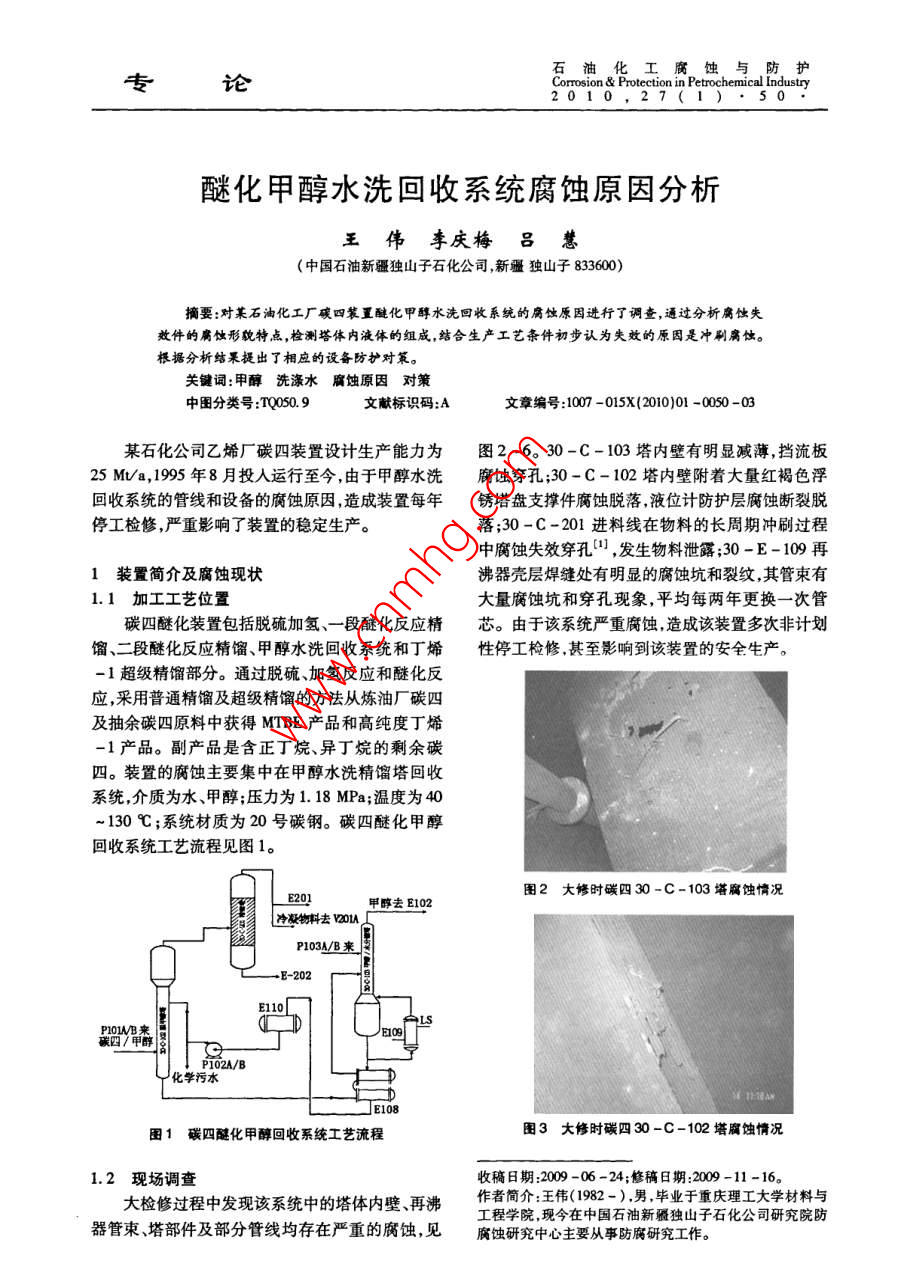石油化專論Corrosion& Protection in Petrochemical Industry27(1)醚化甲醇水洗回收系統(tǒng)腐蝕原因分析王偉李慶梅呂慧(中國石油新疆獨山子石化公司新疆獨山子833600)摘要:對某石油化工廠碳四裝置醚化甲醇水洗回收系統(tǒng)的腐蝕原因進(jìn)行了調(diào)查,通過分析腐蝕失效件的腐蝕形貌特點,檢測塔體內(nèi)液體的組成,結(jié)合生產(chǎn)工藝條件初步認(rèn)為失效的原因是沖刷腐蝕。根據(jù)分析結(jié)果提出了相應(yīng)的設(shè)備防護(hù)對策關(guān)鍵詞:甲醇洗滌水腐蝕原因?qū)Σ咧袌D分類號:TQ00.9獻(xiàn)標(biāo)識碼A文章編號:005000某石化公司乙烯廠碳四裝置設(shè)計生產(chǎn)能力為圖2~6。30-C-103塔內(nèi)壁有明顯減薄,擋流板25Mta,1995年8月投人運行至今,由于甲醇水洗腐蝕穿孔;30-C-102塔內(nèi)壁附著大量紅褐色浮回收系統(tǒng)的管線和設(shè)備的腐蝕原因,造成裝置每年銹塔盤支撐件腐蝕脫落,液位計防護(hù)層腐蝕斷裂脫停工檢修,嚴(yán)重影響了裝置的穩(wěn)定生產(chǎn)。落;30-C-201進(jìn)料線在物料的長周期沖刷過程中腐蝕失效穿孔(,發(fā)生物料泄露;30-E-109再1裝置簡介及腐蝕現(xiàn)狀沸器殼層焊縫處有明顯的腐蝕坑和裂紋,其管束有1.1加工工藝位置大量腐蝕坑和穿孔現(xiàn)象,平均每兩年更換一次管碳四醚化裝置包括脫硫加氫、一段醚化反應(yīng)精芯。由于該系統(tǒng)嚴(yán)重腐蝕,造成該裝置多次非計劃餾、二段醚化反應(yīng)精餾、甲醇水洗回收系統(tǒng)和丁烯性停工檢修甚至影響到該裝置的安全生產(chǎn)。-1超級精餾部分。通過脫硫、加氫反應(yīng)和醚化反應(yīng),采用普通精餾及超級精餾的方法從煉油廠碳四及抽余碳四原料中獲得MTBE產(chǎn)品和高純度丁烯-1產(chǎn)品。副產(chǎn)品是含正丁烷、異丁烷的剩余碳四。裝置的腐蝕主要集中在甲醇水洗精餾塔回收系統(tǒng),介質(zhì)為水、甲醇;壓力為1.18MPa;溫度為40130℃;系統(tǒng)材質(zhì)為20號碳鋼。碳四醚化甲醇回收系統(tǒng)工藝流程見圖1。圖2大修時碳四30-C-103塔腐蝕情況甲醇去E102冷凝鈉料去Y0AE110P102A/B化學(xué)污水圖1碳四醚化甲醇回收系統(tǒng)工藝流程圖3大修時碳四30-C-102塔腐蝕情況1.2現(xiàn)場調(diào)查收稿日期:200-06-24;修稿日期:2009-11-16。大檢修過程中發(fā)現(xiàn)該系統(tǒng)中的塔體內(nèi)壁、再沸作者簡介:王偉(1982-),男畢業(yè)于重慶理工大學(xué)材料與工程學(xué)院,現(xiàn)今在中國石油新疆獨山子石化公司研究院防器管束塔部件及部分管線均存在嚴(yán)重的腐蝕見腐蝕研究中心主要從事防腐研究工作第1期王偉等.醚化甲醇水洗回收系統(tǒng)腐蝕原因分析51成腐蝕環(huán)境,由此可知管線外壁的腐蝕是由管線泄漏處滲出的含水物料引起的,即物料中存在腐蝕性介質(zhì)。0.605圖430-C-201進(jìn)料管線泄漏點外觀時間(年-月一日)圖7物料進(jìn)口腐蝕速率變化情況圖5E-109再沸器焊縫處腐蝕形貌時間(年-月一日圖8冷凝水pH值和Fe2·(Fe3·)變化情況表1保溫棉中含有的化學(xué)物質(zhì)分析Na NH. K Mg Ca CI- SO2- NO, F-aa812~0358L35680a531545-a0llE-109再沸器管束腐蝕形貌L.4.2洗滌水分析1.3腐蝕監(jiān)測界區(qū)的軟化水作為30-C-102塔的洗滌補(bǔ)在線腐蝕探針監(jiān)測發(fā)現(xiàn)碳四車間甲醇水洗回充水,在裝置內(nèi)循環(huán)使用,從30-C-102塔頂和收系統(tǒng)30-E-109腐蝕速率較高,月平均腐蝕速塔底分別取洗滌水樣做硫化物、pH值和氯離子分率高達(dá)0.421mm/a,嚴(yán)重超出該裝置的控制指標(biāo),析,結(jié)果見表2。表230-C-102塔洗滌水樣分析結(jié)果,%應(yīng)加強(qiáng)甲醇水洗-回收系統(tǒng)的運行監(jiān)控。醚化甲醇水洗回收系統(tǒng)的冷凝水中Fe2和Fe“隨pH值取樣部位硫化物PH值也存在大幅波動,應(yīng)注意pH值的平穩(wěn)操作,詳見8.68圖7,8。30-C-102塔頂1.4介質(zhì)分析30C-102塔底未檢出8.711.4.1保溫棉分析為了查找管線外部腐蝕原因,從裝置上取回保根據(jù)分析數(shù)據(jù),洗滌水中存在少量氯離子等腐溫棉,經(jīng)過處理后測定其含有的化學(xué)物質(zhì)如表1。蝕介質(zhì),同時30-C-201精餾塔的進(jìn)口物料中含根據(jù)以上分析結(jié)果判斷保溫棉中含有的腐蝕有15mg/kg左右的水(指標(biāo)為不大于20mg/kg的介質(zhì)不會直接對管線造成腐蝕,而且經(jīng)調(diào)查該管水)。物料里含有少量水和氯離子等腐蝕介質(zhì)會段保溫棉捆扎嚴(yán)實,不會有雨水等滲入保溫棉中形引起碳鋼設(shè)備及管線的腐蝕2。石油化工腐蝕與防護(hù)第27卷2腐蝕原因統(tǒng)中循環(huán)利用,所以生產(chǎn)補(bǔ)水應(yīng)控制無鹽水的水質(zhì)可以肯定C4、甲醇和水幾種介質(zhì)以任何比例及工藝?;旌蠈μ间摬馁|(zhì)均不構(gòu)成腐蝕,因為在反應(yīng)系統(tǒng)沒(2)溶解氧的來源:洗滌補(bǔ)充水來自軟水區(qū)的有給設(shè)備造成腐蝕。但進(jìn)人甲醇水洗回收系統(tǒng)后軟水罐,同原料甲醇罐一樣,均是常壓罐,空氣中的對碳鋼設(shè)備造成了嚴(yán)重的腐蝕,由分析結(jié)果、腐蝕氧溶解在水和甲醇中,隨進(jìn)料線進(jìn)入甲醇水洗回收產(chǎn)物及其腐蝕特征可以推測是一種氧化和沖刷共系統(tǒng),在這里溶解氧和水構(gòu)成了原電池的陰極吸氧同作用而引起的腐蝕,其最終腐蝕產(chǎn)物為紅褐色粉腐蝕條件溶解氧含量越高,腐蝕速率越快因此應(yīng)末或