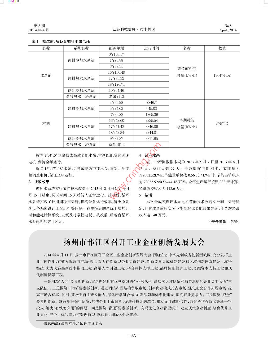 第8期江蘇科技信息2014年4月Jiangsu Science & Technology InformationApril,2014循環(huán)水系統(tǒng)能效優(yōu)化分析周文啟,呂曉梅(江蘇禾友化工有限公司,江蘇宿遷223809)摘要:文章以江蘇禾友化工有限公司為例,分析了循環(huán)水系統(tǒng)運(yùn)行狀況,探討了循環(huán)水系統(tǒng)節(jié)能技術(shù)改造方案,最后闡述了技改效果和經(jīng)濟(jì)效果。關(guān)鍵詞:循環(huán)水泵電機(jī);節(jié)能;技術(shù)改造0引言熱水系統(tǒng)配有9*.10*兩臺(tái)水泵電機(jī)(一用一備),額定功率江蘇禾友化工有限公司(以下簡稱禾友公司)目前具備90kW的水泵電機(jī),閘閥開度50% ,實(shí)際電流分別為90A,該系200kt/a 合成氨,聯(lián)產(chǎn)80kt/a聯(lián)醇的生產(chǎn)能力。2007 年,禾友統(tǒng)存在明顯富裕量,其工藝要求保證冷卻塔水池液位平衡??晒竞铣砂鄙a(chǎn)系統(tǒng)實(shí)現(xiàn)兩水閉路循環(huán),即造氣污水循環(huán)系考慮對(duì)其中一臺(tái)90kW電機(jī)進(jìn)行改造。統(tǒng)和碳化、合成氨工藝水循環(huán)系統(tǒng)。循環(huán)水泵電機(jī)啟動(dòng)方式1.3合成氨循環(huán)水 系統(tǒng)采用直接啟動(dòng),系統(tǒng)壓力為0.4MPa,從運(yùn)行來看,存在較大富冷排冷卻水系統(tǒng)共配備15 臺(tái)水泵電機(jī),其中冷水泵6臺(tái), :余空間,閥門開啟度有20%-80%左右,閥門對(duì)水有阻擋作執(zhí)熱水泵9臺(tái)。用,多消耗系統(tǒng)能量。根據(jù)禾友公司的生產(chǎn)負(fù)荷,江蘇恒豐勁其中冷水泵1.2* .3*水泵功率為90kW,流量為792m2/h, .力節(jié)能科技有限公司對(duì)循環(huán)水系統(tǒng)進(jìn)行了測試檢測,經(jīng)過科揚(yáng)程32 m ,轉(zhuǎn)速為1450r/min,配用電機(jī)功率為90kW ,電壓學(xué)論證,拿出對(duì)循環(huán)水系統(tǒng)節(jié)能改造方案,禾友公司決定實(shí)380V ,轉(zhuǎn)速為1485r/min。 4#、 5# .6#水泵功率,為75kW ,流量施這一方案。為400 m/h,揚(yáng)程32 m,轉(zhuǎn)速為1450 r/mine以上水泵正常是一1 循環(huán)水系統(tǒng)運(yùn)行狀況用一備,所有水泵管網(wǎng)并聯(lián),其閥門- -旦設(shè)制好基本不動(dòng),以保1.1 造氣污水冷卻水循環(huán)水系統(tǒng)持整個(gè)水系統(tǒng)流量平衡,現(xiàn)場看各閥門均未全開,開度在50%造氣循環(huán)水冷卻水泵為160kW兩臺(tái)(-一用- - 備),電機(jī)額-60%之間。定功率160kW,額定電流287A,功率因數(shù)0.89,額定轉(zhuǎn)速熱水系統(tǒng)為11*~19*,共配備9臺(tái)水泵電機(jī),其中11*-15*1480r/min, 水泵轉(zhuǎn)速1450 r/min,水泵額定流量000m2/h,揚(yáng)程為45kW,開3臺(tái)備2臺(tái)。16* 水泵為132kW ,17*~19* 為90kW40m,電機(jī)運(yùn)行電流210A,閥門開度80%,運(yùn)行壓力0.4MPa,其(2用臺(tái)備2臺(tái))。由于水泵配備情況較多樣,系統(tǒng)的壓力需求系統(tǒng)實(shí)際供水高度為25m,系統(tǒng)末端有二次閥門控制,各用水在0.35MPa,現(xiàn)實(shí)際壓力為0.4MP,但從現(xiàn)場情況看,其閥門均部門根據(jù)需要控制水量,電機(jī)啟動(dòng)方式為自耦降壓啟動(dòng)。未全開,存在一一定的節(jié)能空間。熱水泵為132kW兩臺(tái)(一用- -備),電機(jī)額定功率132kW,2循環(huán)水 系統(tǒng)節(jié)能技術(shù)改造方案額定電流239A,功率因數(shù)0.89,額定轉(zhuǎn)速1480 r/min,水泵轉(zhuǎn)本次技術(shù)改造是在滿足正常生產(chǎn)負(fù)荷前提下,充分利用大速1450 r/min,水泵額定流量1000m?/h,揚(yáng)程30m,電機(jī)運(yùn)行電氣壓力設(shè)計(jì)量身定做與系統(tǒng)相匹配的高效節(jié)能設(shè)備。流195A,考慮到后續(xù)可能再建冷卻塔,上水泵配置留有非常大2.1造氣污水冷卻水循環(huán)水系統(tǒng)的余量空間,目前水泵出水閥開度(閘閥)僅10% -20%左右,水拆除上塔1臺(tái)熱水泵電機(jī),更換成1臺(tái)勁力高效節(jié)能水泵憋泵情況較為嚴(yán)重,電機(jī)啟動(dòng)方式為自耦降壓啟動(dòng)。泵,重新匹配變頻調(diào)速電機(jī),保持全年運(yùn)行。1.2碳化循環(huán)水 系統(tǒng)2.2碳化循環(huán)水系統(tǒng)冷卻水系統(tǒng)配有7° .8*兩臺(tái)水泵電機(jī)(一用一備 ),額定功拆除1臺(tái)熱水泵和1臺(tái)冷水泵電機(jī),更換成高效節(jié)能水率90kW的水泵電機(jī),額定電壓380V,閘閥開度60% ,壓力為泵,重新匹配變頻調(diào)速電機(jī),全年正常運(yùn)行。0.3MPa,實(shí)際運(yùn)行電流75A、85A。實(shí)際供水高度不超過20m。2.3合成氨循環(huán)水系統(tǒng)作者簡介:周文啟(1963- ),男,江蘇宿遷,工程師。-62-第8期2014年4月.江蘇科技信息.技術(shù)探討April,2014表1技改前、后各 臺(tái)循環(huán)水泵電耗名稱系統(tǒng)名稱能源單耗運(yùn)行時(shí)間.數(shù)值0*: 130.17冷排冷卻水系統(tǒng)1*:96.88 .3*:89.31改造前耗能16*:100.49改造前總量(kW.h)136474452冷排熱水水系統(tǒng)17*:85.3218*:126.71碳化冷卻水系統(tǒng)10*:64.46造氣熱水上塔系統(tǒng)老泵:1134*:55.982246.75*:24.03645.022*:36.82 .1865.3916*:42.602235.54本期耗能本期57571217*:41.422246.0618*:42.342244.09*:37.272211.95新泵:612拆除2*.4*.5*水泵換成高效節(jié)能水泵,重新匹配變頻調(diào)速4經(jīng)濟(jì)效果電機(jī),保持全年運(yùn)行。表1中所測數(shù)據(jù)本期為2013年5月7日至2013年8月拆除16*.17*.18* 水泵,更換成高效節(jié)能水泵,重新匹配變13日,總計(jì)天數(shù)99天,于改造前同期相比,節(jié)能量為頻調(diào)速電機(jī),保證全年運(yùn)行。789032
