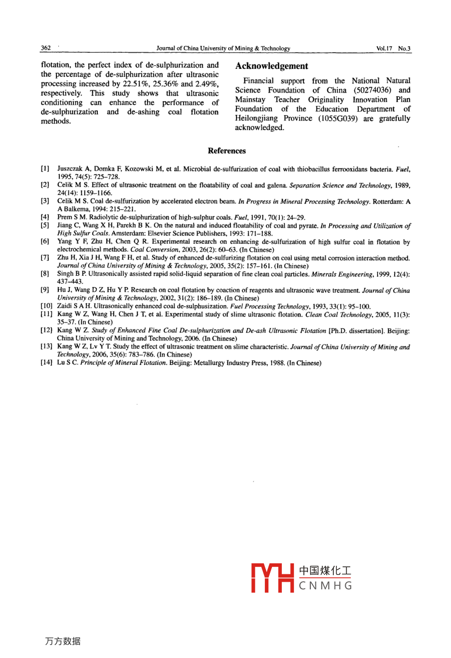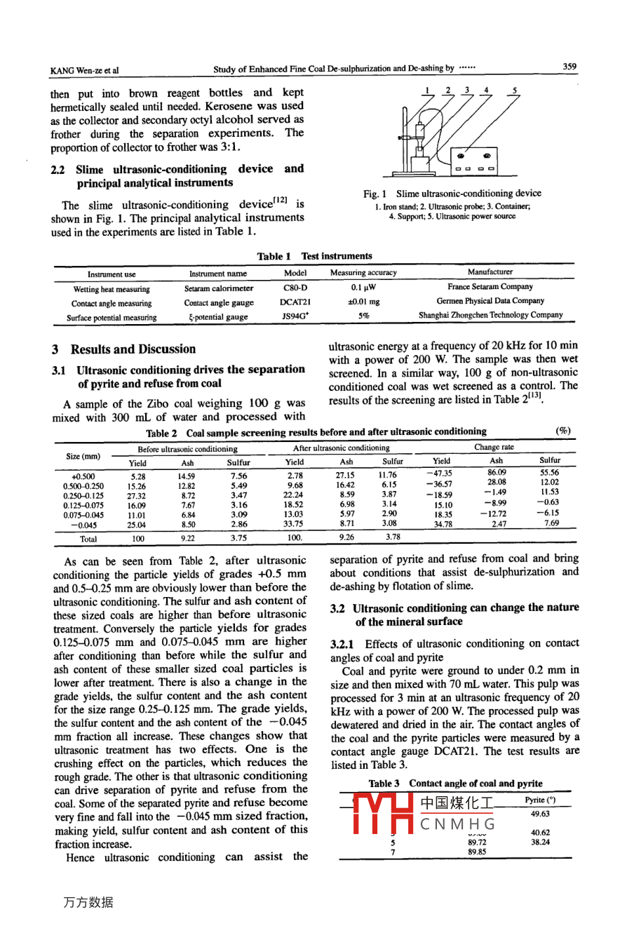 Journal of China University of Mining TechnologyVol 17 No. 3Availableonlineatwww.sciencedirect.comSCIENCEDIRECT.J China Univ mining& Technol 2007, 17(3): 0358-0362Study of Enhanced Fine CoalDe-sulphurization and De-ashing byUltrasonic flotationKANG Wen-ze. XUN Hai-xin, Chen Jun-taoSchool of Resource and Environment, Heilongjiang Institute of Science and Technology, Harbin, Heilongjiang 150027, ChinaAbstract: The feasibility of using ultrasound to enhance the performance of de-sulphurization and de-ashing duringslime flotation was investigated. The Setaram C80 calorimeter, the contact angle gauge DCAT2I and an electrophoresisapparatus were used to study the surface nature of coal, pyrite and refuse before and after ultrasonic conditioning. Theield, ash and sulfur contents of equally sized coal slimes were also measured before and after ultrasonic conditioningThe results show that ultrasonic conditioning can drive the separation of pyrite and refuse from coal. After ultrasonicconditioning the hydrophobicity of coal and hydrophilicity of pyrite and refuse increase. The perfect index of flotationthe perfect index of de-sulphurization and the percentage of de-sulphurization increase by 22.51%, 25.36% and 2.49%respectively. This study shows that ultrasonic conditioning can enhance the performance of de-sulphurization andde-ashing of coal flotation methodsey words: ultrasonic; separating; hydrophobicity; de-sulphurization; de-ashingCLC number: TD 9239: TB 5591 Introductiontill unclear so it investigation is of great significandIn thisCoal is the major source of energy in China and the minerals by means of ultrasonic excitation of pulprational processing of it is the basis for its safe and may be one possible route to improve flotationefficient utilization. But the high percentage of sulfur selectivity and efticiencyand dust in coal hinders its utilization, in particularsulfur severely pollutes the environment.2 Experimentalstudies focusing on de-sulphurization and de-ashing 2.1 Mineral sample and agentare being carried out in many countries. Normalgravity separation can effectively de-sulphurize coalThe coal was a sample of No 10 layer lump coalhaving larger pyrite particles (>0.5 mm). But for fine from the Xiazhuang Coal Mine, Shandong Zibohigh-sulfur coal particles (<0.5 mm)ideal de- Bureau of Mines. The coal sample is a high-sulfursulphurization can not be achieved using ordinary lean coal. The experimental sample was obtainedflotation. Hence methods to enhance de-sulphuriza- after the lump coal had been crushed. The sampletion and de-ashing through slime flotation are a majorlysis was Aad=9. 36%(ash content), S,d =3.82%aspect of research carried out in various countries-71.(total sulfur content), Sp=2.38%(pyrite sulfur),Among numerous methods for enhancing de- So=0.90%(organic sulfur content)and Ss=0.54%sulphurization and de-ashing, ultrasonic technology is (sulfate sulfur content). A pure sample of pyrite wasideal because it is a clean and mild method that can hand selected from the sample. The pyrite isbe applied at normal atmospheric temperatures and paragenetic with the coal and has a size range frompressures. Many scholars have studied this 30 tonethod-l. The mechanism by which ultrasonicTo中國(guó)煤化工 were crushed andflotation enhances de-sulphurization and de-ashing is grourCNMHGesize. They wereReceived 05 February 2007; accepted 15 May 2007Projects 50274036 supported by the National Natural Science Foundation of China and 1055G039 by the Mainstay Teacher Originality Innovation PlanCorrespondingauthorTel+86-451-88036448:E-mailaddresskwz010@163.comKANG Wen-ze et alStudy of Enhanced Fine Coal De-sulphurization and De-ashing bythen put into brown reagent bottles and kepthermetically sealed until needed. Kerosene was used3as the collector and secondary octyl alcohol served asfrother during the separation experiments. Theproportion of collector to frother was 3: 12.2 Slime ultrasonic-conditioning device andprincipal analytical instrumentsFig. 1hown in Fig. 1. The principal analytical instruments4. Support; 5. Ultrasonic power sourceused in the experiments are listed in Table 1Table 1 Test instrumentsModelMeasuring accuracyFrance Setaram CompanyContact angleDCAT21±0.0lmgGermen Physical Data CompanySurface potential measuringJS94GShanghai Zhongchen Technology Company3 Results and Discussionultrasonic energy at a frequency of 20 kHz for 10 minwith a power of 200 w. The sample was then wet3.1 Ultrasonic conditioning drives the separation screened. In a similar way, 100 g of noof pyrite and refuse from coalconditioned coal was wet screened as aA sample of the Zibo coal weighing 100 g was results of the screening are listed in Tablemixed with 300 mL of water and processed withTable 2 Coal sample screening results before and after ultrasonic conditioningBefore ultrasonic conditioningAfter ultrasonic conditioningSulfur0.5000.2500.1250018.525.108990.63007500451272-6.15Total100.As can be seen from Table 2, after ultrasonic separation of pyrite and refuse from coal andconditioning the particle yields of grades +0.5 mm about conditions that assist de-sulphurizationand 0.5-0.25 mm are obviously lower than before the de-ashing by flotation of slimeultrasonic conditioning. The sulfur and ash content ofthese sized coals are higher than before ultrasonic3.2 Ultrasonic conditioning can change the naturetreatment. Conversely the particle yields for gradesof the mineral surface0.125-0.075 mm and 0.075-0.045 mm are higher 3.2.1 Effects of ultrasonic conditioning on contactafter conditioning than before while the sulfur andangles of coal and pyash content of these smaller sized coal particles isCoal and pyrite were ground to under 0. 2 mm inlower after treatment. There is also a change in the size and then mixed with 70 mL water. This pulp wasgrade yields, the sulfur content and the ash contentprocessed for 3 min at an ultrasonic frequency of 20for the size range 0. 25-0. 125 mm. The grade yields,kHz