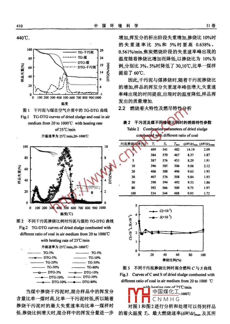 中國環(huán)境科學(xué)2011,31(3):408-411China Environmental Science釆用熱重分析法研究煤摻燒干污泥燃燒特性李洋洋,金宜英,李歡2(清華大學(xué)環(huán)境科學(xué)與工程系北京10084:2清華大學(xué)深圳研究生院廣東深圳518055)摘要:利用熱重分析法對干污泥和煤及二者混合樣的燃燒特性進(jìn)行了研究結(jié)果表明在空氣介質(zhì)、升溫速率25℃/min、溫度范圍20-1000℃的情況下,干污泥分別在280℃、480℃出現(xiàn)2個失重峰煤在500℃時出現(xiàn)1個失重峰隨著千污泥摻燒比增加混合樣失重速率峰值及最大燃燒速率值增大岀現(xiàn)溫度提前.ˉ定比例范囤的干污泥擲燒可以改善煤的著火性能,冇利于煤的穩(wěn)定燃燒燃料的叮燃燒性指數(shù)增加,使燃燒特性改善該指數(shù)介于干污泥和煤單-成分燃燒特性指數(shù)之間關(guān)鍵詞:熱重分析:污泥;煤;摻燒比;燃燒特性中圖分類號:X70文獻(xiàn)標(biāo)識碼:A文章編號:1000-6923(20103040804Thermo-gravimetric analysis and co-combustion characteristics of dried sludge and coal. LI Yang-yang, JINYi-ying, LI Huan(1. Department of Environmental Science and Engineering, Tsinghua University, Beijing 100084China; 2. Graduate School at Shenzhen, Tsinghua University, Shenzhen 518055, China). China Environmental Science,2011,31(3):408411Abstract: The combustion behaviors of dried sludge, coal and their mixtures were investigated by a thermo-gravimetricanalysis(TGA)in the temperature range from 20 to 1000C with the heating rate of 25C/min. The coal sample had oneweight loss peak at the temperature of 500C while dried sludge had two at the temperature of 280 and 480C. When the ratioof dried sludge in the blend was appropriate, the values of both weight loss rate peak and maximum combustion rateincreased while the appearance temperature decreased. At the same time, the ignition performance of coal could be improvedby co-combustion with dried sludge, which also was conductive to the stability of coal combustion. Combustioncharacteristics of the blends were improved and the flammability index was between the two values of coal and dried sludgeKey words: thermal gravimetric analysis; sludge: coal; mixing ratio: co-combustion characteristics城市污水處理廠每年產(chǎn)生大量的污泥,其處煤混合物的著火及燃燒特性隨著污泥的摻燒比理成本已經(jīng)成為制約該行業(yè)發(fā)展的瓶頸因素單例不同而不同 Xiao HanMin等采用熱重分析獨建設(shè)污泥處置設(shè)施不僅投資成本高,且運行費方法對燃燒空氣中不同含氧量、不同加熱速度時用昂貴利用其他工業(yè)的余熱資源,干化污泥、燃污泥與煤的混燒特性進(jìn)行了研究.國外研究燒設(shè)備焚燒污泥,可以大幅降低污泥的處理費者β1對一些化石燃料、替代燃料及幾種固體廢用叮污泥脫水后含水率一般在80%左右處理量物在不同控制條件下的升溫速率、空氣流速等混大時,般先經(jīng)熱干化干燥成干污泥,再與煤混燒.燒特性的模型進(jìn)行了相關(guān)研究雖然干污泥熱值較高但灰分含量高、碳轉(zhuǎn)化率本試驗采用熱重分析法對不同干污泥及煤低因此在污泥的熱轉(zhuǎn)化過程中控制費用耗費較摻燒比例時混合燃料的熱失重過程進(jìn)行分析,獲多凹李培生等通過差熱分析研究,得到污泥與得不同摻燒比例時干污泥與煤混合燃燒特性,從煤燃燒的反應(yīng)動力學(xué)參數(shù),二者燃燒各自保持獨而為V中國煤化工論依據(jù)立性 Liao Yan Feng等采用熱重分析法對煤與收稿日CNMHG造紙污泥熱解及焚燒過程進(jìn)行了研究結(jié)果發(fā)現(xiàn)蕃金項目;“+五"國家科技支據(jù)計劃項目(209BAC6Bo加熱速率較高時污泥揮發(fā)階段出現(xiàn)較早;污泥與·責(zé)任作者.副教授,jmy@tsinghua.edu.cn3期李洋洋:采用熱重分究煤摻燒干污泥燃燒特性1材料與方法試驗所用煤來自北京市某鍋爐房污泥樣品為北京市某污水處理廠的脫水泥餅pH669將污1.1材料泥干燥后破碎,試樣粒度過150目篩表1煤與污泥理化特性Table 1 Characteristics of the sludge and coal樣品含水率(%)揮發(fā)分(%o)灰)c%)H%)N%S(%)%高位熱值lg)二煤l3223000093201.2試驗方法要為干污泥中易揮發(fā)部分的析出及燃燒過程,占實驗采用熱重分析儀為STA409C131F型,總失重的4225%;第二階段位于450-550℃之間,技術(shù)指標(biāo)溫度范圍為室溫~1600℃樣品重量主要為干污泥中相對難揮發(fā)部分的析出及燃燒Ω20g溫升速率為0l~999℃hmin測試條件:升溫過程,占總失重的27.75%2個失重峰的峰值溫度速率25℃/mn試樣質(zhì)量為(20+0mg,含水率為分別為280,480℃,對應(yīng)的失重速率峰值為853%試驗溫度范圍20-1000℃燃燒氣氛為空5524,9.885%min;煤樣的熱重曲線(TG)只在氣介質(zhì)400~600℃區(qū)間內(nèi)出現(xiàn)了一次明顯的失重過程,13分析方法占總失重的7693%微分熱重曲線DTG)上對應(yīng)1.3.1著火溫度煤的著火溫度(T)是指煤在一個獨立的失重過程煤樣失重速率峰值出現(xiàn)在空氣或氧氣中加熱時達(dá)到連續(xù)燃燒的最低溫度,500℃,為13.92%min這與干污泥和煤樣中的揮著火溫度可以反映燃料點燃的難易程度著火溫發(fā)分含量有關(guān)系由于煤樣中的揮發(fā)分含量低揮度只能代表煤在燃燒初期的反應(yīng)能力不能概括發(fā)分析出溫度比干污泥高,因此干污泥中的揮發(fā)整個燒燃過程.分析出過程造成了樣品失重率與失重量要比煤為將各煤種以燃燒性能的優(yōu)劣排成序列采用樣顯著而煤樣中揮發(fā)分析出與焦炭燃燒階段沒可燃性指數(shù)進(jìn)行比較可
