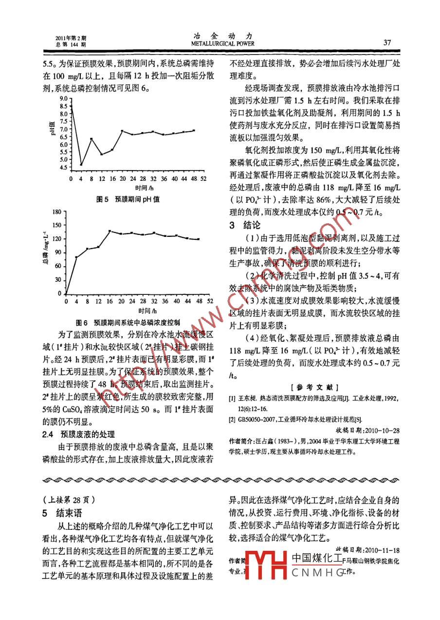 冶金動力2011年第2期總第144期METALLURGICAL POWER制氧廠間冷開式循環(huán)水系統(tǒng)熱態(tài)清洗預(yù)膜汪占鑫,李楊樹,曾佚平(上海洗霸科技有限公司,上海200437)[摘要] 制氧系統(tǒng)的熱態(tài)清洗預(yù)膜,關(guān)鍵要預(yù)防過程中產(chǎn)生大量泡沫,造成空分帶水而停產(chǎn)。由于本次清洗預(yù)膜所選用藥劑均為低泡型藥劑,加上整個過程中的有力監(jiān)管,有效地避免了此類事故的發(fā)生。本次預(yù)膜效果良好,監(jiān)測試片經(jīng)5%硫酸銅滴定變色時間達50 8o另對預(yù)膜廢液進行氧化、絮凝處理,可將總磷由118mg/L降至16 mg/Lo[關(guān)鍵詞]清洗預(yù)膜;監(jiān)測試片;泡沫;預(yù)膜廢液;總磷[中圖分類號] TQ050.9[文獻標識碼] B[文章編號] 1006 -7642011)02 -035-03Thermal State Cleaning and Pre-filming of Indirect Cooling OpenCirculating Water System of Oxygen PlantWANG Zhanxin, LI Yangshu, ZENG Yiping(Shanghai Emperor of Cleaning Tech Co, Ld, Shanghai 200437, China)[Abstract] A great quantity of foam should be prevented in thermal state cleaning andpre- filming of the oxygen making system. Otherwise, it would cause shutdown of air separationunit owing to too much water. Such kind of accident was avoided sccessfully by applicationof low foam reagents and effective management in the process. The color changing time ofmonitoring test coupon by titration of 5% CuSO, was up to 50 S,showing a nice pre-filmingresult. After oxidation and flocculation, total phosphorus in pre -ilming wastewater was reducedfrom 118 mg/L to 16 mg/L.[Key words]cleaning and pre- flming; monitoring test coupon; foam; pre -flmingwastewater; total phosphorus1系統(tǒng)概況 .次清洗預(yù)膜難于一般的清洗預(yù)膜。某鋼廠制氧系統(tǒng)包括1"、2*空分系統(tǒng),生產(chǎn)能力2清洗預(yù)膜方案的實施為16500 m'/hx2。其中1'系統(tǒng)于2008年12月投本次清洗預(yù)膜分“粘泥剝離→化學(xué)清洗 →預(yù)產(chǎn),21系統(tǒng)于2009年9月投產(chǎn)。系統(tǒng)的冷卻水為間膜”三個步驟,由于制氧系統(tǒng)的特殊性,在線清洗預(yù)冷開式循環(huán)冷卻水,循環(huán)量4300 m/h,保有水量膜的過程中,要嚴防產(chǎn)生大量泡沫而造成空分帶水,5000 m;系統(tǒng)的材質(zhì)為銅不銹鋼及碳鋼;冷卻水主進而出現(xiàn)停產(chǎn)的情況發(fā)生。因此注意藥劑的選型同要用于冷卻空氣壓縮機、空氣預(yù)冷系統(tǒng)、膨脹機、氮時,在整個清洗預(yù)膜過程中,還要定時監(jiān)測冷水池泡氣壓縮機以及氧氣壓縮機。沫產(chǎn)生情況空冷1水冷塔液位等,并準備充足的消清洗預(yù)膜是冷卻水化學(xué)處理中十分重要的環(huán)節(jié)泡劑,以備不時之需。",間冷開式循環(huán)水系統(tǒng)應(yīng)該在開工前進行清洗預(yù)膜在預(yù)膜結(jié)束后,對預(yù)膜排放液進行處理,降低排處理”。為了兼顧2*系統(tǒng),因此在2*空分系統(tǒng)建好投放液中的總磷含量,以減輕后續(xù)處理工序的污染負產(chǎn)后,于2009年12月對兩套系統(tǒng)同時進行清洗預(yù)荷。中國煤化工膜。2.1由于兩套系統(tǒng)投人使用的時間相隔較長,因此DHCNMH G中最容易產(chǎn)生大兩套系統(tǒng)內(nèi)部的腐蝕、結(jié)垢情況差別可能會較大,加量泡沫的階段,本次使用的黏泥剝離劑,既要考慮使上清洗預(yù)膜的同時,兩套系統(tǒng)在全負荷運行,使得本用效果,也要充分考慮使用的安全性,防止剝離期間冶金動力2011年第2期36METALLURGICAL POWER總第144期產(chǎn)生大量泡沫影響生產(chǎn)的安全。因此黏泥剝離是本幅度明顯增大,直到26 h后趨于穩(wěn)定,清洗期間總次清洗預(yù)膜順利與否的關(guān)鍵- -環(huán)。鐵濃度最高達26.3 mg/L。 結(jié)合圖2和圖3可知,將我公司根據(jù)以往的黏泥剝離經(jīng)驗,結(jié)合現(xiàn)場的pH值控制在3.5~ 4可達到較好的除銹效果。實際情況,提出以次氯酸鹽為主劑,復(fù)配剝離助劑的12度方案進行黏泥剝離,藥劑投加濃度800 mg/L, 黏泥83剝離的效果見圖1。器24由圖1可見,濁度變化曲線斜率在4 h后增大,長16在12 h后有所減小,隨后逐漸趨于平緩,整個過程2日中濁度最高值為20.3NTU。由于系統(tǒng)在清洗預(yù)膜前8手的日常運行過程中,進行了殺菌滅藻處理,系統(tǒng)中的微生物黏泥可能不多,使得黏泥剝離階段濁度并不62024是很高。清洗時間/h22 ]圖3化學(xué)清洗期間總鐵及濁度變化趨勢20 1330 ]8f16 1310第14212900」280827026004812.1620242832250時間/h12 16)2428圖1粘泥剝離期間濁 度變化趨勢清洗時間h2.2化學(xué)清洗圖4化學(xué)清洗期間鈣硬度變化趨勢由于清洗過程中清洗劑和管道中的碳酸鈣反應(yīng)由圖4可見,鈣硬度在清洗4 h后即由255會釋放出CO2,如果短時間內(nèi)大量的CO2通過分子mg/L升到310 m/L,且在8 h后變化趨于穩(wěn)定,清篩,會大大增加分子篩的負荷。因此清洗藥劑的投加洗過程中鈣硬度濃度最高值為320 mg/L。結(jié)合圖2采取“少量多批次”的加入方法,緩慢降低pH值,和圖 4可看出,在清洗過程中將pH值控制在5以以減緩CO2產(chǎn)生的速率,同時減少清洗期間泡沫的下時,就能很好地較快地去除系統(tǒng)中的鈣垢。產(chǎn)生量。在不影響生產(chǎn)的情況下,保證清洗效果,清為了控制系統(tǒng)的腐蝕,在投加清洗劑前需投加洗過程中系統(tǒng)pH值變化可見圖2。緩蝕劑,清洗期間系統(tǒng)的腐蝕情況可由碳鋼監(jiān)測掛片反應(yīng),結(jié)果見表1。9.0表1化學(xué)清洗時碳鋼監(jiān)測掛 片腐蝕情況8.0掛
