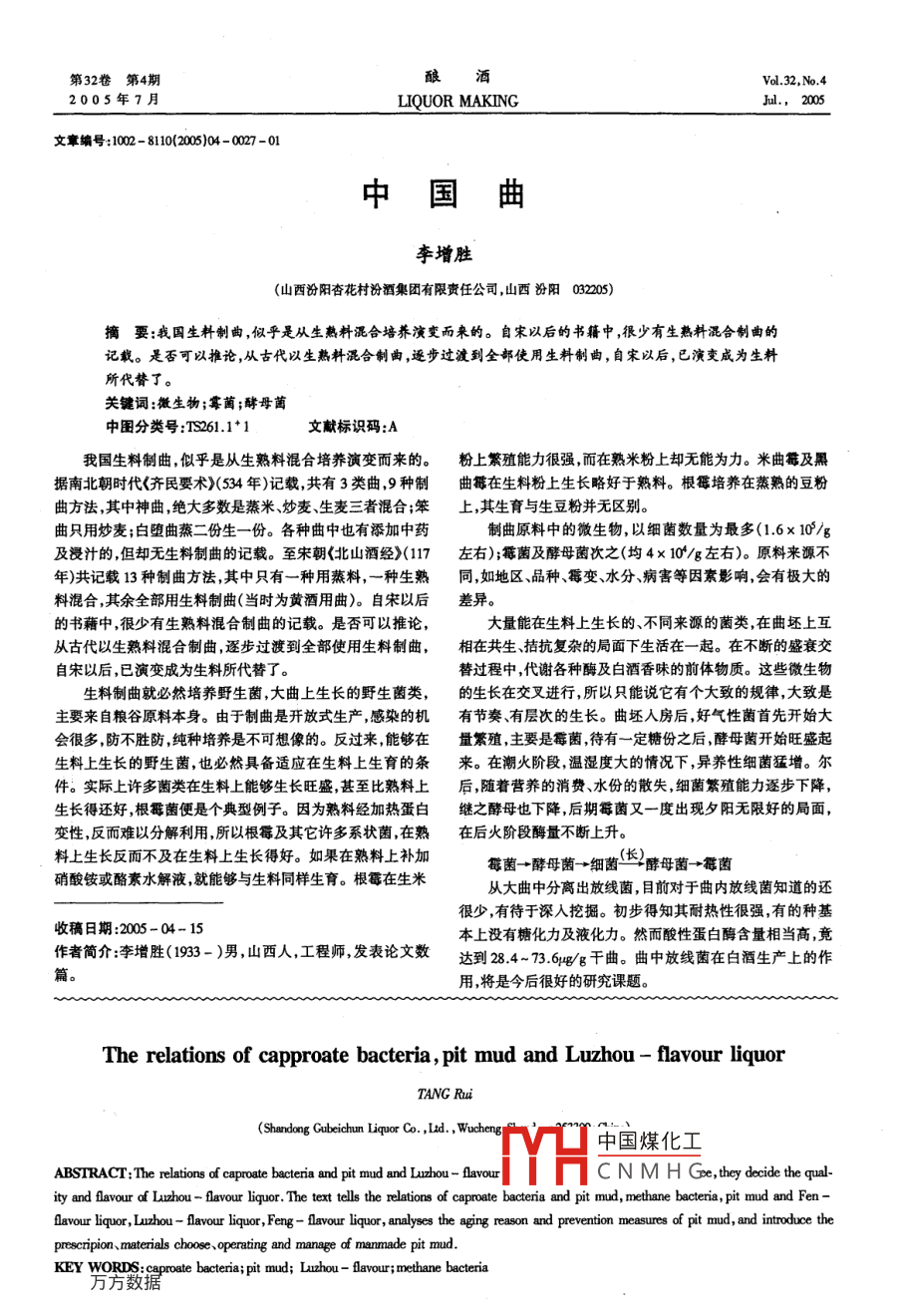 第32卷第4期Vol 32, No 42005年7月LIQUOR MAKING文拿編號:102-810(0001中國曲李增勝(山西粉陽杏花村粉酒集團有限責任公司,山西汾陽0205)摘要:我國生料制曲,似乎是從生熟料混合培養(yǎng)演變而來的。自宋以后的書籍中,很少有生熟料混合制曲的記載。是否可以推論,從古代以生熟料混合制曲,逐步過渡到全部使用生料制曲,自宋以后,已演變成為生料所代替了。關鍵詞:微生物;零菌;酵母菌中圖分類號:TS261.1+1文獻標識碼:A我國生料制曲,似乎是從生熟料混合培養(yǎng)演變而來的。粉上繁殖能力很強,而在熟米粉上卻無能為力。米曲霉及黑據(jù)南北朝時代《齊民要術》(534年)記載,共有3類曲,9種制曲霉在生料粉上生長略好于熟料。根霉培養(yǎng)在蒸熟的豆粉曲方法其中神曲,絕大多數(shù)是蒸米炒麥生麥三者混合;笨上,其生育與生豆粉并無區(qū)別曲只用炒麥;白墮曲蒸二份生一份。各種曲中也有添加中藥制曲原料中的微生物,以細菌數(shù)量為最多(16×105/g及浸汁的但卻無生料制曲的記載。至宋朝《北山酒經(jīng)》(17左右);霉菌及酵母菌次之(均4x10/g左右)。原料來源不年)共記載13種制曲方法,其中只有一種用蒸料,一種生熟同,如地區(qū)、品種、霉變、水分、病害等因素影響,會有極大的料混合,其余全部用生料制曲(當時為黃酒用曲)。自宋以后差異。的書藉中,很少有生熟料混合制曲的記載。是否可以推論,大量能在生料上生長的、不同來源的菌類,在曲坯上互從古代以生熟料混合制曲,逐步過渡到全部使用生料制曲,相在共生拮抗復雜的局面下生活在一起。在不斷的盛衰交自宋以后,已演變成為生料所代替了。替過程中代謝各種酶及白酒香味的前體物質。這些微生物生料制曲就必然培養(yǎng)野生菌,大曲上生長的野生菌類,的生長在交叉進行,所以只能說它有個大致的規(guī)律,大致是主要來自糧谷原料本身。由于制曲是開放式生產(chǎn)感染的機有節(jié)奏、有層次的生長。曲坯入房后,好氣性菌首先開始大會很多,防不勝防純種培養(yǎng)是不可想像的。反過來,能夠在量繁殖,主要是霉菌,待有一定糖份之后,酵母菌開始旺盛起生料上生長的野生菌,也必然具備適應在生料上生育的條來。在潮火階段,溫濕度大的情況下,異養(yǎng)性細菌猛增。爾件。實際上許多菌類在生料上能夠生長旺盛甚至比熟料上后,隨著營養(yǎng)的消費、水份的散失,細菌繁殖能力逐步下降生長得還好根霉菌便是個典型例子。因為熟料經(jīng)加熱蛋白繼之酵母也下降,后期霉菌又一度出現(xiàn)夕陽無限好的局面變性,反而難以分解利用,所以根霉及其它許多系狀菌在熟在后火階段酶量不斷上升料上生長反而不及在生料上生長得好。如果在熟料上補加莓菌→酵母菌→細菌酵母菌→霉菌硝酸銨或酪素水解液就能夠與生料同樣生育。根霉在生米從大曲中分離出放線菌,目前對于曲內(nèi)放線菌知道的還很少,有待于深入挖掘。初步得知其耐熱性很強,有的種基收稿日期:2005-04-15本上沒有糖化力及液化力。然而酸性蛋白酶含量相當高,竟作者簡介:李增勝(1933-)男山西人,工程師發(fā)表論文數(shù)達到284-73.6g干曲。曲中放線菌在白酒生產(chǎn)上的作篇用,將是今后很好的研究課題。The relations of caproate bacteria, pit mud and Luzhou-flavour liquorTANG Rui(Shandong Gubeichun Liquor Co, Ltd, Wucheng們v凵中國煤化工ABSTRACT: The relations of caproate bacteria and pit mud and Luzhou-flavourCN Ge, they decide the quality and flavour of Luzhou-flavour liquor. The text tells the relations of caproate bacteria and pit mud, methane bacteria, pit mud and Fenflavour liquor, Luzhou-flavour liquor, Feng- flavour liquor, analyses the aging reason and prevention measures of pit mud, and introduce theprescripion, materials choose, operating and manage of manmade pit mudKEY WORDbacteria; pit mud; Lazhou-flavour; methane bacteria
