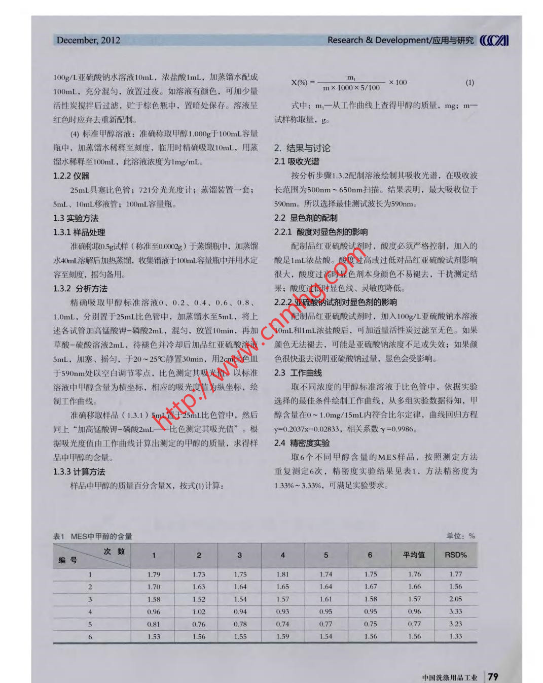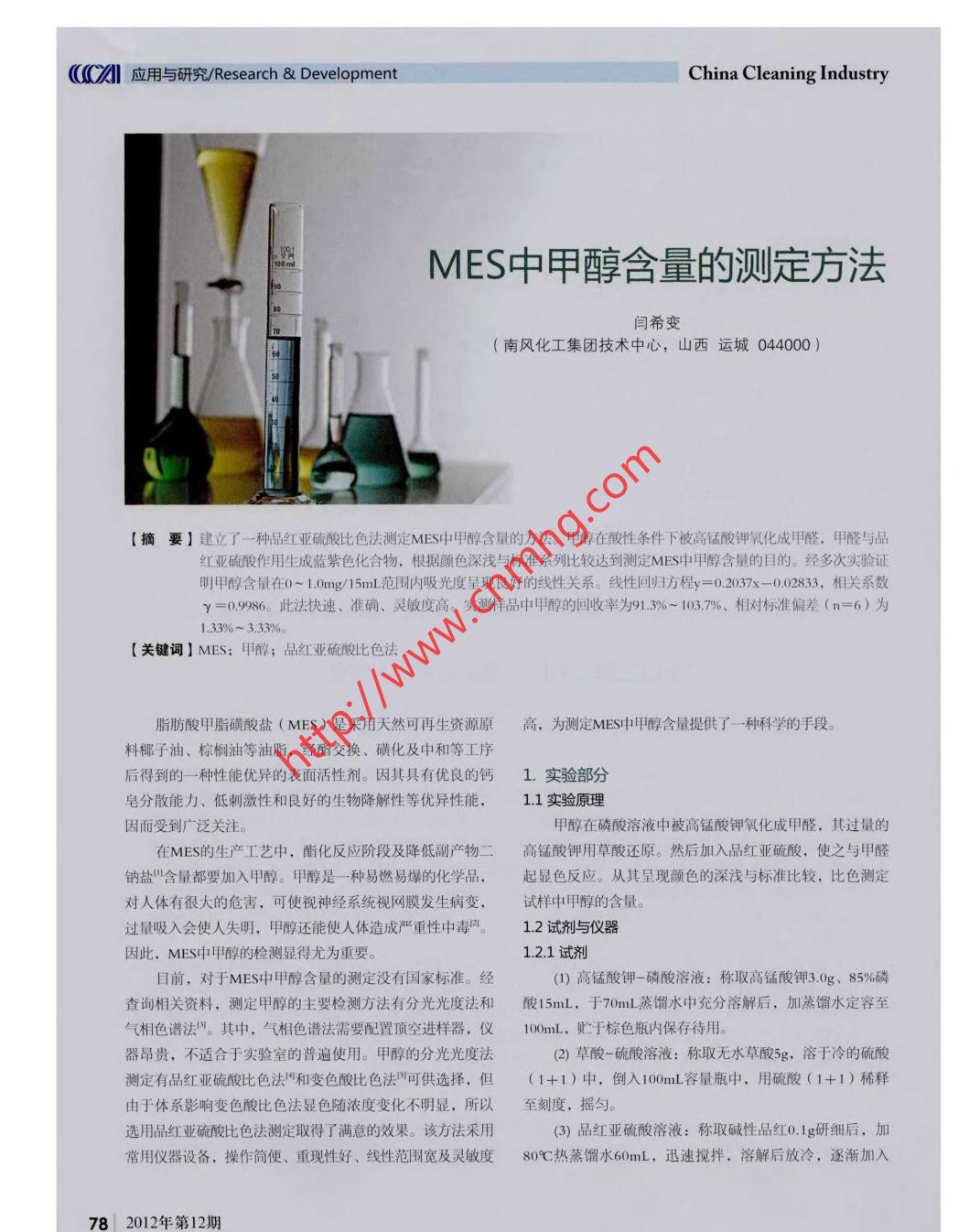 ((CA應(yīng)用與研究/Research & DevelopmentChina Cleaning IndustryMES中甲醇含量的測(cè)定方法閆希變(南風(fēng)化工集團(tuán)技術(shù)中心,山西運(yùn)城044000 )[摘要]建立了一種品紅亞硫酸比色法測(cè)定MES中甲醇含量的方法。甲醇在酸性條件下被高錳酸鉀氧化成甲醛,甲醛與品紅亞硫酸作用生成藍(lán)紫色化合物,根據(jù)顏色深淺與標(biāo)準(zhǔn)系列比較達(dá)到測(cè)定MES中甲醇含量的目的。經(jīng)多次實(shí)驗(yàn)證明甲醇含量在0~ 1.0mg/ 15mL范圍內(nèi)吸光度呈現(xiàn)良好的線性關(guān)系。線性回歸方程y=0.2037x- -0.02833,相關(guān)系數(shù)γ=0.9986此法快速、準(zhǔn)確、靈敏度高。實(shí)測(cè)樣品中甲醇的回收率為91.3%~ 103.7%、相對(duì)標(biāo)準(zhǔn)偏差(n=6)為1.33%~ 3.33%。[關(guān)鍵詞] MES;甲醇;品紅業(yè)硫酸比色法脂肪酸甲脂磺酸鹽( MES )是采用天然可再生資源原高, 為測(cè)定MES中甲醇含量提供了一一種科學(xué)的手段。料椰子油、棕櫚油等油脂,經(jīng)酯交換、磺化及中和等工序后得到的一種性能優(yōu)異的表面活性劑。因其具有優(yōu)良的鈣1. 實(shí)驗(yàn)部分皂分散能力、低刺激性和良好的生物降解性等優(yōu)異性能,1.1實(shí)驗(yàn)原理因而受到廣泛關(guān)注。甲醇在磷酸溶液中被高錳酸鉀氧化成甲醛,其過量的在MES的生產(chǎn)工藝中,酯化反應(yīng)階段及降低副產(chǎn)物二高錳酸鉀用草酸還原。然后加入品紅亞硫酸,使之與甲醛鈉鹽"含量都要加入甲醇。甲醇是一種 易燃易爆的化學(xué)品,起顯色反應(yīng)。從其呈現(xiàn)顏色的深淺與標(biāo)準(zhǔn)比較,比色測(cè)定對(duì)人體有很大的危害,可使視神經(jīng)系統(tǒng)視網(wǎng)膜發(fā)生病變,試樣中甲醇的含量。過量吸入會(huì)使人失明,甲醇還能使人體造成嚴(yán)重性中毒四。1.2試劑與儀器因此,MES中甲醇的檢測(cè)顯得尤為重要。1.2.1 試劑目前,對(duì)于MES中甲醇含量的測(cè)定沒有國(guó)家標(biāo)準(zhǔn)。經(jīng)(1)高錳酸鉀一磷酸溶液:稱取高錳酸鉀3.0g、85%磷查詢相關(guān)資料,測(cè)定甲醇的主要檢測(cè)方法有分光光度法和酸15mL, 于70mL蒸餾水中充分溶解后,加蒸餾水定容至氣相色譜法"。其中,氣相色譜法需要配置頂空進(jìn)樣器,儀100mL,貯于棕色瓶?jī)?nèi)保存待用。器昂貴,不適合于實(shí)驗(yàn)室的普遍使用。甲醇的分光光度法(2) 草酸-硫酸溶液:稱取無水草酸5g,溶于冷的硫酸測(cè)定有品紅亞硫酸比色法"和變色酸比色法可供選擇,但(1+1)中,倒入100mL容量瓶中,用硫酸(1+1)稀釋由于體系影響變色酸比色法顯色隨濃度變化不明顯,所以至刻度,搖勻。選用品紅亞硫酸比色法測(cè)定取得了滿意的效果。該方法采用(3)品紅業(yè)硫酸溶液:稱取堿性品紅0.1g研細(xì)后,加常用儀器設(shè)備,操作簡(jiǎn)便、重現(xiàn)性好、線性范圍寬及靈敏度80C熱蒸 餾水60mL,迅速攪拌,溶解后放冷,逐漸加入78 | 2012年 第12期December, 2012Research & Development/應(yīng)用與研究(CA100g/L亞硫酸鈉水溶液10mL,濃鹽酸1mL,加蒸餾水配成m,X(%) = mx 100 5/100x 1001)100mL,充分混勻,放置過夜。如溶液有顏色,可加少量活性炭攪拌后過濾,貯于棕色瓶中,置暗處保存。溶液呈式中: m,一從工作曲線上查得甲醇的質(zhì)量,mg; m-紅色時(shí)應(yīng)棄去重新配制。試樣稱取量,go(4)標(biāo)準(zhǔn)甲醇溶液:準(zhǔn)確稱取甲醇.000g于100mnL容量瓶中,加蒸餾水稀釋至刻度,臨用時(shí)精確吸取10mL,用蒸2. 結(jié)果與討論餾水稀釋至100mL,此溶液濃度為1mg/mLo2.1吸收光譜1.2.2儀器按分析步驟1.3.2配制溶液繪制其吸收光譜,在吸收波25mL具塞比色管; 721分光光度計(jì);蒸餾裝置一-套;長(zhǎng)范圍為500nm ~ 650nm掃描。結(jié)果表明,最大吸收位于ml、10mL移液管; 100mL容量瓶。590nm所以選擇最佳測(cè)試波長(zhǎng)為590nm。1.3實(shí)驗(yàn)方法2.2顯色劑的配制1.3.1 樣品處理2.2.1酸度對(duì)顯色劑的影響準(zhǔn)確稱取0.5g試樣(稱準(zhǔn)至0002)于蒸餾瓶中,加蒸餾配制品紅業(yè)硫酸試劑時(shí),酸度必須嚴(yán)格控制,加入的水40mL溶解后加熱蒸餾,收集鎦液于100mL容量瓶中并用水定酸是ImL濃鹽酸。酸度過高或過低對(duì)品紅亞硫酸試劑影響容至刻度,搖勻備用。很大,酸度過高時(shí)顯色劑本身顏色不易褪去,干擾測(cè)定結(jié)1.3.2分析方法果;酸度過低時(shí)顯色淺、靈敏度降低。精確吸取甲醇標(biāo)準(zhǔn)溶液0、0.2、0.4、0.6、0.8、2.2.2亞硫酸鈉試劑對(duì)顯色劑的影響1.0mL,分別置于25mL比色管中,加蒸餾水至5mL,將上配制品紅亞硫酸試劑時(shí),加入100g/L亞硫酸鈉水溶液述各試管加高錳酸鉀-磷酸2mL,混勻,放置10min,再加10mL和1mL濃鹽酸后,可加適量活性炭過濾至無色。如果草酸-硫酸溶液2mL,待褪色并冷卻后加品紅業(yè)硫酸溶液顏色無法褪去,可能是亞硫酸鈉濃度不足或失效;如果顏5mL,加塞、搖勻,于20~ 25%C靜置30min,用2cm比色皿色很快退去說明亞硫酸鈉過量,顯色會(huì)受影響。于590nm處以空白調(diào)節(jié)零點(diǎn),比色測(cè)定其吸光值。以標(biāo)準(zhǔn)2.3工作曲線溶液中甲醇含量為橫坐標(biāo),相應(yīng)的吸光度值為縱坐標(biāo),繪取不同濃度的甲醇標(biāo)準(zhǔn)溶液于比色管中,依據(jù)實(shí)驗(yàn)制工作曲線。選擇的最佳條件繪制工作曲線,從多組實(shí)驗(yàn)數(shù)據(jù)得知,甲準(zhǔn)確移取樣品( 1.3.1 ) 5mL置于25mL比色管中,然