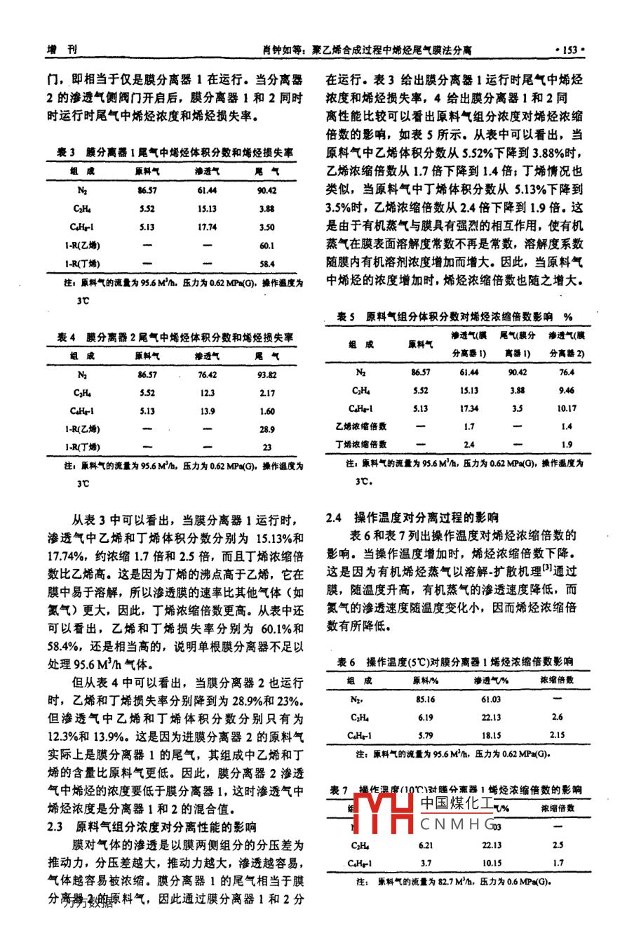 化工進展2003年第22卷增刊CHEMICAL INDUSTRY AND ENGINEERING PROGRESS吲51聚乙烯合成過程中烯烴尾氣膜法分離肖鐘如!劉宏吉2介興明王秀芬2寧東2曹義鳴(1天邦胰技術國家工程研究中心有限貴任公司,大連116023:2中國石油化工股份公司吉林分公司,吉林132022;3中國科學院大連化學物理研究所,大連116023)摘要乘用卷或膜分高器對聚乙烯生產(chǎn)過程的排放氣中烯烴進行分離與浪縮,考察膜分離器數(shù)目、原料氣組咸和操作溫度等對分離過程的影響,站果表明:使用兩級膜分高器串聯(lián),乙烯濃縮約2倍,丁烯浪縮約關鍵詞膜分離,婚烴氣體,應用研究在石化行業(yè)生產(chǎn)過程中,每天都釋放出大量的化床。剩余氣體部分仍含乙烯、丁烯和少量氫氣有機蒸氣。有些有機化合物如氯乙烯、苯和多環(huán)芳等送火炬燒掉,而這部分氣體還可以利用膜技術烴等因為毒性大,已被列入致癌物;而有些有機蒸分離濃縮再利用。本論文將報道利用大連化學物氣雖無毒但含有具有相當回收價值的烯烴類氣體。理研究所的有機蒸氣分離膜對聚乙烯放空氣中的這些有機蒸氣直接排放不僅嚴重污染環(huán)境更重要乙烯、丁烯和氮氣進行分離回收的實驗結果。的是造成資源浪費因此隨著全球環(huán)境保護問題的日趨突出以及循環(huán)經(jīng)濟的要求工業(yè)氣體排放中有1實驗部分機蒸氣回收正日益受到人們重視傳統(tǒng)的有機蒸氣處理方法分為破壞法和非破壞1.1原料氣法。燃燒法屬于破壞法,有機蒸氣直接經(jīng)過燃燒轉原料氣來自壓縮冷凝后的含烯烴氮氣。除氮化成CO2和水,盡管可以在一定程度上去除毒性較氣外,還含氫氣、乙烯、丁烯、乙烷和丁烷等。大的組分,但是同時也造成了資源極大浪費。非破各組分的濃度隨聚合裝置及冷凝系統(tǒng)運行狀況不壞法有吸附法、冷凝法和膜分離種。前兩種同有所不同,其典型的組成體積分數(shù))如表1所方法存在廢吸附劑和冷凝液造成的二次污染問題,示。原料氣壓力為05~10MPa(G),溫度大約膜分離法是一種新的高效分離技術與傳統(tǒng)的吸附為-20℃法和冷凝法相比具有高效、節(jié)能、操作簡單和不產(chǎn)褒1聚乙烯合成中排放氣的主要組成(%)生二次污染并能回收有機溶劑等優(yōu)點。利用聚合物CH C2H CHrl膜分離有機蒸氣首先由美國公司(MTR)提出,在1995年紐約化學工藝工業(yè)博覽會期間倍受關14185.160925.79051注。該工藝果用冷凝法和膜分離相結合,從聚烯烴裝置放空氮氣物流中回收乙烯和丙烯。中國科學院大連化學物理研究所在膜法提氫和膜法空氣富12分離系統(tǒng)構成氧等基礎上,又成功地研制出有機蒸氣分離膜及圖1是膜分離系統(tǒng)簡圖,該系統(tǒng)包括換熱器分離裝置,并在中國石油化工股份公司吉林分公過濾網(wǎng)、膜分離器組和轉子流量計等。其中膜分離司的聚乙烯裝置上進行現(xiàn)場工業(yè)實驗。器組采用2根中100mmx1000m卷式膜分離器組吉林分公司聚乙烯廠年產(chǎn)100kt線性聚乙烯成,采用串聯(lián)形式連接,每根分離器均可用閥門切裝置是采用美國UC氣相流化床技術,通過固定斷或連通,根據(jù)不同的處理量和操作壓力,可以改催化劑床使各種原料得到凈化并在流化床中聚變回收的烯烴濃度和回收率。預熱器為管式蒸汽換合使乙烯和丁烯共聚生產(chǎn)聚乙烯,在生產(chǎn)過程中,熱器,加熱介質為低壓蒸汽,原料氣走管程,蒸汽由烯烴經(jīng)聚合反應得到的樹脂(聚合物)粉末上走殼中國煤化工仍吸附大量烯烴,將此放空氣送到回收系統(tǒng),通CNMHG過壓縮機提壓和冰機制冷降溫,使其中大部分了第一作者簡介肖鐘如(190)-),男,工程師,研究方向為贏分高技烯以液體形式分離出來,通過隔膜泵送回反應流術,電話。14379053152·化工”進展200年第2原料氣過濾器滲透氣膜分高器圖1烯烴膜法回收試驗流程簡圖預熱的目的是防止原料氣烴類組分在膜分離器R產(chǎn)xYL/(U0×X)中冷凝析出液滴,預熱溫度高于原料氣烴類露點烯烴損失率用1-R定義,即5~10℃。采用圓柱形不銹鋼絲網(wǎng)過濾器,絲網(wǎng)目R=1-xY(U0×x)=LxX/(U0×X0)數(shù)為120目。不銹鋼絲網(wǎng)過濾的目的是防止原料氣2.1膜分離器對乙烯和丁烯濃縮性能中夾帶固體顆粒進入膜分離器,損壞膜活性分離層表2列出膜分離裝置的分離濃縮烯烴的性13分離過程及操作條件能。從表中可以看出,使用兩級膜分離器串聯(lián),原料氣首先進入換熱器預熱,再經(jīng)過不銹鋼乙烯濃縮約2倍,丁烯濃縮約1.6倍。除氮氣外,網(wǎng)過濾后,進入膜分離器分離,產(chǎn)生兩股氣流。其他氣體均有不同程度的被濃縮,其中氫氣濃縮透過分離膜的烯烴富集流股稱為滲透氣,未透過分的倍數(shù)最小,只有05倍這是因為對于烯烴的分離膜烯烴貧化的流股稱為尾氣。本實驗目的是考察離和回收過程來說,膜分離的選擇性為滲透組分的膜分離的性能,分離后氣體暫不回收,因此實驗中滲透率差。對玻璃態(tài)聚合物和橡膠態(tài)聚合物來說,滲透氣和尾氣經(jīng)減壓并通過轉子流量計后,均送溶解選擇性和擴散選擇性對膜的分離性能具有不同入火炬管網(wǎng)燒掉的影響。對于玻璃態(tài)聚合物來說,擴散相總是起支操作壓力為0.6~0.8MPa(G),最高操作壓配作用,滲透率總是隨著分子直徑的增大而減小力1.0MPa(G),滲透氣壓力為002MPa(G),小分子組分被優(yōu)先滲透;對橡膠態(tài)聚合物來說,溶操作溫度為-3~10℃