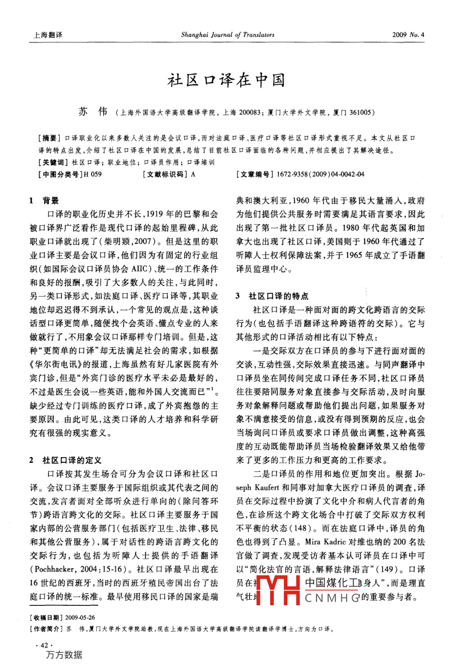 上海翻譯Shanghai Journal of Translators2009No.4社區(qū)口譯在中國蘇偉(上海外國語大學(xué)高級翻譯學(xué)院,上海20083;3廈門大學(xué)外文學(xué)院,廈門361005[摘要]口譯職業(yè)化以來多數(shù)人關(guān)注的是會議口譯,而對法庭口譯、醫(yī)療口譯等社區(qū)口譯形式重視不足。本文從社區(qū)口譯的特點出發(fā),介紹了社區(qū)口譯在中國的發(fā)展,總結(jié)了目前社區(qū)口譯面臨的各種問題,并相應(yīng)提出了其解決途徑關(guān)鍵詞]社區(qū)口譯;職業(yè)地位;口譯員作用;口譯培訓(xùn)[中圖分類號]H059[文獻標識碼]A[文章編號]16729358(2009)040042041背景典和澳大利亞,1960年代由于移民大量涌入,政府口譯的職業(yè)化歷史并不長,1919年的巴黎和會為他們提供公共服務(wù)時需要滿足其語言要求,因此被口譯界廣泛看作是現(xiàn)代口譯的起始里程碑,從此出現(xiàn)了第一批社區(qū)口譯員。1980年代起英國和加職業(yè)口譯就出現(xiàn)了(柴明穎,2007)。但是這里的職拿大也出現(xiàn)了社區(qū)口譯,美國則于1960年代通過了業(yè)口譯主要是會議口譯,他們因為有固定的行業(yè)組聽障人士權(quán)利保障法案,并于1965年成立了手語翻織(如國際會議口譯員協(xié)會AIC)、統(tǒng)一的工作條件譯員監(jiān)理中心。和良好的報酬,吸引了大多數(shù)人的關(guān)注,與此同時,另一類口譯形式,如法庭口譯、醫(yī)療口譯等,其職業(yè)3社區(qū)口譯的特點地位卻遲遲得不到承認,一個常見的觀點是,這種談社區(qū)口譯是一種面對面的跨文化跨語言的交際話型口譯更簡單,隨便找個會英語懂點專業(yè)的人來行為(也包括手語翻譯這種跨語符的交際)。它與做就行了,不用象會議口譯那樣專門培訓(xùn)。但是,這其他形式的口譯活動相比有以下特點種“更簡單的口譯”卻無法滿足社會的需求,如根據(jù)是交際雙方在口譯員的參與下進行面對面的《華爾街電訊》的報道,上海雖然有好幾家醫(yī)院有外交談,互動性強,交際效果直接迅速。與同聲翻譯中賓門診,但是“外賓門診的醫(yī)療水平未必是最好的,口譯員坐在同傳間完成口譯任務(wù)不同,社區(qū)口譯員不過是醫(yī)生會說一些英語能和外國人交流而已”。往往要陪同服務(wù)對象直接參與交際活動,及時向服缺少經(jīng)過專門訓(xùn)練的醫(yī)療口譯,成了外賓抱怨的主務(wù)對象解釋問題或幫助他們提出問題,如果服務(wù)對要原因。由此可見,這類口譯的人才培養(yǎng)和科學(xué)研象不滿意接受的信息,或沒有得到預(yù)期的反應(yīng),也會究有很強的現(xiàn)實意義當場詢問口譯員或要求口譯員做出調(diào)整,這種高強度的互動既能幫助譯員當場檢驗翻譯效果又給他帶2社區(qū)口譯的定義來了更多的工作壓力和更高的工作要求??谧g按其發(fā)生場合可分為會議口譯和社區(qū)口二是口譯員的作用和地位更加突出。根據(jù)Jo譯。會議口譯主要服務(wù)于國際組織或其代表之間的 seph Kaufert和同事對加拿大醫(yī)療口譯員的調(diào)查,譯交流,發(fā)言者面對全部聽眾進行單向的(除問答環(huán)員在交際過程中扮演了文化中介和病人代言者的角節(jié))跨語言跨文化的交際。社區(qū)口譯主要服務(wù)于國色,在診所這個跨文化場合中打破了交際雙方權(quán)利家內(nèi)部的公營服務(wù)部門(包括醫(yī)療衛(wèi)生、法律、移民不平衡的狀態(tài)(148)。而在法庭口譯中,譯員的角和其他公營服務(wù)),屬于對話性的跨語言跨文化的色也得到了凸顯。 Mira Kadric對維也納的200名法交際行為,也包括為聽障人士提供的手語翻譯官做了調(diào)查,發(fā)現(xiàn)受訪者基本認可譯員在口譯中可( Pochhacker,2004:15-16)。社區(qū)口譯最早出現(xiàn)在以“簡化法官的言語,解釋法律語言”(149)??谧g16世紀的西班牙,當時的西班牙殖民帝國出臺了法員在中國煤化工急身人”,而是理直庭口譯的統(tǒng)一標準。最早使用移民口譯的國家是瑞氣壯CNMHG的重要參與者。[收稿日期]200905-26[作者簡介]蘇偉,廈門大學(xué)外文學(xué)院助教,現(xiàn)在上海外國語大學(xué)高級翻譯學(xué)院讀翻譯學(xué)博士,方向為口譯口譯員的這種地位最明顯的例證就是在交際中口譯標準以及其職業(yè)道德準則缺乏規(guī)定,法庭在聘的話輪控制。譯員可以啟動話輪,即雙方出現(xiàn)冷場請譯員時無法可依,往往從高校和翻譯公司臨時聘時譯員主動引出話題來推動交際;譯員也可以承接請翻譯(王建、楊炳鉤:117)。話輪,如講者一段話過長時譯員可以示意其暫停以便他能及時翻譯;譯員還能夠平衡話輪,如雙方出現(xiàn)4中國社區(qū)口譯的發(fā)展搶話和爭吵時譯員可以勸說一方暫停發(fā)言來實現(xiàn)交早期中國的口譯活動大致可以分為三類:一是際和翻譯的順暢。關(guān)于譯員的話輪控制在Roy的手外交外貿(mào)類,早在周朝就有了外交口譯活動。二是語翻譯實證研究中就有具體的說明( Interpreting軍事類,軍事口譯的使用最早可追溯到隋唐的軍事1996:3967)。戰(zhàn)爭。三是文學(xué)類,這既包括科技文獻等非文學(xué)作三是口譯員在譯前獲得的對話材料相對較少,品的口頭翻譯,也包括佛經(jīng)等宗教作品的口譯活動,限制了他們的譯前準備工作。對于大多數(shù)會議口譯這類口譯活動早在漢代就開始了(黎難秋,2002)。而言,會議主辦方的相關(guān)信息、會議主題、