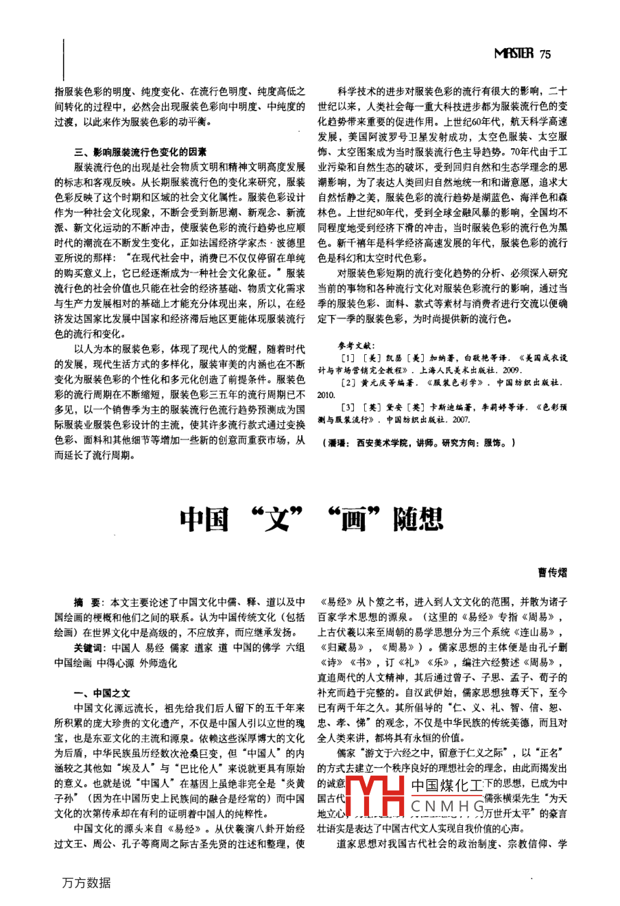MiSIER 75指服裝色彩的明度、純度變化、在流行色明度、純度高低之科學(xué)技術(shù)的進(jìn)步對(duì)服裝色彩的流行有很大的影響,二十間轉(zhuǎn)化的過程中,必然會(huì)出現(xiàn)服裝色彩向中明度、中純度的世紀(jì)以來,人類社會(huì)每一重大科技進(jìn)步都為服裝流行色的變過渡,以此來作為服裝色彩的動(dòng)平衡?;厔?shì)帶來重要的促進(jìn)作用。上世紀(jì)60年代,航天科學(xué)高速發(fā)展,美國(guó)阿波羅號(hào)衛(wèi)星發(fā)射成功,太空色服裝、太空服三、影響服裝流行色變化的因素飾、太空?qǐng)D案成為當(dāng)時(shí)服裝流行色主導(dǎo)趨勢(shì)。70年代由于工服裝流行色的出現(xiàn)是社會(huì)物質(zhì)文明和精神文明高度發(fā)展業(yè)污染和自然生態(tài)的破壞,受到回歸自然和生態(tài)學(xué)理念的思的標(biāo)志和客觀反映。從長(zhǎng)期服裝流行色的變化來研究,服裝潮影響,為了表達(dá)人類回歸自然地統(tǒng)一和和諧意愿,追求大色彩反映了這個(gè)時(shí)期和區(qū)域的社會(huì)文化屬性。服裝色彩設(shè)計(jì)自然恬靜之美,服裝色彩的流行趨勢(shì)是湖藍(lán)色、海洋色和森作為一種社會(huì)文化現(xiàn)象,不斷會(huì)受到新思潮、新觀念、新流林色。上世紀(jì)80年代,受到全球金融風(fēng)暴的影響,全國(guó)均不派、新文化運(yùn)動(dòng)的不斷沖擊,使服裝色彩的流行趨勢(shì)也應(yīng)順同程度地受到經(jīng)濟(jì)下滑的沖擊,當(dāng)時(shí)服裝色彩的流行色為黑時(shí)代的潮流在不斷發(fā)生變化,正如法國(guó)經(jīng)濟(jì)學(xué)家杰·波德里色。新千禧年是科學(xué)經(jīng)濟(jì)高速發(fā)展的年代,服裝色彩的流行亞所說的那樣:“在現(xiàn)代社會(huì)中,消費(fèi)已不僅僅停留在單純色是科幻和太空時(shí)代色彩。的購(gòu)買意義上,它已經(jīng)逐漸成為一種社會(huì)文化象征?!狈b對(duì)服裝色彩短期的流行變化趨勢(shì)的分析、必須深入研究流行色的社會(huì)價(jià)值也只能在社會(huì)的經(jīng)濟(jì)基礎(chǔ)、物質(zhì)文化需求當(dāng)前的事物和各種流行文化對(duì)服裝色彩流行的影響,通過當(dāng)與生產(chǎn)力發(fā)展相對(duì)的基礎(chǔ)上才能充分體現(xiàn)出來,所以,在經(jīng)季的服裝色彩、面料、款式等素材與消費(fèi)者進(jìn)行交流以便確濟(jì)發(fā)達(dá)國(guó)家比發(fā)展中國(guó)家和經(jīng)濟(jì)滯后地區(qū)更能體現(xiàn)服裝流行定下一季的服裝色彩,為時(shí)尚提供新的流行色色的流行和變化。以人為本的服裝色彩,體現(xiàn)了現(xiàn)代人的覺醒,隨著時(shí)代參考文獻(xiàn)的發(fā)展,現(xiàn)代生活方式的多樣化,服裝審美的內(nèi)涵也在不斷[1][美]凱晏[美]加蚋著,白敬艷等譯,《美國(guó)成衣設(shè)計(jì)與市場(chǎng)營(yíng)銷完全教程》,上海人民美術(shù)出版社.2009變化為服裝色彩的個(gè)性化和多元化創(chuàng)造了前提條件。服裝色[2]黃元慶等編著,《服裝色彩學(xué)》,中國(guó)紡織出版社彩的流行周期在不斷縮短,服裝色彩三五年的流行周期已不2010多見,以一個(gè)銷售季為主的服裝流行色流行趨勢(shì)預(yù)測(cè)成為國(guó)[3][蕘]黛安[英]卡斯迪編著,李莉婷等譯,《色彩預(yù)服裝業(yè)服裝色彩設(shè)計(jì)的主流,使其許多流行款式通過變換測(cè)與凰菜流行》,中國(guó)織出社20色彩、面料和其他細(xì)節(jié)等增加一些新的創(chuàng)意而重獲市場(chǎng),從(潘曙:西安美術(shù)學(xué)院,講師。研究方向:服飾而延長(zhǎng)了流行周期。中國(guó)“文”“畫”隨想曹傳熠摘要:本文主要論述了中國(guó)文化中儒、釋、道以及中《易經(jīng)》從卜筮之書,進(jìn)入到人文文化的范圍,并散為諸子國(guó)繪畫的梗概和他們之間的聯(lián)系。認(rèn)為中國(guó)傳統(tǒng)文化(包括百家學(xué)術(shù)思想的源泉。(這里的《易經(jīng)》專指《周易》繪畫)在世界文化中是高級(jí)的,不應(yīng)放棄,而應(yīng)繼承發(fā)揚(yáng)。上古伏羲以來至周朝的易學(xué)思想分為三個(gè)系統(tǒng)《連山易》關(guān)鍵詞:中國(guó)人易經(jīng)儒家道家道中國(guó)的佛學(xué)六組《歸藏易》,《周易》)。儒家思想的主體便是由孔子刪中國(guó)繪畫中得心源外師造化《詩》《書》,訂《禮》《樂》,編注六經(jīng)贅述《周易》,直追周代的人文精神,其后通過曾子、子思、孟子、荀子的中國(guó)之文補(bǔ)充而趨于完整的。自漢武伊始,儒家思想獨(dú)尊天下,至今中國(guó)文化源遠(yuǎn)流長(zhǎng),祖先給我們后人留下的五千年來已有兩于年之久。其所倡導(dǎo)的“仁、義、禮、智、信、恕、所積累的龐大珍貴的文化遺產(chǎn),不僅是中國(guó)人引以立世的瑰忠、孝、悌”的觀念,不僅是中華民族的傳統(tǒng)美德,而且對(duì)寶,也是東亞文化的主流和源泉。依賴這些深厚博大的文化全人類來講,都將具有永恒的價(jià)值為后盾,中華民族雖歷經(jīng)數(shù)次滄桑巨變,但“中國(guó)人”的內(nèi)儒家“游文于六經(jīng)之中,留意于仁義之際”,以“正名涵較之其他如“埃及人”與“巴比倫人”來說就更具有原始的方式去建立一個(gè)秩序良好的理想社會(huì)的理念,由此而揭發(fā)出的意義。也就是說“中國(guó)人”在基因上雖絕非完全是“炎黃的誠(chéng)意中
