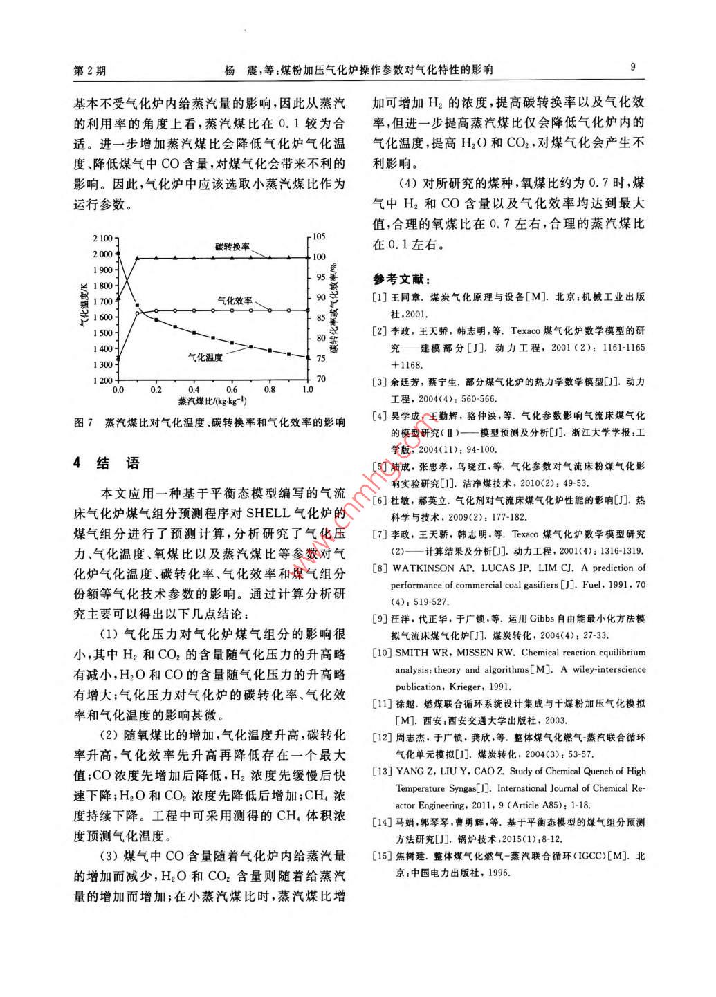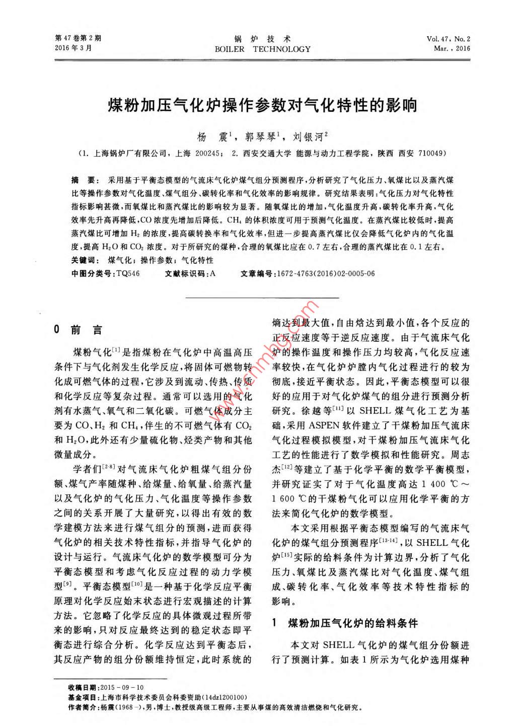 第47卷第2期鍋爐技術(shù)Vol. 47, No. 22016年3月BOILER TECHNOLOGYMar. ,2016煤粉加壓氣化爐操作參數(shù)對氣化特性的影響楊震',郭琴琴,劉銀河2(1.上海鍋爐廠有限公司,上海200245; 2.西安交通大學(xué)能源與動力工程學(xué)院,陜西西安710049)摘要:采用基于平衡態(tài)模型的氣流床氣化爐煤氣組分預(yù)測程序,分析研究了氣化壓力、氧煤比以及蒸汽煤比等操作參數(shù)對氣化溫度、煤氣組分碳轉(zhuǎn)化率和氣化效率的影響規(guī)律。研究結(jié)果表明:氣化壓力對氣化特性指標(biāo)影響甚微,而氧煤比和蒸汽煤比的影響較為顯著。隨氧煤比的增加,氣化溫度升高,碳轉(zhuǎn)化率升高,氣化效率先升高再降低,CO濃度先增加后降低。CH,的體積濃度可用于預(yù)測氣化溫度。在蒸汽煤比較低時(shí),提高蒸汽煤比可增加H2的濃度,提高碳轉(zhuǎn)換率和氣化效率,但進(jìn)- -步提高蒸汽煤比僅會降低氣化爐內(nèi)的氣化溫度,提高H2O和CO2濃度。對于所研究的煤種,合理的氧煤比應(yīng)在0.7左右,合理的蒸汽煤比在0.1左右。關(guān)鍵詞:煤氣化;操作參數(shù);氣化特性中圖分類號:TQ546文獻(xiàn)標(biāo)識碼:A文章編號:1672 -4763(2016)02-0005-06熵達(dá)到最大值,自由焓達(dá)到最小值,各個(gè)反應(yīng)的0前言正反應(yīng)速度等于逆反應(yīng)速度。由于氣流床氣化煤粉氣化田是指煤粉在氣化爐中高溫高壓爐的操作溫度和操作壓力均較高,氣化反應(yīng)速條件下與氣化劑發(fā)生化學(xué)反應(yīng),將固體可燃物轉(zhuǎn)率較快,在氣化爐爐膛內(nèi)氣化過程進(jìn)行的較為;化成可燃?xì)怏w的過程,它涉及到流動、傳熱、傳質(zhì)徹底,接近平衡狀態(tài)。因此,平衡態(tài)模型可以很和化學(xué)反應(yīng)等復(fù)雜過程。通常可以選用的氣化好的應(yīng)用于對氣化爐煤氣的組分進(jìn)行預(yù)測分析劑有水蒸氣、氧氣和二氧化碳??扇?xì)怏w成分主研究。徐越等[1]以SHELL煤氣化工藝為基要為CO、H2和CH,伴生的不可燃?xì)怏w有CO2礎(chǔ),采用ASPEN軟件建立了干煤粉加壓氣流床和H2O,此外還有少量硫化物、烴類產(chǎn)物和其他氣化過程模擬模型,對干煤粉加壓氣流床氣化微量成分。工藝的性能進(jìn)行了數(shù)學(xué)模擬和性能研究。周志學(xué)者們8]對氣流床氣化爐粗煤氣組分份杰[2等建立了基于化學(xué)平衡的數(shù)學(xué)平衡模型,額煤氣產(chǎn)率隨煤種、給煤量、給氧量、給蒸汽量并研究證實(shí)了對于氣化溫度高達(dá)1 400 C~以及氣化爐的氣化壓力、氣化溫度等操作參數(shù)1 600 C的干煤粉氣化可以應(yīng)用化學(xué)平衡的方之間的關(guān)系開展了大量研究,以得出有效的數(shù)法來簡化氣化爐的數(shù)學(xué)模型。學(xué)建模方法來進(jìn)行煤氣組分的預(yù)測,進(jìn)而獲得本文采用根據(jù)平衡態(tài)模型編寫的氣流床氣氣化爐的相關(guān)技術(shù)特性指標(biāo),并指導(dǎo)氣化爐的化爐的煤氣組分預(yù)測程字序[18141,以SHELL氣化設(shè)計(jì)與運(yùn)行。氣流床氣化爐的數(shù)學(xué)模型可分為爐[15]實(shí)際的給料條件為計(jì)算邊界,分析了氣化平衡態(tài)模型和考慮氣化反應(yīng)過程的動力學(xué)模壓力、氧煤比及蒸汽煤比對氣化溫度、煤氣組型[°]。平衡態(tài)模型[10]是-種基于化學(xué)反應(yīng)平衡成、碳轉(zhuǎn)化率、氣化效率等技術(shù)特性指標(biāo)的原理對化學(xué)反應(yīng)始末狀態(tài)進(jìn)行宏觀描述的計(jì)算影響。方法。它忽略了化學(xué)反應(yīng)的具體微觀過程所帶1煤粉加壓氣化爐 的給料條件來的影響,只對反應(yīng)最終達(dá)到的穩(wěn)定狀態(tài)即平衡態(tài)進(jìn)行綜合分析?;瘜W(xué)反應(yīng)達(dá)到平衡態(tài)后,本文對SHELL氣化爐的煤氣組分份額進(jìn)其反應(yīng)產(chǎn)物的組分份額維持恒定,此時(shí)系統(tǒng)的行了預(yù)測計(jì)算。如表1所示為氣化爐選用煤種收稿日期:2015-09-10基金項(xiàng)目:上海市科學(xué)技術(shù)委員會科委資助(14dz1200100)作者簡介:楊震(1968一,男,博上,教授級高級工程師,主要從事煤的高效清潔燃燒和氣化研究。6鍋爐技術(shù)第47卷的技術(shù)規(guī)格條件。表2為SHELL氣化爐的實(shí)M-氣化爐的加煤量,kg/h。.際給料條件。本文計(jì)算中選用的煤種以及氣化(2)氣化效率η。η又稱冷煤氣效率,它是爐給料皆參照實(shí)際SHELL氣化爐[15]的給料氣化生成的煤氣的化學(xué)能與氣化用煤的化學(xué)能條件。的比值,其計(jì)算方法如式(4)所示。顯然,提高氣化爐的冷煤氣效率可以把煤中所儲蓄的化學(xué)能表1氣化爐選用煤種特性[15]更多地轉(zhuǎn)化成為煤氣的化學(xué)能。項(xiàng)目數(shù)值: V。QX1w(M,)/%14. 00.η= MOREX 10%(4)w(Vau)/%36. 49式中:V一煤氣中所含可燃?xì)怏w在標(biāo)準(zhǔn)狀態(tài)下w(Am)/%12. 00w(..)/%61.45的體積,m3 ; .w(H.)/%3.61Qgg煤氣的高位發(fā)熱量,kJ/m';w(N.,)/%0.71Qg.c一氣化 用煤的高位發(fā)熱量,kJ/kg;w(O,)/%7.8M-氣化爐 的加煤量,kg/h。w(S,)/%0.43由于煤氣中的可燃?xì)怏w只有一氧化碳、氫Qnmn/(MJ.kg) - '23. 42氣、甲烷和硫化氫,所以可磨指數(shù)HGI56Vg=(nco+nH,十ncH, +nH,s)X22. 4(5)變形溫度DT/C1 12012 640nco+ 12 750mn, +39 820ncH, +25 350nH,s軟化溫度ST/C1 170流動溫度FT/C1 250(6)表2額定工況氣化爐給料條件[14]式(6)中的12 640、12 750、39 820、25 350分溫度壓力別為CO、H2、CH,、H2S的高位發(fā)熱量,kJ/m3。/(t