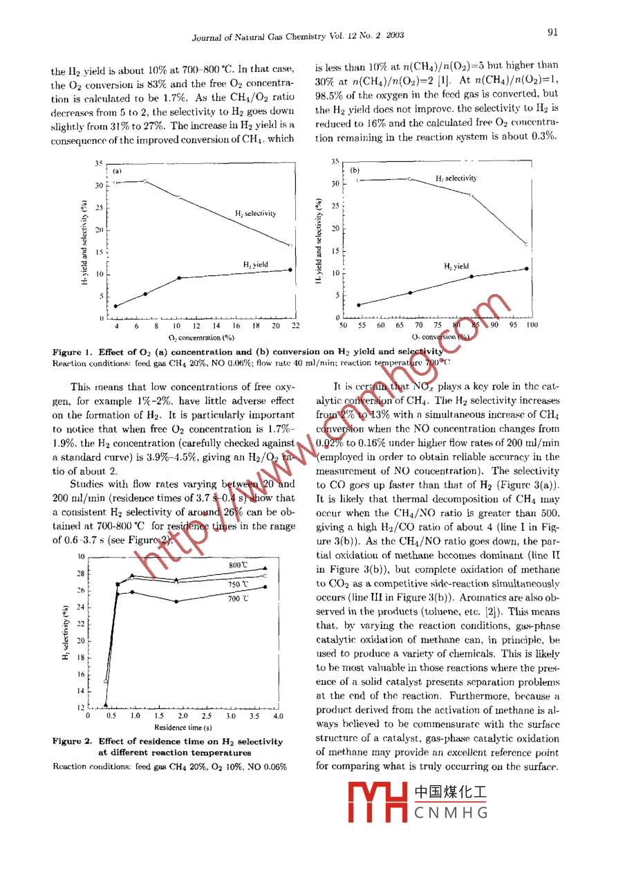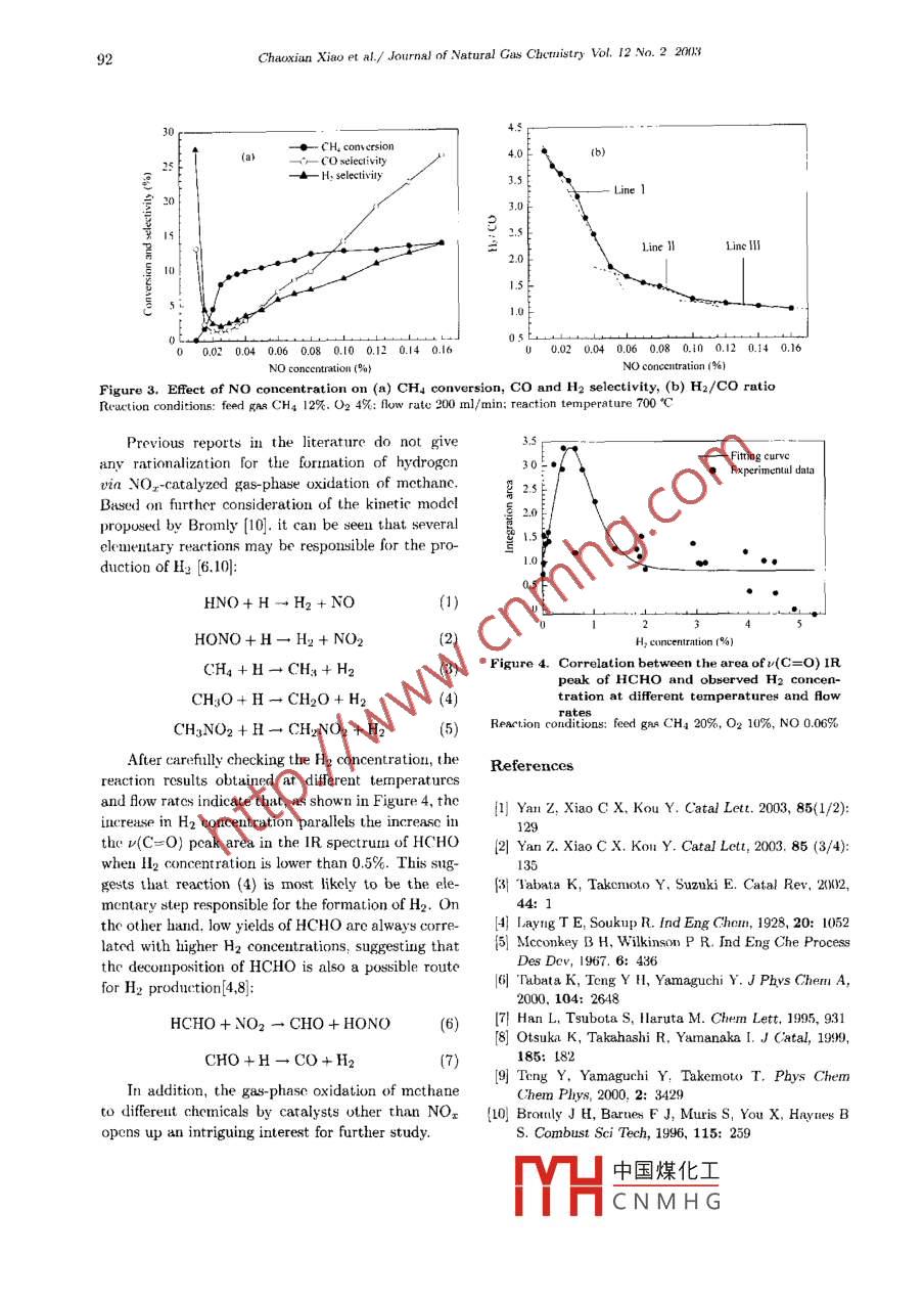 ournal of Natural Gas Chenistry 12(2003)90-92CIENCE PRESSNOr-Catalyzed Gas-Phase Activation of Methane:the Formation of HydrogenChaoxian Xiao. Zhen Yan, Yuan KouMAnuscript received March 0: 3. 2D)(K; revised April 15, 2003Abstract: NO, alyzed oxidlation of methane without a solid catalyst was investigAted, and a hydrogerselectivity of 27% was obt ained with an overall methane conversion of 31% and a free O2 concentration of1.7%at7o0℃Key words: gas-phase oxidation, methane activation, Imct hine. nitrogen oxide, hydrogen1. IntroductionOverall Factory). The amounts of NO. NO2, CHaCO. CO2 HCHO. CH OH and C2 H, were determinedGas-phase uxidation of methane without the use by in situ or on-line FT-IR usiug a Bruker Vector 22of any solid catalyst opens up new possibilities for spectrometer with a 10 cm long gas cell. The con-the direct conversion of methane to valuable chemi- centrations were automatically determiued using thecals. although results are still limited(1, 2 concerning OPUS Quantitative Method withpropriate calibthe production of oxygenates using NOr as the cata- tion curves. CO and H2 selectivity were calculated aslyst 13-9). In this paper, we show that the formation followsof significant amounts of hydrogen has always beenC(CO)finalignored in recent reaction and mechanistic studiesS(CO)Ha)initial-C(CHa)final×100%2. ExperimentalHS(H2 )=2(C(CHA)inital -C(CHA)#ina )*%The experiments were carried out at atmospheric3. Results and discussiempty quartz tube reactor (inner diameter 5 mm)The reactor was kept in a tubular furnace (20 cmVarying the CHa/O2 ratios shows that lowerlength). The gases were controlled by mass flow CH4/O2 ratios, i.c. higher O? concentration, in thecontrollers and premixed before entering the reac- feed gas lead to higher yields of H2. Figure I showsor with an N2 balance. The temperatures indicated that low yields of hydrogen are obtained in an oxyin this paper were the temperatures in the reaction gen atMosphere. When the O2 concentration is 4%zone of the reactor as measured with a thermocouple. (n(CH)/n(O2)=5), 52% of the oxygen is convertedThe anounts of H2. O2, CH4 and CO in the prod- the free O2 concentration is calculated to be 1.8% anducts were analyzed by on-line gas chromatography the yield of hydrogen is only 3%h, at 700C. When the(GC122 and 102G. Shanghai Analytical Instrument O2 concentration reaches 10%e (n(CHA)/n(O2)=2Corresponding author. Tel: +86-10-62757792; Fax: +86-10-62751708; Frmail: yuankou pku.edu. cnThe project supported by the Ministry of Science and Technology, China(G1999022202)中國(guó)煤化工CNMHGJournal of Natural Gas Chemistry vol. 12 No. 2 2003the Hl2 yield is about 10% at 700-800.C In that case, is less than 10% at n(CHa)/nO)=5 but higher thanthe O2 conversion is 83% and the free Oz concentra30%atn(CH4)/n(O2)=2(lAtn(CH4)/n(O2)=1,tion is calculated to be 1.7%. As the CH,/ O2 ratio 985y of the oxygen in the feed gas is converted, butdecreases from 5 to 2, the selectivity to H2 goes down the H2 vield does not improve the selectivity to Hy isslightly from 31%to 27%. The increase in H2 yield is a reduced to 16% and the calculated free O2 concentraonseqnence of the improved conversion of CH; which tion remaining in the reaction system is about 0.3%.H, yieldFigure 1. Effect of Oa(a)concentration and (b) conversion on H2 yield and selectivityReartion conditions: feed gas CH4 20%, NO 0 (6i%; How rate 40 ml/ min; reaction temperature 700"CThis rneans that low concentrations of free oxyIt is ccrtain that NOr plays a key role in the cat-gen, for example 1%-2%. have little adverse effect alytic conversion of CH4. The Hz selectivity increaseson the formation of H2. It is particularly important from 2% to 13% with a simultaneous increasc of CH4to notice that when frec O2 concentration is 1.7conversion when the no concentration changes from1.9%, the H2 concentration(carefully checked against 0.02%to 0.16%c under higher flow rates of 200 ml/mina standard curve)is 3.9%-4.5%, giving an H2/O2 ra-(employed in order to obtain reliable accuracy in thetio of about. 2measurement of NO concentration). The selectivityStudies with fow rates varying between 20 and to CO gors up faster than that of H2(Figure 3(a)200 ml/inin(residence times of 3.7 s-0.4 s) show that It is likely that thermal decomposition of CHA aya consistent H2 selectivity of around 26% can be ob- occur when the CHa/NO ratio is greater than 500,tained at 700-800'C for residence times in the range giving a high H2/CO ratio of about 4(line I in Fig-of 0.6-3.7 s(see Figure 2)ure 3(b)). As the CH/NO ratio goes down, the par-tial oxidation of ethane bccomes dominant(line IIin Figure 3 (b)), but complete oxidation of methane750℃to CO2 as a competitive sidc-reaction simultaneouslyoccurs( line Ill in Figure 3(b)). Aromatics are also ob-served in the products(toluene, etc. 2). This meanstheion conditions, gas-phasecatalytic oxidation of ethane can, in principle, beused to produce a variety of chemicals. This is likelyto be most valuable in those reactions where the prey-euce of a solid catalyst presents separation problemat the end of the reaction. Furthermore, because a00.51.01.52025303.540product derived from the activation of methane is al-Residence time(s)ways believed to be commensurate with the surfaceFigure 2. Effect of residence time on H selectivitystructure of a catalyst, gas-phase catalytic oxidationat different reaction temperaturesof methane may provide an excellent reference pointReaction conditions: feed gas CH4 20%,O2 10%, No 0.06% for comparing what is truly occurring ou the surface中國(guó)煤化工CNMHGChaoxian Xiao et al./ Journal of Natural Gas Chemistry Vol. 12 No. 2 20(irCO selectivity-H, selectivityline lILine lll51g00020.040.060080.100.120.140.6U0.020.040.060.080.100.120.140.16NO conFigure 3. Effect of NO concentn(a)CH, conversion, CO and H2 selectivity,(b)H/co ratioReaction conditions: feed gAR CHA I4%: flow rate 300 ml/ min: reaction temperature 700CPrevious repo