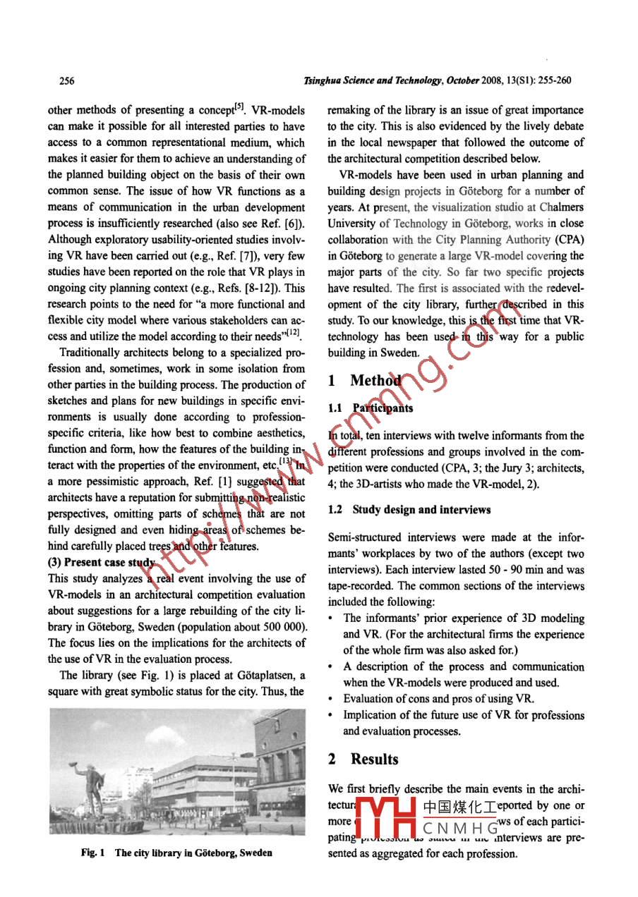 TSINGHUA SCIENCE AND TECHNOLOGYISSN 1007-0214 41/67 pp255-260Volume 13, Number S1, October 2008Virtual Reality As a New Tool in the City Planning ProcessKaj Sunesson", Carl Martin Alwood, Dan Paulin, lona Heldal,Mattias Roupe, Mikael Johansson, Borje WesterdahlChalmers University of Technology, SE 412 96 Goteborg, SwedenAbstract: The introduction of vitual reality (VR)-models in the city planning process will cause changes inthe traditional roles of the involved parties. In order to better understand some of these changes, the eventsinvolving the use of VR-models in an architectural competition conceming rebuilding-proposals for the citylibrary in a Swedish city were analyzed. The study shows that VR was introduced into the competition as anextra add-on and that the VR-presentation was experienced as useful by the jury. The transformation of thearchitects' contributions into VR was experienced as problematic by the architects, partly because they lostfull control over the presentation. In the future architects are likely to have to produce the VR-models fortheir proposals themselves. This may make it more difcult for smaller architectural firmns to enter the marketbut their proposals will be more accessible to a wider group of stakeholders.Key words: architecture; architectural competition; city planning; construction planning; VR-models(reviewed in Ref. [1]) listed four relevant interest cate-Introductiongories in the urban planning process: (1) city planners,(2) architects working for clients, (3) the clients them-New technology often causes disruption and change inselves and (4) the general public (see Ref. [2]). Suchestablished practices. In the future the use of virtual re-broader participation may lead to better sustainabilityality (VR) models is likely to increase in the city plan-of the projected constructions since they might betterning process. This is likely to lead to cbanges in howmeet the needs of the future users.the activities and roles in the early parts of city plan-The goal of a broader participation in the buildingning processes are carried out. This paper describes theprocess is not easy to accomplish (see Ref. [3]). Foreffects of the use of VR-models in an architecturalexample, within the traditional and conventional wayscompetition evaluation process from the standpoint ofof working with the urban development process, manydifferent professions, and it discusses how VR can in-different types of communication- and decision mate-fluence the roles of concerned professions, e.g.,rial (e.g.. 2D drawings, sketches and perspective draw-architects.ings) are used by professional groups中and it is some-(1) Current developmentstimes dificult for the public and non-technical special-In modem, high-quality, professional city planning itists to understand from this material what the projectsis not only the visions of politicians that govern the de-entail.sign of urban development. A broader circle of relevant(2) Previous studies on VR in the constructionparties should be able to exert an influence. Hall 1996pro |中國煤化工Received: 2008-05-30In this iCNMH G's provide many.Y..benefits m uc Cly lulnww pIuccss by offering a rep-$$ To whom correspondence should be addressed.E-mail: suneson@chalmers.seresentation that is closer to common experience than256Tsinghua Science and Technology, October 2008, 13(S1): 255-260other methods of presenting a concept5l. VR-modelsremaking of the library is an issue of great importancean make it possible for all interested parties to haveto the city. This is also evidenced by the lively debateaccess to a common representational medium, whichin the local newspaper that followed the outcome ofmakes it easier for them to achieve an understanding ofthe architectural competition described below.the planned building object on the basis of their ownVR-models have been used in urban planning andcommon sense. The issue of how VR functions as abuilding design projects in Goteborg for a number ofmeans of communication in the urban developmentyears.At present, the visualization studio at Chalmersprocess is insufficiently researched (also see Ref. [6]).University of Technology in Goteborg, works in closeAlthough exploratory usability-oriented studies involv-collaboration with the City Planning Authority (CPA)ing VR have been carried out (e.g, Ref. [7]), very fewin Goteborg to generate a large VR-model covering thestudies have been reported on the role that VR plays inmajor parts of the city. So far two specific projectsongoing city planning context (e.g., Refs. [8-12]). Thishave resulted. The first is associated with the redevel-research points to the need for “a more functional andopment of the city library, further described in thisflexible city model where various stakeholders can ac-study. To our knowledge, this is the first time that VR-cess and utilize the model according to their needs"2. technology has been used in this way for a publicTraditionally architects belong to a specialized pro-building in Sweden.fession and, sometimes, work in some isolation fromother parties in the building process. The production of1 Methodsketches and plans for new buildings in specific envi-1.1 Participantsronments is usually done according to profession-specifc criteria, like how best to combine aesthetics,In total, ten interviews with twelve informants from thefunction and form, how the features of the building in-different professions and groups involved in the com-teract with the properties of the environment, etc."3] Inpetition were conducted (CPA, 3; the Jury 3; archiects,a more pessimistic approach, Ref. [1] suggested tha4; the 3D-artists who made the VR. model, 2).architects bave a reputation for submiting non-realisticperspectives, omitting parts of schemes that are not1.2 Study design and interviewsfully designed and even hiding areas of schemes be-Semi-structured interviews were made at the infor-hind carefully placed trees and other features.mants' workp