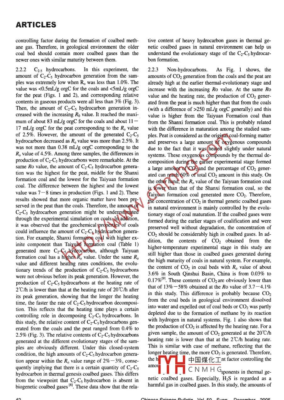 ARTICLESChinese Science Bulletin 2005 Vol 50 Supp 40-44ome researchers have simulated the yields ofThermal simulation of thegases and hydrocarbons, geochemical characteristics ofproducts and kinetics of hydrocarbon generation by meansformation and evolution ofof pyrolysis experiments on total coals. In addition,many simulation experiments of coal macerals have alsocoalbed gasbeen reported and a lot of new findings are obtained5-7Coalbed gases are mainly composed of methane and otherDUAN Yi, WU Baoxiang 2, ZHENG Chaoyang.2hydrocarbons and non-hydrocarbon gases, and the gener-WANG Chuanyuanating process of each gas component and the relationshipsbetween those gases are important for understanding the1. Key Laboratory of Gas Geochemistry, Institute of Geology and Geo- feature of the formation and evolution of coal-derived gas2. Graduate School of Chinese Academy of Sciences, Beijing 100039,So far, studies on these problems are still lacking. Pre-vious pyrolysis simulations of the evolution of coal matuCorrespondence should be addressed to Duan Yi (email: ration usually adopted isothermal heating and only pro-Duany @ns lzb ac cn)longing time in dealing with the influence of heating timeAbstract Thermal simulation experiment of gas generon the evolution of hydrocarbon generation from coalstion from the peat and the coals were performed using the However, the evolution of coal maturation is a dynamichigh temperature and pressure apparatus, at temperature process in geological environment, so it is controlled byranging from 336.8-600'C, a pressure of 50MPa and two temperature and geological time. Thus, this experimentheating rates of 20'C h and 2 C/h, and the evolution and method cannot follow the kinetic process of gas generaformation of coalbed gas components were studied. Results tion from organic matter well. To date, no experimentshow that for the coals, the gaseous products are mainly studies on the evolution of coalbed gas generation fromcomposed of hydrocarbon gases. However, for the peat the peat have been reported. Peat has been considered as thecontent of hydrocarbon gases in gaseous products is lower original matter of coal formation without t undergoingthan that of non-hydrocarbon components. In the gener- deep burial and strong degradation. So peat contains lotsated hydrocarbon gases methane is predominant and heavy of original information important for understanding thevolutionary characteristics of coal-forming organic matated non-hydrocarbon gases, and hydrogen(H) and sul- ter during the cause of coalification. On the basis of thefurated hydrogen(H S)are existent in trace amount. It is above-mentioned facts, the peat and low-maturity coals inalso observed that temperature is the main factor controllingg this study were used in the simulation experiment and thethe evolution of coalbed gas generation. With increasing process and characteristics of gas generation from thesevitrinite reflectance, methane rapidly increases, COz sightly experimental materials were studied. The experimentalincreases, and C2s hydrocarbons first increase and then de- system were performed at the heating rates of 20 and 2Ccrease. The peat and Shanxi formation coal have a higher h to reveal the role of time in the process of gas genera-generative potential of coalbed gases than coals and Taiformation coal, respectively, reflecting the effect of the proption. The potential uses of results obtained in the studyerty of organic matter on the characteristics of coalbed gas coalbed gas components in geological environment arecomponent generation. In this study, it is found that low discussed. This provides a scientific reference for furtherheating rate is favorable for the generation of methane, H2 understanding the genesis and characteristics of coalbedand CO, and the decomposition of C2s hydrocarbons. This gas in geological environmentshows that heating time plays an important controlling rolein the generation and evolution of coalbed gases. The resultsThe results 1 Samples and experimentalbtained from the simulation experiment in the study of In this experiment, two coals and a peat were collectedcoalbed gases in natural system are also discussed.to simulate the formation and evolution of coalbed gasKeywords: coalbed gas, generation and evolution, pyrolysis, peat, components. The coals came from the No. 2 coalbed in theLiyazhuang Coal Mine of the Qinshui Basin(ShanxiDOl:10.1360/98zk0002Formation(Ps), bituminous coal)and No 6 coalbed inTanggongta Coal Mine, Inner Mongolia(Taiyuan Forma-Coalbed gas is a mixture of various kinds of hydrocar- tion(Cat), bituminous coal). The peat was collected frombon and non-hydrocarbon gases generated from the Ruoergai Marsh of Sichuan Province at a depth of 3.0coal-formed organic matter during its geological evolution. 3.2 m, of which the organic carhon content was approxiThermal experiments of organic matter was widely carried中國煤化工 hydrogen, oxygen andout to simulate the process of hydrocarbon generation, nitrogeCNMH were 59.8%,4.8%assess the generative potential of hydrocarbons from dif- 24.20wopwou,vj, and the carbon isotoferent types of organic matter and study the influence of composition was -27. 1%o. Other analytic data for the peatmedia on generation, evolution of hydrocarbons and so and the coals are listed in Table 1Chinese Science Bulletin Vol 50 Supp. December 2005ARTICLESTable 1 Analytic data of content of macerals, H/C(atom)ratio, and vitrinite reflectance( Ro)of the peat and coalsType of kerogenContent of macerals(%)TOC(%)H/C(atom)ratio Ro(InertiniteexiniteTaiyuan Formation( Cyl)coal0.79051Shanxi Formation(P:s)coal272945.00.750.34The simulation experiments were finished in the State drocarbons and H2 having a relative content of 0.5%Key laboratory of Organic Geochemistry of Guangzhou 39.6%,0.4%-14.4% and 0. 1%-2.3%, respectivelyInstitute of Geochemistry, the Chinese Academy of Sences. Samples were first crushed into 120 meshes, and 2.2 Generation and 
