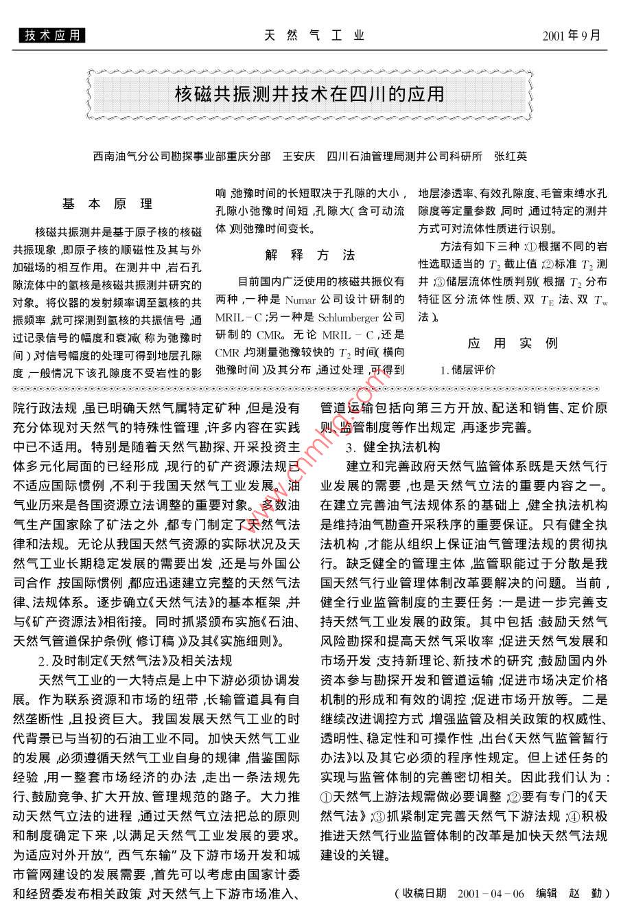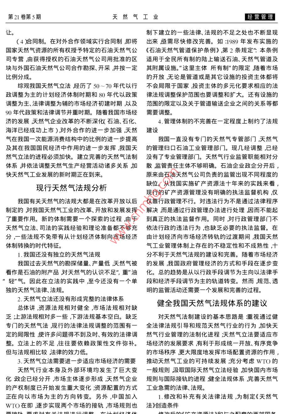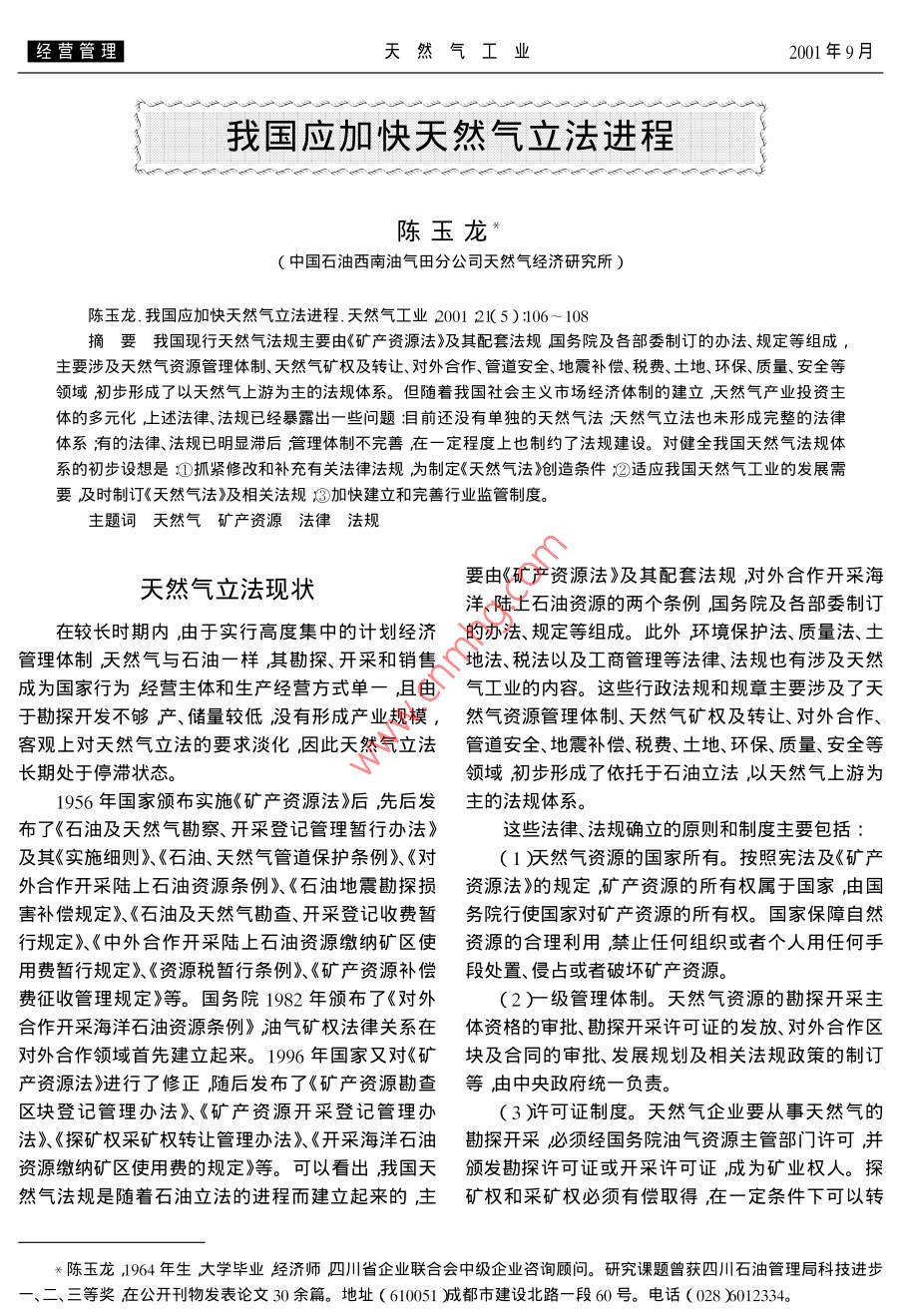 經(jīng)營管理天然氣工業(yè)2001年9月我國應(yīng)加快天然氣立法進程陳玉龍*(中國石油西南油氣田分公司天然氣經(jīng)濟研究所)陳玉龍.我國應(yīng)加快天然氣立法進程.天然氣工業(yè)2001 21(5):106~ 108摘要我國現(xiàn)行天然氣法規(guī)主要由《礦產(chǎn)資源法》及其配套法規(guī)國務(wù)院及各部委制訂的辦法、規(guī)定等組成,主要涉及天然氣資源管理體制、天然氣礦權(quán)及轉(zhuǎn)讓、對外合作、管道安全、地震補償、稅費、土地、環(huán)保、質(zhì)量、安全等領(lǐng)域初步形成了以天然氣上游為主的法規(guī)體系。但隨著我國社會主義市場經(jīng)濟體制的建立,天然氣產(chǎn)業(yè)投資主體的多元化上述法律、法規(guī)已經(jīng)暴露出一些問題:目前還沒有單獨的天然氣法天然氣立法也未形成完整的法律體系有的法律、法規(guī)已明顯滯后管理體制不完善在-定程度上也制約了法規(guī)建設(shè)。對健全我國天然氣法規(guī)體系的初步設(shè)想是①抓緊修改和補充有關(guān)法律法規(guī)為制定《天然氣法》創(chuàng)造條件;②適應(yīng)我國天然氣工業(yè)的發(fā)展需要及時制訂《天然氣法》及相關(guān)法規(guī)③加快建立和完善行業(yè)監(jiān)管制度。主題詞天然氣礦產(chǎn)資源法律法規(guī)要由《礦產(chǎn)資源法》及其配套法規(guī),對外合作開采海天然氣立法現(xiàn)狀洋、陸上石油資源的兩個條例,國務(wù)院及各部委制訂在較長時期內(nèi),由于實行高度集中的計劃經(jīng)濟的辦法、規(guī)定等組成。此外環(huán)境保護法、質(zhì)量法、土.管理體制,天然氣與石油一樣其勘探、開采和銷售地法、稅法以及工商管理等法律、法規(guī)也有涉及天然成為國家行為經(jīng)營主體和生產(chǎn)經(jīng)營方式單一,且由氣工業(yè)的內(nèi)容。這些行政法規(guī)和規(guī)章主要涉及了天于勘探開發(fā)不夠產(chǎn)、儲量較低沒有形成產(chǎn)業(yè)規(guī)模,然氣資源管理體制、天然氣礦權(quán)及轉(zhuǎn)讓、對外合作、客觀.上對天然氣立法的要求淡化,因此天然氣立法管道安全、地震補償、稅費、土地、環(huán)保、質(zhì)量、安全等長期處于停滯狀態(tài)。領(lǐng)域初步形成了依托于石油立法,以天然氣上游為1956年國家頒布實施《礦產(chǎn)資源法》后,先后發(fā)主的法規(guī)體系。布了《石油及天然氣勘察、開采登記管理暫行辦法》這些法律、法規(guī)確立的原則和制度主要包括:及其《實施細(xì)則》《石油、天然氣管道保護條例》《對( 1 )天然氣資源的國家所有。按照憲法及《礦產(chǎn)外合作開采陸上石油資源條例》《石油地震勘探損資源法》的規(guī)定礦產(chǎn)資源的所有權(quán)屬于國家,由國害補償規(guī)定》、《石油及天然氣勘查、開采登記收費暫務(wù)院行使國家對礦 產(chǎn)資源的所有權(quán)。國家保障自然行規(guī)定》《中外合作開采陸上石油資源繳納礦區(qū)使資源的合理利用禁止任何組織或者個人用任何手用費暫行規(guī)定》《資源稅暫行條例》《礦產(chǎn)資源補償段處置、侵占或者破壞礦產(chǎn)資源。費征收管理規(guī)定》等。國務(wù)院1982年頒布了《對外(2)-級管理體制。天然氣資源的勘探開采主合作開采海洋石油資源條例》油氣礦權(quán)法律關(guān)系在體資格的審批、勘探開采許可證的發(fā)放、對外合作區(qū)對外合作領(lǐng)域首先建立起來。1996 年國家又對《礦塊及合同的審批、發(fā)展規(guī)劃及相關(guān)法規(guī)政策的制訂產(chǎn)資源法》進行了修正隨后發(fā)布了《礦產(chǎn)資源勘查等,由中央政府統(tǒng)一負(fù)責(zé)。區(qū)塊登記管理辦法》《礦產(chǎn)資源開采登記管理辦(3 )許可證制度。天然氣企業(yè)要從事天然氣的法》《探礦權(quán)采礦權(quán)轉(zhuǎn)讓管理辦法》《開采海洋石油勘探開采必須經(jīng)國務(wù)院油氣資源主管部門許可并資源繳納礦區(qū)使用費的規(guī)定》等??梢钥闯觯覈祛C發(fā)勘探許可證或開采許可證,成為礦業(yè)權(quán)人。探然氣法規(guī)是隨著石油立法的進程而建立起來的,主礦權(quán)和采礦 權(quán)必須有償取得,在一定條件下可以轉(zhuǎn)*陳玉龍,1964年生大學(xué)畢業(yè)經(jīng)濟師四川省企業(yè)聯(lián)合會中級企業(yè)咨詢顧問。研究課題曾獲四川石油管理局科技進步一、二、三等獎在公開刊物發(fā)表論文30余篇。地址( 610051 )成都市建設(shè)北路一段60號。電話( 028 6012334。第21卷第5期天然氣工業(yè)經(jīng)營管理讓。制下建立的一些法律、法規(guī)的不足之處也不斷顯現(xiàn)( 4合同制。在對外合作領(lǐng)域?qū)嵭泻贤?即將出來亟需盡快修改完善。如:1989年發(fā)布實施的國家天然氣資源的所有權(quán)授予特定的石油天然氣公《石油天然氣管道保護條例》,第2條規(guī)定":本條例司專營,由獲得授權(quán)的石油天然氣公司用批準(zhǔn)的區(qū)適用于全民所有制的陸上輸送石油、天然氣管道及塊與外國石油天然氣公司合作勘探、開采,并按一定其附屬設(shè)施?!边@里主體所有制”的限定隨著市場比例分成。的開放無論是管道或是其它設(shè)施的投資主體都將綜觀我國天然氣立法經(jīng)歷了50~ 70年代以行不 會局限于國家,投資主體的多元化要求相應(yīng)的法政調(diào)整為主的計劃
