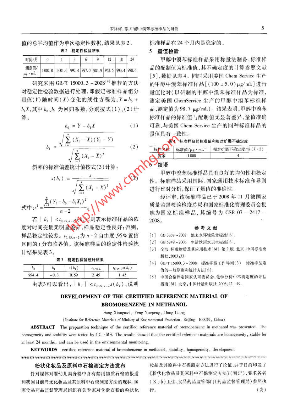 4化學(xué)分析計(jì)量2009年,第18卷,第6期甲醇中溴苯標(biāo)準(zhǔn)樣品的研制宋祥梅封躍鵬董亮(環(huán)境保護(hù)部標(biāo)準(zhǔn)樣品研究所,北京00029)摘要介紹甲醇中渙苯標(biāo)準(zhǔn)樣品的研制方法。 標(biāo)準(zhǔn)樣品采用稱量法制備,氣相色譜-質(zhì)譜法進(jìn)行均勻性和穩(wěn)定性檢驗(yàn),以配制值為標(biāo)準(zhǔn)值,并對其不確定度進(jìn)行分析評定。結(jié)果表明,甲醇中澳苯標(biāo)準(zhǔn)樣品的均勻性良好,至少在24個(gè)月內(nèi)是穩(wěn)定的,可用于環(huán)境監(jiān)測分析。關(guān)鍵詞甲醇中溴苯標(biāo)準(zhǔn)樣品 穩(wěn)定性均勻性研制我國從2005年到2010年進(jìn)行地下水污染調(diào)3均勻性檢驗(yàn)查,其目的是編制全國地下水污染防治與保護(hù)規(guī)劃,標(biāo)準(zhǔn)樣品均勻性是指特性量值在空間分布的均建立地下水水質(zhì)與污染預(yù)警系統(tǒng),并制定和完善地勻程度 ,它是對標(biāo)準(zhǔn)物質(zhì)樣品總體空間分布的評價(jià),下飲用水水質(zhì)標(biāo)準(zhǔn),保障人們飲水安全和健康。但是標(biāo)準(zhǔn)樣品的重要質(zhì)量指標(biāo)之一門。是我國環(huán)境標(biāo)準(zhǔn)樣品卻遠(yuǎn)遠(yuǎn)不能滿足我國環(huán)境監(jiān)測在分裝樣品的前、中、后期隨機(jī)抽取標(biāo)準(zhǔn)樣品的需求,大部分的標(biāo)準(zhǔn)樣品依賴國外進(jìn)口,這不僅造10支,用CC-MSD分析抽檢的樣品,每支樣品重復(fù)成標(biāo)準(zhǔn)樣品價(jià)格高,而且供貨周期長,無法滿足國內(nèi)測定3次,以單因素方差分析法對測試數(shù)據(jù)進(jìn)行F的需求。因此,盡快完善環(huán)境標(biāo)準(zhǔn)樣品庫是亟待解檢驗(yàn)來判定樣品的均勻性。判定方法如下:若Ft算< F臨界,說明樣品瓶間非決的問題。甲醇中溴苯標(biāo)準(zhǔn)樣品是2006年度環(huán)境保護(hù)部均勻性引起方差與檢驗(yàn)方法的重復(fù)性引起的方差相(原國家環(huán)??偩?標(biāo)準(zhǔn)制定項(xiàng)目。研制該標(biāo)準(zhǔn)樣比是不顯著的,樣品均勻;否則,樣品不均勻。樣品品是為了配合《地表水環(huán)境質(zhì)量標(biāo)準(zhǔn)》”.《生活飲均勻性檢驗(yàn)結(jié)果見表1。表1均勻性檢驗(yàn)結(jié)果μg/mL用水衛(wèi)生標(biāo)準(zhǔn)》(2等有關(guān)國家標(biāo)準(zhǔn)的實(shí)施并為我國瓶號測定值平均值有機(jī)污染物監(jiān)測結(jié)果的準(zhǔn)確、可靠性提供技術(shù)保障。996.9 1004.0 998. 1999.7主要儀器與試劑1013.0 991.9 995.01000.1009.0 990.2 998.0999. 1氣相色譜-質(zhì)譜儀: 6890 - 5973N型,配自動(dòng)984.9 983.4 991.5986. 6.進(jìn)樣器,美國安捷倫科技有限公司;95.3 991.3 983.6990. 1分析天平:ME -240型,瑞士Metler - Toledo公999.0 984.5 996.2993. 2998.4 992.5 1004998.3司;1011.0 990.9 990.0997. 3恒溫箱:溫度恒定控制在(20土1)C范圍內(nèi);990.9 993.9 983.0989. 3樣品灌封機(jī):FPS2型,美國可卓越(Cozzoli)公10985.6 981.9 981.9983.1總均值993. 7FF計(jì)算=1.99,Fex-=2.39,Fm