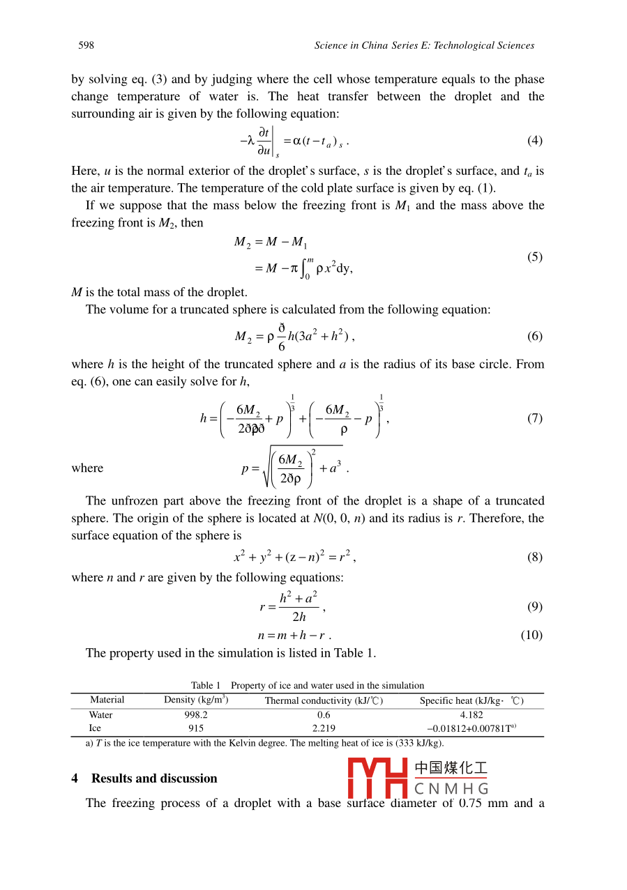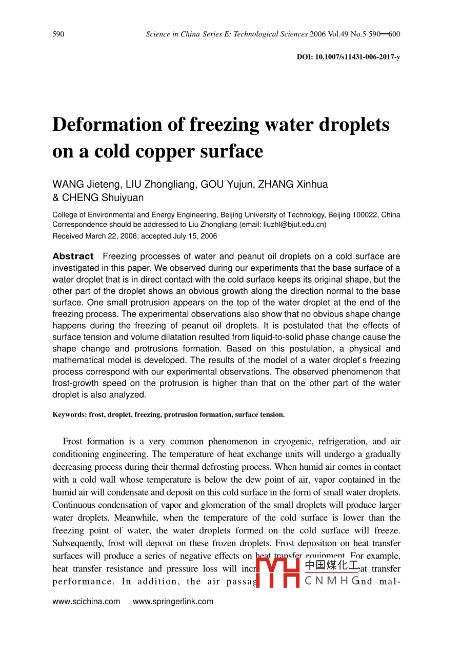 Science in China Series E: Technological Sciences 2006 Vol.49 No.5 590- -600DOI: 10.001/51431-006-2017-yDeformation of freezing water dropletson a cold copper surface .WANG Jieteng, LIU Zhongliang, GOU Yujun, ZHANG Xinhua& CHENG ShuiyuanCollege of Environmental and Energy Engineering, Beiing University of Technology, Beiing 100022, ChinaCorrespondence should be addressed to Liu Zhongliang (email: liuzhl@bjut.edu.cn)Received March 22, 2006; accepted July 15, 2006Abstract Freezing processes of water and peanut oil droplets on a cold surface areinvestigated in this paper. We observed during our experiments that the base surface of awater droplet that is in direct contact with the cold surface keeps its original shape, but theother part of the droplet shows an obvious growth along the direction normal to the basesurface. One small protrusion appears on the top of the water droplet at the end of thefreezing process. The experimental observations also show that no obvious shape changehappens during the freezing of peanut oil droplets. It is postulated that the effects ofsurface tension and volume dilatation resulted from liquid-to-solid phase change cause theshape change and protrusions formation. Based on this postulation, a physical andmathematical model is developed. The results of the model of a water droplet s freezingprocess correspond with our experimental observations. The observed phenomenon thatfrost-growth speed on the protrusion is higher than that on the other part of the waterdroplet is also analyzed.Keywords: frost, droplet, freezing, protrusion formation, surface tension.Frost formation is a very common phenomenon in cryogenic, refrigeration, and airconditioning engineering. The temperature of heat exchange units will undergo a graduallydecreasing process during their thermal defrosting process. When humid air comes in contactwith a cold wall whose temperature is below the dew point of air, vapor contained in thehumid air will condensate and deposit on this cold surface in the form of small water droplets.Continuous condensation of vapor and glomeration of the small droplets will produce largerwater droplets. Meanwhile, when the temperature of the cold surface is lower than thefreezing point of water, the water droplets formed on the cold surface will freeze.Subsequently, frost will deposit on these frozen droplets. Frost deposition on heat transfersurfaces will produce a series of negative effects on heat transfer enuinment For example,heat transfer resistance and pressure loss will inc中國(guó)煤化工at transferperformance. In addition, the air passagMYHCNMHGndmal-www.scichina.com www.springerlink.comDeformation ofreezing water droplets on a cold copper surface591function of the equipment may occur.Hayashi et al.!" divided the frost formation process into three different periods, that is,the crystal growth, the frost layer growth, and the frost layer full growth period. Mostresearch works reported in literature are on the frost layer growth and the frost layer fullgrowth period, but some are concerned with the influences of the external electricalfield2l and the surface characteristics'- 5 on frost formation. Few work has beencompleted on the deformation of freezing water droplets on cold surfaces. Since theprocess is very fast, it has been neglected. However, this period, i.e. the frost crystalgrowth period, is not only the starting point of the frost deposition process and should befully understood as the initial condition for numerical simulation, but it also relates tovery important theoretical problems of nucleation and phase change theory. Therefore,this research has significant relevance to frost formation research. .Feuillebois et al.tol studied the freezing heat transfer problem of supercooled waterdroplets of spherical shape. Richard and Mochel"T gave a detailed thermodynamicsanalysis of the same problem. Tabakova et al.s investigated the freezing process 0supercooled droplets with an assumption that the droplet surface temperature was equal tothe surrounding air temperature. All these research works are about the spherical droplet,which is not the same as the truncated spherical droplets formed on a cold surface. As faras the present authors know, the volume expansion has not been taken into considerationin any of the research reported so far. The shape of the water droplets formed during thefrost formation process is that of a truncated sphere that changes during the freezingprocess. Actually, the shape change of the water droplet during freezing is significant asthe protrusion may appear due to the density discontinuity of liquid water and solid water.Hindmarsh et al.! verified that a single droplet adhered to a thermocouples and put incold air changed its original spherical shape and formed a protrusion on the top side ofitself. The researchers attributed the protrusion to volume dilatation. They attributed thechanging from clear to opaque of the droplet to air bubbles released during freezingprocess. Wang et al. ' '“”analyzed the condensation of vapor and aggregation of droplets oncold surface. The number of droplets increased with the humidity of the air. A hexangularstructure was observed when the diameter of droplet exceeded critical size (80 μm). Butdeformation and protrusion formation were also not taken into consideration. Satoh etal." did not find protrusion formation in their droplets freezing experiments either. Ismailand Salinas2l gave a detailed model of frost formation, but no protrusion was mentioned.Kawanami et al.!15l observed the droplets' freezing process on cold surface and simulatedthe process by using Landau' s theory. Their simulation results did not agree with theexperimental observation of the top part of the droplet. They also did not take protrusionformation into consideration. Shape change and protrusion formation at the top of dropletsat the final stage of freezing was observed by Hokel4. He used a high speed camera toobserv