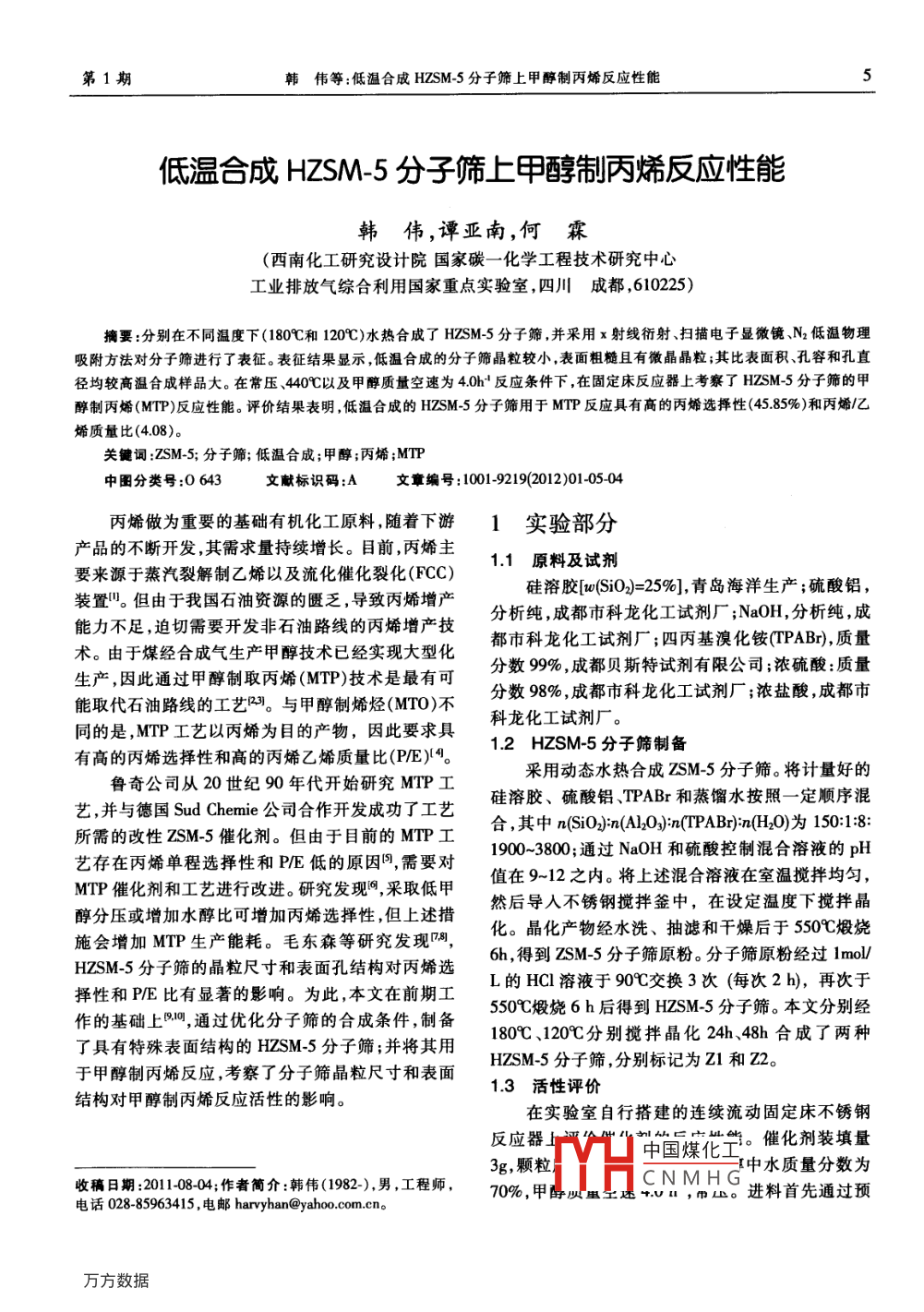 低溫合成HZSM-5分子篩上甲醇制丙烯反應(yīng)性能