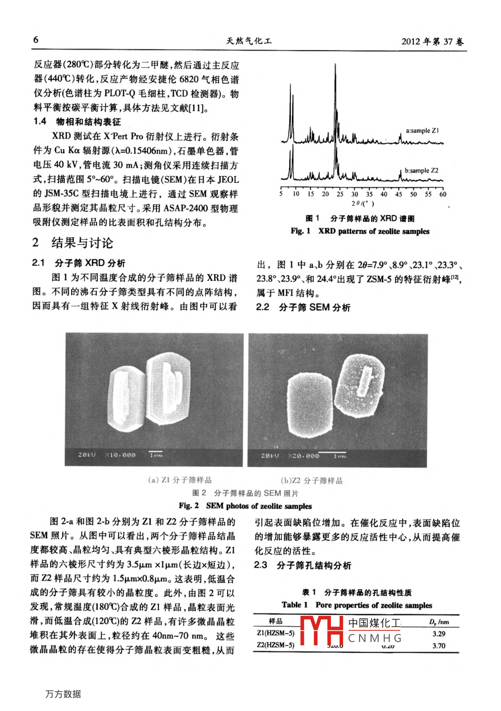 第1期韓偉等:低溫合成HZSM5分子篩上甲醇制丙烯反應(yīng)性能低溫合成HzSM-5分子篩上甲醇制丙烯反應(yīng)性能韓偉,譚亞南,何霖(西南化工研究設(shè)計(jì)院國家碳一化學(xué)工程技術(shù)研究中心工業(yè)排放氣綜合利用國家重點(diǎn)實(shí)驗(yàn)室,四川成都,610225摘要:分別在不同溫度下(180℃和120℃)水熱合成了HZSM5分子篩,并采用x射線衍射掃描電子顯微鏡N2低溫物理吸附方法對分子篩進(jìn)行了表征。表征結(jié)果顯示,低溫合成的分子篩晶粒較小,表面粗糙且有微晶晶粒;其比表面積、孔容和孔直徑均較高溫合成樣品大。在常壓、440℃以及甲醇質(zhì)量空速為40h4反應(yīng)條件下,在固定床反應(yīng)器上考察了HZSM5分子篩的甲醇制丙烯(MTP)反應(yīng)性能。評價(jià)結(jié)果表明,低溫合成的HZSM5分子篩用于MTP反應(yīng)具有高的丙烯選擇性(45.85%)和丙烯乙烯質(zhì)量比(408)。關(guān)鍵詞:ZSM5;分子篩;低溫合成;甲醇;丙烯;MTP中圖分類號:0643文獻(xiàn)標(biāo)識碼:A文章編號:1001-92192012)010504丙烯做為重要的基礎(chǔ)有機(jī)化工原料,隨著下游1實(shí)驗(yàn)部分產(chǎn)品的不斷開發(fā),其需求量持續(xù)增長。目前,丙烯主1.1原料及試劑要來源于蒸汽裂解制乙烯以及流化催化裂化(FCC)裝置。但由于我國石油資源的匱乏,導(dǎo)致丙烯增產(chǎn)硅溶膠[w(SO)=25%],青島海洋生產(chǎn);硫酸鋁,能力不足,迫切需要開發(fā)非石油路線的丙烯增產(chǎn)技分析純,成都市科龍化工試劑廠;NaOH,分析純,成術(shù)。由于煤經(jīng)合成氣生產(chǎn)甲醇技術(shù)已經(jīng)實(shí)現(xiàn)大型化都市科龍化工試劑廠;四丙基溴化銨TPAB,質(zhì)量生產(chǎn),因此通過甲醇制取丙烯(MTP)技術(shù)是最有可分?jǐn)?shù)99%,成都貝斯特試劑有限公司;濃硫酸:質(zhì)量能取代石油路線的工藝。與甲醇制烯烴(MO)不分?jǐn)?shù)98%,成都市科龍化工試劑廠;濃鹽酸,成都市同的是,MTP工藝以丙烯為目的產(chǎn)物,因此要求具科龍化工試劑廠。有高的丙烯選擇性和高的丙烯乙烯質(zhì)量比(PE12HzSM-5分子篩制備魯奇公司從20世紀(jì)90年代開始研究MTP工采用動(dòng)態(tài)水熱合成ZSM5分子篩。將計(jì)量好的藝并與德國 Sud chem公司合作開發(fā)成功了工藝硅溶膠、硫酸鋁 TPABr和蒸餾水按照一定順序混合,其中m(SiOn(Al2Oyna( TPABr)im(H2O)為150:1:8所需的改性ZSM5催化劑。但由于目前的MTP工藝存在丙烯單程選擇性和PE低的原因,需要對19003800通過NaOH和硫酸控制混合溶液的pHMTP催化劑和工藝進(jìn)行改進(jìn)。研究發(fā)現(xiàn),采取低甲值在9-12之內(nèi)。將上述混合溶液在室溫?cái)嚢杈鶆?醇分壓或增加水醇比可增加丙烯選擇性但上述措然后導(dǎo)入不銹鋼攪拌釜中,在設(shè)定溫度下攪拌晶施會(huì)增加MTP生產(chǎn)能耗。毛東森等研究發(fā)現(xiàn),化。晶化產(chǎn)物經(jīng)水洗、抽濾和干燥后于550℃煅燒HZSM5分子篩的晶粒尺寸和表面孔結(jié)構(gòu)對丙烯選6h,得到ZSM-5分子篩原粉。分子篩原粉經(jīng)過lmol擇性和PE比有顯著的影響。為此,本文在前期工的HCl溶液于90℃交換3次(每次2h),再次于作的基礎(chǔ)上,通過優(yōu)化分子篩的合成條件,制備550℃煅燒6h后得到HZSM5分子篩。本文分別經(jīng)了具有特殊表面結(jié)構(gòu)的HzSM5分子篩;并將其用180℃、120℃分別攪拌晶化24h48h合成了兩種于甲醇制丙烯反應(yīng),考察了分子篩晶粒尺寸和表面HZSM5分子篩,分別標(biāo)記為Z1和Z2。結(jié)構(gòu)對甲醇制丙烯反應(yīng)活性的影響。13活性評價(jià)在實(shí)驗(yàn)室自行搭建的連續(xù)流動(dòng)固定床不銹鋼反應(yīng)器中國煤化x。催化劑裝填量3g,顆粒收稿日期:2011-08-04;作者簡介:韓偉(1982-),男,工程師,CNMHG中水質(zhì)量分?jǐn)?shù)為70%,甲醇從重是+,。進(jìn)料首先通過預(yù)電話02885963415,電郵harahan@Pyahoo.com.cne天然氣化工2012年第37卷反應(yīng)器(280℃)部分轉(zhuǎn)化為二甲醚然后通過主反應(yīng)器(440℃)轉(zhuǎn)化,反應(yīng)產(chǎn)物經(jīng)安捷倫6820氣相色譜儀分析色譜柱為 PLOT-Q毛細(xì)柱,TCD檢測器)。物料平衡按碳平衡計(jì)算,具體方法見文獻(xiàn)(l14物相和結(jié)構(gòu)表征XRD測試在 X Pert pro衍射儀上進(jìn)行。衍射條a: sample ZI件為CuKa輻射源(A=0.15406m),石墨單色器,管電壓40kV,管電流30mA;測角儀采用連續(xù)掃描方式,掃描范圍5°~60°。掃描電鏡(SEM)在日本JEOL的JSM-35C型掃描電境上進(jìn)行,通過SEM觀察樣品形貌并測定其晶粒尺寸。釆用ASAP2400型物理26(°)吸附儀測定樣品的比表面積和孔結(jié)構(gòu)分布。圖1分子篩樣品的XRD譜圖ig. 1 XRD patterns of zeolite samples2結(jié)果與討論21分子篩XRD分析出,圖1中a、b分別在20=79°89°、23.1°23.3°、圖1為不同溫度合成的分子篩樣品的XRD譜23.8°、23.9°、和244出現(xiàn)了ZSM-5的特征衍射峰圖。不同的沸石分子篩類型具有不同的點(diǎn)陣結(jié)構(gòu),屬于MF結(jié)構(gòu)。因而具有一組特征X射線衍射峰。由圖中可以看2.2分子篩SEM分析000z8kU×1e,6120kv X20. 00 1 Mm(a)Z1分子篩樣品(b)Z2分子篩樣品圖2分子篩樣品的SEM照片F(xiàn)ig 2 SEM photos of zeolite samples圖2-a和圖2-b分別為Z1和Z2分子篩樣品的引起表面缺陷位增加。在催化反應(yīng)中,表面缺陷位SEM照片。從圖中可以看出,兩個(gè)分子篩樣品結(jié)晶的增加能夠暴露更多的反應(yīng)活性中心,從而提高催度都較高、晶粒均勻、具有典