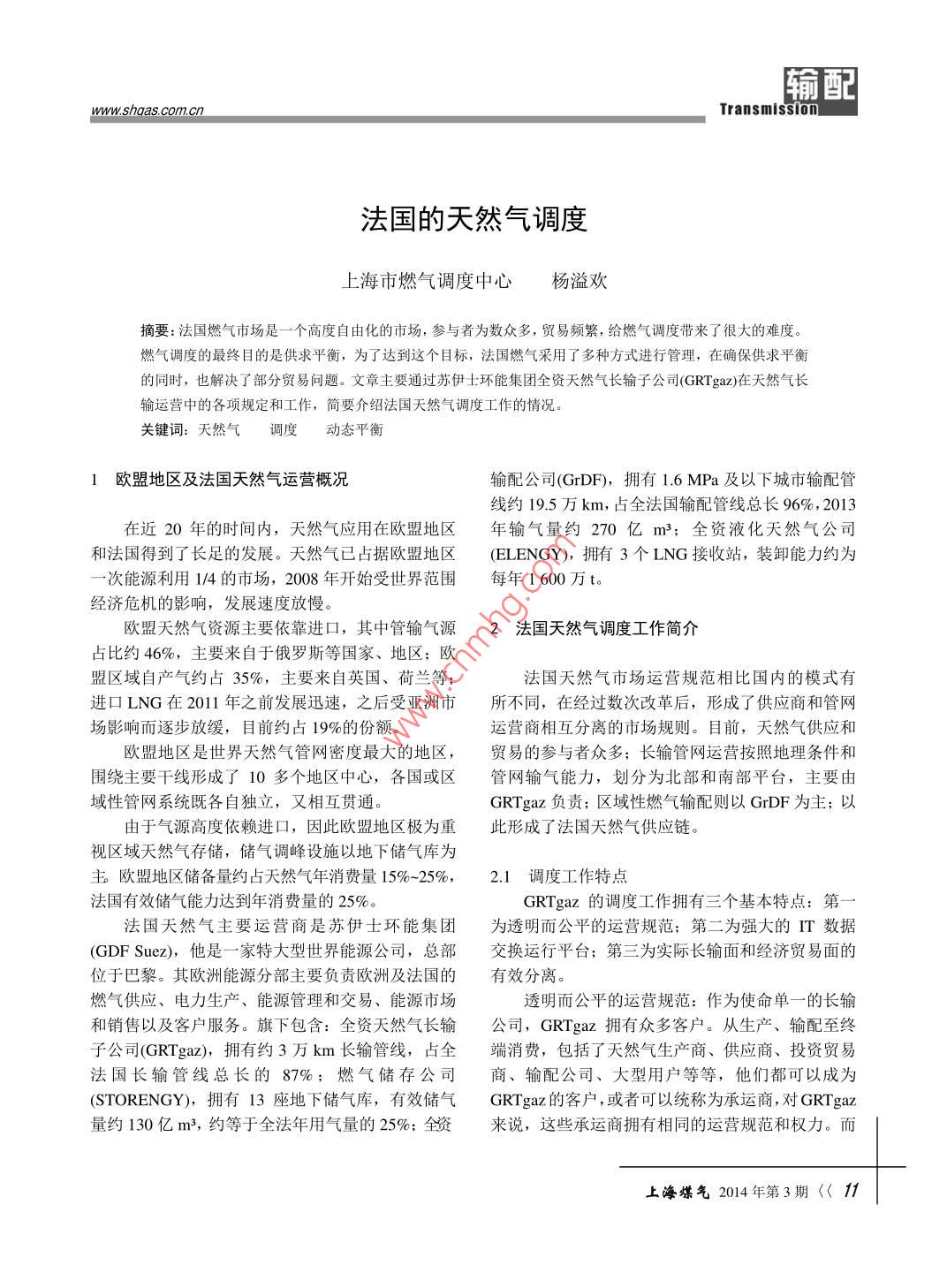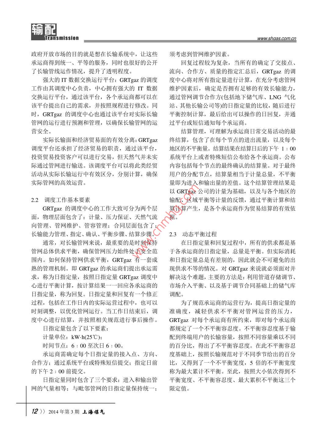 輸配www.shgas. com.cnTransmission法國的天然氣調(diào)度上海市燃氣調(diào)度中心楊溢歡摘要:法國燃氣市場是一一個高度自由化的市場,參與者為數(shù)眾多,貿(mào)易頻繁,給燃氣調(diào)度帶來了很大的難度。燃氣調(diào)度的最終目的是供求平衡,為了達到這個目標,法國燃氣采用了多種方式進行管理,在確保供求平衡的同時,也解決了部分貿(mào)易問題。文章主要通過蘇伊士環(huán)能集團全資天然氣長輸子公司(GRTga)在天然氣長輸運營中的各項規(guī)定和工作,簡要介紹法國天然氣調(diào)度工作的情況。關(guān)鍵詞:天然氣調(diào)度動態(tài)平衡1 歐盟地區(qū)及法國天然氣運營概況輸配公司(GrDF),擁有1.6 MPa及以下城市輸配管線約19.5萬km,占全法國輸配管線總長96%,2013在近20年的時間內(nèi),天然氣應(yīng)用在歐盟地區(qū)年輸氣量約270億m3;全資液化天然氣公司和法國得到了長足的發(fā)展。天然氣已占據(jù)歐盟地區(qū)(ELENGY),擁有3個LNG接收站,裝卸能力約為-次能源利用1/4的市場,2008年開始受世界范圍每年1600萬t。經(jīng)濟危機的影響,發(fā)展速度放慢。歐盟天然氣資源主要依靠進口,其中管輸氣源2法國天然氣調(diào)度 工作簡介占比約46%,主要來自于俄羅斯等國家、地區(qū);歐盟區(qū)域自產(chǎn)氣約占35%,主要來自英國、荷蘭等;法國天然氣市場運營規(guī)范相比國內(nèi)的模式有進口LNG在2011年之前發(fā)展迅速,之后受亞洲市所不同,在經(jīng)過數(shù)次改革后,形成了供應(yīng)商和管網(wǎng)場影響而逐步放緩,目前約占19%的份額。運營商相互分離的市場規(guī)則。目前,天然氣供應(yīng)和歐盟地區(qū)是世界天然氣管網(wǎng)密度最大的地區(qū),貿(mào)易的參與者眾多;長輸管網(wǎng)運營按照地理條件和圍繞主要干線形成了10多個地區(qū)中心,各國或區(qū)管網(wǎng)輸氣能力,劃分為北部和南部平臺,主要由域性管網(wǎng)系統(tǒng)既各自獨立,又相互貫通。GRTgaz負責(zé);區(qū)域性燃氣輸配則以GrDF為主;以由于氣源高度依賴進口,因此歐盟地區(qū)極為重此形成了法國天然氣供應(yīng)鏈。視區(qū)域天然氣存儲,儲氣調(diào)峰設(shè)施以地下儲氣庫為主歐盟地區(qū)儲備量約占天然氣年消費量15%-25%,2.1調(diào)度 工作特點法國有效儲氣能力達到年消費量的25%。GRTgaz的調(diào)度工作擁有三個基本特點:第一法國天然氣主要運營商是蘇伊士環(huán)能集團為透明而公平的運營規(guī)范;第二為強大的IT數(shù)據(jù).(GDF Suez),他是一家特大型世界能源公司,總部交換運行平臺;第三為實際長輸面和經(jīng)濟貿(mào)易面的位于巴黎。其歐洲能源分部主要負責(zé)歐洲及法國的有效分離。燃氣供應(yīng)、電力生產(chǎn)、能源管理和交易、能源市場透明而公平的運營規(guī)范:作為使命單一的長輸和銷售以及客戶服務(wù)。旗下包含:全資天然氣長輸公司,GRTgaz 擁有眾多客戶。從生產(chǎn)、輸配至終子公司(GRTgaz),擁有約3萬km長輸管線,占全端消費,包括了天然氣生產(chǎn)商、供應(yīng)商、投資貿(mào)易法國長輸管線總長的87%;燃氣儲存公司商、輸配公司、大型用戶等等,他們都可以成為(STORENGY),擁有13 座地下儲氣庫,有效儲氣GRTgaz的客戶,或者可以統(tǒng)稱為承運商,對GRTgaz量約130億m3,約等于全法年用氣量的25%;資來說,這些承運商擁有相同的運營規(guī)范和權(quán)力。而上海煤氣2014年第3期<< 11輸配Transmissionwww.shas.com.cn政府開放市場的目的就是想在長輸系統(tǒng)中,讓這些須考慮到管網(wǎng)維護因素。承運商得到統(tǒng)一、 平等的服務(wù),同時也很好的公開回復(fù)過程較為復(fù)雜,當所有的確定了交接點、了長輸管線運作情況,提升了透明程度。流向、合作方、質(zhì)量的指定匯總后,GRTgaz 的調(diào)強大的IT數(shù)據(jù)交換運行平臺: GRTgaz的調(diào)度度中心將對所有指定量進行計算,在充分考慮管網(wǎng)工作由其調(diào)度中心負責(zé),中心擁有強大的IT 數(shù)據(jù)維護因素后,確定是否擁有足夠的有效長輸能力,交換運行平臺,通過該平臺,各個承運商都可以在通過管網(wǎng)調(diào)節(jié)合作方(包括地下儲氣庫、LNG氣化該平臺提出自己的需求,并按照規(guī)程進行修改。同站、其他長輸公司等)的日指定量的比較,隨后進行時,GRTgaz 的調(diào)度中心也通過該平臺對實際長輸平衡控制計算,最后給出可以操作的日回復(fù),并通管網(wǎng)的運行進行預(yù)測和管理,以確保長輸管網(wǎng)的運過平臺或短信通知每個承運商。營安全。結(jié)算管理,可理解為承運商日常交易活動的最實際長輸面和經(jīng)濟貿(mào)易面的有效分離:GRTgaz終結(jié)算,包含了在每個節(jié)點的進出流量,以及每個調(diào)度平臺還承擔(dān)了經(jīng)濟貿(mào)易的職責(zé),通過該平臺,地區(qū)的不平衡量。結(jié)算結(jié)果在結(jié)算日后的下午1 : 00投資貿(mào)易投資客戶可以進行交易,但天然氣并未實系統(tǒng)平臺上或者特殊短信公布給各個承運商。公布際通過管網(wǎng)進行輸送。該調(diào)度平臺可以將此類經(jīng)貿(mào)內(nèi)容包括每個節(jié)點的最終確認的結(jié)算量。對于最終活動從實際長輸運行中有效區(qū)分,分別計算,確保用戶的分配節(jié)點,結(jié)算量相當于計量總量,不平衡實際管網(wǎng)的高效運營。量即為進入和輸出量的差值。這個結(jié)算