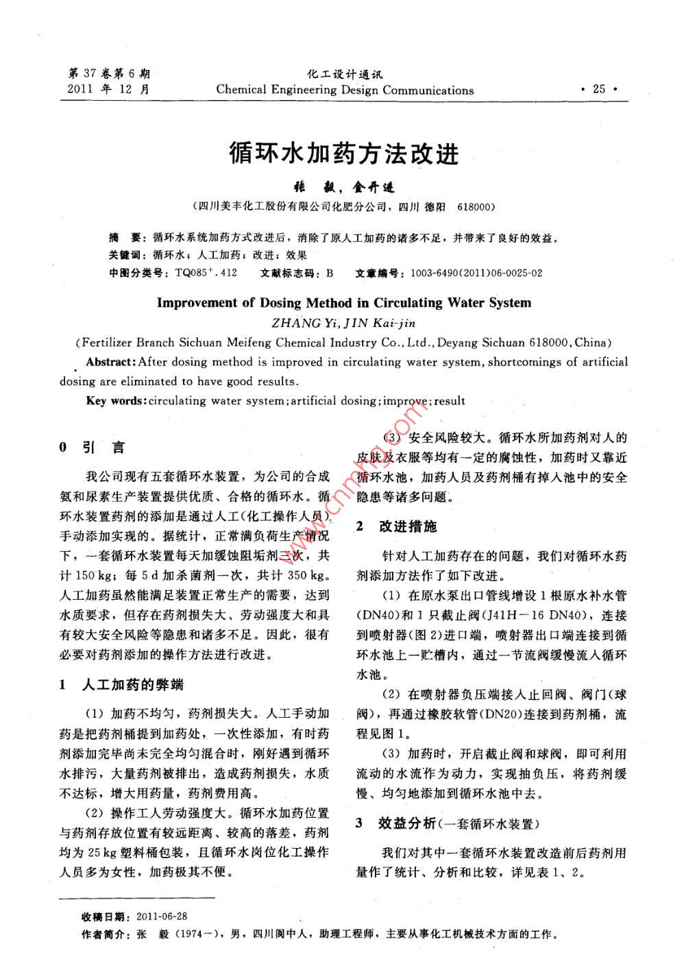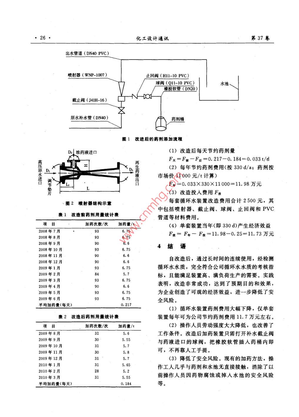 第37卷第6期化工設(shè)計通訊2011年12月Chemical Engineering Design Communications循環(huán)水加藥方法改進稚樅,金開進(四川美豐化工股份有限公司化肥分公司,四川德陽618000摘要:循環(huán)水系統(tǒng)加藥方式改進后,消除了原人工加藥的諸多不足,并帶來了良好的效益。關(guān)鍵詞:循環(huán)水;人工加藥;改進;效果中圖分類號:TQ085+,412文獻標(biāo)志碼:B文章編號:1003-6490(2011)06-0025-02Improvement of Dosing Method in Circulating Water SystemZHANG Yi, JIN Kai-jinFertilizer Branch Sichuan Meifeng Chemical Industry Co, Ltd, Deyang Sichuan 618000, China)Abstract: After dosing method is improved in circulating water system, shortcomings of artificialdosing are eliminated to have good resultsKey words: circulating water system; artificial dosing: improve; result3)安全風(fēng)險較大。循環(huán)水所加藥劑對人的0引言皮膚及衣服等均有一定的腐蝕性,加藥時又靠近我公司現(xiàn)有五套循環(huán)水裝置,為公司的合成循環(huán)水池,加藥人員及藥劑桶有掉入池中的安全氨和尿素生產(chǎn)裝置提供優(yōu)質(zhì)、合格的循環(huán)水。循隱患等諸多問題環(huán)水裝置藥劑的添加是通過人工(化工操作人員)手動添加實現(xiàn)的。據(jù)統(tǒng)計,正常滿負(fù)荷生產(chǎn)情況2改進措施下,一套循環(huán)水裝置每天加緩蝕阻垢劑三次,共針對人工加藥存在的問題,我們對循環(huán)水藥計150kg;每5d加殺菌劑一次,共計350kg。劑添加方法作了如下改進。人工加藥雖然能滿足裝置正常生產(chǎn)的需要,達(dá)到(1)在原水泵出口管線增設(shè)1根原水補水管水質(zhì)要求,但存在藥劑損失大、勞動強度大和具DN40)和1只截止閥(J41H-16DN40),連接有較大安全風(fēng)險等隱患和諸多不足。因此,很有到噴射器(圖2)進口端,噴射器出口端連接到循必要對藥劑添加的操作方法進行改進環(huán)水池上一貯槽內(nèi),通過一節(jié)流閥緩慢流入循環(huán)I人工加藥的弊端水池。(2)在噴射器負(fù)壓端接入止回閥、閥門(球(1)加藥不均勻,藥劑損失大。人工手動加閥),再通過橡膠軟管(DN20)連接到藥劑桶,流藥是把藥劑桶提到加藥處,一次性添加,有時藥程見圖1。劑添加完畢尚未完全均勻混合時,剛好遇到循環(huán)(3)加藥時,開啟截止閥和球閥,即可利用水排污,大量藥劑被排出,造成藥劑損失,水質(zhì)流動的水流作為動力,實現(xiàn)抽負(fù)壓,將藥劑緩不達(dá)標(biāo),增大用藥量,藥劑費用高。慢、均勻地添加到循環(huán)水池中去。(2)操作工人勞動強度大。循環(huán)水加藥位置與藥劑存放位置有較遠(yuǎn)距離、較高的落差,藥劑3效益分析(一套循環(huán)水裝置)均為25kg塑料桶包裝,且循環(huán)水崗位化工操作我們對其中一套循環(huán)水裝置改造前后藥劑用人員多為女性,加藥極其不便。量作了統(tǒng)計、分析和比較,詳見表1、2。收稿日期:2011-06-28作者簡介:張毅(1974-),男,四川闐中人,助理工程師,主要從事化工機械技術(shù)方面的工作。26·化工設(shè)計通訊第37卷出水管道(DN40PVc)噴射器(wNP-1007)止回閥(H11-10PvC)球閥(Q11-10PVC)水池橡膠軟管(DN20)截止閥(J4H-16)原水補水管(DN40)藥劑桶圖1改進后的藥劑添加流程D2濃藥液進口(1)改造后每天節(jié)約藥劑量高F天=F前-F后=0.217-0(2)每年節(jié)約藥劑費用(按330d/a;藥劑按市場價11000元/t計算)F年=0.033×330×11000=11.98萬元(3)改造投入費用F投圖2噴射器結(jié)構(gòu)示意每套循環(huán)水裝置改造費用合計2500元,其中包括噴射器、截止閥、球閥、止回閥和PⅤC表1改造前藥劑用量統(tǒng)計衰管道等材料費用。加藥次數(shù)/次加藥量/t(4)單套裝置當(dāng)年(即330d)產(chǎn)生經(jīng)濟效益年7月2008年8月F數(shù)=F年一F投=11.98-0.25=11.73萬元2008年9月6.62008年10月6.754結(jié)語2008年11月2008年12月6.6自改造后,通過長時間的連續(xù)使用,經(jīng)檢測2009年1月循環(huán)水水質(zhì),完全符合公司循環(huán)水水質(zhì)的考核指09年2月標(biāo),且能滿足裝置高、滿負(fù)荷生產(chǎn)的需要。實踐2009年3月038306.752009年4月表明,改造非常成功,達(dá)到了預(yù)期目的和效果,2009年5月6.75為企業(yè)創(chuàng)造了可觀的經(jīng)濟效益,進一步降低了安2009年6月全風(fēng)險。平均加藥量(每天)0.217(1)循環(huán)水裝置藥劑費用大幅下降,僅單套衰2改造后藥劑用量統(tǒng)計表裝置每年可為公司節(jié)約藥劑費用11.7萬元左右。加藥次數(shù)/次加藥量/t(2)操作人員勞動強度大大降低,也改善了工作條件。改造后加藥裝置只需打開補水截止閥2009年9月5.552009年10月與藥液進口的球閥,把橡膠軟管插人藥桶內(nèi)即2009年11月可,不再靠人工手提。09年12月31(3)降低了安全風(fēng)險?,F(xiàn)有的加藥方法,操2010年1月5.652010年2月作工人幾乎與藥劑和水池?zé)o直接接觸,消除了以2010年3月315.前操作人員因藥物腐蝕或掉入水池的安全風(fēng)險平均加藥量(每天)0.184等