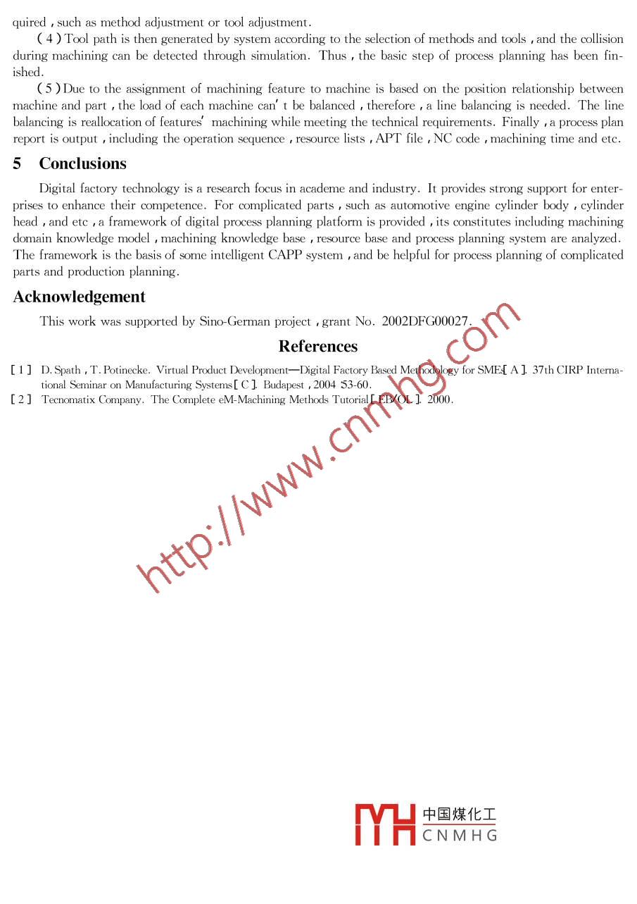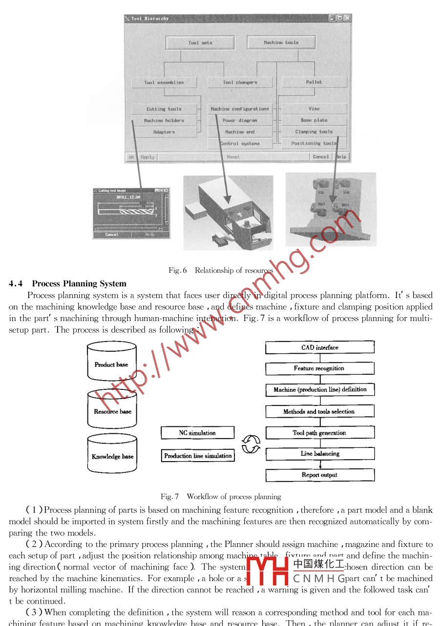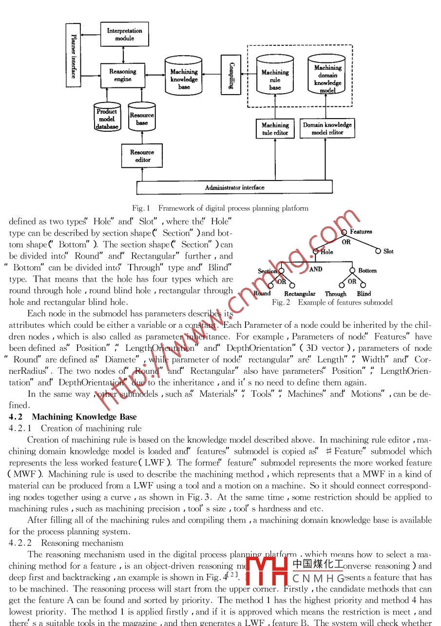 Research on Framework of Digital Process Planning PlatformMA Yumin' , FAN Liuqun2 , ZHU Zhihao' , ZHANG Hao'( 1. CIMS Research Center , Tongji University , Shanghai 200092 , China , E-mail : ymma@ mail. # edu. cn ;2. College of Chinese-German ,Tongji University , Shanghai 200092 , China ;3. Shanghai University of Electric Power , Shanghai 200090 ,China )Abstract : Digital factory technology is a research focus in academe and industry , which is an advanced manu facturing tech-nology that is proposed to bridge product derelopment and manufacturing . For applying digital factory technology in machiningdomain ,a concept of digital process planming and its framework are suggested ,its components including machining domainknowledge model , machining knorwledge base , machining resource base and process planning system are studied. The framerwork ofdigital process planming is of vulue for implementing digital factory technology in machining industry.Key words: digital process planning platform ; machining knorwvledge base ; digital factory1 IntroductionDigital factory technology( DFT ) is an advanced manufacturing technology for bridging the gap betweenthe product development and the manufacturing planning. Fraunhofer institute for industry engineering( IAO)1 defined digital factory as the virtual( three- dimensional and digital )illustration of a real factory , equip-ment and product on the basis of an integrated data model. Now , DF T has been applied in automobile , airplaneindustry , and shortens product delivery time greatly , reduces manufacturing risk and cost. According to relativepaper , study of DFT is mainly focused in assembly domain , while in machining domain there is much less studyon it. Digital process planning platform is just the basis for studying and implementing DFT in machining domain.2 Concept of Digital Process PlanningProcess planning is a bridge between product models and manufacturing planning ,it turns the product' s de-sign information into manufacturing information. The society of manufacturing engineer( SME ) defined processplanning as making systemic decision for a product' s machining method in order to make it economically andcompetently , therefore , product planning is closely related to the resources and machining knowledge that an en-terprise owns. Digital process planning is to plan a product' s process on the digital manufacturing platformwhich means determining product process routes through manufacturing features recognition based on digital ma-chining resources and machining method,including process sequences , resources assignment ( machines , toolsand fixtures ) , cutting parameter' s setting , NC codes' generation ,and etc.3 Framework of Digital Process Planning PlatformDigital process planning platform has close relationship with enterprise. It includes a machining knowledgebase ,a machining resources base and a process planning system , where the machining knowledge base is a rulebase which stores corresponding rules for machining , and the resources base stores the available resources for ma-chining which includes machines , tools and fixtures. The above two parts are the base of digital process planningplatform. It' s based on them that the process planning system can selects proper machining method and tools forparts through a predefined reasoning mechanism , and generates valid process planning documents and NC pro-gram codes. The framework of digital process planning platform is shown in Fig. 1. .4 Constitute of Digital Process Planning Platform4.1 Machining Domain Knowledge Model中國煤化工Process plan is dependent on enterprise. Different enterpri.MYHC N M H Glet ,and the same prod-uct in different enterprise will have different process plan. Due to machining domain' s speciality,the knowledgemodel can be divided into five submodels , which are machining features , tools , part materials , machines andmachine motions. Each submodel can be divided further , and can be expressed in tree form by" OR" andAND" logic. A submodel example of machining features is shown in Fig.2. In this example , features can be.一913一InterpretationnoduleMachiningReasoningdomainengineknowledgerulebasemodelProductResourcedatabaseDomain knowledgetule rditormodel rditoreditorAdministrator interfaceFig. 1 Framework of digital process planning platformdefined as two types' Hole" and' Slot" , where the' Hole"type can be described by section shape( Section" ) and bot-9 Features)R~tom shape(' Bottom" ). The section shape(' Section" ) can8 Hole0 Slotbe divided into" Round” and" Rectangular" further , andBottom”can be divided into' Through" type and' Blind"Section 只AND只Botom .type.' That means that the hole has four types which are6 ORO6OR 8round through hole , round blind hole , rectangular throughRoundRectangular ThroughBlindhole and rectangular blind hole.Fig.2 Example of features submodelEach node in the submodel has parameters describes itsattributes which could be either a variable or a constant. Each Parameter of a node could be inherited by the chil-dren nodes , which is also called as parameter inheritance. For example , Parameters of node” Features" havebeen defined as" Position" " LengthC )rientation" and" DepthC )rientation" ( 3D vector ), parameters of nodeRound”are defined as”Diamete" , while parameter of node' rectangular" are' Length" " Width" and' Cor-nerRadius" . The two nodes of" Round" and" Rectangular" also have parameters" Position" ”LengthOrien-tation" and' DepthC )rientation”due to the inheritance ,and it' s no need to define them again.In the same way , other submodels , such as Material" " Tools" " Machines" and"' Motions" , can be de-fined.4.2 Machining Knowledge Base4.2.1 Creation of machining ruleCreation of machining rule is based on the knowledge model described above. In machining rule editor , ma-chining domain knowledge model is loaded and' features" submodel is copied as”井 Feature" submodel whichrepresents the