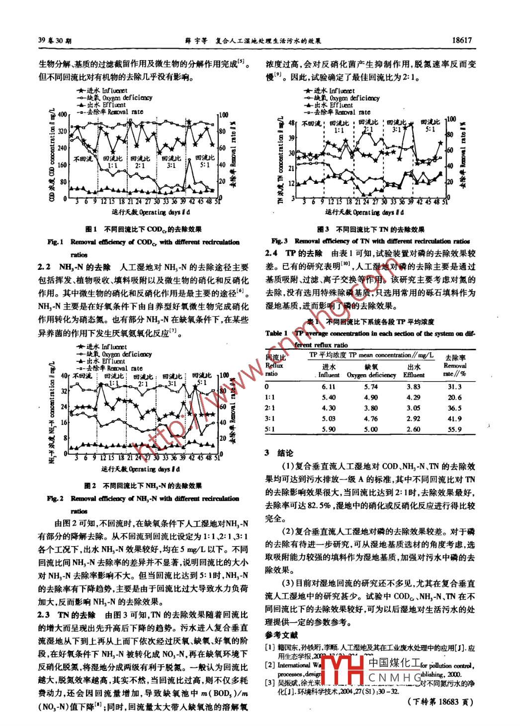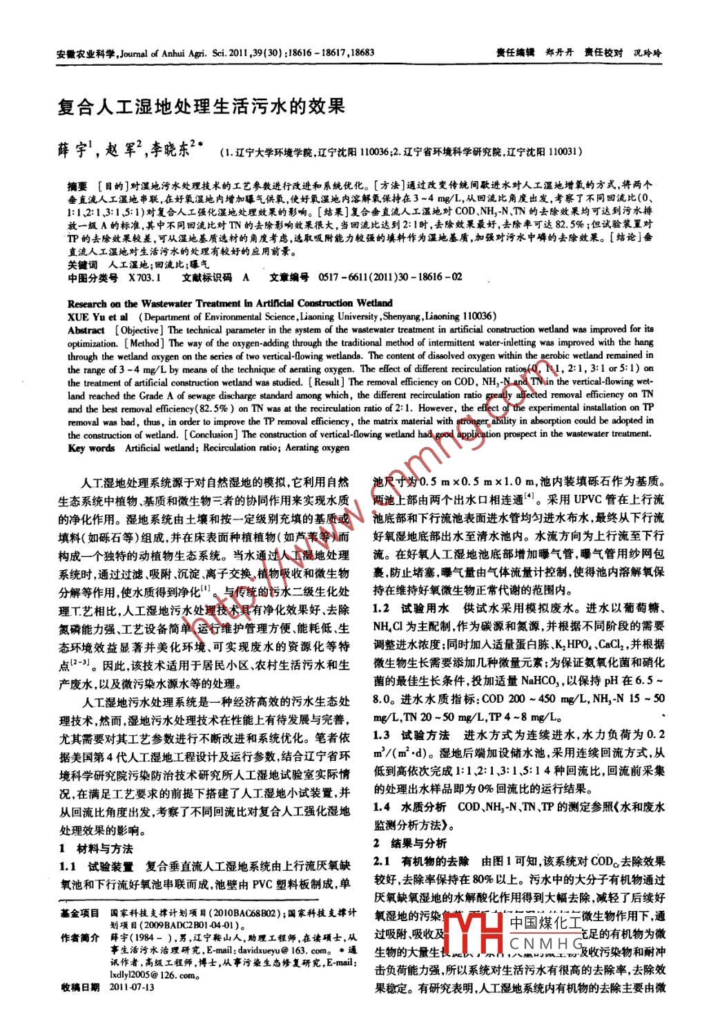 安徽農(nóng)業(yè)科學(xué),Jourmal of Anhui Agni. Sci. 2011 ,39(30) :18616 - 18617 ,18683責(zé)任編輯鄭丹丹責(zé)任校對(duì)況玲玲復(fù)合人工濕地處理生活污水的效果薛宇',趙軍”,李曉東”*(1.遼寧大學(xué)環(huán)境學(xué)院,遼寧沈陽(yáng)10036;2.遼寧省環(huán)境科學(xué)研究院,遼寧沈陽(yáng)10031)摘要[目的]對(duì)濕地污水處理技術(shù)的工藝參教進(jìn)行改進(jìn)和系統(tǒng)優(yōu)化。[方法]通過(guò)改變傳統(tǒng)間歇進(jìn)水對(duì)人工濕地增氧的方式,將兩個(gè)垂直流人工濕地串聯(lián),在好氧濕地內(nèi)增加曝氣供氧,使好氧濕地內(nèi)溶解氧保持在3 ~4 mg/L,從回流比角度出發(fā),考察了不同回流比(0、1:1、2:13:1.5:1)對(duì)復(fù)合人工強(qiáng)化濕地處理效果的影響。[結(jié)果]復(fù)合垂直流人工濕地對(duì)COD、NH,-N、TN的去除效果均可達(dá)到污水排放一級(jí)A的標(biāo)準(zhǔn),其中不同回流比對(duì)TN的去除影響效果很大,當(dāng)回流比達(dá)到2:1時(shí),去除效果最好,去除率可達(dá)82. 5% ;但試驗(yàn)裝置對(duì)IP的去除效果較差,可從濕地基質(zhì)選材的角度考慮,選取吸附能力較強(qiáng)的填料作為濕地基質(zhì),加強(qiáng)對(duì)污水中磷的去除效果。[結(jié)論]垂直流人工濕地對(duì)生活污水的處理有較好的應(yīng)用前景。關(guān)鍵詞人工濕地;回流比;曝氣中圖分類號(hào)X703.1 文獻(xiàn)標(biāo)識(shí)碼 A文章編號(hào)0517 66112011)30- 18616 -02Research on the Wastewater Treatment in Artifncial Construction WetlandXUE Yuet al (Department of Environmental Science ,Liaoning University ,Shenyang,Liaoning 110036)Abstract [ Objective] The technical parameter in the system of the wastewalter treatmnent in arificial construction wetland was improved for itsoptimization. [ Method] The way of the oxygen- adding through the traditional method of intermittent waterinltting was improved with the hangthrough the wetland oxygen on the series of two vrical-lowing wetlands. The content of dissolved oxygen within the aerobic wetland remained inthe range of 3 -4 mg/L by means of the technique of aerating oxygen. The elect of difterent recirculation ratios(0, 1:1,2:1,3:1 or5:1) onthe treatment of arifcial construction wetland was studied. [Result ] The removal eficiency on COD, NH,-N and TN in the verical-Aowing wet-and the best removal eficiency(82. 5%) on TN was at the recirculation ratio of 2:1. However, the efect of the experimental installation on TPremoval was bad, thus , in order to improve the TP removal eficiency, the matrix material with stronger ability in absorption could be adopted inthe construction of wetland. [ Conclusion ] The construction of vertical-lowing wetland had good application prospect in the wastewater treatment.Key words Artificia wetland; Recirculation ratio; Aerating oxygen人工濕地處理系統(tǒng)源于對(duì)自然濕地的模擬,它利用自然池尺寸為0.5 mx0.5 mx1.0 m,池內(nèi)裝填礫石作為基質(zhì)。生態(tài)系統(tǒng)中植物、基質(zhì)和微生物=者的協(xié)同作用來(lái)實(shí)現(xiàn)水質(zhì)兩池上部由兩個(gè)出水口相連通“1。采用UPVC管在上行流的凈化作用。濕地系統(tǒng)由土壤和按-定級(jí)別充填的基質(zhì)或池底部和下行流池表面進(jìn)水管均勻進(jìn)水布水,最終從下行流填料(如礫石等)組成,并在床表面種植植物(如蘆葦?shù)?而好氧濕地底部出水至清水池內(nèi)。水流方向?yàn)樯闲辛髦料滦袠?gòu)成-一個(gè)獨(dú)特的動(dòng)植物生態(tài)系統(tǒng)。當(dāng)水通過(guò)人工濕地處理流。在好氧人工濕地池底部增加曝氣管,曝氣管用紗網(wǎng)包系統(tǒng)時(shí),通過(guò)過(guò)濾、吸附、沉淀、離子交換、植物吸收和微生物裹,防止堵塞,曝氣量由氣體流量計(jì)控制,使得池內(nèi)溶解氧保分解等作用,使水質(zhì)得到凈化"。與傳統(tǒng)的污水二級(jí)生化處持在維持好氧微生物正常代謝的范圍內(nèi)。理T.藝相比,人工濕地污水處理技術(shù)具有凈化效果好、去除1.2試驗(yàn)用水供試水采用模擬廢水。進(jìn)水以葡萄糖、氮磷能力強(qiáng)、工藝設(shè)備簡(jiǎn)單、運(yùn)行維護(hù)管理方便能耗低、生NH,Cl為主配制,作為碳源和氮源,并根據(jù)不同階段的需要態(tài)環(huán)境效益顯著并美化環(huán)境、可實(shí)現(xiàn)廢水的資源化等特調(diào)整進(jìn)水濃度;同時(shí)加入適量蛋白胨K2 HPO,、CeCl, ,并根據(jù)點(diǎn)(2-3)。因此,該技術(shù)適用于居民小區(qū)、農(nóng)村生活污水和生微生物生長(zhǎng)需要添加幾種微量元素;為保證氨氧化菌和硝化產(chǎn)廢水,以及微污染水源水等的處理。菌的最佳生長(zhǎng)條件,投加適量NaHCO, ,以保持pH在6.5~人工濕地污水處理系統(tǒng)是一種經(jīng)濟(jì)高效的污水生態(tài)處8.0。進(jìn)水水質(zhì)指標(biāo):COD 200 ~450 mg/L,NH3-N 15 ~50理技術(shù),然而,濕地污水處理技術(shù)在性能上有待發(fā)展與完善,mg/L,TN 20~50 mg/L,IP4~8 mg/L。尤其需要對(duì)其工藝參數(shù)進(jìn)行不斷改進(jìn)和系統(tǒng)優(yōu)化。筆者依1.3試驗(yàn)方法進(jìn)水方式為連續(xù)進(jìn)水,水力 負(fù)荷為0.2據(jù)美國(guó)第4代人工濕地工程設(shè)計(jì)及運(yùn)行參數(shù),結(jié)合遼寧省環(huán)m/(m2●d)。濕地后端加設(shè)儲(chǔ)水池,采用連續(xù)回流方式,從境科學(xué)研究院污染防治技術(shù)研究所人工濕地試驗(yàn)室實(shí)際情低到高依次完成1:1 2:1 3:1、5:1 4種回流比,回流前采集