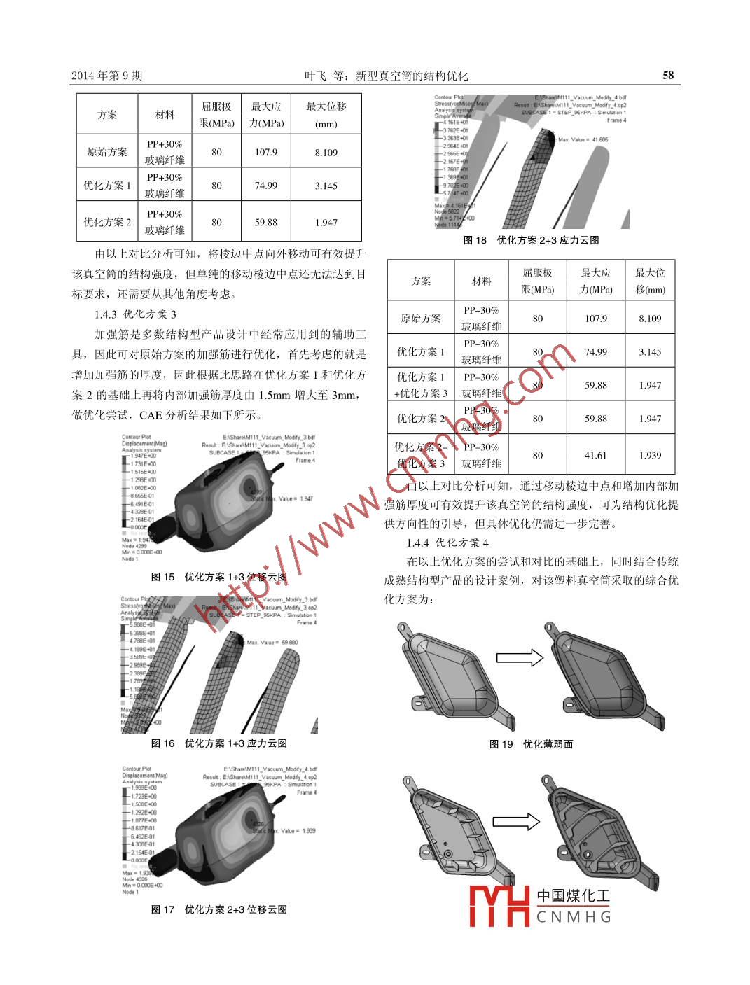 汽車實(shí)用技術(shù)20 13年第9期設(shè)計(jì)研究AUTOMOBILE APPLIED TECHNOLOGY13 NO.9新型真空筒的結(jié)構(gòu)優(yōu)化葉飛(安徽江淮汽車股份有限公司技術(shù)中心,安徽合肥230601)摘要:本文詳細(xì)地介紹了某車型不規(guī)則塑料真空簡(jiǎn)的設(shè)計(jì)過(guò)程,并以實(shí)車驗(yàn)證為依據(jù),證明了理論模型結(jié)構(gòu)優(yōu)化的有效性,為儲(chǔ)能產(chǎn)品的設(shè)計(jì)提供一定的參考和指導(dǎo)作用。關(guān)鍵詞:塑料;真空筒;結(jié)構(gòu)優(yōu)化;儲(chǔ)能中圖分類號(hào): U463.5文獻(xiàn)標(biāo)識(shí)碼: A文章編號(hào): 1671-7988(2014)09- -55- -05New vacuum tube structure optimizationYe Fei(Anhui Jianghuai Automobile Co., Ltd. Technology Center, Anhui Hefei 230601 )A bstract: This paper firstly presents the design process of one plastic vacuum tube, according to vehicle test, proves thevalidity of the theoretical model structure optimization and provides certain reference and guidance for the design of theenergy storage products.Keywords: plastic; vacuum tube; structure optimization; energy storageCLC NO.: U463.5 Document Code: A Article ID: 1671-7988(2014)09-55-05總成。然而不規(guī)則的真空簡(jiǎn)則難以通過(guò)傳統(tǒng)的鈑金沖壓工藝引言實(shí)現(xiàn),而目前常見(jiàn)的儲(chǔ)能產(chǎn)品主要為兩種材質(zhì),一種是金屬真空簡(jiǎn)是液壓制動(dòng)系統(tǒng)中用來(lái)儲(chǔ)存真空的儲(chǔ)能裝置,也材質(zhì),一種是塑料材質(zhì)。而如何設(shè)計(jì)一款結(jié)構(gòu)可靠的不規(guī)則有稱之為真空罐。其儲(chǔ)存的真空可在車輛行車制動(dòng)時(shí),為真塑料真空筒成為擺在設(shè)計(jì)人員面前的-一個(gè)難題, 下 文則將通空助力器提供足夠的真空以滿足頻繁制動(dòng)的需求。真空簡(jiǎn)多過(guò)某一-輕型客 車塑料真空簡(jiǎn)的開發(fā)案例,介紹塑料材質(zhì)真空見(jiàn)于輕型商用車上,而很少應(yīng)用到乘用車上。其主要原因是:筒從結(jié)構(gòu)設(shè)計(jì)到強(qiáng)度優(yōu)化以及試驗(yàn)驗(yàn)證的開發(fā)過(guò)程,為同類-般乘用車的總質(zhì)量較小,制動(dòng)時(shí)所需的真空較少,即使是型產(chǎn)品的開發(fā)提供指導(dǎo)性建議。頻繁的制動(dòng),真空泵的抽取速度基本都能滿足要求,而商用1、某車型塑料真空筒的結(jié)構(gòu)設(shè)計(jì)車的總質(zhì)量較大,其制動(dòng)時(shí)所需的真空相對(duì)較多,頻繁制動(dòng)時(shí),若不匹配真空簡(jiǎn),真空泵的抽取速度難以跟上消耗速度,1.1 概述會(huì)降低真空助力器助力的助力效果,尤其在山路下坡時(shí),會(huì)在某輕型客車開發(fā)過(guò)程中,由于發(fā)動(dòng)機(jī)較大,導(dǎo)致發(fā)艙因?yàn)檎噾T性較大,產(chǎn)生安全隱患。內(nèi)空間狹小,難以布置下一個(gè)6L大小的真空筒,即使勉強(qiáng)隨著越來(lái)越多的新車型的開發(fā),發(fā)艙的布置會(huì)不盡相同。布置下, 也會(huì)影響發(fā)艙散熱,產(chǎn)生熱害風(fēng)險(xiǎn),所以需要將真當(dāng)某些車型的發(fā)艙空間難以存放一-個(gè) 規(guī)則的固定容積的真空空簡(jiǎn) 移至發(fā)艙外布置。最終經(jīng)過(guò)綜合考慮決定將真空簡(jiǎn)布置簡(jiǎn)時(shí),將真空簡(jiǎn)設(shè)計(jì)成不規(guī)則形狀會(huì)成為-一種需求。目前傳在右前輪包下, 由于布置位置特殊,真空簡(jiǎn)形狀無(wú)法設(shè)計(jì)成統(tǒng)的真空簡(jiǎn)都是通過(guò)鈑金沖壓生成上下兩個(gè)簡(jiǎn)體,然后將上傳統(tǒng)的圓簡(jiǎn)狀或方 盒狀,造型相對(duì)奇特;而受造型影響,傳下簡(jiǎn)體以及附屬的支架等焊接在一起,如此就行成了真空簡(jiǎn)統(tǒng)的鈑 金沖壓件工藝難以實(shí)現(xiàn),因此該真空簡(jiǎn)最終采用了塑料材質(zhì)。上下簡(jiǎn)中國(guó)煤化工簡(jiǎn)體通過(guò)熱板作者簡(jiǎn)介:葉飛,就職于安徽江淮汽車股份有限公司技術(shù)中心。焊接成一體,如1MHCNMHG2014年第9期葉飛等:新型真空筒的結(jié)構(gòu)優(yōu)化1.2原始方案存在凹陷現(xiàn)象,并在三臺(tái)可靠性樣車行駛至12000KM 左右均出現(xiàn)了凹陷面開裂漏氣故障。針對(duì)此問(wèn)題,通過(guò)其他結(jié)構(gòu)0型產(chǎn)品的設(shè)計(jì)引入CAE結(jié)構(gòu)分析工具對(duì)原始方案進(jìn)行理論模型的強(qiáng)度校核,并對(duì)市場(chǎng)上某成熟鐵質(zhì)真空簡(jiǎn)進(jìn)行對(duì)比,設(shè)定合理的性能目標(biāo),對(duì)該塑料真空簡(jiǎn)進(jìn)行結(jié)構(gòu)優(yōu)化,消除不合理的設(shè)計(jì)因素。1.3性能目標(biāo)設(shè)定該塑料真空簡(jiǎn)具體材質(zhì)為PP+30%玻璃纖維,彈性模量為5400MPa,泊松比為0.43,屈服極限為120MPa(彎 曲)和80MPa(拉伸),真空簡(jiǎn)所受負(fù)壓為95KPa。對(duì)原始方案進(jìn)行圖1真空筒上簡(jiǎn)體CAE分析,分析結(jié)果如圖5和圖6所示;對(duì)成熟鐵質(zhì)真空簡(jiǎn)進(jìn)行分析,分析結(jié)果如圖7和圖8所示。Contour PlotE:SCRATCHIM111 Vacum bdfDisplacemeR(ae) E:\SCRATCHM111 Vacum. op21-81092年月ASE 1= STEP_ 95KPA : Simulation 1L -7 208E+00-6.307E+005. 406+00_3 604E+- 2703E+00Slatig Msx. Value= 8.109圖2真空筒下簡(jiǎn)體Node 4072Min=000E+00圖5原始方 案位移云圖Contouplol.. E\SCRATCHM111_Vacum btfStress(vonRaSEHMEPlSCRATCHM111-Yacum-pp2Simple Averag4SE1-STEP_95K f Simrame. -9.589E+01E圖3真空筒總成StaticMax. YlUez 407.873Max=1079E+0270_可Node 21圖
