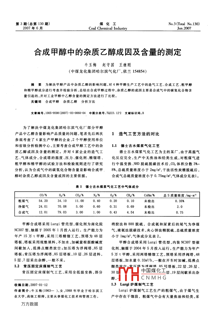 第3期(總第130期)煤化工No.3(Total No 130)2007年6月Coal Chemical IndustryJun.2007合成甲醇中的雜質(zhì)乙醇成因及含量的測定牛玉梅趙守國王繼剛(中煤龍化集團哈爾濱氣化廠,依蘭154854摘要為解決甲醇產(chǎn)品中雜質(zhì)乙醇的影響問題,對4種甲醇生產(chǎn)工藝中的造氣工藝、合成工藝、粗甲醇和精甲醇成分進行考查并檢驗分析,總結(jié)出合成甲醇過程中,雜質(zhì)乙醇的成因主要是合成氣中的碳氫化合物含量引起的,并對工業(yè)甲醇中乙醇含量的測定方法進行了比較關(guān)鍵詞合成甲醇雜質(zhì)乙醇分析方法文章編號:1005-9598(2007)-03-0060-04中圖分類號:TQ223.122文獻標(biāo)識碼:B為了解決中煤龍化集團哈爾濱氣化廠部分甲醇產(chǎn)品中乙醇含量影響產(chǎn)品質(zhì)量的問題,筆者先后兩次1造氣工藝方法的對比參觀考查了4家生產(chǎn)甲醇的企業(yè),2個甲醇使用單位和省級分析檢測中心,主要考查合成甲醇工藝中的雜1.1德士古水煤漿氣化工藝質(zhì)乙醇成因及含量的測定。并對4家企業(yè)的造氣工德士古水煤漿氣化工藝為主的某廠,由于高溫氣藝、氣體成分,合成塔的溫度、壓力、催化劑、精餾塔、化反應(yīng)完全,生產(chǎn)中無焦油和烴類生成,對粗煤氣進粗甲醇和精甲醇的試驗方法和檢驗規(guī)則進行了研究行中溫變換、NHD脫硫脫碳技術(shù)后,CO2體積分數(shù)3%分析,認為合成氣中的碳氫化合物含量是影響合成甲.8%,總硫質(zhì)量濃度小于2mg/m3,干法活性炭精脫硫后醇時雜質(zhì)乙醇成因及含量成因的主要依據(jù)合成氣總硫質(zhì)量濃度小于0.75mg/m3,氣體成分見表1。表1德士古水煤漿氣化工藝中氣體成分c0%B%c0%%0%0/%ca/%總S質(zhì)量濃度/m粗煤氣11.000.200.10未檢出凈煤氣70.085.000.69未檢出合成氣123.001.000.434.54未檢出甲醇合成塔采用 Lurgi管殼型,催化劑為南化院栲膠法和888脫硫,合成氨和尿素后的尾氣為凈煤NC307型,觸媒于2005年1月投入運行。生產(chǎn)能力為氣,液氨法脫碳技術(shù),夾心餅法精脫硫,總硫質(zhì)量濃度年產(chǎn)15萬t甲醇,采用三塔精餾工藝,預(yù)塔為48層小于1mg/m3,氣體成分見表2。塔板,塔板采用規(guī)整填料,不加水,加堿量根據(jù)酸堿度甲醇合成塔采用 Lurgi管殼型,內(nèi)裝NC307型催間歇加入,低沸點醚類放空;加壓塔為浮閥塔,85層化劑,觸媒于2004年5月投入運行。生產(chǎn)能力為年產(chǎn)塔板;常壓塔為浮閥塔,85層塔板,10層、26層進料,5萬t甲醇,采用兩塔精餾工藝,預(yù)塔采用浮閥塔,45層、7層采出雜醇,一般不采。層塔板,加水量0.33m3/h,一般在開車時加堿,低沸點12常壓固定床煤制氣工藝醚類放空·賞壓塔為淫闞塔5層塔板,22層、26層、常壓固定床煤制氣工藝,采用全低溫變換,部分30中國煤化工層、19層間歇采出雜醇CNMHG收稿日期:2007-01-1213 Lurgi爐煤制氣工藝作者簡介:牛玉梅(1963-),女,1988年畢業(yè)于哈爾濱工Lurgi爐煤制氣工藝生產(chǎn)的粗煤氣,由于煤氣生業(yè)大學(xué),高級工程師,主要從事煤化工技術(shù)和管理工作。產(chǎn)中存在干餾段,粗煤氣中會有大量焦油和烴類,采2007年6月牛玉梅等:合成甲醇中的雜質(zhì)乙醇成因及含量的測定表2常壓固定床煤制氣工藝中氣體成分/%0/%CH/%CnHm/%總S質(zhì)量濃度/mg凈煤氣67.43.6未檢出合成氣l1.77,50.2未檢出用低溫變換制氫、低溫甲醇洗脫硫脫碳、CO2體積分數(shù)性炭精脫硫,合成氣總硫質(zhì)量濃度小于0.06mg/m3,氣控制在3%左右,總S質(zhì)量濃度小于2.3mg/m3,干法活體成分見表3。表3 Lurgi爐煤制氣工藝中氣體成分C0/%CnHm/%總S質(zhì)量濃度/mg·m3粗煤氣38.80.40.15%凈煤氣61.516.5合成氣7.93.00.6醇合成塔共2套裝置,采用林德均溫型工藝,業(yè)分析變化不大,只是合成溫度較末期低,各種氣NC307型合成催化劑,觸媒于2005年6月投入第2體參數(shù)一樣。套裝置運行。生產(chǎn)能力為年產(chǎn)14萬t甲醇,采用兩14以天然氣為原料的兩段法制氣工藝塔精餾工藝,預(yù)塔48層塔板,常壓塔為85層塔板以天然氣為原料的兩段法制氣工藝,需空分裝置有高沸點雜醇間歇采出,高沸點甲醇不加工直接外提供純氧在二段爐中進行部分氧化反應(yīng),將CH4轉(zhuǎn)化售。2006年5月13日第1套裝置更換新觸媒成部分C0、CO2和氫氣,后續(xù)原料氣加工簡單。S含量NC307,新觸媒同前末期生產(chǎn)的粗甲醇、精甲醇的工低,一般不測,氣體成分見表4表4以天然氣為原料的兩段法制氣工藝中氣體成分H2/%CO2/%CH4/%CnHm/%總S質(zhì)量濃度/mg·m3合成氣21.4669.137.760.020.021.38未檢出未檢出合成塔采用 Lurgi管殼型,南化院NC307型甲醇以上合成氣體成分含量看出,一般合成氣中的CH含合成催化劑,觸媒于2004年4月投入運行。目前生產(chǎn)量高時,Cnhm含量也高,而且烯烴水化后就是醇。筆能力10萬t/a,采用三塔精餾工藝。者認為,甲醇中的雜質(zhì)乙醇主要是由合成氣中的碳氫4種工藝的甲醇成分分析見表5。化合物C2不飽和烴造成的,另外,甲醇中雜質(zhì)產(chǎn)生的2分析評價原因還有:催化劑末期和溫度升高的影響,循環(huán)氣中未分離的甲醇氣體再參與反應(yīng)產(chǎn)生的雜質(zhì)。以上4種合成甲醇所需的氣體成分達到HC0=2.0-3.0,工藝裝填的催化劑都為NC37,有些在催化劑末期有就可以滿足合成甲醇的氣體技術(shù)指標(biāo)要求,對比表雜質(zhì)升高的現(xiàn)象,但筆者對2006年5月中旬的同1~表4,可以看出, Lurgi法所生產(chǎn)的合成氣中的合成塔,在更換觸媒前后的粗甲醇