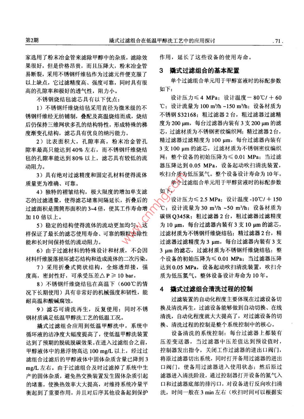 2014年6月潔凈與空調技術CCC第2期撬式過濾組合在低溫甲醇洗工藝中的應用探討中國電子工程設計院劉書傾王春軍北京石油化工工程公司劉敬摘要氣體凈化中的低溫甲醇洗工藝是近年來脫除酸性氣體普遍釆用的一種凈化工藝。該工藝以其技術成熟、溶劑廉價易得、凈化度高、選擇性好等特性,被廣泛應用于合成氨、合成醇類等行業(yè)。甲醇循環(huán)液的純凈度是保證低溫甲醇洗裝置的長周期穩(wěn)定運行的重要前提。撬式過濾組合被應用于低溫甲醇洗工藝,能有效確保甲醇液的潔凈度。關鍵詞低溫甲醇洗;凈化氣體;撬式過濾組合;超濾;壓差監(jiān)測;液位控制Application Discussion of Skidded Filter Combination in Rectisol ProcessLiu Shuqing, Wang Chunjun and Liu JingAbstract The rectisol process in gas purification is a common purification process used in the recent years for the removalof acidic gases. The process is used widely in the synthesis of ammonia, alcohol and other industries due to the fact that thetechnology is mature and has many good characteristics such as the high purification rate, good selectivity, easily acquiredand cheap solvent. The purity of the methanol circulating fluid is an important factor for a stable and long period operationof the rectisol equipment. In this paper, Skidded Filter combination can be used in rectisol process to effectively ensure thepurity of the methanolKeywords Rectisol; Gas purification; Skidded Filter combination; Ultrafiltration; Pressure monitoring: Liquid level control0引言要問題,高度自動化的撬式過濾組合以其凈化程度低溫甲醇洗是在上世紀50年代初德國林德公司高、過濾效率好、占地空間小的特性,成為解決這與魯奇公司聯合開發(fā)的一種氣體凈化工藝,是目前難題的最佳裝置。脫硫脫碳凈化裝置中運行成本較低的一種。該工藝為保證低溫甲醇洗裝置的長周期穩(wěn)定運行,利用低溫甲醇在低溫(-9℃~-64℃)、高壓條件下就要保證甲醇循環(huán)液的純凈,不受污染,而且要極易溶解酸性氣體的良好特性,用以對原料氣進行保證低溫甲醇洗工藝中低溫甲醇的溫度達到預設計脫硫和脫碳。隨著近幾年國內煤化工、石油化工行低溫,以保證甲醇液體的低溫特性。循環(huán)甲醇在業(yè)的蓬勃發(fā)展,該工藝以其工藝技術成熟、溶劑廉吸收了原料氣中的水、二氧化碳、硫化氫、氨等價易得、凈化度高、選擇性好,被廣泛應用于國內的同時,還帶入一些硫化亞鐵、羰基鐵、羰基外合成氨、合成醇類及其他羰基合成、城市煤氣、工鎳、水、氨及銨鹽結晶硫化鐵、煤粉之類的固體業(yè)制氫和天然氣脫硫等氣體凈化裝置中。由于溶液粉塵雜質,雖經后序分離裝置再生分離,但一些的循環(huán)再生利用,溶劑的凈化成為該工藝中的一個雜質會積存在循環(huán)液中,并隨循環(huán)液循環(huán)流動進入重要環(huán)節(jié),提高凈化質量和凈化效率是這環(huán)節(jié)的重熱交換器、甲醇循環(huán)泵等裝置或設備中,沉積并降低熱交換效率,甚至堵塞換熱器、管道,增加劉書傾,女,1971年12月生,大學本科,工程師甲醇循環(huán)的阻力,同時積存于循環(huán)液中的雜質會使100101北京市朝陽區(qū)小營路25號房地置業(yè)大廈90815810825082甲醇濃度提高,品質下降,影響吸收效果,使整E-mail: liushuqing 2@ ceedi.個系統冷量不足;循環(huán)液體中的雜質有可能沉積收稿日期:2014-03-031在液位變送器的取壓管中,造成儀器測量不準確,潔凈與空調技術CC&AC2014同時可能堵塞玻璃管液位計,造成液位指示不μm的不銹鋼纖維燒結氈濾芯,當粗過濾器中由于準;另外雜質顆粒極可能進入運轉泵機械密封的密攔截的固體雜質積聚增多,附著于濾芯的外表面,封面,造成機械密封泄漏,從而降低泵機械密封的形成濾餅,引起壓力增加,通過控制模塊開啟備用使用壽命,增加系統的運行成本;循環(huán)甲醇液體的粗過濾器,保證系統連續(xù)運行,同時撬塊控制模塊固體雜質還會堵塞塔板和填料,從而導致氣液相偏自動打開氮氣反吹閥,利用中低壓氮氣吹掃切換下流,增加塔內阻力,影響吸收和解吸效果:循環(huán)甲的粗過濾器,將附著于濾芯表面的雜質反吹清除掉,醇液體中的高濃度雜質還會造成循環(huán)溶液在塔內起清洗后的粗過濾器進入備用狀態(tài);粗過濾器攔截下泡,產生泛液現象,導致出塔氣中帶液,裝置被迫了大部分的固體雜質,那些比較細微的雜質隨著甲降低負荷運行,從而降低了生產線的產量。高效率、醇液體流入精過濾器,精過濾器中安裝了過濾精度高精度地凈化循環(huán)液體中的固體雜質是解決問題的為3μm的不銹鋼纖維燒結氈濾芯,它對液體中雜有效方法。撬式過濾組合應時而生,成為解決這一質進一步攔截,對3pm及以上的雜質攔截率達到問題的首選。9999%,精濾后液體中的雜質對整個系統的運行1撬式過濾組合的構成已基本沒有影響。精濾后的甲醇液流出過濾組合,進入甲醇洗下一單元。隨著時間的增長,精過濾器撬式過濾組合屬于超濾范疇,它是一個組合的濾芯表面隨著雜質的沉積附著,精過濾器內的壓體,可以是一個過濾組合單元,也可以是兩個或多降增大,控制系統由于壓差到達設定值,啟用備用個過濾組合單元體組合而成,過濾組合單元體的數精過濾器,將原工作的精過濾器從過濾系統中切出,量由系統中的設計流量來確定。撬式過濾組合單元同時清洗系統自動對其進行清洗的主要結構是:粗過濾器2臺(1開1備),每臺在低溫甲醇洗工藝