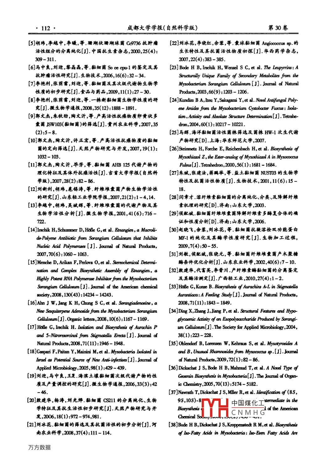 第30卷第2期Vol 30 No. 22011年6月成都大學(xué)學(xué)報(自然科學(xué)版Journal of Chengdu University ( Natural Science Edition)Jun.2011文章編號:1004-5422(2011)02-0108-06黏細菌生物活性物質(zhì)的研究劉冰花(成都大學(xué)醫(yī)護學(xué)院,四川成都610091)摘饔:從6個方面,即黏細菌產(chǎn)生的生物活性物質(zhì)的功能、黏細菌生物活性物質(zhì)的結(jié)構(gòu)、黏細菌生物活性物質(zhì)的生物合成、黏細菌活性物質(zhì)的基因、提高黏細菌活性物質(zhì)產(chǎn)量的方法、黏細菌活性物質(zhì)的化學(xué)合成,分析了自199年至今各國在黏細菌生物活性物質(zhì)方面的研究情況認為黏細菌可以產(chǎn)生豐害的結(jié)構(gòu)奇特的新的生物活性物質(zhì),同時,黏細菌產(chǎn)活性物質(zhì)的基因研究以及黏細菌在農(nóng)業(yè)方面的應(yīng)用工作還有待加強關(guān)鍵詞:原核生物;黏細菌;生物活性物質(zhì)中圖分類號:Q99文獻標識碼:A0引言它們分別為 Avermectin ala Avermectin a2a、 Avermectin bla、 Avermectin B2a麥角甾7,22雙烯3,5,6-三黏細菌是最高等的原核生物可滑動具有多細醇(賽勒維甾醇)李健胡瑋等…3從黏細菌Corl胞行為屬于好氧的革蘭氏陰性桿菌.由于黏細菌 occus coralloides Cc9736菌株的發(fā)酵產(chǎn)物中分離到生長緩慢難于分離純化對其活性物質(zhì)的研究相對種具有抑瘤活性的生物活性物質(zhì)CC;馬中良、李滯后近年來黏細菌作為可產(chǎn)生豐富多樣生物活性艷利等6從纖維堆囊菌菌株 so oe cpu-l中均發(fā)現(xiàn)物質(zhì)的微生物類群逐漸受到科研工作者的重視迄了對多種腫瘤細胞有良好抑制作用的SCC;郭文杰今為止研究人員已經(jīng)發(fā)現(xiàn)了黏細菌產(chǎn)生的幾百種等9-1從菌株 Polyangiumⅶ vitellinum JsW10B3和另外6結(jié)構(gòu)不同的化合物,這些化合物中許多是以前從未株黏細菌菌株中也發(fā)現(xiàn)了活性較強的抗腫瘤物質(zhì)發(fā)現(xiàn)過的本文對1999年至今科研人員在黏細菌生此外,從相關(guān)的報道中可以看到,堆囊菌屬和黏物活性物質(zhì)方面的研究工作進行綜述,以期對黏細球菌屬產(chǎn)生抗癌活性物質(zhì)的幾率較高,研究人員在菌進一步的研究工作有所幫助研究中發(fā)現(xiàn)纖維堆囊菌子實體不但對于腫瘤細胞如1黏細菌生物活性物質(zhì)功能研究肝癌Be7402株系具有很強的體外殺傷活性,其子實體提取物灌胃對小鼠無毒性反應(yīng),并能夠明顯抑相關(guān)研究發(fā)現(xiàn),一株黏細菌可以產(chǎn)生多種不同制移植瘤S180的生長.同時,研究人員還發(fā)現(xiàn)同功能的生物活性物質(zhì),并且黏細菌產(chǎn)生的生物活性株黏細菌的代謝產(chǎn)物可以有多個組分具有抗腫瘤物質(zhì)結(jié)構(gòu)奇特,表現(xiàn)出菌株特異性,而不是種或?qū)偬鼗钚?但這些代謝產(chǎn)物在在抗腫瘤機制上可能具有異性顯著的多樣性1),這些研究說明,黏細菌在抗腫瘤1.1黏細菌抗腫瘤活性研究藥物的開發(fā)方面具有極大的潛力近10多年來,關(guān)于黏細菌中發(fā)現(xiàn)抗腫瘤活性物1.2黏細菌抗細菌活性研究質(zhì)的報道很多,例如:Ahn等從黏細菌 Myxococcus黏細菌可以產(chǎn)生多種結(jié)構(gòu)獨特的抗細菌抗生flvs的次級代謝物中分離得到 myxothiazol和一種素例如rchk等叫從纖維堆囊菌So∞750和So新物質(zhì)KR-025,并發(fā)現(xiàn) myxothiazol和KR025對人類c045菌株的發(fā)酵液中發(fā)現(xiàn) etmangien,研究證明其腫瘤細胞均有明顯抑制作用;施曉瓊等從黏細菌是一種新的能有效抑制C的大環(huán)內(nèi)酯類抗生素,菌株 Myxococcus xanthus095B06中分離到5種明顯同時, etmangnen還可以抑制細菌和病毒的核酸聚合抑制腫瘤細胞SMC72ld的生長的活性物質(zhì),酶活性;Mas"煤化工el045菌株收稿日期:2011-01-25CNMHG甚金項目:四川省教育廳青年基金(08d092)、成都大學(xué)??萍及l(fā)展基金(00X6)資助項目作者簡介:劉冰花(1900-),女,碩士,副教授,從事微生物生物制藥研究第2期劉冰花:黏細菌生物活性物質(zhì)的研究·109中又發(fā)現(xiàn)了 etnangen的類似物 methyl ester etang霉的生長均有明顯的抑制作用化合物4不但能中iem,其對G*的抑制作用更強,抑制RNA聚合酶的活度抑制稻瘟霉的生長,并且能引起菌絲體末端膨大,性與 tangen相當(dāng),但對DNA聚合酶不起作用,化合物4578和9對枯草芽孢桿菌有明顯抑制作methyl ester etnangien比 etange更容易從纖維堆囊用菌的發(fā)酵液中獲得,并且在中性條件下結(jié)構(gòu)比et此外,He等m發(fā)現(xiàn)黏細菌 Stigmatella erectananmen穩(wěn)定.Pde32菌株產(chǎn)生一種新的抗真菌物質(zhì) arachin P(1另外,Ah等從土壤中分離到纖維堆囊菌R,2S,3R)-1- arachin A); Steinmetz等從MxKM1003,并從該菌的發(fā)酵液中發(fā)現(xiàn)了 Sorangiade- coccus fulvus菌株中發(fā)現(xiàn)了抗真菌物質(zhì) myxothiazolnosine,其是一種新的倍半萜烯腺苷,實驗證明,SrZ;朱斌等發(fā)現(xiàn)黏細菌NUSm03菌株可以產(chǎn)生一種angiadenosine即可抑制G,又可抑制G;Hoe等強烈抑制黑曲霉的抗生素.發(fā)現(xiàn)黏細菌 Stigmatella erecta Pd e32菌株可以產(chǎn)生抗1.4黏細菌產(chǎn)生酶活性研究細菌物質(zhì)5- nitrpresorcinol(5-硝基間苯二酚).相關(guān)研究發(fā)現(xiàn),黏細菌次級代謝物中不但有豐此外,還有許多在黏細菌中發(fā)現(xiàn)抗細菌活性物富的抗生素,而且有豐富的酶資源,如纖維素酶、木質(zhì)的相關(guān)報道例如, Gaspari等評