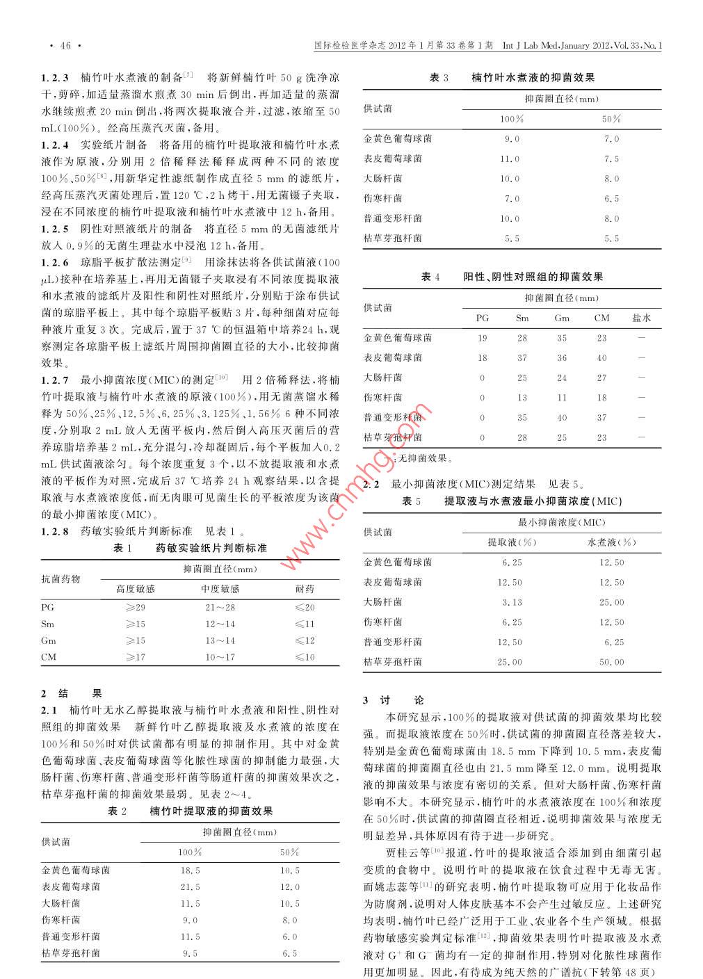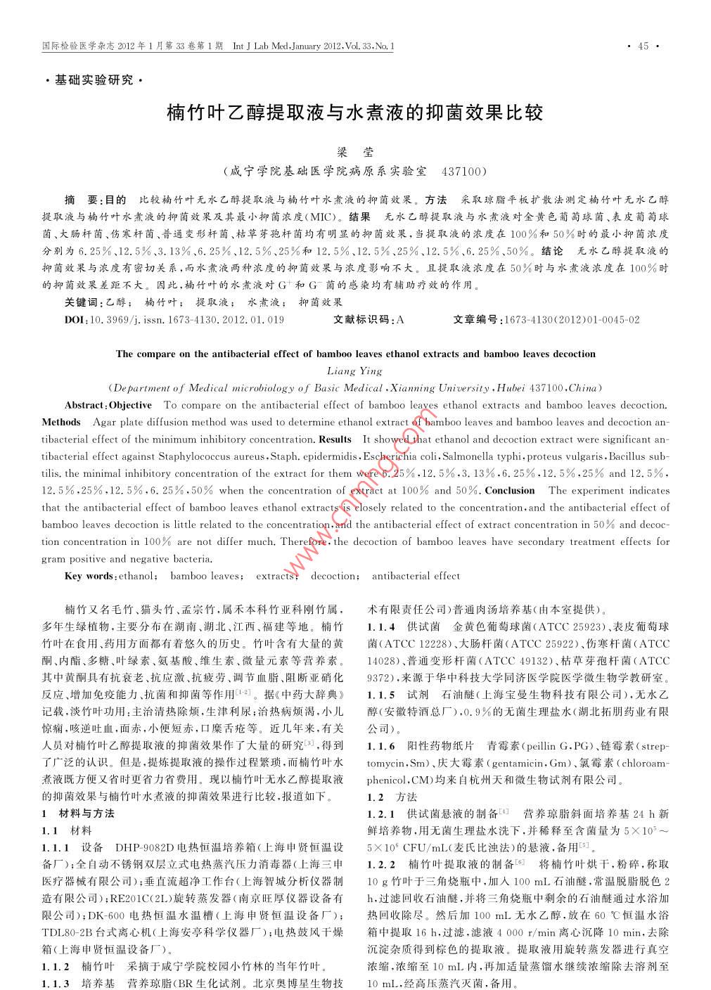囯際檢驗(yàn)醫(yī)學(xué)雜志2012年1月第33卷第1期 Int J Lab Med, January2012,vol.33,No.145基礎(chǔ)實(shí)驗(yàn)研究楠竹葉乙醇提取液與水煮液的抑菌效果比較梁瑩(威寧學(xué)院基礎(chǔ)醫(yī)學(xué)院病原系實(shí)驗(yàn)室437100)摘要:目的比較楠竹葉無水乙醇提取液與楠竹葉水煮液的抑菌效果。方法采取瓊脂平板擴(kuò)散法測(cè)定楠竹葉無水乙醇提取液與楠竹葉水煮液的抑菌效果及其最小抑菌濃度(MC)。結(jié)果無水♂醇提取液與水煮液對(duì)金黃色萄球菌、表皮葡萄球菌、大腸杄菌、傷寒杄菌、普通變形杄菌、枯草芽孢杄菌均有明顯的抑菌效果,當(dāng)提取液的濃度在100%和50%時(shí)的最小抑菌濃度分別為6.25%、12.5%、3.13%、6.25%、12.5%、25%和12.5%、12.5%、25%、12.5%、6.25%、50%。結(jié)論無水乙醇提取液的抑菌效果與濃度有密切關(guān)系,而水煮液兩種濃度的抑菌效與濃度影響不大。且提取液濃度在50%時(shí)與水煮液濃度在100%時(shí)的抑菌效果差距不大。因此,楠竹葉的水煮液對(duì)G和G菌的感染均有輔助療效的作用。關(guān)鍵詞:乙醇;楠竹葉;提取液;水煮液;抑菌效果OI:10.3969/j.issn.1673-4130.2012.01.019文獻(xiàn)標(biāo)識(shí)碼:A文章編號(hào):1673-4130(2012)01-0045-0The compare on the antibacterial effect of bamboo leaves ethanol extracts and bamboo leaves decoctionLiang ying( De partment of Medical microbiology of Basic Medical Xianning University, Hubei 437100, ChinaAbstract: Objective To compare on the antibacterial effect of bamboo leaves ethanol extracts and bamboo leaves decoction.Methods Agar plate diffusion method was used to determine ethanol extract of bamboo leaves and bamboo leaves and decoction antibacterial effect of the minimum inhibitory concentration. Results It showed that ethanol and decoction extract were significant antibacterial effect against Staphylococcus aureus Staph. epidermidis, Escherichia coli, Salmonella typhi, proteus vulgaris, Bacillus sub-tilis. the minimal inhibitory concentration of the extract for them were 6. 25%.12.5%.3. 13%.6 25%.12 5%, 25% and 12.5%12.5%.25%.12.5%,6. 25%,50% when the concentration of extract at 100% and 50%. Conclusion The experiment indicatesthat the antibacterial effect of bamboo leaves ethanol extracts is closely related to the concentration, and the antibacterial effect ofbamboo leaves decoction is little related to the concentration, and the antibacterial effect of extract concentration in 50% and decoc-tion concentration in 100% are not differ much. Therefore the decoction of bamboo leaves have secondary treatment effects forgram positive and negative bacteriaKey words: ethanol; bamboo leaves: extracts; decoction; antibacterial effect楠竹又名毛竹、貓頭竹、孟宗竹,屬禾本科竹亞科剛竹屬,術(shù)有限責(zé)任公司)普通肉湯培養(yǎng)基(由本室提供)。多年生綠植物,主要分布在湖南、湖北、江西、福建等地。楠竹1.1.↓供試菌金黃色葡萄球菌(ATCC25923)、表皮葡萄球竹葉在食用、藥用方面都有著悠久的歷史。竹葉含有大量的黃菌(ATCC12228)、大腸桿菌(ATCC25922)、傷寒桿菌(ATCC酮、內(nèi)酯、多糖、葉綠素、氨基酸、維生素、微量元素等營(yíng)養(yǎng)素。14028)、普通變形桿菌(ATCC49132)、枯草芽孢桿菌(ATCC其中黃酮具有抗衰老、抗應(yīng)激、抗疲勞、調(diào)節(jié)血脂、阻斷亞硝化9372),來源于華中科技大學(xué)同濟(jì)醫(yī)學(xué)院醫(yī)學(xué)微生物學(xué)教研室反應(yīng)、增加免疫能力、抗菌和抑菌等作用3。據(jù)《中藥大辭典》1.1.5試劑石油醚(上海寶曼生物科技有限公司).無水乙記載,淡竹葉功用:主治清熱除煩,生津利尿;治熱病煩渴,小兒醇(安徽特酒總廠),0.9%的無菌生理鹽水(湖北拓朋藥業(yè)有限驚癇,咳逆吐血,面赤,小便短赤,口糜舌瘡等。近幾年來,有關(guān)公司)人員對(duì)楠竹葉乙醇提取液的抑菌效果作了大量的研究,得到1.1.6陽性藥物紙片青霉素( peillin G,PG)、鏈霉素( strep了廣泛的認(rèn)識(shí)。但是,提煉提取液的操作過程繁瑣,而楠竹葉水 tomycin,Sm)、慶大霉素( gentamicin,Gim)、氯霉素( chloran-煮液既方便又省時(shí)更省力省費(fèi)用?,F(xiàn)以楠竹葉無水乙醇提取液 phenicol,CM)均來自杭州天和微生物試劑有限公司。的抑菌效果與楠竹葉水煮液的抑菌效果進(jìn)行比較,報(bào)道如下1.2方法1材料與方法1.2.1供試菌懸液的制備營(yíng)養(yǎng)瓊脂斜面培養(yǎng)基24h新1.1材料鮮培養(yǎng)物,用無菌生理鹽水洗下,并稀釋至含菌量為5×10°1.1.1設(shè)備DHP9082D電熱恒溫培養(yǎng)箱(上海申賢恒溫設(shè)5×106CFU/mL(麥?zhǔn)媳葷岱?的懸液,備用備廠);全自動(dòng)不銹鋼雙層立式電熱蒸汽壓力消毒器(上海三申1.2.2楠竹葉提取液的制備6將楠竹葉烘干,粉碎,稱取醫(yī)療器楲有限公司);垂直流超凈工作臺(tái)(上海智城分析儀器制10g竹葉于三角燒瓶中,加人100mL石油醚,常溫脫脂脫色2造有限公司);RE201C(2L)旋轉(zhuǎn)蒸發(fā)器(南京旺厚儀器設(shè)備有h,過濾回收石油醚,并將三角燒瓶中剩余的石油醚通過水浴加限公司);DK-600電熱恒溫水溫槽(上海申賢恒溫設(shè)備廠);熱回收除盡。然后加100mL無水乙醇,放在60℃恒溫水浴TDI802B臺(tái)式離心機(jī)(上海安亭科學(xué)儀器廠);電熱鼓風(fēng)干燥箱中提取16h,過濾,濾液4000r/min離心沉降10min,去除箱(上海申賢恒溫設(shè)備廠)沉淀雜質(zhì)得到棕色的提取液。提取液用旋轉(zhuǎn)蒸發(fā)器進(jìn)行真空1.1.2楠竹葉采摘于咸寧學(xué)院校園小竹林的當(dāng)年竹葉。濃縮,濃縮至10mL內(n