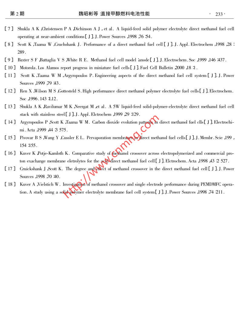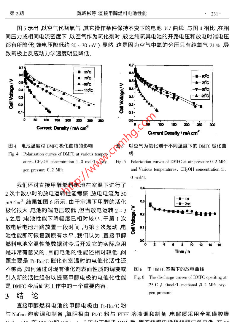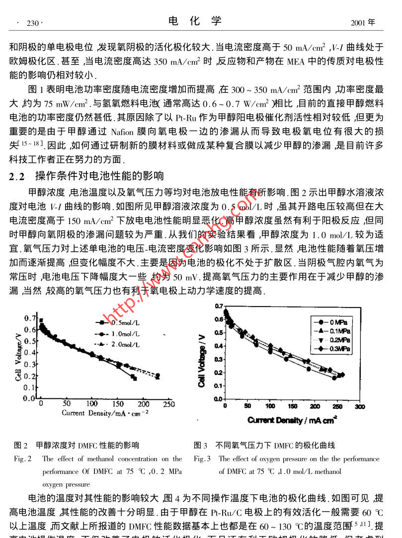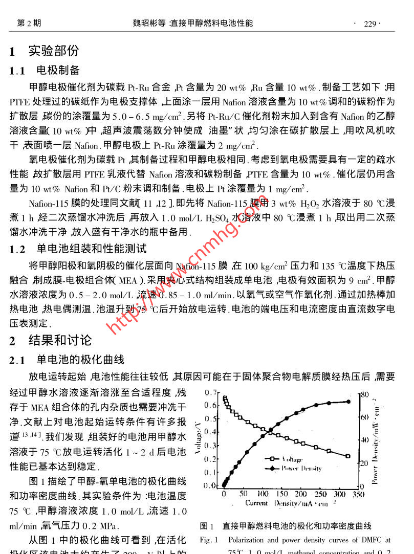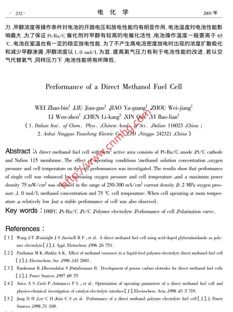 第7卷第2期電化學(xué)Vol.7 No.22001年5月ELECTROCHEMISTRYMay 2001文章編號:1006-3471( 2001 )02-0228-06直接甲醇燃料電池性能魏昭彬1* ,劉建國'喬亞光1周衛(wèi)江',李文震'陳利康2,辛勤,衣寶廉1( 1.中國科學(xué)院大連化學(xué)物理研究所遼寧大連116023 ;2.安徽省寧國天成電器有限公司安徽寧國242321 )摘要:采用商品P-Ru/C和Pr/C催化劑制備成甲醇陽極和氧陰極,Nafion-115為固體電解質(zhì)膜,組裝成面積為9 cm?單電池研究了電池在放電運轉(zhuǎn)過程中各種操作條件如溫度氧氣壓力,甲醇濃度等對電池性能的影響并考察了電池室溫放電性能隨時間的變化.發(fā)現(xiàn)增加電池的溫度和氧氣壓力均可明顯提高電池性能在合適的甲醇濃度和氧氣壓力下電池在室溫具有-定的穩(wěn)定放電性能.關(guān)鍵詞:直 接甲醇燃料電池;P-Ru/C ,PVC聚合物電解質(zhì)電池性能極化曲線中圖分類號: TM9 11文獻標(biāo)識碼: A直接甲醇燃料電池( DMFC )是以廉價的液體甲醇為燃料,與 氫氧燃料電池相比,可以省去.各種輔助的制氫和凈化系統(tǒng),因而特別適合于用作可移動電源,如移動電話筆記本電腦和電動車電源等.目前許多國家都投入巨大的人力物力開展深入的基礎(chǔ)研究和實際應(yīng)用探索1-9].據(jù)最新文獻報道[10],美國Los Alamos國家實驗室和Motorola 實驗室聯(lián)合研制成功一種微型DMFC電池用于蜂窩電話其能量密度是傳統(tǒng)充電電池的10倍. Manhattan通過改進電池結(jié)構(gòu),使電池的比能量較之鋰離子電池提高了2倍,預(yù)期不久的將來要達到30倍于2001年商品化.從目前世界各國研究的進展判斷,直接甲醇燃料電池將以比人們想象快得多的速度進入實際應(yīng)用.對直接甲醇燃料電池性能起決定作用的因素是電極催化劑和質(zhì)子交換膜.現(xiàn)今廣泛采用的甲醇電極催化劑主要是碳載Pt-Ru雙組元合金,氧電極催化劑為碳載Pt ,固體電解質(zhì)是Nafion全氟磺酸膜.由于燃料電池的工藝過程較為復(fù)雜研究中發(fā)現(xiàn)甲醇陽極和氧陰極的制備工藝膜-電極組合體(MEA)的熱壓成型技術(shù)以及放電運轉(zhuǎn)條件等均對電池性能有重要作用.本文較全面地研究了直接甲醇燃料電池的電極制備工藝以及在放電運轉(zhuǎn)過程中操作溫度氧氣壓力和甲醇濃度等因素的影響并初步考察室溫下電池放電性能為直接甲醇燃料電池常溫下的應(yīng)用提供有用數(shù)據(jù).收稿日期2000-05-02修訂日期2000-08-29女通訊聯(lián)系人基金項目本項研究由安徽省寧國天成電器有限公司提供經(jīng)費資助第2期魏昭彬等直接甲醇燃料電池性能229.1實驗部份1.1 電極制備甲醇電極催化劑為碳載Pt-Ru合金,Pt 含量為20wt% ,Ru含量10 wt% .制備工藝如下:用PTFE處理過的碳紙作為電極支撐體上面涂-層用Nafion溶液含量為10wt%調(diào)和的碳粉作為擴散層碳份的涂覆量為5.0- 6.5 mg/cem2 .另將Pt-Ru/C催化劑粉末加入到含有Nafion的乙醇溶液含量( 10 wt% )中超聲波震蕩數(shù)分鐘使成油墨"狀均勻涂在碳擴散層上,用吹風(fēng)機吹干表面噴-層Nafion.甲醇電極上P't-Ru 涂覆量為2 mg/cm2.氧電極催化劑為碳載Pt其制備過程和甲醇電極相同.考慮到氧電極需要具有-定的疏水性能故擴散層用PTFE乳液代替Nafion 溶液和碳粉制備,PTFE 含量為10 wt% .催化層仍用含量為10 wt% Nafion 和P/C粉末調(diào)和制備.電極上Pt涂覆量為1 mg/cen2 .Nafion- 115膜的處理同文獻11 ,12]即先將Nafion-115膜用3 wt% H2O2水溶液于80 C浸煮1 h經(jīng)二次蒸餾水沖洗后再放入1.0 mol/L H2SO4水溶液中80 C浸煮1 h取出用二次蒸餾水沖洗干凈放入盛有干凈水的瓶中備用1.2單 電池組裝和性能測試將甲醇陽極和氧陰極的催化層面向Nafion-115 膜在100 kg/cm2壓力和135 C溫度下熱壓融合制成膜-電極組合體( MEA ).采用夾心式結(jié)構(gòu)組裝成單電池電極有效面積為9 cm2 .甲醇水溶液濃度為0.5-2.0 mol/L流速0.85- 1.0 ml/min.以氧氣或空氣作氧化劑.通過加熱棒加熱電池?zé)犭娕紲y溫池溫升到75 C后開始放電運轉(zhuǎn).電池的端電壓和電流密度由直流數(shù)字電壓表測定.2結(jié)果和討論2.1 單電池的極化曲線放電運轉(zhuǎn)起始電池性能往往較低其原因可能在于固體聚合物電解質(zhì)膜經(jīng)熱壓后需要經(jīng)過甲醇水溶液逐漸溶漲至合適程度,殘.7180。存于MEA組合體的孔內(nèi)雜質(zhì)也需要沖冼干0.6,氣凈.文獻上對電池起始運轉(zhuǎn)條件有許多報- 0.5道13,14].我們發(fā)現(xiàn)組裝好的電池用甲醇水家0.44)旨0.3溶液于75 C放電運轉(zhuǎn)活化1~2 d后電池二0.2一0-↓ihupge性能已基本達到穩(wěn)定-◆Irwer Duity0.圖1描繪了甲醇_氧單電池的極化曲線和功率密度曲線.其實驗條件為:電池溫度05010015020025030X) 351Current Du:nsity/mA ●41175 C ,甲醇溶液濃度1.0 mol/L流速1.0ml/min氧氣壓力0.2 MPa.圖1直接甲 醇燃料電池的極化和功率密度曲線從圖1中的極化曲線可看到,在活化Fig. 1Polarization and power density curves of DMFC at極化區(qū)該電池大約產(chǎn)生了200 mV以上的759C ,1.0 mol/L methanol concentration and 0. 2電位損失.經(jīng)用參比電極分別測量了陽極MPa oxygen pressure230 .電化學(xué)2001年和陰極的單電極電位發(fā)現(xiàn)氧陰極的活化極化較大.當(dāng)電流密度高于50 mA/em2 ,V_I 曲線處于歐姆極化區(qū).甚至,當(dāng) 電流密度高達350 mA/cm2時反應(yīng)物和產(chǎn)物在MEA中的傳質(zhì)對電極性能的影響仍相對較小.圖1表明電池功率密度隨電流密度增加而