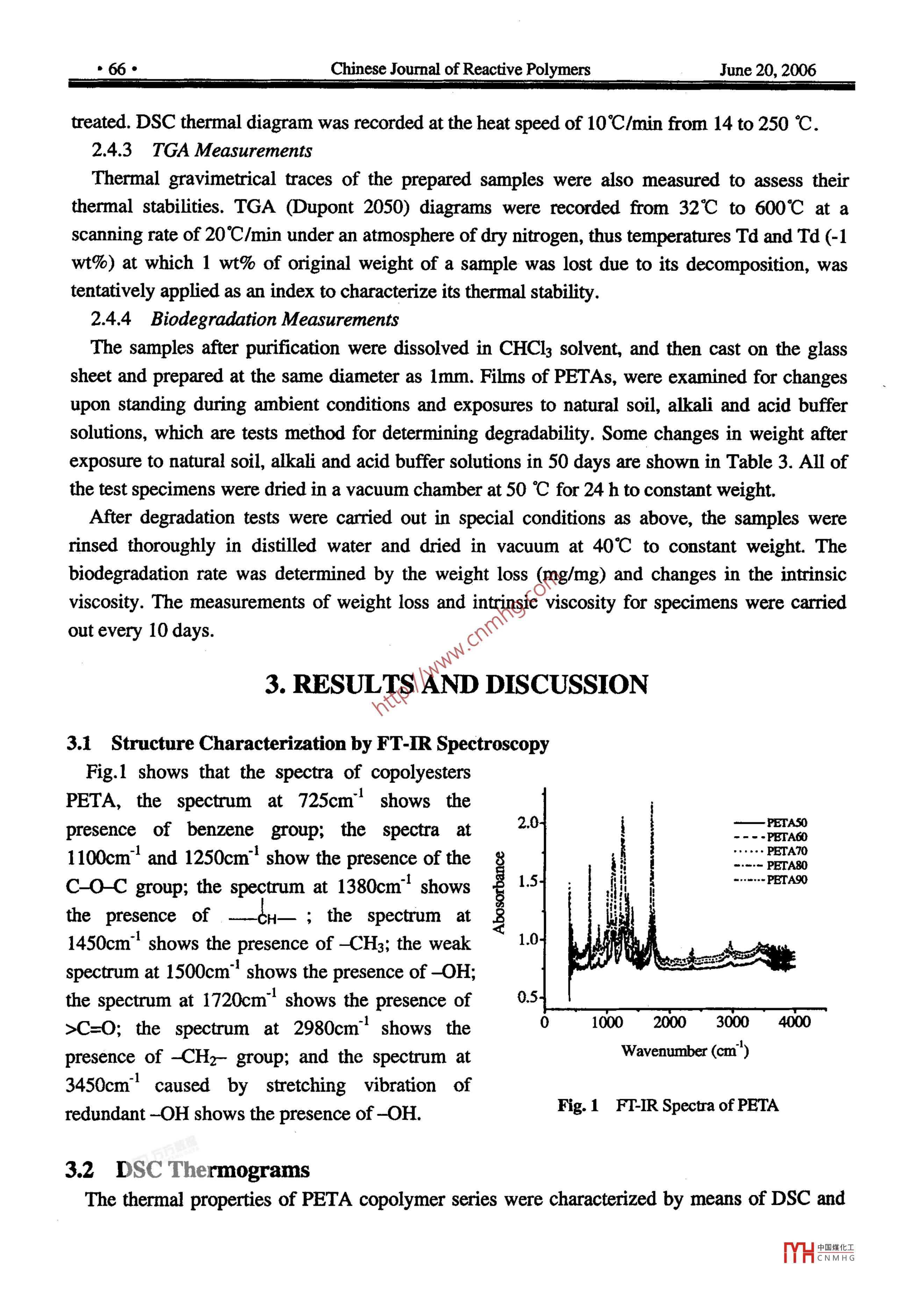 Vol.15 No.1Chinese Journal of Reactive Polymers●65●work was called PETA90.)HHO一.CH2-CH2-OH + HOOC-CH- -CHg===二HO-- CH2 CH2-0- c一 -CH- CHg+ H2OEGALEScheme 1 Esterification of EG and LAQH QtCatHOOC-COOH+ HO- CH2 -CH2-0-- -C- -CH- -0H + H2C-- -CH2Polycondensation.E CHsTPAO一CO-CO- -0- -CH2--CH2- 0-CHgPETAScheme 2 Synthesis of Random Copolyesters of Poly(lactic acid-co-glycol terephthalic acid)The same process was applied for the synthesis of the copolyesters PETA80, the ratio of nEG :nLA was 1.5: 1, and nTPA : nLA was 80 : 20. For the PETA70, the ratio of nEG: nLA was 1.5 :1, and nTPA : nLA was 70: 30. For the PETA60, the ratio of nEG: nLA was 1.5: 1, and nTPA :nLA was60 : 40. And for the PETA50, the ratio of nEG : nLA was 1.5: 1, and nTPA : nLA was .50: 50.2.3 Purification of PETAThe reaction product 5g was dissolved in 100ml~ 150 CHCl3 and filtrated, then precipitated in3 times of cold methanol. The precipitated PETA was isolated and dried at 50°C in vacuum. Soin this work the final purification product were chosen as samples in all the course ofmeasurements.2.4 M [easurements2.4.1 FT-IR SpectroscopyThe samples after incubation were studied by FT-IR spectroscopy and the FT-IR spectra wererecorded on a NICO- - -LET170S IR apparatus.2.4.2 DSC MeasurementsHeat histories of samples were removed and they were kept at ambient temperature for days toallow their crystallization to approach the equilibrium state prior to the DSC characterization.DSC measurements of copolyesters were carried out on a Pyrisl differential scanning calorimeterequipped with a liquid nitrogen cooling system under a nitrogen flow at a rate of 50 ml/min. Thesamples of about 8mg~ 10mg were encapsulated in the DSC aluminum pans and then thermallyIYHCNMHG