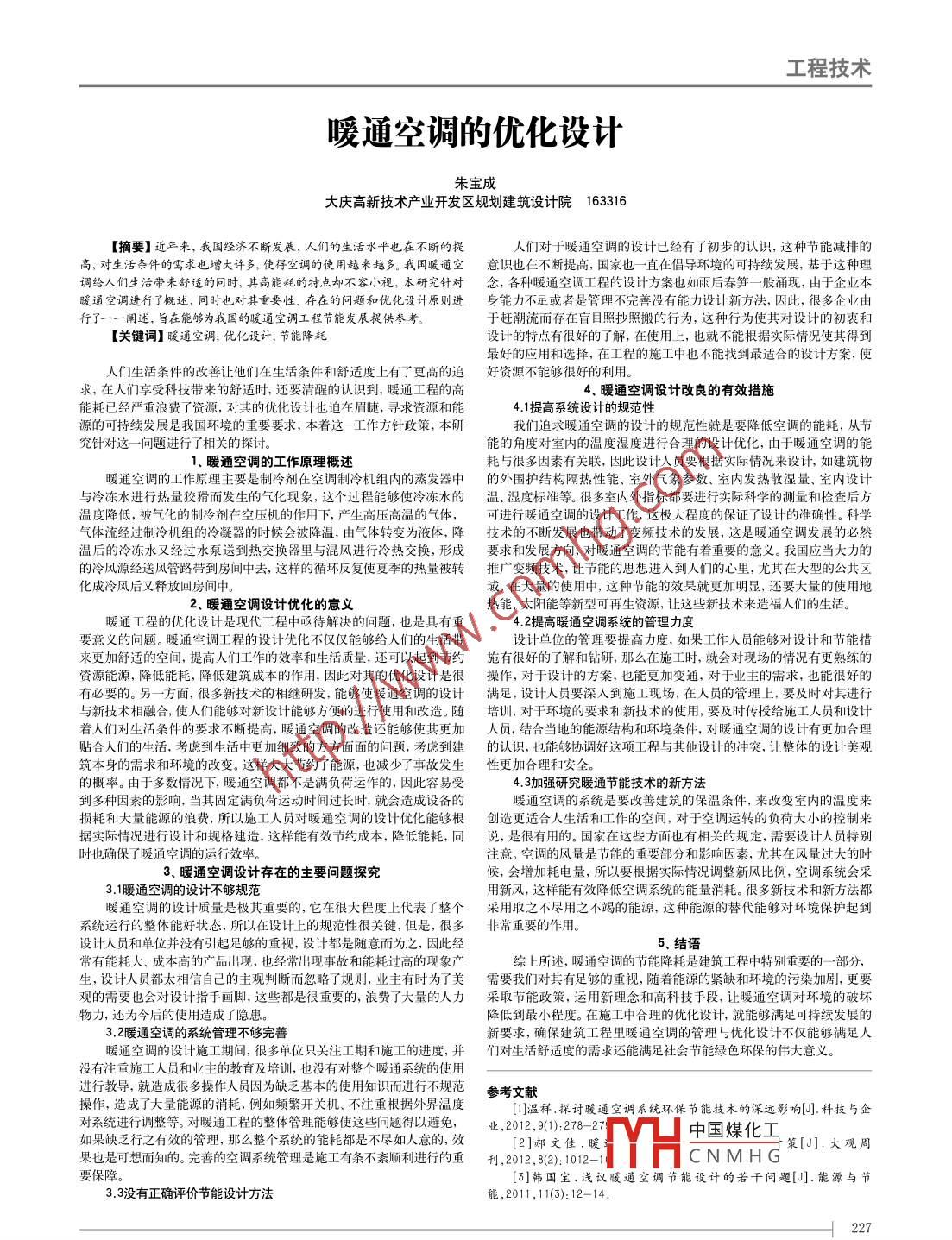工程技術(shù)暖通空調(diào)的優(yōu)化設(shè)計(jì)朱寶成大慶高新技術(shù)產(chǎn)業(yè)開(kāi)發(fā)區(qū)規(guī)劃建筑設(shè)計(jì)院163316[摘要]近年來(lái),我國(guó)經(jīng)濟(jì)不斷發(fā)展,人們的生活水平也在不斷的提人們對(duì)于暖通空調(diào)的設(shè)計(jì)已經(jīng)有了初步的認(rèn)識(shí),這種節(jié)能減排的高,對(duì)生活條件的需求也增大許多,使得空調(diào)的使用越來(lái)越多。我國(guó)暖通空意 識(shí)也在不斷提高,國(guó)家也一直在倡導(dǎo)環(huán)境的可持續(xù)發(fā)展,基于這種理調(diào)給人們生活帶來(lái)舒適的同時(shí),其高能耗的特點(diǎn)卻不容小視,本研究針對(duì)念, 各種暖通空調(diào)工程的設(shè)計(jì)方案也如雨后春筍一般涌現(xiàn), 由于企業(yè)本暖通空調(diào)進(jìn)行了概述,同時(shí)也對(duì)其重要性、存在的問(wèn)題和優(yōu)化設(shè)計(jì)原則進(jìn)身能 力不足或者是管理不完善沒(méi)有能力設(shè)計(jì)新方法,因此,很多企業(yè)由行了一一闡述,旨在能夠?yàn)槲覈?guó)的暖通空調(diào)工程節(jié)能發(fā)展提供參考。于趕潮流而存在盲目照抄照搬的行為,這種行為使其對(duì)設(shè)計(jì)的初衷和[關(guān)鍵詞]暖通空調(diào):優(yōu)化設(shè)計(jì);節(jié)能降耗設(shè)計(jì)的特點(diǎn)有很好的了解,在使用上,也就不能根據(jù)實(shí)際情況使其得到最好的應(yīng)用和選擇,在工程的施工中也不能找到最適合的設(shè)計(jì)方案,使人們生活條件的改善讓他們]在生活條件和舒適度上有了更高的追好資源 不能夠很好的利用。求,在人們享受科技帶來(lái)的舒適時(shí),還要清醒的認(rèn)識(shí)到,暖通工程的高、暖通空調(diào)設(shè)計(jì)改良的有效措施能耗已經(jīng)嚴(yán)重浪費(fèi)了資源,對(duì)其的優(yōu)化設(shè)計(jì)也迫在眉睫,尋求資源和能4.1提高系統(tǒng)設(shè)計(jì)的規(guī)范性源的可持續(xù)發(fā)展是我國(guó)環(huán)境的重要要求,本著這一-工作方針政策, 本研我們追求暖通空調(diào)的設(shè)計(jì)的規(guī)范性就是要降低空調(diào)的能耗,從節(jié)究針對(duì)這-問(wèn)題進(jìn)行了相關(guān)的探討。能的角度對(duì)室內(nèi)的溫度濕度進(jìn)行合理的設(shè)計(jì)優(yōu)化,由于暖通空調(diào)的能1.暖通空調(diào)的工作原理概述耗與很多因素有關(guān)聯(lián),因此設(shè)計(jì)人員要根據(jù)實(shí)際情況來(lái)設(shè)計(jì),如建筑物暖通空調(diào)的工作原理主要是制冷劑在空調(diào)制冷機(jī)組內(nèi)的蒸發(fā)器中的外圍護(hù)結(jié)構(gòu)隔熱性能、室外氣象參數(shù)、室內(nèi)發(fā)熱散濕量、室內(nèi)設(shè)計(jì)與冷凍水進(jìn)行熱量狡猾而發(fā)生的氣化現(xiàn)象,這個(gè)過(guò)程能夠使冷凍水的溫、 濕度標(biāo)準(zhǔn)等。很多室內(nèi)外指標(biāo)都要進(jìn)行實(shí)際科學(xué)的測(cè)量和檢查后方溫度降低,被氣化的制冷劑在空壓機(jī)的作用下,產(chǎn)生高壓高溫的氣體,可進(jìn)行暖 通空調(diào)的設(shè)計(jì)工作,這極大程度的保證了設(shè)計(jì)的準(zhǔn)確性??茖W(xué)氣體流經(jīng)過(guò)制冷機(jī)組的冷凝器的時(shí)候會(huì)被降溫,由氣體轉(zhuǎn)變?yōu)橐后w,降技術(shù)的不斷發(fā)展也帶動(dòng)了變頻技術(shù)的發(fā)展,這是暖通空調(diào)發(fā)展的必然溫后的冷凍水又經(jīng)過(guò)水泵送到熱交換器里與混風(fēng)進(jìn)行冷熱交換,形成要求和發(fā)展向,對(duì)暖通空調(diào)的節(jié)能有著重要的意義。我國(guó)應(yīng)當(dāng)大力的的冷風(fēng)源經(jīng)送風(fēng)管路帶到房間中去,這樣的循環(huán)反復(fù)使夏季的熱量被轉(zhuǎn)推廣變頻技術(shù),讓節(jié)能的思想進(jìn)入到人們的心里,尤其在大型的公共區(qū)化成冷風(fēng)后又釋放回房間中。域,在大量的使用中,這種節(jié)能的效果就更加明顯,還要大量的使用地2.暖通空調(diào)設(shè)計(jì)優(yōu)化的意義熱能、太陽(yáng)能等新型可再生資源,讓這些新技術(shù)來(lái)造福人們的生活。暖通工程的優(yōu)化設(shè)計(jì)是現(xiàn)代工程中亟待解決的問(wèn)題,也是具有重4.2提高暖通空調(diào)系統(tǒng)的管理力度要意義的問(wèn)題。暖通空調(diào)工程的設(shè)計(jì)優(yōu)化不僅僅能夠給人們的生活帶設(shè)計(jì)單位的管理要提高力度,如果工作人員能夠?qū)υO(shè)計(jì)和節(jié)能措來(lái)更加舒適的空間,提高人們工作的效率和生活質(zhì)量,還可以起到節(jié)約施 有很好的了解和鉆研,那么在施工時(shí),就會(huì)對(duì)現(xiàn)場(chǎng)的情況有更熟練的資源能源,降低能耗,降低建筑成本的作用,因此對(duì)其的優(yōu)化設(shè)計(jì)是很操作,對(duì)于設(shè)計(jì)的方案,也能更加變通,對(duì)于業(yè)主的需求,也能很好的有必要的。另一方面,很多新技術(shù)的相繼研發(fā),能夠使暖通空調(diào)的設(shè)計(jì)滿足, 設(shè)計(jì)人員要深入到施工現(xiàn)場(chǎng),在人員的管理上,要及時(shí)對(duì)其進(jìn)行與新技術(shù)相融合,使人們能夠?qū)π略O(shè)計(jì)能夠方便的進(jìn)行使用和改造。隨培訓(xùn), 對(duì)于環(huán)境的要求和新技術(shù)的使用,要及時(shí)傳授給施工人員和設(shè)計(jì)著人們對(duì)生活條件
