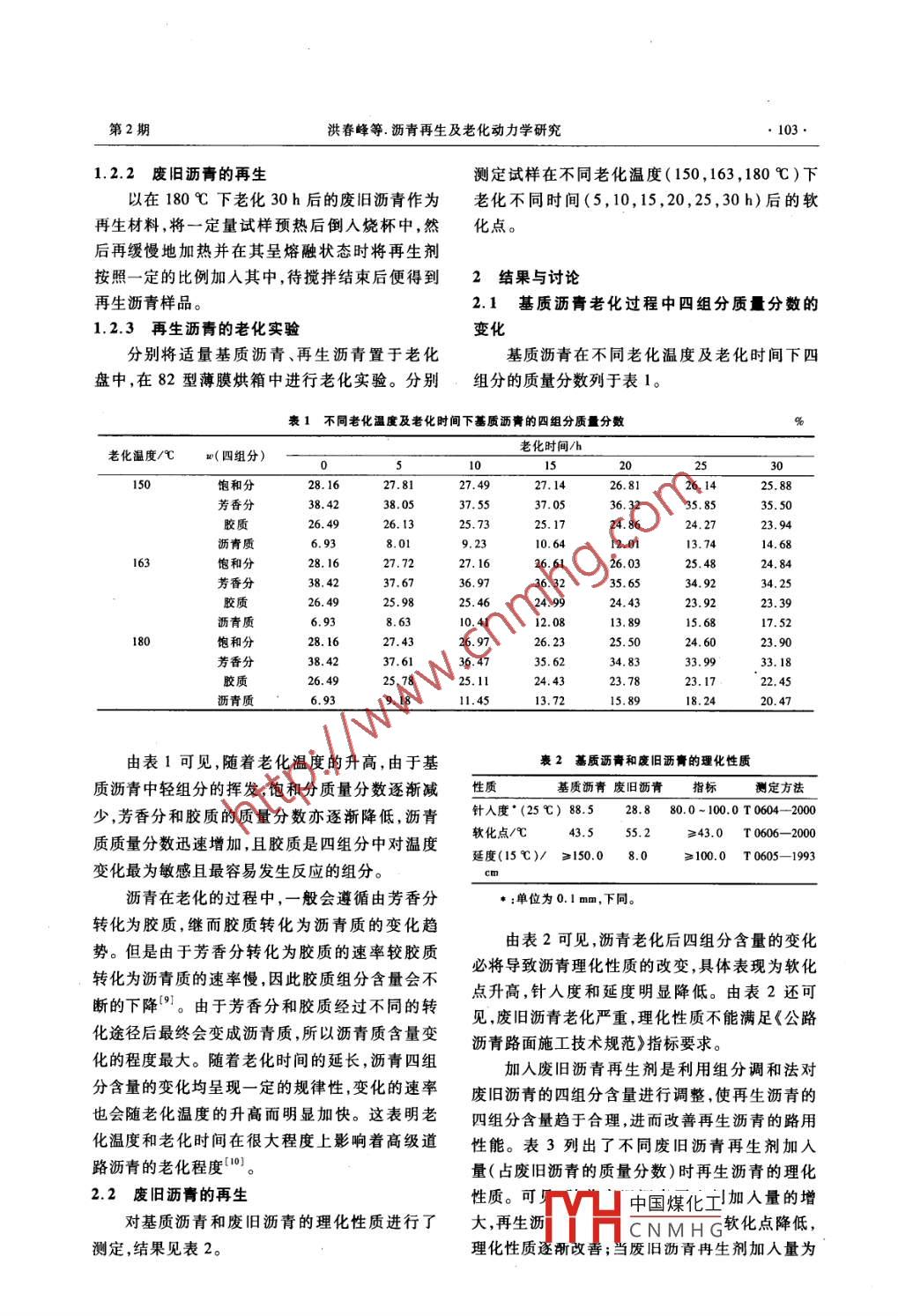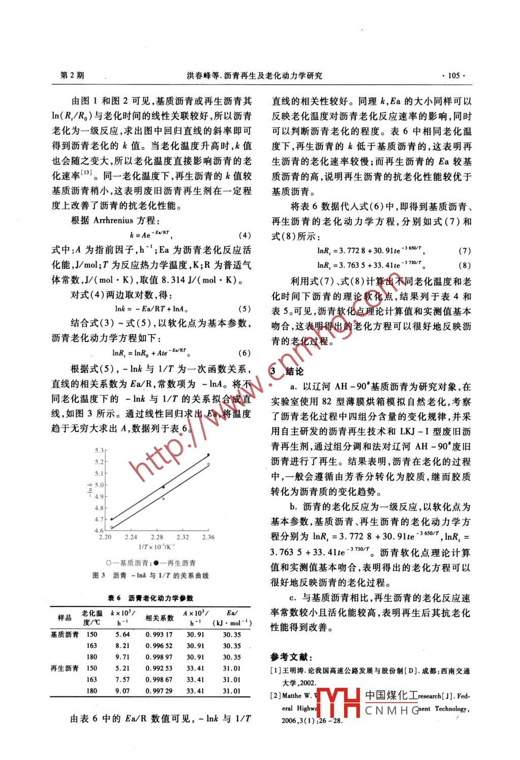 第34卷第2期石化技術(shù)與應(yīng)用Vol 34 No. 22016年3月Petrochemical Technology ApplicationMar.2016研究與開(kāi)發(fā)(102~106)瀝青再生及老化動(dòng)力學(xué)研究洪春峰,王洪國(guó),廖克儉(江寧石油化工大學(xué)石油化工學(xué)院,遼寧撫順113001)摘要:以遼河AH-90·基質(zhì)瀝青為研究對(duì)象,在實(shí)驗(yàn)室使用81型薄膜烘箱模擬自然老化,考察了瀝青老化過(guò)程中四組分含量的變化規(guī)律。采用自主研發(fā)的瀝青再生技術(shù)和LKJ-I型廢舊瀝青再生劑通過(guò)組分調(diào)和法對(duì)遼河AH-90廢舊瀝青進(jìn)行了再生,并建立以軟化點(diǎn)為參數(shù)的再生瀝青和基質(zhì)瀝青的老化動(dòng)力學(xué)方程。結(jié)果表明,瀝青在老化的過(guò)程中,一般會(huì)遵循由芳香分轉(zhuǎn)化為膠質(zhì),繼而膠質(zhì)轉(zhuǎn)化為瀝青質(zhì)的變化趨勢(shì);以軟化點(diǎn)為基本參數(shù),基質(zhì)瀝青、再生瀝青的老化動(dòng)力學(xué)方程分別為lnR1=3.728+70.91c36y,hnR,=3.7635+33.41te310n;與基質(zhì)瀝青相比,再生瀝青的老化反應(yīng)速率常數(shù)較小且活化能較高,表明再生后其抗老化性能得到改善關(guān)鍵詞:瀝青;道路瀝青;老化反應(yīng);四組分;再生劑;動(dòng)力學(xué);軟化點(diǎn);抗老化性能中圖分類號(hào):TE626861文獻(xiàn)標(biāo)志碼:B文章編號(hào):1009-0045(201602-0102-05隨著國(guó)民經(jīng)濟(jì)的快速增長(zhǎng),我國(guó)逐步加大了實(shí)驗(yàn)部分對(duì)高速公路建設(shè)的投資力度,預(yù)計(jì)至2020年底,1.1原料與儀器我國(guó)將成為新增高速公路數(shù)量和里程數(shù)最多的遼河AH-90°基質(zhì)瀝青,遼河油田筑路公司國(guó)家。一般認(rèn)為在影響瀝青老化的眾多因生產(chǎn),其四組分組成列于表1,主要理化性質(zhì)列于素中瀝青在高溫條件下吸收空氣中的氧氣發(fā)生表2。LKJ-1型廢舊瀝青再生劑,實(shí)驗(yàn)室自制。的氧化反應(yīng)是瀝青老化變質(zhì)的主要原因6,這SD-0625型瀝青布氏旋轉(zhuǎn)黏度儀,上海地學(xué)種氧化又與瀝青的溫度、施工及使用時(shí)間、瀝青儀器研究所制造。SYD-2801C型針入度試驗(yàn)的組成與結(jié)構(gòu)等有關(guān)。在修建及維護(hù)高速公儀、SYD-2806E型全自動(dòng)瀝青軟化點(diǎn)試驗(yàn)器,路時(shí)產(chǎn)生的廢舊瀝青混合料的處理亦比較棘均由上海昌吉地質(zhì)儀器有限公司制造。STYD,既破壞了生態(tài)環(huán)境,同時(shí)也違背我國(guó)可持續(xù)發(fā)展的戰(zhàn)略。因此,減緩瀝青使用時(shí)的自然老3型智能瀝青延伸度測(cè)定儀,上海路達(dá)實(shí)驗(yàn)儀器化評(píng)價(jià)和預(yù)測(cè)瀝青的老化性能及廢舊瀝青的再有限公司制造。82型薄膜烘箱無(wú)錫市石油儀器利用成為了研究的熱點(diǎn)。設(shè)備廠制造。本工作以遼河AH-90°基質(zhì)瀝青為研究對(duì)1.2實(shí)驗(yàn)方法象在實(shí)驗(yàn)室使用82型薄膜烘箱模擬自然老化,12·1基質(zhì)瀝青的老化實(shí)驗(yàn)考察瀝青老化過(guò)程中四組分含量的變化規(guī)律。使用82型薄膜烘箱對(duì)AH-90·基質(zhì)瀝青進(jìn)采用自主研發(fā)的瀝青再生技術(shù)和LKJ-I型廢舊行模擬自然老化實(shí)驗(yàn),于150,163,180℃下分別瀝青再生劑,通過(guò)組分調(diào)和法對(duì)遼河AH-90·廢老化0,5,10,15,20,25,30h舊瀝青進(jìn)行再生,并建立了以軟化點(diǎn)為參數(shù)的再生瀝青和基質(zhì)瀝青的老化動(dòng)力學(xué)方程。再生后收稿日期:2015-12-16;修回日期:2015-12-26的廢舊瀝青可很好地滿足筑路標(biāo)準(zhǔn)。由于瀝青基金項(xiàng)目:遼寧省科學(xué)事業(yè)工藝研究基金資助項(xiàng)目(項(xiàng)目編在組成及結(jié)構(gòu)上的復(fù)雜性會(huì)使其抗老化性能存回石油化T臥公右阻公司資助項(xiàng)目(項(xiàng)中國(guó)煤化工在很大的差異,所以對(duì)基質(zhì)和再生瀝青抗老化性編號(hào)作者簡(jiǎn)介CNMHG人,碩土研究生。的研究就成為后續(xù)研究的基礎(chǔ)。研究方向?yàn)槭突瘜W(xué)品的研制與開(kāi)發(fā),已發(fā)表論文1篇。第2期洪春峰等.瀝青再生及老化動(dòng)力學(xué)研究1031.2.2廢舊瀝膏的再生測(cè)定試樣在不同老化溫度(150,163,180℃)下以在180℃下老化30h后的廢舊瀝青作為老化不同時(shí)間(5,10,15,20,25,30h)后的軟再生材料,將一定量試樣預(yù)熱后倒入燒杯中,然化點(diǎn)后再緩慢地加熱并在其呈熔融狀態(tài)時(shí)將再生劑按照一定的比例加入其中,待攪拌結(jié)束后便得到2結(jié)果與討論再生瀝青樣品。2.1基質(zhì)瀝青老化過(guò)程中四組分質(zhì)量分?jǐn)?shù)的2.3再生瀝青的老化實(shí)驗(yàn)變化分別將適量基質(zhì)瀝青、再生瀝青置于老化基質(zhì)瀝青在不同老化溫度及老化時(shí)間下四盤(pán)中,在82型薄膜烘箱中進(jìn)行老化實(shí)驗(yàn)。分別組分的質(zhì)量分?jǐn)?shù)列于表1。表1不同老化溫度及老化時(shí)間下基質(zhì)瀝青的四組分質(zhì)量分?jǐn)?shù)老化溫度/℃(四組分)老化時(shí)間/h2030飽和分27.4927.14芳香分膠質(zhì)26.1325.7323.94瀝青質(zhì)6.9310.6412.01飽和分24.84芳香分36.9735膠質(zhì)26.4925.9824.9924,4瀝青質(zhì)6.9310.4112.0813.8915.6817.52飽和分27.4326.97芳香分37.6136.4734.83膠質(zhì)瀝青質(zhì)69391811.4513.7215.8918由表1可見(jiàn),隨著老化溫度的升高,由于基表2基質(zhì)瀝青和廢舊瀝膏的理
