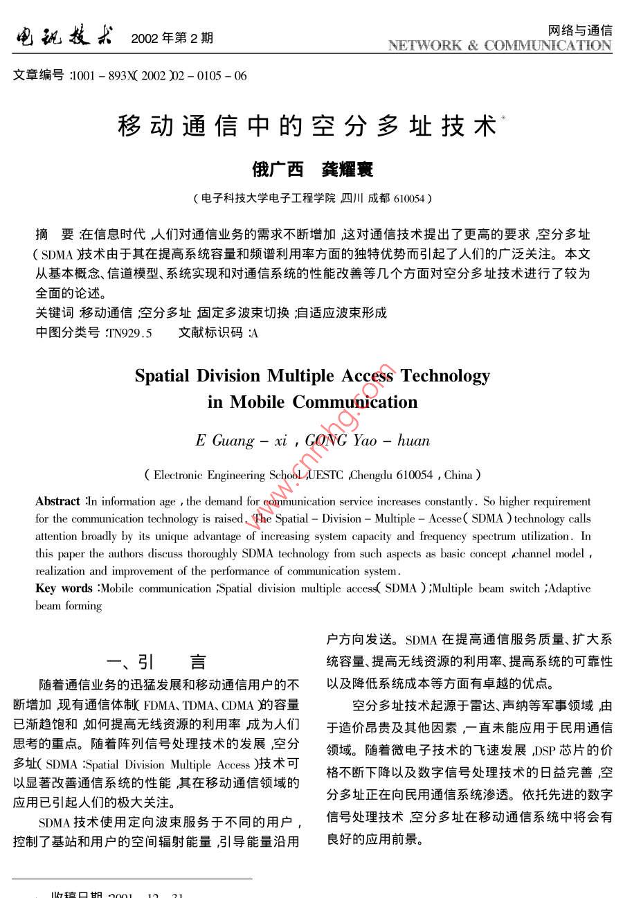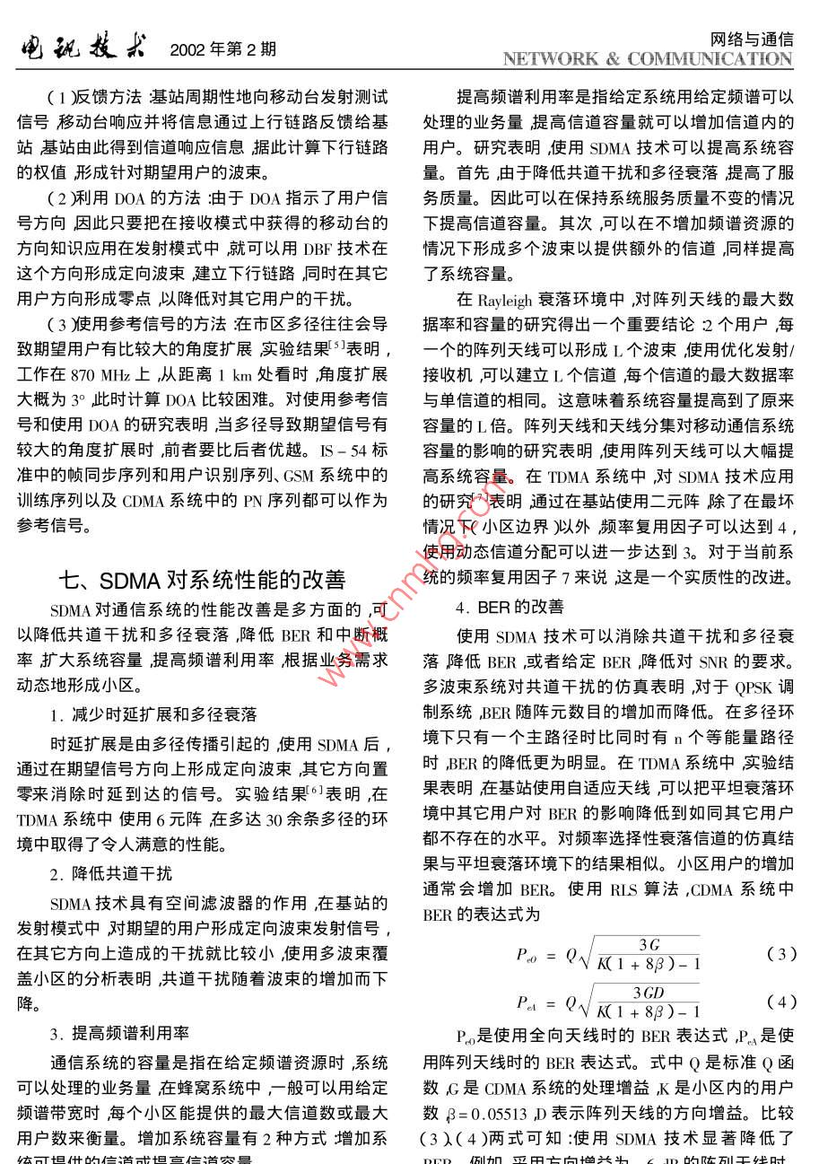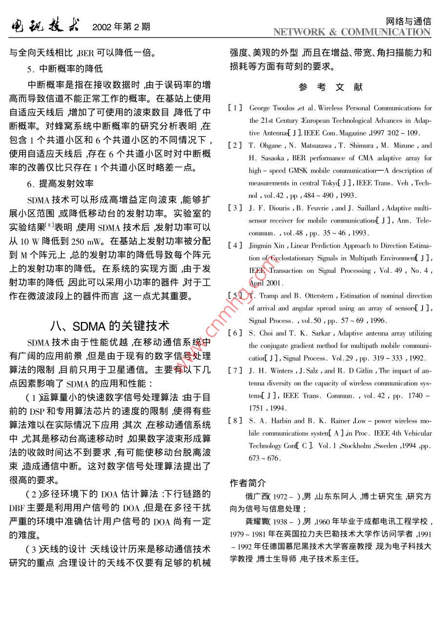 電孤技求202年第2期網(wǎng)絡(luò)與通信NETWORK COMMUNICATION文章編號(hào):1001-893X200m2-0105-0移動(dòng)通信中的空分多址技術(shù)俄廣西龔耀寰電子科技大學(xué)電子工程學(xué)院四川成都610054)摘要在信息時(shí)代人們對(duì)通信業(yè)務(wù)的需求不斷增加這對(duì)通信技術(shù)提出了更高的要求空分多址〔SMA)技術(shù)由于其在提高系統(tǒng)容量和頻譜利用率方面的獨(dú)特優(yōu)勢(shì)而引起了人們的廣泛關(guān)注。本文從基本概念、信道模型、系統(tǒng)實(shí)現(xiàn)和對(duì)通信系統(tǒng)的性能改善等幾個(gè)方面對(duì)空分多址技術(shù)進(jìn)行了較為全面的論述。關(guān)鍵詞移動(dòng)通信空分多址固定多波束切換洎適應(yīng)波束形成中圖分類號(hào)IN929.5文獻(xiàn)標(biāo)識(shí)碼:ASpatial Division Multiple access Technologyin mobile communicationE Guang-xi GONG Yao -huanElectronic Engineering School UESTC hengdu 610054, ChinaAbstract In information age the demand for communication service increases constantly. So higher requirementfor the communication technology is raised. The Spatial-Division- Multiple- Acesse( SDMA technology callsattention broadly by its unique advantage of increasing system capacity and frequency spectrum utilization. Inthis paper the authors discuss thoroughly SDMA technology from such aspects as basic concept channel modelrealization and improvement of the performance of communication systemKey words: Mobile communication "Spatial division multiple access( SDMA ) Multiple beam switch ;Adaptivebeam formin戶方向發(fā)送。SDMA在提高通信服務(wù)質(zhì)量、擴(kuò)大系引言統(tǒng)容量、提高無線資源的利用率、提高系統(tǒng)的可靠性隨著通信業(yè)務(wù)的迅猛發(fā)展和移動(dòng)通信用戶的不以及降低系統(tǒng)成本等方面有卓越的優(yōu)點(diǎn)斷增加現(xiàn)有通信體制FDMA、TDMA、CDMA的容量空分多址技術(shù)起源于雷達(dá)、聲納等軍事領(lǐng)域由已漸趨飽和如何提高無線資源的利用率成為人們于造價(jià)昂貴及其他因素,一直未能應(yīng)用于民用通信思考的重點(diǎn)。隨著陣列信號(hào)處理技術(shù)的發(fā)展空分領(lǐng)域。隨著微電子技術(shù)的飛速發(fā)展DSP芯片的價(jià)多址(SDMA: Spatial Division Multiple Access)技術(shù)可以顯著改善通信系統(tǒng)的性能其在移動(dòng)通信領(lǐng)域的格不斷下降以及數(shù)字信號(hào)處理技術(shù)的日益完善空應(yīng)用已引起人們的極大關(guān)注分多址正在向民用通信系統(tǒng)滲透。依托先進(jìn)的數(shù)字SDMA技術(shù)使用定向波束服務(wù)于不同的用戶信號(hào)處理技術(shù)空分多址在移動(dòng)通信系統(tǒng)中將會(huì)有控制了基站和用戶的空間輻射能量引導(dǎo)能量沿用良好的應(yīng)用前景口胡11電孤技求202年第2期網(wǎng)絡(luò)與通信NETWORK COMMUNICATION加拿大 McMaster大學(xué)研究開發(fā)了4元陣列天線采SDMA的研究現(xiàn)狀用恒模CMA算法。我國(guó)國(guó)內(nèi)部分大學(xué)也正在進(jìn)行歐、美、日等國(guó)非常重視sDMA技術(shù)在未來的移相關(guān)的研究動(dòng)通信方案中的地位與作用,已經(jīng)進(jìn)行了大量的理論分析研究同時(shí)也建立了一些技術(shù)試驗(yàn)平臺(tái)。三、SDMA的基本概念歐洲通信委員會(huì)(CEC勝在RACE計(jì)劃中實(shí)施了SDMA體制又稱空間分割,它使用陣列天線通第一階段智能天線技術(shù)研究稱之為 TSUNAMI,由過在角度域提供虛信道來控制空間。一般來說,S德國(guó)、英國(guó)、丹麥和西班牙合作完成。項(xiàng)目組在95中的120扇區(qū)分割,定多波束的切換也可以DECT基站基礎(chǔ)上構(gòu)造了智能天線試驗(yàn)?zāi)P汀L炀€認(rèn)為屬于SDMA的范疇。SDMA技術(shù)允許在一個(gè)小有8個(gè)陣元組成射頻工作頻率為1.89GHz陣元間區(qū)內(nèi)用相同的頻率、相同的時(shí)隙、相同的擴(kuò)頻碼通距可調(diào)。模型用數(shù)字波束形成的方法實(shí)現(xiàn)智能天過不同的波束為不同的用戶服務(wù)。通過使用陣列天線系統(tǒng)評(píng)估了識(shí)別信號(hào)到達(dá)方向的MUsC算法,線提供對(duì)空間的動(dòng)態(tài)控制從而增加了一個(gè)維度采用的自適應(yīng)算法有NLMS算法和RLS算法。實(shí)驗(yàn)SDMA的基本思想是引導(dǎo)能量沿用戶方向傳系統(tǒng)驗(yàn)證了智能天線的功能2個(gè)用戶4個(gè)空間信輸。通常情況下同移動(dòng)用戶的空間位置和移動(dòng)速道包括上行和下行鏈路比特差錯(cuò)率BER優(yōu)于度不同在基站一側(cè)所接收到的不同用戶的信號(hào)的I0?-3I。試驗(yàn)評(píng)測(cè)了采用 MUSIC算法判別用戶信DOA多普勒頻移和多徑結(jié)構(gòu)等特征也就不同。SD-號(hào)方向的能力同時(shí)通過現(xiàn)場(chǎng)測(cè)試表明圓環(huán)和平MA就是利用這些特征的差異通過陣列天線技術(shù)面天線適于室內(nèi)通信環(huán)境使用而在市區(qū)環(huán)境中采在用戶方向上形成定向波東在同一信道上接收和用簡(jiǎn)單的直線陣更合適。發(fā)送多個(gè)用戶信號(hào)而不發(fā)生相互干擾。實(shí)際上它使日本ATR光電通信研究所研制了基于波束空通信資源不再局限于時(shí)間域、頻率域或碼域而拓展間處理方式的多波束智能天線。天線陣元布局為間到了空間域距半波長(zhǎng)的16陣元平面方陣,射頻工作頻率是個(gè)理想的SDMA系統(tǒng)應(yīng)