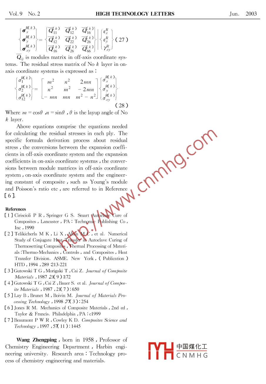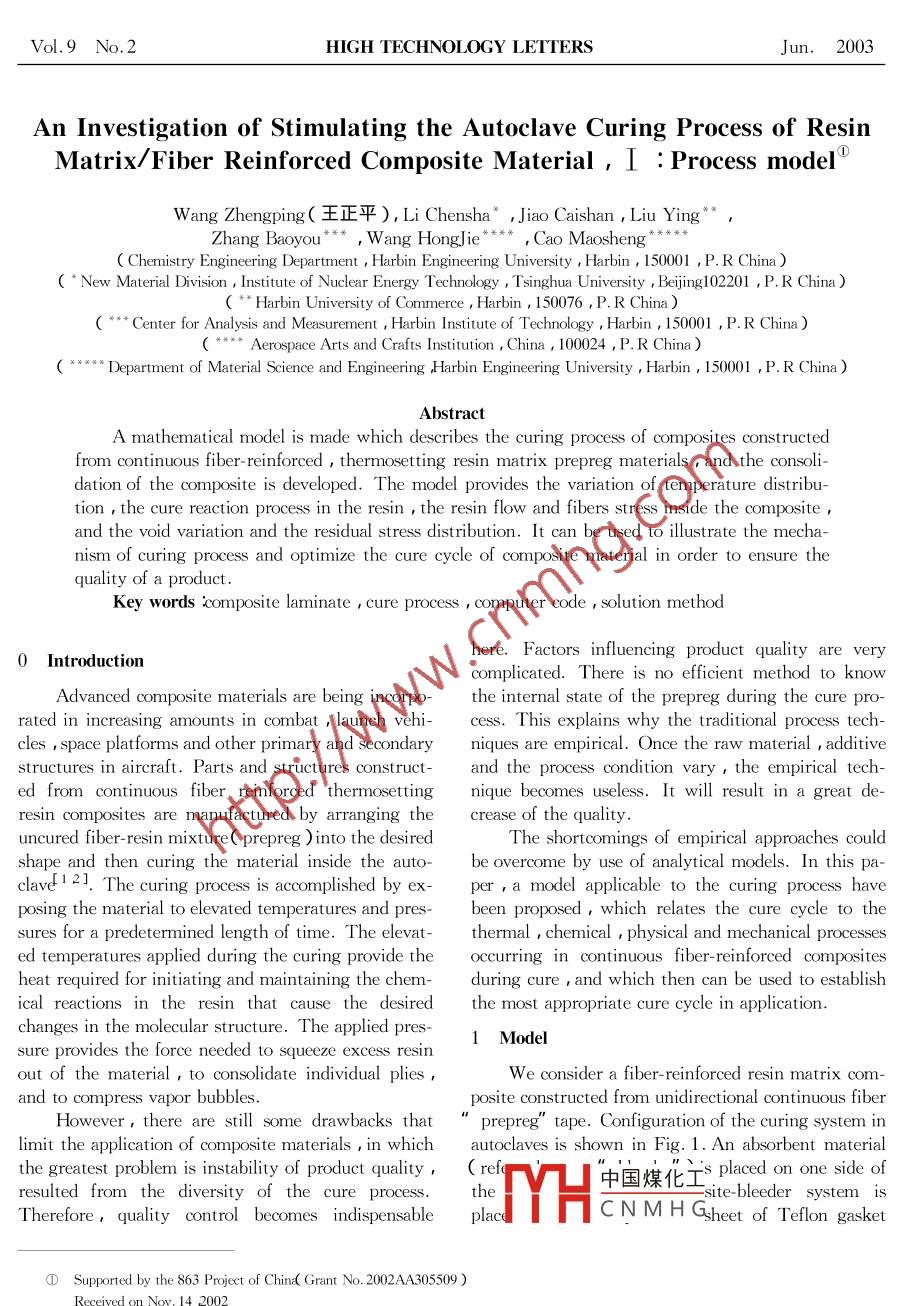 Vol.9 No.2HIGH TECHNOLOGY LETTERSJun.2003An Investigation of Stimulating the Autoclave Curing Process of ResinMatrix/Fiber Reinforced Composite Material ,I : Process model°Wang Zhengping(王正平), Li Chensha* ,Jiao Caishan ,Liu Ying'Zhang Baoyou** * , W ang HongJie, Cao Maosheng( Chemistry Engineering Department , Harbin Engineering University , Harbin , 150001 ,P. R China )( * New Material Division , Institute of Nuclear Energy Technology ,Tsinghua University , Beiing102201 ,P. R China)( ** Harbin University of Commerce , Harbin , 150076 ,P. R China)( *** Center for Analysis and Measurement , Harbin Institute of Technology , Harbin , 150001 ,P. R China)( *** Aerospace Arts and Crafts Institution , China , 100024 ,P. R China)( *** Department of Material Science and Engineering Harbin Engineering University , Harbin , 150001 ,P. R China )AbstractA mathematical model is made which describes the curing process of composites constructedfrom continuous fiber- reinforced,thermosetting resin matrix prepreg materials , and the consoli-dation of the composite is developed. The model provides the variation of temperature distribu-tion,the cure reaction process in the resin , the resin flow and fibers stress inside the compositeand the void variation and the residual stress distribution. It can be used to ilustrate the mecha-nism of curing process and optimize the cure cycle of composite material in order to ensure thequality of a product.Key words composite laminate , cure process , computer code , solution method0 Introductionhere. Factors influencing product quality are verycomplicated. There is no efficient method to knowAdvanced composite materials are being incorpo-the internal state of the prepreg during the cure pro-rated in increasing amounts in combat , launch vehi-cess. This explains why the traditional process tech-cles , space platforms and other primary and secondaryniques are empirical. Once the raw material , additivestructures in aircraft. Parts and structures construct-and the process condition vary , the empirical tech-ed from continuous fiber reinforced thermosettingnique becomes useless. It will result in a great de-resin composites are manufactured by arranging thecrease of the quality.uncured fiber- resin mixture( prepreg ) into the desiredThe shortcomings of empirical approaches couldshape and then curing the material inside the auto-be overcome by use of analytical models. In this pa-clave1 2. The curing process is accomplished by ex-per , a model applicable to the curing process haveposing the material to elevated temperatures and pres-been proposed ,which relates the cure cycle to thesures for a predetermined length of time. The elevat-thermal , chemical , physical and mechanical processesed temperatures applied during the curing provide theoccurring in continuous fiber- reinforced compositesheat required for initiating and maintaining the chem-during cure , and which then can be used to establishcal reactions in the resin that cause the desiredthe most appropriate cure cycle in application.changes in the molecular structure. The applied pres-1 Modelsure provides the force needed to squeeze excess resinout of the material , to consolidate individual plies ,We consider a fiber- reinforced resin matrix com-and to compress vapor bubbles.posite constructed from unidirectional continuous fiberHowever , there are still some drawbacks thatprepreg' ' tape. Configuration of the curing system inlimit the application of composite materials ,in whichautoclaves is shown in Fig. 1. An absorbent materialthe greatest problem is instability of product quality ,(re中國煤化工s placed on one side ofresulted from the diversity of the cure process.the-bleeder system isTherefore,quality control becomes indispensableplaceMYHCN M H Gsheet of Teflon gasket .①Supported by the 863 Project of Chin( Grant No. 2002AA305509 )Received on Now. 14 2002一31一Vol.9 No.2HIGH TECHNOLOGY LETTERSJun.2003cloth is placed between the composite and the toolbag”) is placed around the entire assembly and vacu-plate ,and a sheet of porous Teflon release membraneum is applied during the cure. Sealing filler ( calledis placed between the composite and the bleeder to“dams" ) is also mounted around the prepreg to stickprevent sticking. An air breather is added on thethe vacuum bag and prevent lateral motion of the cur-bleeder in favor of vacuum pumping when curing ising system.done in autoclave. Finally ,a plastic sheet ( vacuumvacuum bagsenling fllersealing illerair breatherporous- bleedermembrane" prepreggasketclothmetal plateFig.1 The curing system inside the autoclaveInitially , the resin is uncured. Starting at time tresin , and the resin viscosity inside the composite de-=0 , the composite system is exposed to an autoclavepend on the rates at which heat is transmitted fromtemperature process Ta which may vary with time inthe environment into the material and heat is generat-a favorable manner. At some time tp( tp≥0 ),aed by cure reaction. For the coordinate system of aknown pressure Pa is applied to the system. The ele-flat prepreg laminate made of continuous fibers ,asvated temperatures and pressures to which the materi-shown in Fig. 2. According to the law of conservational is subjected are referred to as the cure temperatureof energy,the energy equation may be expressedand the cure pressure. The magnitudes and durationsa[12] :of the temperatures and pressures applied during thecuring process ( denoted at the cure cycle ) significant-ρc=n二最的一力最的一)+ly affect the performance of the finished product.(1 )最(《聚) oHV,The model providing the information of cure pro-cess is developed below in four parts( called four sub-processes or four submodels ) which describe( a) thebxheat generated by cure reaction , heat transfer amongthe layers or between the autoclave air and the curingsystem , the variation of viscosity of resin matrix ;( b)compression of laminate , resin flow , fiber defor