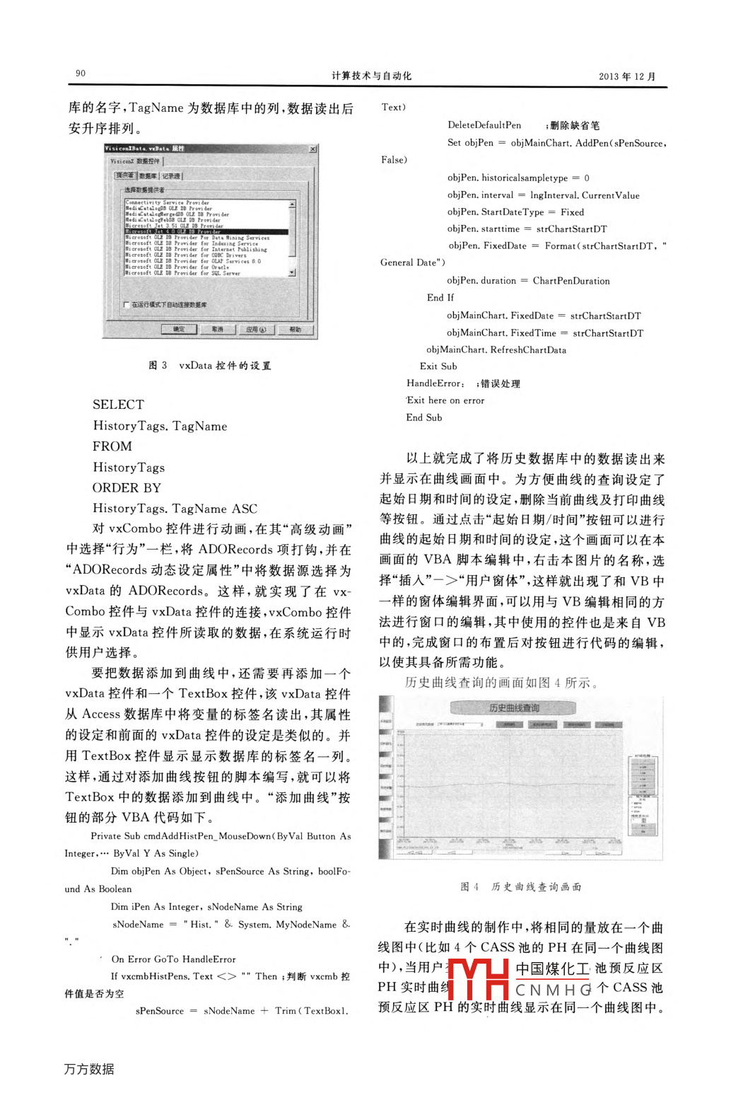 第32卷第4期計(jì)算技術(shù)與自動化Vol. 32,No. 4Dec.20132013年12月Computing Technology and Automation文章編號:1003 - 6199(2013)04 - - 0088 -04iFix在污水處理中的應(yīng)用與研究王樹東,2,郭林林' ,金魯東'(1.蘭州理工大學(xué)電氣與信息工程學(xué)院,甘肅蘭州730050; 2. 甘肅省工業(yè)過程先進(jìn)控制重點(diǎn)實(shí)驗(yàn)室,甘肅蘭州730050)滴要:iFix具有強(qiáng)大的數(shù)據(jù)采集與處理的功能,本文介紹iFix在污水處理自動控制系統(tǒng)中的應(yīng)用。通過OPC技術(shù)對現(xiàn)場數(shù)據(jù)進(jìn)行采集,通過iFix實(shí)時(shí)數(shù)據(jù)庫和歷史數(shù)據(jù)庫進(jìn)行數(shù)據(jù)的存儲,并結(jié)合ActiveX控件和VBA編程的使用,實(shí)現(xiàn)了歷史曲線、實(shí)時(shí)曲線、報(bào)表、及報(bào)警的設(shè)計(jì)與應(yīng)用。關(guān)鍵詞:iFix;污水處理;VBA ActiveX控件;數(shù)據(jù)采集中圈分類號:TP31文獻(xiàn)標(biāo)識碼:AApplication and Research of iFix in Sewage TreatmentW ANG Shu-dong.2 ,GUO Lin lin' ,JIN Lu dong'(1. College of Electrical and Information Engineering, Lanzhou University of Technology, Lanzhou 730050 ,China;2. Key Laboratory of Gansu Advanced Control for Industrial Processes, Lanzhou 730050 ,China)Abstract:;iFix has powerful data acquisition and processing functions, this article introduce the application of iFix insewage treatment automatic control system. By acquisition field data through the use of OPC technology, storage datathrough iFix dynamics database and iFix historical database, it can realize the design and application of history curve . real-time curve、statements and alarm, with the use of VBA and ActiveX control.Key words: iFix;sewage treatment ; VBA; ActiveX control; data acquisition很好的滿足工業(yè)控制的要求。iFix 是一款功能強(qiáng)1引言大的監(jiān)控軟件,是世界領(lǐng)先的工業(yè)自動化軟件解決方案,是為水及污水處理、石油天然氣這樣過程管城市污水的處理在解決水資源緊缺方面是很理度身定造的解決方案。它包含了主流PLC的驅(qū)重要的一方面,特別是在西部的城市。本文以西部動,集成了COM/DCOM、OPC、VBA、ActiveX等某縣城的污水處理工程為背景,對iFix組態(tài)軟件先進(jìn)的現(xiàn)代軟件技術(shù)1,使所有的應(yīng)用程序都能無在歷史曲線實(shí)時(shí)曲線、報(bào)表制作及報(bào)警查詢方面.縫的連接到一個系統(tǒng)中去,提高整個系統(tǒng)的集成的使用進(jìn)行了探討。度。iFix軟件與其他監(jiān)控軟件的不同之處在與其優(yōu)化的模塊結(jié)構(gòu)與開放的VBA編程,這樣,就在2 iFix 組態(tài)軟件很大程度上提高了軟件的靈活性,可以充分發(fā)揮開發(fā)人員的創(chuàng)造空間,以更好的滿足用戶的各種監(jiān)控本系統(tǒng)上位監(jiān)控軟件使用了美國的GEFanuc:及數(shù)據(jù)處理的要求。下面結(jié)合VBA和ActiveX公司的iFix,控制器選用了美國的羅克韋爾公司的控件的使用,就iFix軟件在歷史曲線、實(shí)時(shí)曲線、ControlLogix系列PLC。他們有著長期的合作關(guān)報(bào)表制作及報(bào)警查詢方面的使用進(jìn)行研究探討。系,在軟件連接方面有著可靠高效的處理方案,能中國煤化工收稿日期:2012- 12-02作者簡介:王樹東(1965-),男,山東煙臺人,教授,碩士生導(dǎo)師,研究方向:計(jì)算機(jī)自.MHC N M H G邱林林(1988 -),男,河南焦作人,碩士研究生,研究方向:工業(yè)計(jì)算機(jī)控制與過程控制(E- mail:guoxiaodin1988@163. com)。2013年12月計(jì)算技術(shù)與自動化90庫的名字,TagName為數(shù)據(jù)庫中的列,數(shù)據(jù)讀出后Text)DeleteDefaultPen;刪除缺省筆安升序排列。Set obiPen = objMainChart. AddPen(sPenSource,FalseWsient數(shù)易控件IobjPen. historicalsampletype = 0提供看數(shù)照庫|記錄理objPen. interval = IngInterval. CurrentValue達(dá)擇數(shù)需情供者objPen. StarDateType = FixedobjPen. sattime = strChartStartDTobjPen. FixedDate = Format( strChartartDT,"General Date" )objPen. duration = ChartPenDurationEnd Ifr在運(yùn)行模式下自動直接數(shù)據(jù)庫objMainChart. FixedDate = stChartStartDTobjMainChart. FixedTime = strChartStartDTobjMainChart. RefreshCharData圖3 vxData 控件的設(shè)置Exit SubHandleError: ;錯誤處理Exit here on errorSELECTEnd SubHistoryTags. TagNameFROM以上就完成了將歷史數(shù)據(jù)庫中的數(shù)據(jù)讀出來HistoryTags并顯示在曲線畫面中。為方便曲線的查詢設(shè)定了ORDER BY起始日期和時(shí)間的設(shè)定,刪除當(dāng)前曲線及打印曲線HistoryTags. TagName ASC等按鈕。通過點(diǎn)擊“起始日期/時(shí)間”按鈕可以進(jìn)行對vxCombo控件進(jìn)行動畫,在其“高級動畫”曲線的起始日期和時(shí)間的設(shè)定,這個畫面可以在本中選擇“行為”一欄,將ADORecords 項(xiàng)打鉤,并在畫面的VBA腳本編輯中,右擊本圖片的名稱,選“ADORecords動態(tài)設(shè)定屬性”中將數(shù)據(jù)源選擇為擇“插入”->“用戶窗體”,這樣就出現(xiàn)了和VB中vxData 的ADORecords.這樣,就實(shí)現(xiàn)了在vx-- -樣的窗體編輯界面,可以用與VB編輯相同的方Combo控件與vxData控件的連接,vxCombo控件法進(jìn)行窗口的編輯,其中使用的控件也是來自VB中顯示vxData控件所讀取的數(shù)據(jù),在系統(tǒng)運(yùn)行時(shí)中的,完成窗口的布置后對按鈕進(jìn)行代碼的編輯,供用戶選擇。以使其具備所需功能。要把數(shù)據(jù)添加到曲線中,還需要再添加一個歷史曲線查詢的畫面如圖4所示。vxData控件和一個T