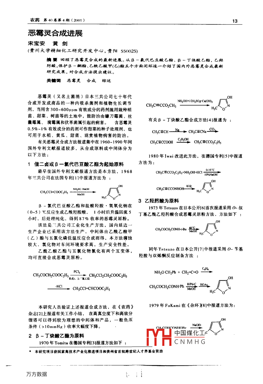 農藥第40卷第4期 ( 2001)惡霉靈合成進展宋寶安黃劍(貴州大學精細化工研究開發(fā)中心,貴陽550025)摘要回顧了惡霉靈合成的最新進展。從β -氯代巴豆酸乙酯、β-丁炔酸乙酯,乙羥.肟酸,保護β -酮酯、乙酰乙酸甲(乙)酯五個方面閉環(huán)逐一介紹了國內外惡霉靈合成最新研究成果,對合成方法提出建議。關鍵諷惡霉靈 合成綜述惡霉靈(又名土菌消)日本三共公司七十年代_of合成開發(fā)成商品的一種內吸殺菌劑和植物生長調節(jié)CH2C=CCO2CH3NIH1/ZHSOPpCc(OH)z劑,當用含300~ 600ppm有效成分的藥劑施用栽種稻苗、甜菜、樹苗等的土地中,能防治由鐮刀霉菌、絲有關β -丁炔酸乙酯合成方法[41報道為:囊蔣屬、腐霉屬和伏革菌屬引起的病害。含惡霉靈0.5%~ 1%有效成分的藥劑可作甜菜的種子處理劑,也CcH,c三CH一性十CH.C=CNa C-可用于水稻、黃瓜、甜菜、觀賞植物病害的防治。有關惡霉靈合成方法報道集中在1960-1990年間CH,CECC0OHC:H.OHCHzCECCO2CHs國外專利文獻報道較多,從合成原料或中間體分為.以下方法:1980年Iwai改進此方法,在德國專利[5|中報道1偕二鹵或B一氯代巴豆酸乙酯為起始原料方法為:最早在國外專利文獻報道方法是本方法,1968CH.CECCO2CH.+NH.OH.HIC10-10"C年三共公司在法國專利[11中報道方法為:_0HCH2CC-COOC2HsNIyHC.NOHCH,CECCONHOHHMoOH3乙羥肟酸為原料β -氯代巴豆酸乙酯和鹽酸羥胺●氫氧化鈉在1973年Tetsuzo在日本公開[61首次報道采用0叔(0~5) C.反應生成乙酰羥胺酸,1 小時后升溫回流5丁基乙酰乙羥肟酸合成惡霉靈原粉方法,方法如下:小時,后處理純化,得到87%收率的惡霉靈原粉。,該法是二共公司工業(yè)化生產方法,國內延邊一CH.COCHCONH.-BU 2er生產企業(yè)已采用該方法生產。中間體由乙酰乙酸甲(乙)酯與五氯化磷低溫反應合成而得,本方法腐蝕較大,氯化物對車間環(huán)境要求高,生產安全性差。乙酰乙酸乙酯與五氯化物氯化有兩個互變體,同年Tetsuzo在日本公開171中報道采用0-芐基均可直接合成惡霉靈原粉。羥胺與雙烯酮反應制備方法:PClzNH2OCH2Ph + CH2=C=0CH2COCH2C0OC2Hs,七CH4CI2CH2COOCHCH2COCH2CONHPhHPdC. HOAS .CHy2CI-CHC00C2HsMeOnt本研究人員驗證上述報道合成方法,在《農藥》1979年FuKami在《雜環(huán)X81中報道方法為:雜志[21上報道有關工作小結,在高 真空度下和高效分餾塔可以得到較為理想的中間體和產品,一般負壓)H條件(>10mmHg )收率大幅度下降。CHLCOHCONIOR,NOE中國煤化工c2 β-丁炔酸乙酯為原料1970年Tomita在德國專利[3]報道方法如下:MYRCNMHG●本研究項目獲國家高 技術產業(yè)化推進項目和貴州省首批跨世紀人才養(yǎng)基金資助一14PESTICIDES Vol.40 No.4 (2001)1979年Kasaharn在《化學工業(yè)》(英文Y91中報道了通過乙羥肟酸合成方法CH.COCH2COOCH, + NH,OH HCI + CH,ONa有機流趙_OHf溫CH2COCH2CONHOH -LiPdCIEyNHCH,C.CH2COCH2CONHOH有機酸H1980年Iwai在德國專利[101報道方法如下:CH3C=CCO2CH3+NH2OH HCI 0-10°C6小結,OH從上述幾種方法對比,結合作者多年研究結果CH2CH-CHCONHOH環(huán)化和生產實踐,用乙酰乙酸乙酯(甲酯)與羥胺在有機溶劑條件閉環(huán),可以穩(wěn)定生產純度≥90%惡霉靈原4保護B -酮酯合成方法粉,收率可達60% (以鹽酸羥胺計),生產成本低,市1970年R.Jacguier在德國化學會志11]報道了采場競爭強,是一條較佳合成工藝路線。用乙二醇保護乙酰乙酯的β -位酮基方法:參考文獻[川1 Fr 1,534.601.1968CHCOCH.COOC;Hs 4二蓋. TIH121宋寶安.農藥1988.(5):13[31 Ger ofen.918,253.19710[4} Neth Apl.16.511.925(CA65:16974)[51 Ger oten 1.795.821.1980[6]日本公開昭48-8856.19731990年延邊大學研究過該方法,在《農藥》雜志[7|日本公開昭48-32867.1973有過報道,此方法成本較高,保護試劑回收較困難。{8| Crelization,1979.(21 12):1297|91 Chem Induntrv ,1979.(193):3185乙酰乙酸乙酯(甲酯)直接閉環(huán)法1988年宋寶安在《農藥》5期首次在國內報道了{101 Ger oHen 1,795.821.1980乙酰乙酸乙酯水相法合成的結果,該方法合成簡單,111JCer.Cher.foco 1970.(5):1978反應周期短,收率高,成本低,適宜于配制惡霉靈混1IIPCT In Appl Wo 84 01.774.1984劑水劑,1990年黑龍江一農藥企業(yè)投人工業(yè)化生產,[131J.0mg Chem ,1986.51(21):4037目前已發(fā)展成為東北旱育秧主要藥劑。[|41宋寶安CN1247704A.2000[151. IChem.Soe.1956.2978[16) JAmCh.@..95./7):1136CHC2COCH,COOC2Hs + NH2OH.HCl- NaOH十|17] NtA,Ap:.6.516.,87I(CA,65:15383)[81JP.518,249CH,COCH,CONHOH .HCI[191 Chem. Pharm Bll.Tokyo.1966,14;12777Advances in Synthesis of Hymexazole1998年底貴州大學精細化工中心改進了該水相Song Baoan et a法工藝,在該中心科技生產基地產業(yè)建立了年產(Research and Development Center of Fine Chemicals. GuizhouUniversiry, Guiyang 550025)2000盹水劑生產線。Abstract: The advances in synthesis of hymexazxole from宋寶安等人經多年研究,完成了溶劑法合成惡chororonate,en buynoic acid ster, actodroamti acid,霉靈原粉新工藝,在有機溶劑中在甲醇鈉存在下,乙keto ester, acetoaceic acid ester was reviewed. The sugges-酰乙酸甲酯與鹽酸羥胺反應生成乙氧羥肟酸然后有tions of synhesis of hymexazxole was given.機酸閉環(huán),脫溶,重結晶,得到純度90%,收率60% Keywords; hymexazle. svntheis. revicw的惡霉靈原粉,已獲專利公開,經過工業(yè)化試驗知本中國煤化工工藝具有產品質量穩(wěn)定,生產成本低的優(yōu)點。MHC N M H G稿日期: 2001..