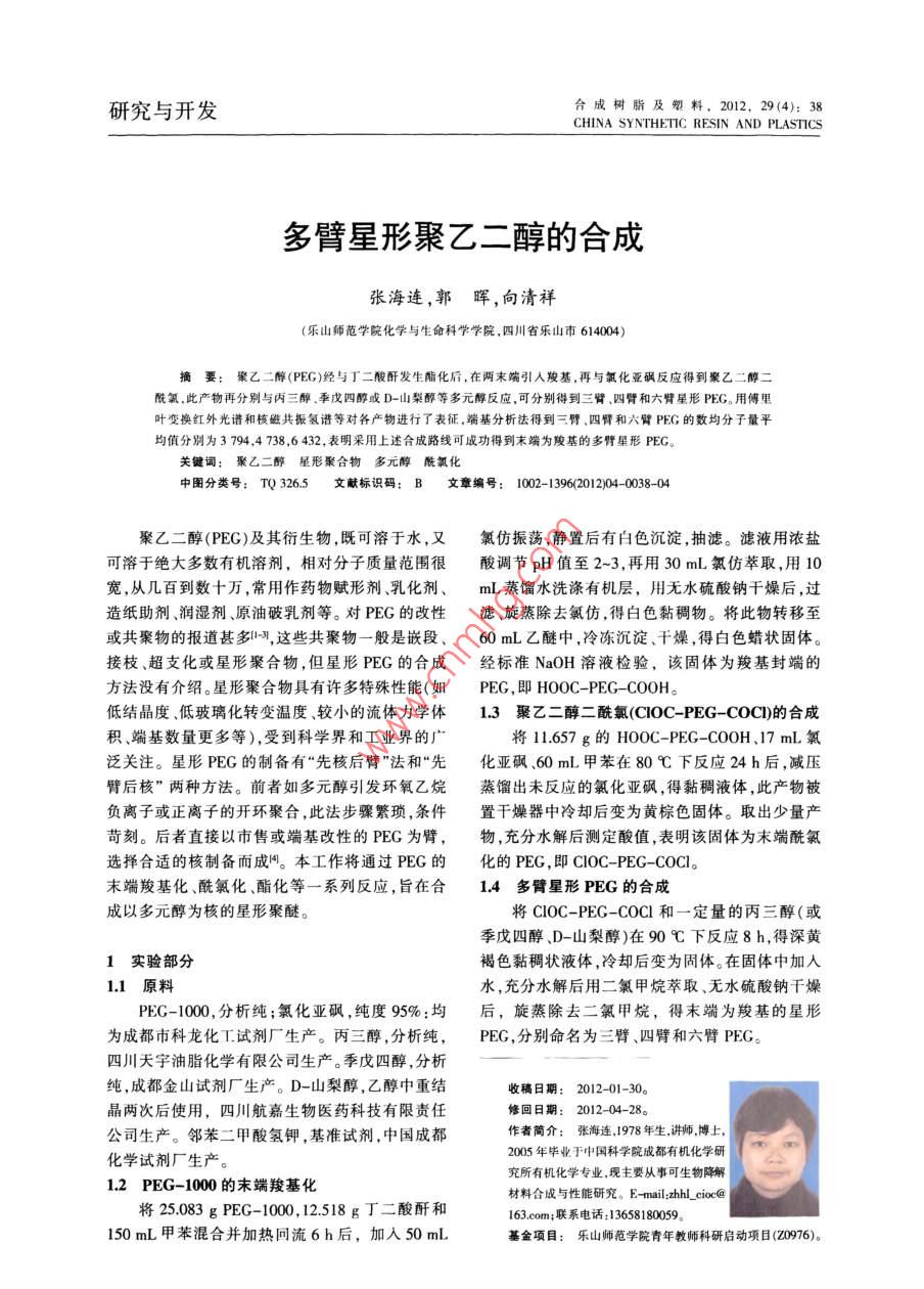 研究與開發(fā)合成樹脂及塑料,2012,29(4):38CHINA SYNTHETIC RESIN AND PLASTICS多臂星形聚乙二醇的合成張海連,郭暉,向清祥(樂山師范學(xué)院化學(xué)與生命科學(xué)學(xué)院,四川省樂山市614004)摘要:聚乙二醇(PEG)經(jīng)與丁二酸酐發(fā)生酯化后,在兩末端引入羧基,再與氯化亞砜反應(yīng)得到聚乙二醇二酰氯,此產(chǎn)物再分別與內(nèi)三醇、季戊四醇或D-山梨醇等多元醇反應(yīng),可分別得到三臂、四臂和六臂星形PEG用傅里葉變換紅外光譜和核磁共振氫譜等對各產(chǎn)物進行了表征,端基分析法得到三臂、四臂和六臂PEG的數(shù)均分子量平均值分別為3794,4738,6432,表明采用上述合成路線可成功得到末端為羧基的多臂星形PEC。關(guān)鍵詞:聚乙二醇星形聚合物多元醇酰氯化中圖分類號:TQ3265文獻標識碼:B文章編號:1002-13962012104-0038-0聚乙二醇(PEG)及其衍生物,既可溶于水,又氯仿振蕩靜置后有白色沉淀,抽濾。濾液用濃鹽可溶于絕大多數(shù)有機溶劑,相對分子質(zhì)量范圍很酸調(diào)節(jié)pH值至2-3,再用30mL氯仿萃取,用10寬,從幾百到數(shù)十萬,常用作藥物賦形劑、乳化劑、mL蒸餾水洗滌有機層,用無水硫酸鈉干燥后,過造紙助劑、潤濕劑、原油破乳劑等。對PEG的改性濾、旋蒸除去氯仿,得白色黏稠物。將此物轉(zhuǎn)移至或共聚物的報道甚多-習,這些共聚物一般是嵌段、60mL乙醚中,冷凍沉淀、干燥,得白色蠟狀固體。接枝、超支化或星形聚合物,但星形PEG的合成經(jīng)標準NaOH溶液檢驗,該固體為羧基封端的方法沒有介紹。星形聚合物具有許多特殊性能(如PEG,即HOOC- PEG-COOH低結(jié)晶度、低玻璃化轉(zhuǎn)變溫度、較小的流體力學(xué)體13聚乙二醇二酰氯(COC-PEG-COC)的合成積、端基數(shù)量更多等),受到科學(xué)界和工業(yè)界的廣將11657g的HOOC-PEG-COOH、17mL氯泛關(guān)注。星形PEG的制備有“先核后臂”法和“先化亞砜、60mL甲苯在80℃下反應(yīng)24h后,減壓臂后核”兩種方法。前者如多元醇引發(fā)環(huán)氧乙烷蒸餾出未反應(yīng)的氯化亞砜,得黏稠液體,此產(chǎn)物被負離子或正離子的開環(huán)聚合,此法步驟繁瑣,條件置干燥器中冷卻后變?yōu)辄S棕色固體。取出少量產(chǎn)苛刻。后者直接以市售或端基改性的PEG為臂,物,充分水解后測定酸值,表明該固體為末端酰氯選擇合適的核制備而成。本工作將通過PEG的化的PEG,即COC- PEG-COCI末端羧基化、酰氯化、酯化等一系列反應(yīng),旨在合14多臂星形PEG的合成成以多元醇為核的星形聚醚。將COC-PEG-COC1和一定量的丙三醇(或季戊四醇、D-山梨醇)在90℃下反應(yīng)8h,得深黃1實驗部分褐色黏稠狀液體,冷卻后變?yōu)楣腆w。在固體中加人原料水,充分水解后用二氯甲烷萃取、無水硫酸鈉干燥PEG-1000,分析純;氯化亞砜,純度95%:均后,旋蒸除去二氯甲烷,得末端為羧基的星形為成都市科龍化工試劑廠生產(chǎn)。丙三醇,分析純,PEG,分別命名為三臂、四臂和六臂PEG。四川天宇油脂化學(xué)有限公司生產(chǎn)。季戊四醇,分析純,成都金山試劑廠生產(chǎn)。D-山梨醇,乙醇中重結(jié)4期:2012-01-30晶兩次后使用,四川航嘉生物醫(yī)藥科技有限責任12-04-28。公司生產(chǎn)。鄰苯二甲酸氫鉀,基準試劑,中國成都作者簡介:張海連,1978年生,講師博上,化學(xué)試劑廠生產(chǎn)。2005年畢業(yè)于中國科學(xué)院成都有機化學(xué)研究所有機化學(xué)專業(yè),現(xiàn)主要從事可生物降解1.2PEG-1000的末端羧基化材料合成與性能研究。E-mail: zhi cioc@將25083gPEG-1000,12518g丁二酸酐和63com;聯(lián)系電話:13658180059150mL甲苯混合并加熱回流6h后,加入50mL基金項目:樂山師范學(xué)院青年教師科研啟動項目(Z0976)。第4期張海連等。多臂星型聚乙二醇的合成1.5測試方法加入適量水溶解,以酚酞為指示劑,用NaOH溶液傅里葉變換紅外光譜(FTIR)分析:采用日本標定,平行實驗兩次,測定聚合物的數(shù)均分子量島津公司生產(chǎn)的 Prestige-21型傅里葉變換紅外M)。光譜儀KBr壓片。核磁共振氫譜(H-NMR)分析采用德國 Bruker公司生產(chǎn)的 Bruker300MHz型2結(jié)果與討論核磁共振儀,氘代氯仿作溶劑,四甲基硅烷為內(nèi)2.1HOOC-PEG-COOH的合成標。凝膠滲透色譜一十八角激光散射( GPC-MALLS)臂星形PEG的合成原理見式(1)。技術(shù)分析:采用美國Wya公司生產(chǎn)的 WyatH-DAWN端的PEG-1000經(jīng)過末端羧基化、酰氯化HELEOS18角度激光光散射儀,溶劑為NN-二甲元醇化合物酯化,水解后可得到羧基封端的多臂基甲酰胺,柱流速為0.5 mUmin星形聚醚。如不做水解,末端酰氯基團還可繼續(xù)端基分析:用配制的0.1mol/L鄰苯二甲酸氫與其他官能團反應(yīng)制備各種嵌段共聚物,因此,鉀基準溶液滴定NaOH標準溶液,測得NaOH濃這種線形或星形的PEG可作為下一步聚合的活性度(cw)為00899moL。準確稱取一定量的產(chǎn)物“種子HO-PEG-OH+2PEG(COOCH CH_ COOH SOCCHIOHH或HoHCCH,OHPEG(COOCH CH, COCTh星形PEG或Ho2產(chǎn)物M測定表2多臂星形PEG的端基分析HOOC-PEG-COOH或多臂星形PEG末端皆Tab 2 End group analysis of multi-arm PEG含有羧基,并溶于水。可根據(jù)酸堿滴定原理測定M,計算公式見式(2)。PEG試樣wm/ g Vs/mL實測值實測均值理論值三臂10.75936833710(2)20612652738793794四臂式中:n為試樣中被分析的端羧基的個數(shù),對于星20.465247384864形PEG,n為臂數(shù);VwH是NaOH溶液的消耗體10576964327274積;wax為待分析試樣的質(zhì)量。從表1和表2可20.33113406499以看出:HOOC-P