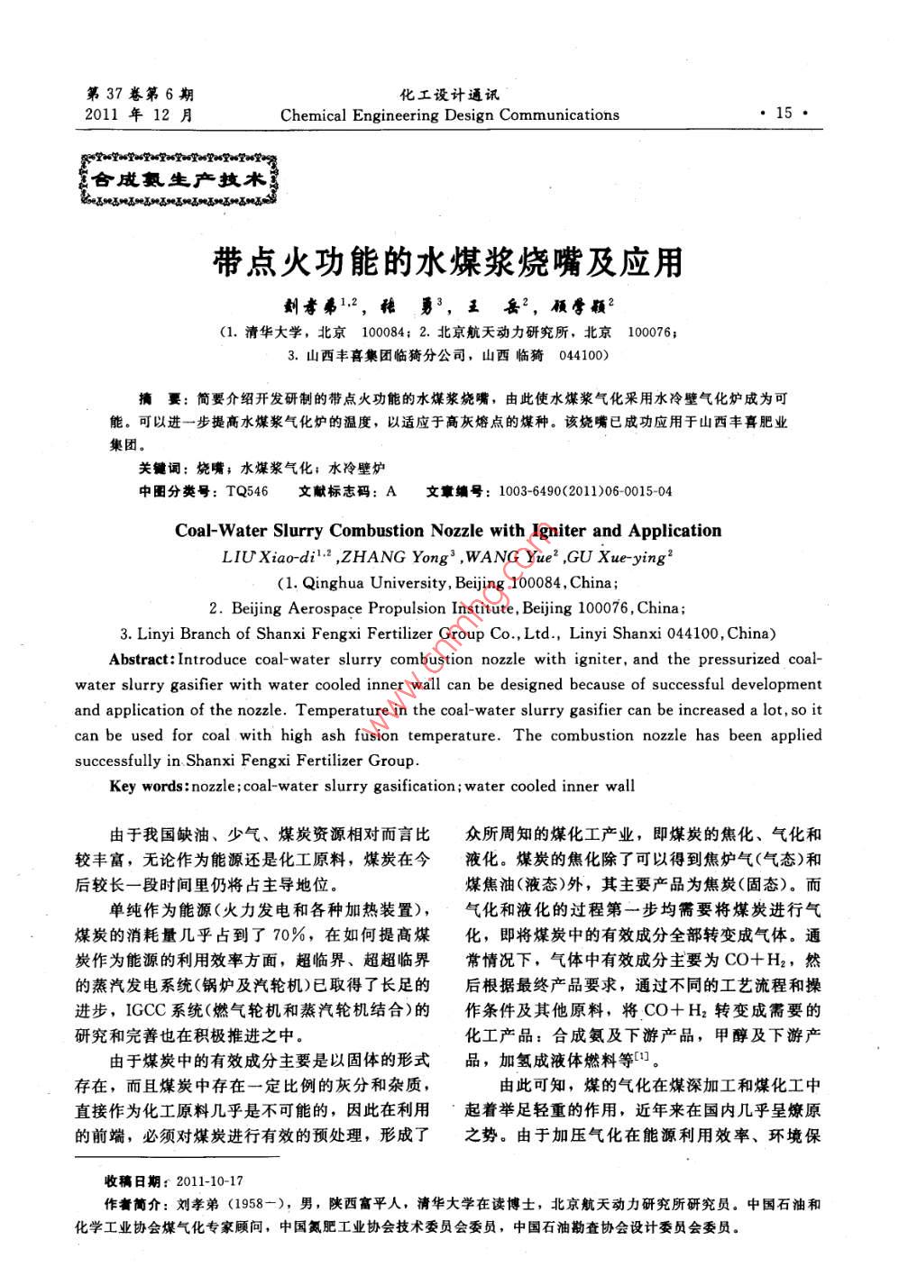第37卷第6期化工設(shè)計(jì)通訊2011年12月Chemical Engineering Design Communications15合成氯生廣抆術(shù)帶點(diǎn)火功能的水煤漿燒嘴及應(yīng)用孝鼻1,2,易3,王岳2,順骨顴2(1.清華大學(xué),北京100084;2.北京航天動(dòng)力研究所,北京100076;3.山西豐喜集團(tuán)臨猗分公司,山西臨猗044100)摘要:簡要介紹開發(fā)研制的帶點(diǎn)火功能的水煤漿燒嘴,由此使水煤漿氣化采用水冷壁氣化爐成為可能??梢赃M(jìn)一步提高水煤漿氣化爐的溫度,以適應(yīng)于高灰熔點(diǎn)的煤種。該燒嘴已成功應(yīng)用于山西豐喜肥業(yè)集團(tuán)關(guān)鍵詞:燒嘴;水煤漿氣化;水冷壁爐中圖分類號:TQ546文獻(xiàn)標(biāo)志碼:A文章編號:1003-6490(2011)06-0015-04Coal-Water Slurry Combustion Nozzle with Igniter and applicationLIU Xiao-di, ZHANG Yong, WANG Yue, GU Xue-ying(1. Qinghua University, Beijing 100084, China2. Beijing Aerospace Propulsion Institute, Beijing 100076, China3. Linyi Branch of Shanxi Fengxi Fertilizer Group Co, Ltd, Linyi Shanxi 044100, China)Abstract: Introduce coal-water slurry combustion nozzle with igniter, and the pressurized coal-water slurry gasifier with water cooled inner wall can be designed because of successful developmentand application of the nozzle. Temperature in the coal-water slurry gasifier can be increased a lot, so itcan be used for coal with high ash fusion temperature. The combustion nozzle has been appliedsuccessfully in Shanxi Fengxi Fertilizer GroupKey words: nozzle; coal-water slurry gasification; water cooled inner wall由于我國缺油、少氣、煤炭資源相對而言比眾所周知的煤化工產(chǎn)業(yè),即煤炭的焦化、氣化和較豐富,無論作為能源還是化工原料,煤炭在今液化。煤炭的焦化除了可以得到焦?fàn)t氣(氣態(tài))和后較長一段時(shí)間里仍將占主導(dǎo)地位。煤焦油(液態(tài))外,其主要產(chǎn)品為焦炭(固態(tài))。而單純作為能源(火力發(fā)電和各種加熱裝置),氣化和液化的過程第一步均需要將煤炭進(jìn)行氣煤炭的消耗量幾乎占到了70%,在如何提高煤化,即將煤炭中的有效成分全部轉(zhuǎn)變成氣體。通炭作為能源的利用效率方面,超臨界、超超臨界常情況下,氣體中有效成分主要為CO+H2,然的蒸汽發(fā)電系統(tǒng)(鍋爐及汽輪機(jī))已取得了長足的后根據(jù)最終產(chǎn)品要求,通過不同的工藝流程和操進(jìn)步,IGCC系統(tǒng)(燃?xì)廨啓C(jī)和蒸汽輪機(jī)結(jié)合)的作條件及其他原料,將CO+H2轉(zhuǎn)變成需要的研究和完善也在積極推進(jìn)之中。化工產(chǎn)品:合成氨及下游產(chǎn)品,甲醇及下游產(chǎn)由于煤炭中的有效成分主要是以固體的形式品,加氫成液體燃料等。存在,而且煤炭中存在一定比例的灰分和雜質(zhì),由此可知,煤的氣化在煤深加工和煤化工中直接作為化工原料幾乎是不可能的,因此在利用起著舉足輕重的作用,近年來在國內(nèi)幾乎呈燎原的前端,必須對煤炭進(jìn)行有效的預(yù)處理,形成了之勢。由于加壓氣化在能源利用效率、環(huán)境保收稿日期:2011-10-17作者簡介:劉孝弟(1958-),男,陜西富平人,清華大學(xué)在讀博士,北京航天動(dòng)力研究所研究員。中國石油和化學(xué)工業(yè)協(xié)會(huì)煤氣化專家顧問,中國氮肥工業(yè)協(xié)會(huì)技術(shù)委員會(huì)委員,中國石油勘查協(xié)會(huì)設(shè)計(jì)委員會(huì)委員?;ぴO(shè)計(jì)通訊第37卷護(hù)、操作自動(dòng)化、節(jié)省占地面積、大型化等方面相同,特別是煤中的揮發(fā)分比例和成分千差萬有絕對優(yōu)勢,因此建設(shè)和運(yùn)行比重不斷加大。別,因此煤的著火溫度一般只是一個(gè)定性的指煤的加壓氣化方法從操作壓力等級來區(qū)分,標(biāo),常見煤種的著火溫度如表1所示(。可分為低壓等級和高壓等級兩種。低壓等級的氣表1煤的著火溫度化壓力一般不超過3MPa,例如,HTW爐,U煤種著火溫度/Cgas爐,灰熔聚爐等。而高壓等級的氣化壓力一泥炭25~280般在4MPa以上,例如,GE爐, SHELL爐,褐煤200~350高揮發(fā)分煙煤HT-L爐,GSP爐等。煤的加壓氣化方法從使用低揮發(fā)分煙煤原料的種類來區(qū)分,可分為干煤粉和水煤漿兩無煙煤600~700種,除了GE爐利用水煤漿作為原料外,其他的在設(shè)計(jì)氣化爐的點(diǎn)火方式和爐膛的結(jié)構(gòu)時(shí),各爐型基本使用干煤粉作為原料。各種氣化爐有所不同。 SHELL爐使用的原料為GE爐利用水煤漿作為原料,在煤氣化過程干煤粉,其氣化爐上共有3種燒嘴:電點(diǎn)火燒嘴、中,必須帶進(jìn)一部分水,影響了氣化效率,對于引燃燒嘴、工藝燒嘴。使用的點(diǎn)火方式是,由電點(diǎn)有效氣體成分也有一定的負(fù)面影響,但是由于水火燒嘴提供點(diǎn)火能量,使引燃燒嘴(使用液化氣煤漿的供應(yīng)和流量控制等方面存在一定的優(yōu)越天然氣或工藝弛放氣等燃料)形成穩(wěn)定的火焰,并性,其氣化爐操作壓力可以更高,最高運(yùn)行壓力使?fàn)t膛溫度逐步升高、壓力升高,達(dá)到設(shè)計(jì)值時(shí)已達(dá)到8.5MPa2,仍然具有一定的生命力。由工藝燒嘴供應(yīng)煤粉和純氧,待形成穩(wěn)定的火焰GE爐的最大缺點(diǎn)是,水煤漿燒嘴的使用壽后,關(guān)閉引燃燒嘴并從原路縮回安全區(qū)域命短和爐內(nèi)耐火磚的維護(hù)費(fèi)用高,另外,由于耐HTL爐、GSP爐使用的原料也為干煤粉,采火磚的性能,限制了爐內(nèi)的操作溫度,這給水煤用的燒嘴結(jié)構(gòu)基本相同,見圖1。點(diǎn)火方式