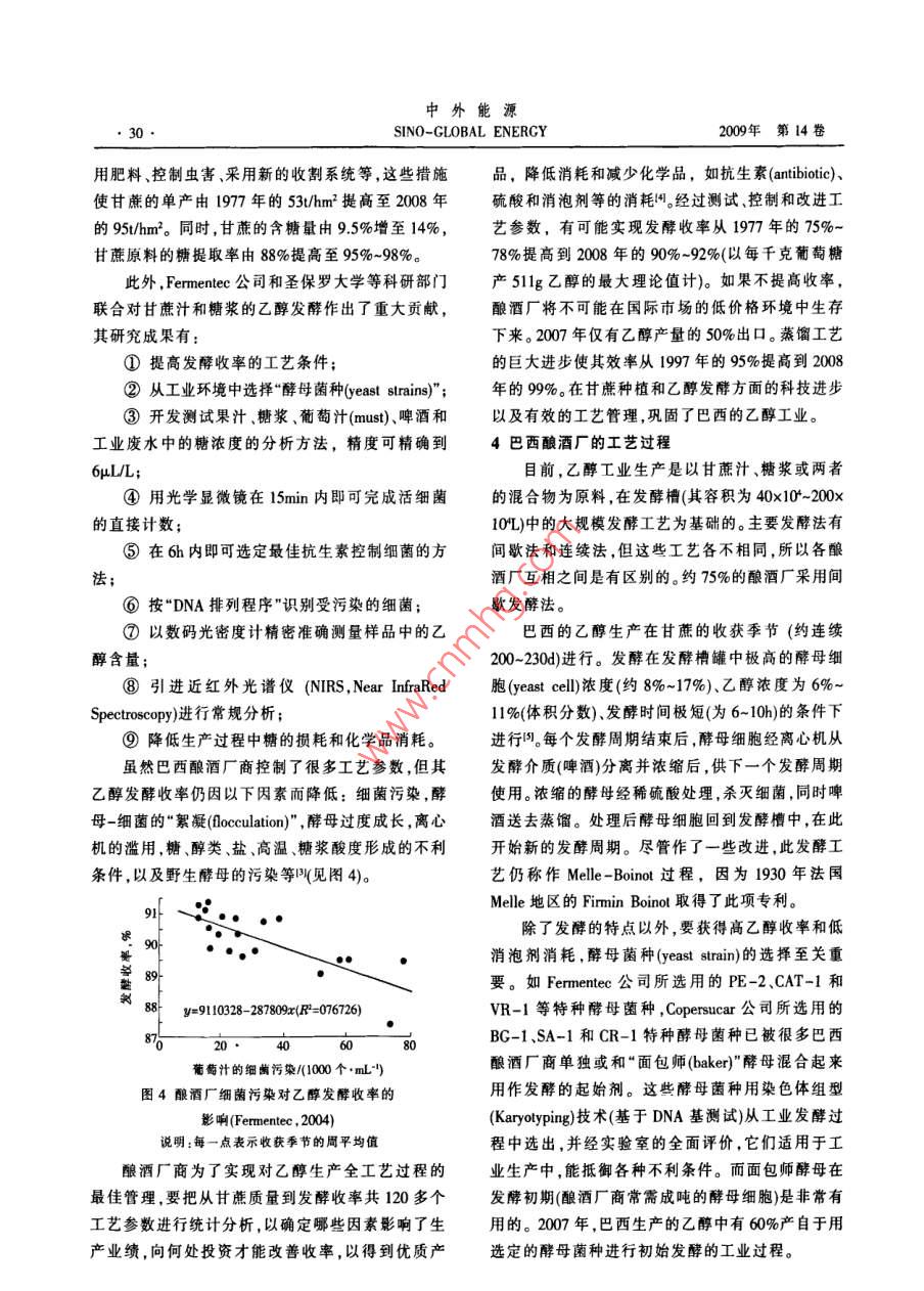 中外能源SINO-GLOBAL ENERGY009年第14卷在石油為主要能源的世界中發(fā)展乙醇生產(chǎn)巴西乙醇生產(chǎn)的經(jīng)驗Henrique VAmorim, Mario L Lopes(巴西 Fermented公司,圣保羅州皮拉西卡巴市13420-640)摘要當前,人們生活在依賴石油的世界中,因為汽油和柴油的價格不斷升高,許多國家都在尋求化石燃油的替代物。用糖類作物或谷物生產(chǎn)的乙醇被視為最好的替代物。然而,全球日前乙醇產(chǎn)量僅為汽油耗量的25%,所以乙醇需求增長迅速,市場廣闊。介綱了巴西乙醇生產(chǎn)的經(jīng)驗;在乙醉市場波動的情況下,乙醇生產(chǎn)商得以生存的措施;乙醇生產(chǎn)商的生產(chǎn)方式;乙醇生產(chǎn)所用糖漿原料的概況等。關(guān)鍵詞甘蔗乙醇巴西發(fā)酵生產(chǎn)生物燃料1前言的乙醇耗量迅速增長,當時聯(lián)邦政府又頒發(fā)了旨在乙醇用作燃料的歷史始于汽車誕生之日。1908降低石油進口的“ Proalcool"計劃,有關(guān)廠商因而受年,當?shù)谝惠v福特 Model t汽車從裝配線下線時,到鼓舞,擴大了甘蔗生產(chǎn),并建設(shè)新的釀酒廠,生產(chǎn)就用乙醇作為其發(fā)動機的燃料,此時石油工業(yè)才剛用作生物燃料的乙醇。如圖1所示,在過去30年剛開始。后來,汽油開始用作燃料并發(fā)現(xiàn)其價格低里,巴西的甘蔗產(chǎn)量從1975年的9100×10t增長至廉,與此同時在在世界各地發(fā)現(xiàn)了新的石油儲量。2007年的49100×10(原文如此,按圖1,應(yīng)為在數(shù)百萬年前,微小的水生植物和動物在高溫高壓39100×10%—譯者注),2007年的甘蔗產(chǎn)量相當于和多層沉積物的復(fù)蓋下,形成了液態(tài)物,人們稱之589×10%b一次能源產(chǎn)量(按圖1數(shù)據(jù)計算,應(yīng)為為石油,它是碳氫化合物的混合物。煉油廠把這些469×10°bl—譯者注,lt甘蔗相當于1.bl原混合物分餾為各種油品,如汽油、柴油、液化石油油)。這些甘蔗是由7萬名農(nóng)民在600×10hm2土地氣、殘渣燃料油和其他產(chǎn)品。多少年來,人們目睹了上種植出來的,此耕地面積約為巴西全部耕地面積世界在消耗化石燃料的同時向大氣排放出數(shù)以百的27%。自“ Proalcool"計劃實施以來,聯(lián)邦政府已萬噸計的二氧化碳、其他氣體和有毒化合物等。但經(jīng)節(jié)約了用于進口原油(包括關(guān)稅)的外匯約1500是,到了1973年,情況發(fā)生了變化,國際原油價格億美元。猛漲,科學(xué)家們此時又宣稱,全球氣候正在加速變巴西燃料銷售網(wǎng)共有3萬多個加油站為2600暖,同時石油儲量正在逐年降低。當前,全球汽油年104輛在汽油中混人2%-26%乙醇的汽車和540消耗量約為12×10m3,而燃料乙醇僅占汽油需求量10輛用純乙醇或含不同比例乙醇(可變?nèi)剂霞夹g(shù))的2.5%如今沒有任何替代燃料可以代替汽油的汽車加油。與此同時,汽車業(yè)推出了可變?nèi)剂掀秃鸵掖肌K?基于經(jīng)濟、社會和環(huán)境的原因,車,它們可使用純乙醇、汽油或兩者以任何比例摻全球燃料乙醇的需求正在增長,到2010年,其產(chǎn)量估計將增至550010%m2。在依賴石油的世界中,巴作者簡介; Henrique V. Amorim,巴西 Fermented公司總裁景首席西作為主要的乙醇生產(chǎn)和使用國,具有特別的意義執(zhí)行官,1966年畢業(yè)于巴西圣保羅大學(xué)農(nóng)業(yè)科學(xué)專業(yè),1970年2生物燃料乙醇畢業(yè)于美國俄亥餓州立大學(xué),獲理科碩士學(xué)位,1972年完成其從1923年起,巴西就將乙醇混人汽油中,其混博士論文。19m7年創(chuàng)建 Fermented公司。人比例約為5%40%不等。1975年以來,用作燃料E-mil: amorim(fermented. com. brHenrique V, Amorim等.在石油為主要能源的世界中第3期發(fā)展乙醇生產(chǎn)——巴西乙醇生產(chǎn)的經(jīng)驗混的燃油。這些可變?nèi)剂掀囋诎臀鞣浅A餍?銷家,但產(chǎn)量集中在中南和西北地區(qū)。預(yù)計到2009量達200×10輛,占2007年汽車總銷量的86%。這年,還將新建一批釀酒廠,每家年生產(chǎn)能力可達到種流行趨勢的出現(xiàn)有以下3個理由:首先是汽油價100×10y-200×10t。而且,很多釀酒廠正在增加其乙高,消費者要尋求廉價的能源,而乙醇價格僅為汽醇生產(chǎn)能力,以滿足國內(nèi)需求和出口到那些正在尋油的60%;其次,可變?nèi)剂掀囀瓜M者可更靈活求替代燃料以減少石油對其經(jīng)濟和環(huán)境影響的國地選用燃油品種,從而少受市場價格變化的影響;家。再次,選用純乙醇或乙醇-汽油混合物作燃油可使0.25有關(guān)從業(yè)人員(包括甘蔗地里的農(nóng)民)獲得環(huán)境和社會效益。2004年以來,可變?nèi)剂宪囕v銷售成為巴西汽車業(yè)的主要增長點。0.10N0.05E至圣室至登系年份圖2巴西乙醇產(chǎn)量的增長情況( Atauro,2008)053釀酒廠如何應(yīng)對市場波動而生存下來§E區(qū)置圣登區(qū)區(qū)堅§在“ Proalcool'計劃實施期間,生產(chǎn)商面臨了乙醇價格由1980年的700美元/m3降至1999年的圖1巴西甘蔗產(chǎn)量逐年增長 Datagro,2008)200美元/m3以下。除乙醇-汽油混合燃料外,聯(lián)邦繼最初的可變?nèi)剂掀囁扇〉膶Σ叱晒χ畯U除了對乙醇市場的干預(yù),價格放開。在巴西后,2005年汽車業(yè)又推出了三種燃料(汽油、乙醇和糖和乙醇的價格產(chǎn)生了雙重的影響。許多糖廠設(shè)有天然氣汽車。而且,又開發(fā)了基于乙醇的燃料電池釀酒裝置,當國際市場的糖價較生產(chǎn)乙醇更可獲利新項目,與此同時,巴西政府推出了“生物柴油”計時,