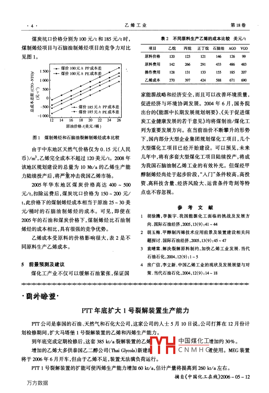 乙烯工業(yè)2006,18(2)1-4ETHYLENE INDUSTRY煤制烯烴項目發(fā)展探討田云生(中國神華煤制油有限公司,北京,10001)摘要:現(xiàn)代煤化工技術(shù)的快速發(fā)展和國際原油價格居高不下,使發(fā)展渫制烯烴產(chǎn)業(yè)的條件逐漸成熟。文中通過對不同原料路線乙烯生產(chǎn)工藝的分析,對原料需求、公用工程及配套條件、投資、技術(shù)、成本、環(huán)境保護(hù)、現(xiàn)狀和前景等的分析,對煤制烯烴產(chǎn)業(yè)的發(fā)展進(jìn)行論述探討。關(guān)鍵詞:煤;烯烴;乙烯工業(yè);煤化工乙烯工業(yè)代表著一個國家或地區(qū)石油化工的雖暫無工業(yè)化裝置運(yùn)行,但經(jīng)多年開發(fā),已具備工發(fā)展水平。1962年我國首套5ka乙烯生產(chǎn)裝置業(yè)化條件1。在蘭州化學(xué)工業(yè)公司誕生,經(jīng)過近40年的發(fā)展1995年,MO工藝完成中試,驗證了其工藝我國目前已建成乙烯生產(chǎn)裝置20套。雖然近期催化劑的可靠性。該工藝類似煉油催化裂化工國內(nèi)正在規(guī)劃和建設(shè)多套大型乙烯裝置,但隨著藝苛刻度更低,反應(yīng)產(chǎn)物組成更簡單,可采用常我國CDP的快速增長,未來一段時期國內(nèi)烯烴產(chǎn)規(guī)的石腦油裂解烯烴分離技術(shù),分離回收更容易。品仍將供不應(yīng)求。目前,UOP公司已向尼日利亞、埃及各轉(zhuǎn)讓了2003年以來,國際原油價格一路攀升,2005年2400k/a甲醇進(jìn)料的工業(yè)裝置,尼日利亞Mro項創(chuàng)下了72美元桶的高價位,隨著國際油價升高,目已完成基礎(chǔ)設(shè)計。為通過集成技術(shù)的整合,進(jìn)乙烯生產(chǎn)成本大幅度提高。以儲量豐富、價格低一步提高整體效益, TOTAL公司也在開展千噸級的煤炭為原料生產(chǎn)乙烯及其衍生化工產(chǎn)品前景烯烴產(chǎn)品/年的M0、OCP(烯烴轉(zhuǎn)化)和聚烯烴集看好。同時煤化工路線可對CO2和SO2等氣體集成技術(shù)的演示試驗,預(yù)計2007年完成試驗工作。中回收,總脫硫率可達(dá)到9.5%以上,比直接燃燒日前中科院大連化學(xué)物理研究所的年處理甲醇方式減排SO215kua以上。近兩年來,國內(nèi)大型16k的工業(yè)示范裝置已經(jīng)完成10天的首次投料煤炭企業(yè)、富產(chǎn)煤炭的地區(qū)都在規(guī)劃建設(shè)大型煤試運(yùn),達(dá)到了國外同類技術(shù)的水平?;ろ椖?。尤其是煤經(jīng)甲醇制烯烴項目,以其原德國Iugi公司的MP工藝在20世紀(jì)90年料易得、成本低廉,環(huán)境友好、競爭力強(qiáng)等優(yōu)勢,正代開發(fā)成功。2001年該公司在挪威建設(shè)了MP引起相關(guān)行業(yè)的廣泛關(guān)注。工藝的演示裝置,為大型工業(yè)化設(shè)計取得了大量數(shù)據(jù)。MP工藝的反應(yīng)器為固定床,工藝流程與1技術(shù)來源20個世紀(jì)80年代在新西蘭建成的甲醇制汽油裝煤經(jīng)甲醇制烯烴工藝是近年開發(fā)成功的新技置基本相同,反應(yīng)器的工業(yè)放大有成熟經(jīng)驗可以術(shù),主要由煤氣化制合成氣、合成氣制甲醇、甲醇借2制烯烴三項技術(shù)集成。大型煤氣化技術(shù)、百萬噸°目前可以實現(xiàn)10m直徑反應(yīng)器的設(shè)計,中國煤化工很小。204年該公級甲醇生產(chǎn)技術(shù)均已成熟,關(guān)鍵是甲醇制烯烴技CNMHG收稿日期:2006-03-13。術(shù),具備工業(yè)化條件的有:美國UOP公司和挪威作者簡介:田云生(1968-),男,河北玉田人,高級工程師,Hydo公司共同開發(fā)的甲醇制乙烯加丙烯(Mo)1991年畢業(yè)于大慶石油學(xué)院石油化工系,一直從事大型石油工若;是m公司的甲醇制丙烯(MP)工藝化工廠生產(chǎn)技術(shù)管理、項目前期規(guī)劃和建設(shè)管理工作乙烯工業(yè)第18卷司與伊朗國家石化公司簽訂100ka規(guī)模MP裝國發(fā)展煤制烯烴產(chǎn)業(yè)的原料有充分保障。置的專利合同,2005年與寧夏煤業(yè)集團(tuán)和大唐電事實上,上海焦化股份有限公司、渭河化肥廠力集團(tuán)簽署了技術(shù)轉(zhuǎn)讓合同。等均以煤炭為原料生產(chǎn)合成氨、甲醇等產(chǎn)品,經(jīng)營狀態(tài)一直很好。隨著石腦油資源緊張、價格升髙,2原料的可獲得性與保障程度20世紀(jì)90年代后期中國石化巴陵、金陵、安慶、湖2.1石油腦路線北化肥等多家企業(yè)均對其合成氨裝置進(jìn)行原料我國裂解原料問題一直是困擾著乙烯工業(yè)健“油改煤”改造,2005年底陸續(xù)開車,將扭轉(zhuǎn)石腦油康發(fā)展的重要問題。2005年我國生產(chǎn)乙烯7.54為原料的嚴(yán)重虧損狀態(tài)。t。據(jù)中國石化經(jīng)濟(jì)技術(shù)研究院預(yù)測,2010年和2020年我國乙烯裝置生產(chǎn)能力將分別達(dá)到14Ma3公用工程及配套條件和20Mta,分別需要裂解原料434Mt和62Mt左3.1石腦油路線右,幾乎全部來自煉油行業(yè),然而煉油行業(yè)的主要乙烯工廠對周邊產(chǎn)生輻射效應(yīng),促進(jìn)相關(guān)產(chǎn)目的是生產(chǎn)燃料3。目前我國每年進(jìn)口的100Mt業(yè)發(fā)展,但也需龐大公用工程和社會為依托原油中,有半數(shù)以上通過馬六甲海峽從中東地區(qū)1MU/a規(guī)模的乙烯工廠,需廠外提供3Ma的石進(jìn)口,2006年開始從哈薩克斯坦進(jìn)口10~20Mu/a腦油原料(10Mt/a煉油廠提供或從市場購買),的原油,同時從俄羅斯進(jìn)口50Mu/a以上的原油貿(mào)30~40M/a的新鮮水,(10~12)×104kW的供電易合同也在落實之中,然而國際政治和經(jīng)濟(jì)形