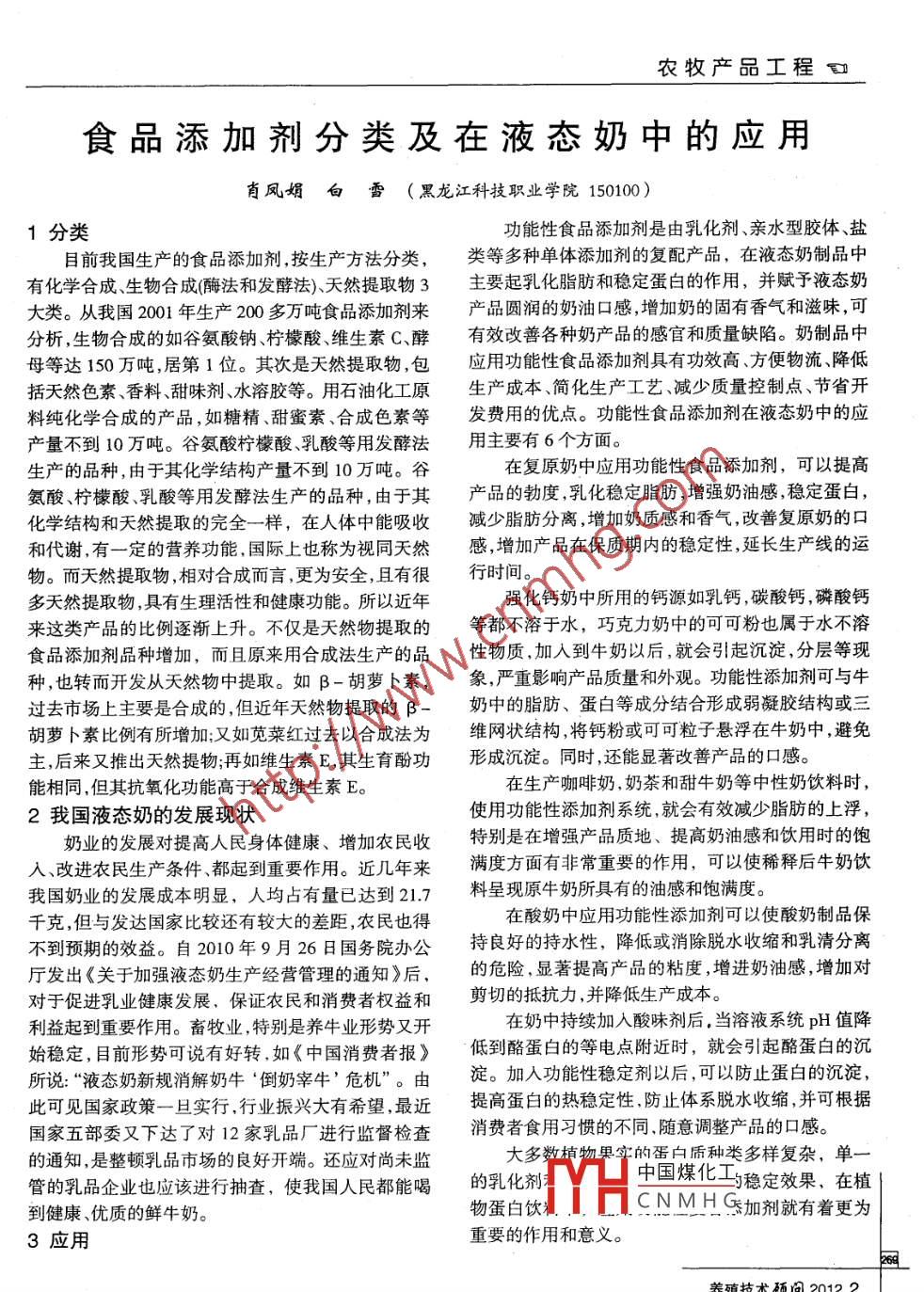 農(nóng)牧產(chǎn)品工程司食品添加劑分類及在液態(tài)奶中的應(yīng)用肖鳳娟白香(黑龍江科技職業(yè)學(xué)院150100 )1分類功能性食品添加劑是由乳化劑、親水型膠體、鹽目前我國生產(chǎn)的食品添加劑,按生產(chǎn)方法分類,類等多種單體添加劑的復(fù)配產(chǎn)品,在液態(tài)奶制品中有化學(xué)合成、生物合成(酶法和發(fā)酵法)、天然提取物3主要起乳化脂肪和穩(wěn)定蛋白的作用,并賦予液態(tài)奶大類。從我國2001年生產(chǎn)200多萬噸食品添加劑來產(chǎn)品圓潤的奶油口感,增加奶的固有香氣和滋味,可分析,生物合成的如谷氨酸鈉、檸檬酸、維生素C、酵有效改善各種奶產(chǎn)品的感官和質(zhì)量缺陷。奶制品中母等達(dá)150萬噸,居第1位。其次是天然提取物,包應(yīng)用功能性食品添加劑具有功效高、方便物流、降低括天然色素、香料、甜味劑、水溶膠等。用石油化工原生產(chǎn)成本、簡化生產(chǎn)工藝、減少質(zhì)量控制點、節(jié)省開料純化學(xué)合成的產(chǎn)品,如糖精甜蜜素、合成色素等發(fā)費用的優(yōu)點。功能性食品添加劑在液態(tài)奶中的應(yīng)產(chǎn)量不到10萬噸。谷氨酸檸檬酸、乳酸等用發(fā)酵法用主要有6個方面。生產(chǎn)的品種,由于其化學(xué)結(jié)構(gòu)產(chǎn)量不到10萬噸。谷在復(fù)原奶中應(yīng)用功能性食品添加劑,可以提高氨酸、檸檬酸、乳酸等用發(fā)酵法生產(chǎn)的品種,由于其產(chǎn)品的勃度,乳化穩(wěn)定脂肪,增強(qiáng)奶油感,穩(wěn)定蛋白,化學(xué)結(jié)構(gòu)和天然提取的完全-樣,在人體中能吸收減少脂肪分離,增加奶質(zhì)感和香氣,改善復(fù)原奶的口和代謝有一定的營養(yǎng)功能,國際上也稱為視同天然感,增加產(chǎn)品在保質(zhì)期內(nèi)的穩(wěn)定性,延長生產(chǎn)線的運物。而天然提取物,相對合成而言,更為安全,且有很行時間。多天然提取物,具有生理活性和健康功能。所以近年強(qiáng)化鈣奶中所用的鈣源如乳鈣,碳酸鈣,磷酸鈣來這類產(chǎn)品的比例逐漸上升。不僅是天然物提取的等都不溶于水,巧克力奶中的可可粉也屬于水不溶食品添加劑品種增加,而且原來用合成法生產(chǎn)的品.性物質(zhì),加入到牛奶以后,就會引起沉淀,分層等現(xiàn)種,也轉(zhuǎn)而開發(fā)從天然物中提取。如β-胡蘿卜素,象,嚴(yán)重影響產(chǎn)品質(zhì)量和外觀。功能性添加劑可與牛過去市場上主要是合成的,但近年天然物提取的β-奶中的脂肪、蛋白等成分結(jié)合形成弱凝膠結(jié)構(gòu)或三胡蘿卜素比例有所增加;又如莧菜紅過去以合成法為維網(wǎng)狀結(jié)構(gòu),將鈣粉或可可粒子懸浮在牛奶中,避免主,后來又推出天然提物;再如維生素E,其生育酚功形成沉淀。同時,還能顯著改善產(chǎn)品的口感。能相同,但其抗氧化功能高于合成維生素E。在生產(chǎn)咖啡奶,奶茶和甜牛奶等中性奶飲料時,2我國液態(tài)奶的發(fā)展現(xiàn)狀使用功能性添加劑系統(tǒng),就會有效減少脂肪的上浮,奶業(yè)的發(fā)展對提高人民身體健康、增加農(nóng)民收特別是在增強(qiáng)產(chǎn)品質(zhì)地、提高奶油感和飲用時的飽人、改進(jìn)農(nóng)民生產(chǎn)條件、都起到重要作用。近幾年來滿度方面有非常重要的作用,可以使稀釋后牛奶飲我國奶業(yè)的發(fā)展成本明顯,人均占有量已達(dá)到21.7料呈現(xiàn)原牛奶所具有的油感和飽滿度。千克,但與發(fā)達(dá)國家比較還有較大的差距,農(nóng)民也得在酸奶中應(yīng)用功能性添加劑可以使酸奶制品保不到預(yù)期的效益。自2010年9月26日國務(wù)院辦公持良好的持水性,降低或消除脫水收縮和乳清分離廳發(fā)出《關(guān)于加強(qiáng)液態(tài)奶生產(chǎn)經(jīng)營管理的通知》后,的危險,顯著提高產(chǎn)品的粘度,增進(jìn)奶油感,增加對對于促進(jìn)乳業(yè)健康發(fā)展,保證農(nóng)民和消費者權(quán)益和剪切的抵抗力,并降低生產(chǎn)成本。利益起到重要作用。畜牧業(yè),特別是養(yǎng)牛業(yè)形勢又開在奶中持續(xù)加入酸味劑后.當(dāng)溶液系統(tǒng)pH值降始穩(wěn)定,目前形勢可說有好轉(zhuǎn),如《中國消費者報》低到酪蛋白的等電點附近時,就會引起酪蛋白的沉所說:“液態(tài)奶新規(guī)消解奶?!?倒奶宰?!C(jī)”。由淀。加人功能性穩(wěn)定劑以后,可以防止蛋白的沉淀,此可見國家政策一旦實行 ,行業(yè)振興大有希望,最近提高蛋白的熱穩(wěn)定性,防止體系脫水收縮,并可根據(jù)國家五部委又下達(dá)了對12家乳品廠進(jìn)行監(jiān)督檢查消費者食用習(xí)慣的不同,隨意調(diào)整產(chǎn)品的口感。的通知,是整頓乳品市場的良好開端。還應(yīng)對尚未監(jiān)大多數(shù)梢物果實的蛋白質(zhì)種類多樣復(fù)雜,單一管的乳品企業(yè)也應(yīng)該進(jìn)行抽查,使我國人民都能喝的乳化劑中國煤化工y穩(wěn)定效果,在植到健康、優(yōu)質(zhì)的鮮牛奶。物蛋白飲Y臺CNMH器加劑就有著更為3應(yīng)用重要的作用和意義。養(yǎng)殖技術(shù)顧問2012.2